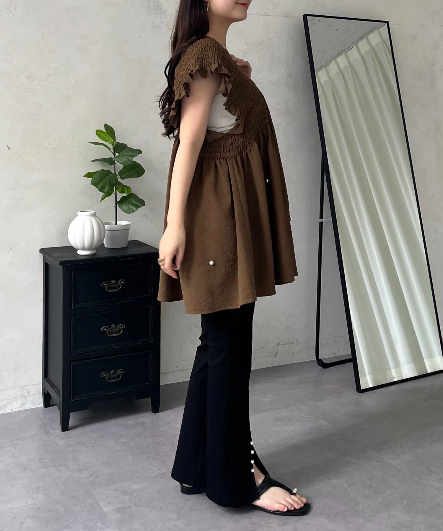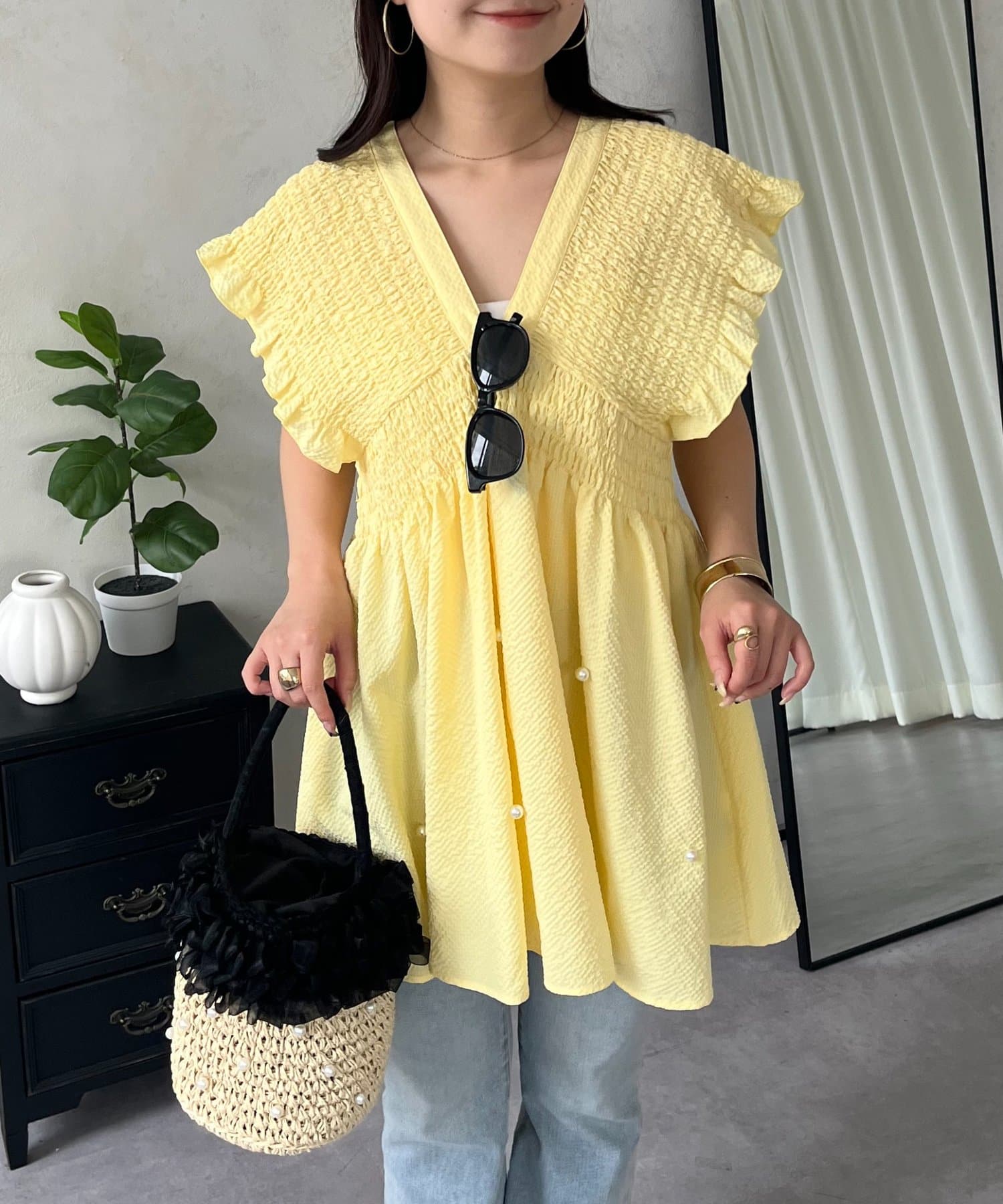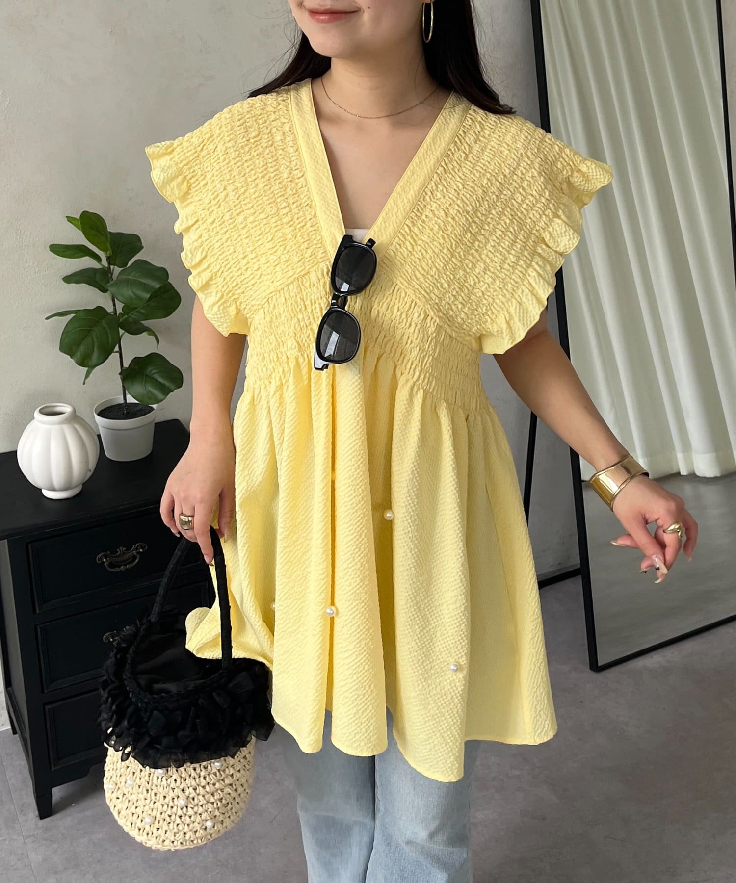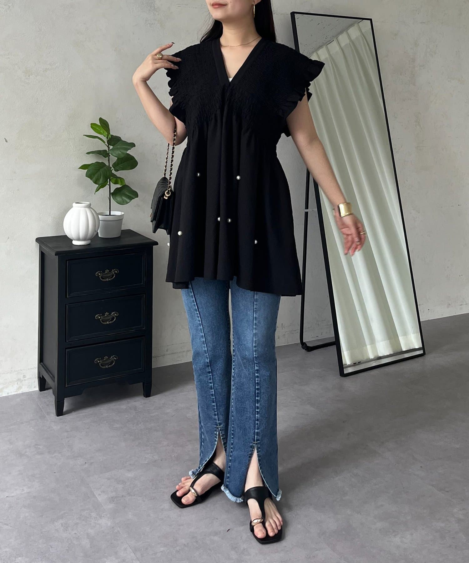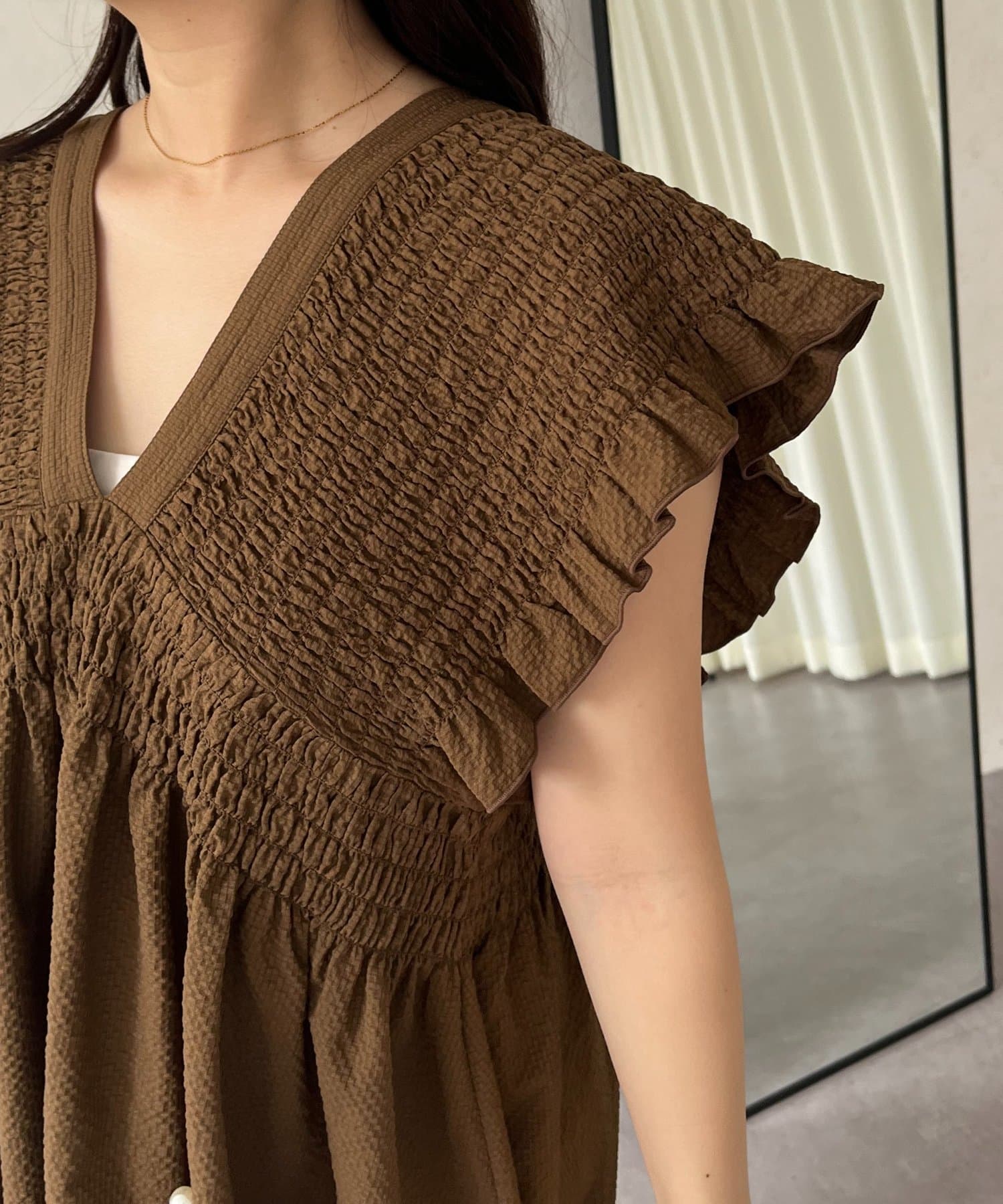 シャーリングフリルVネックパールペプラムブラウス