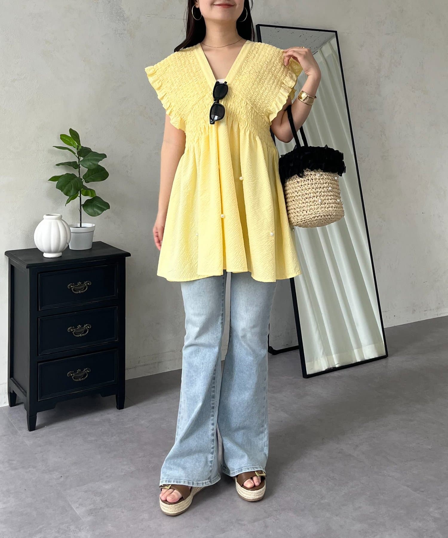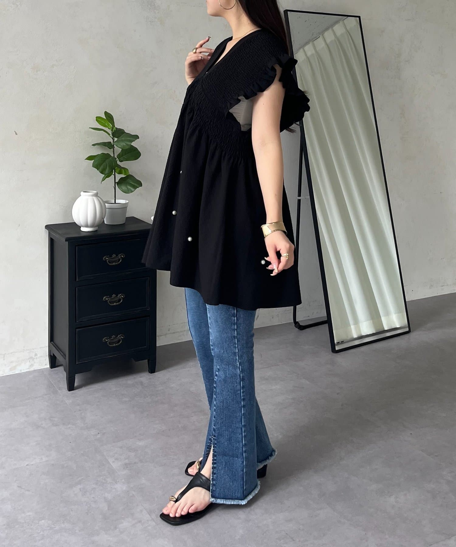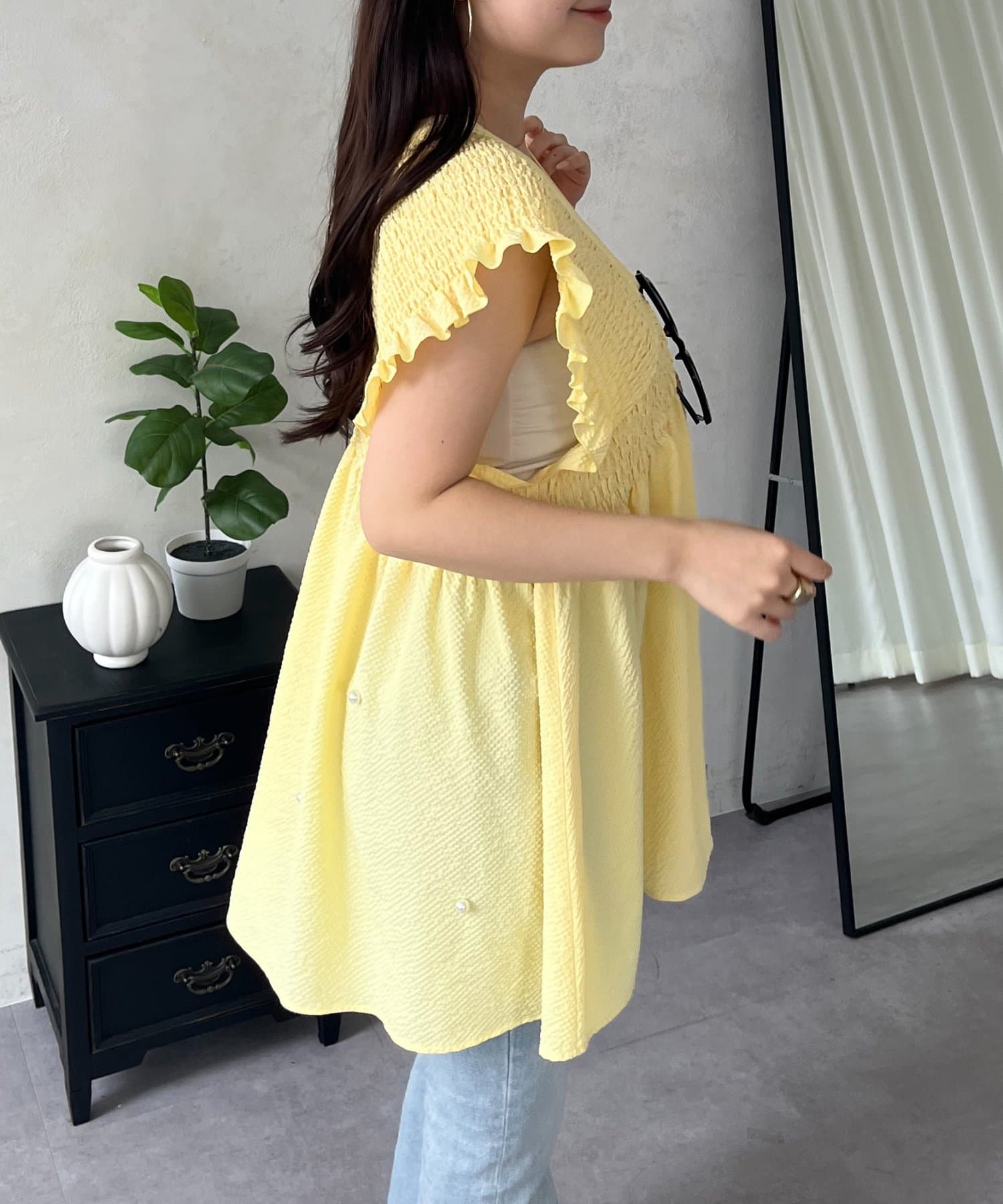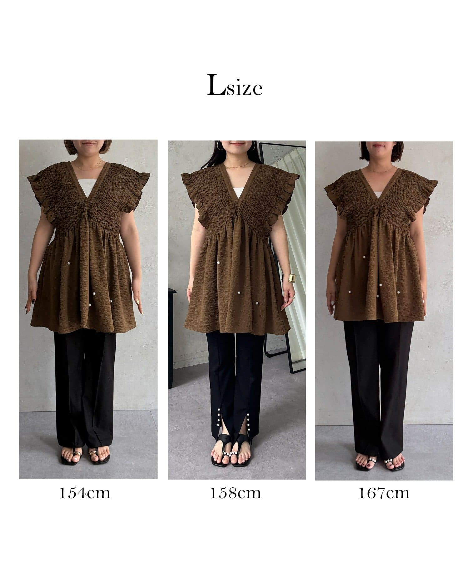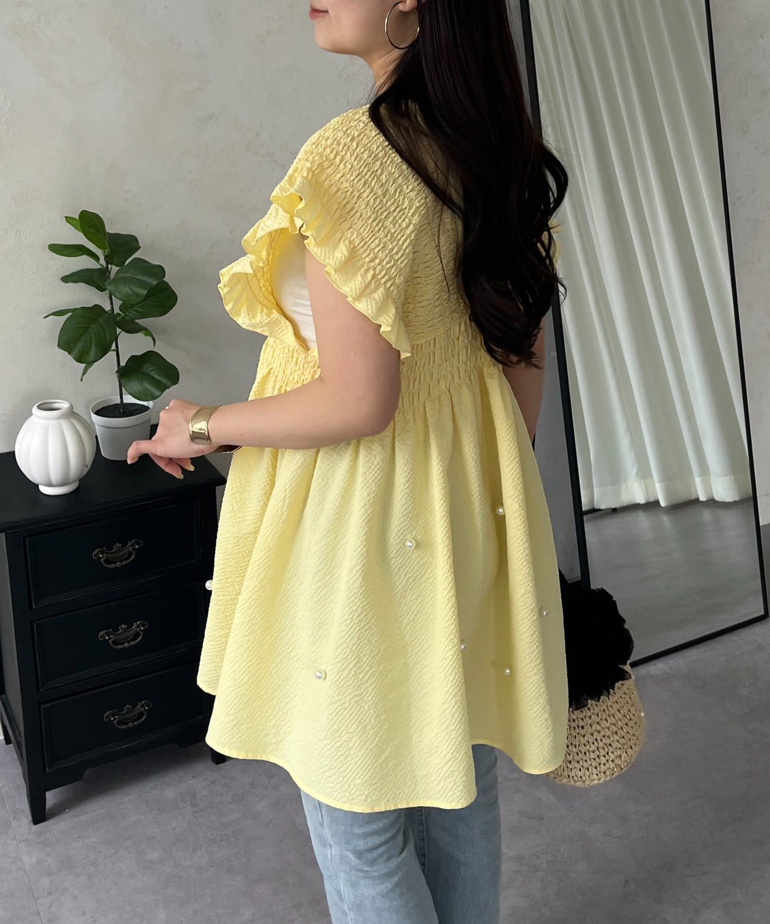 シャーリングフリルVネックパールペプラムブラウス