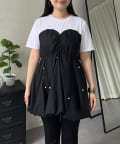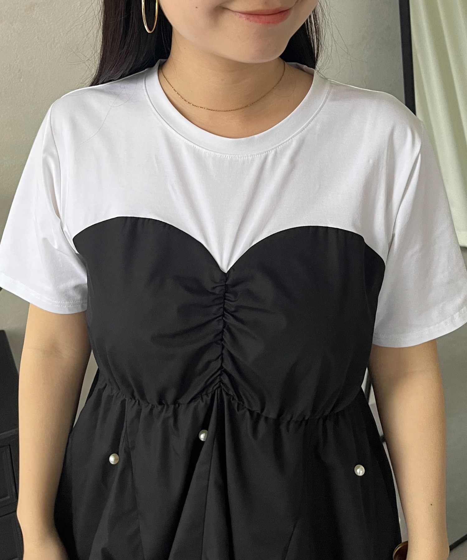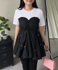 ●Tシャツにビスチェを重ねたようなドッキングデザインで、