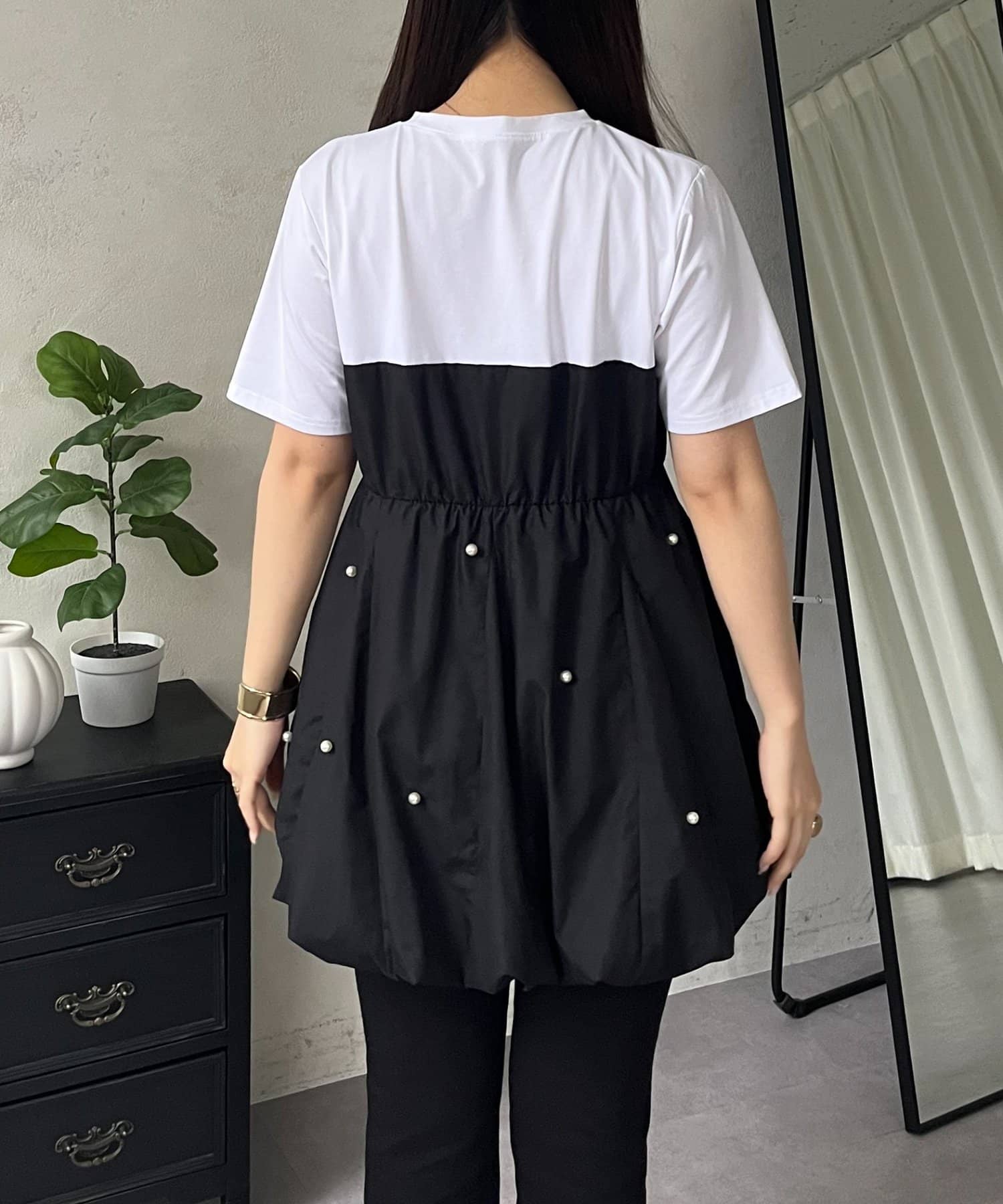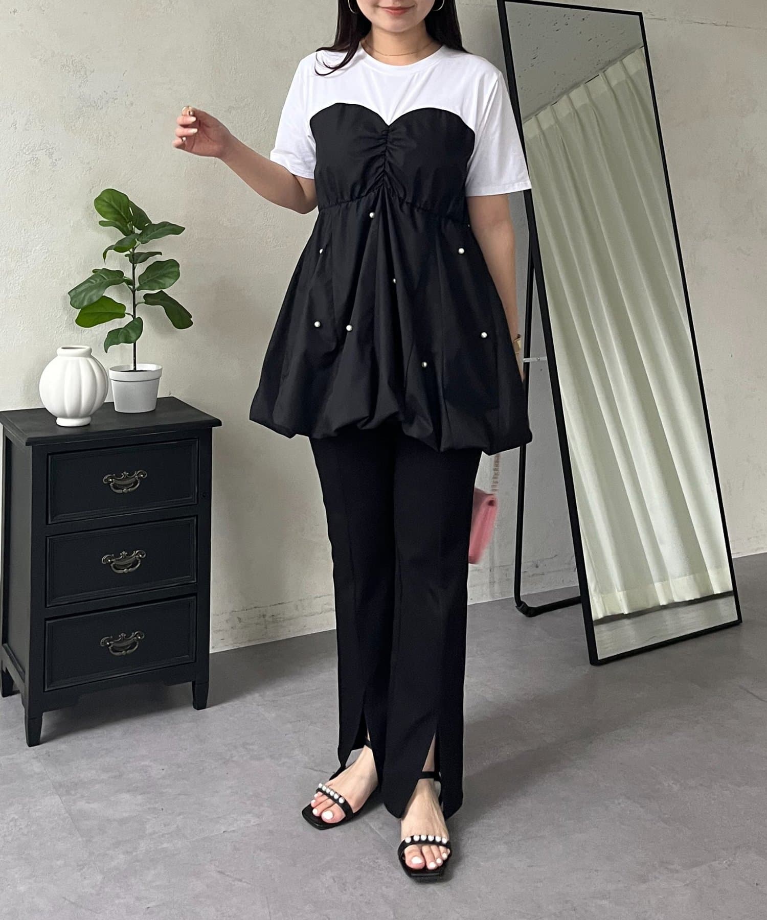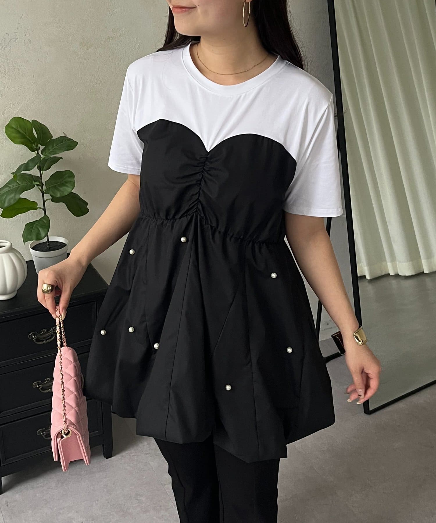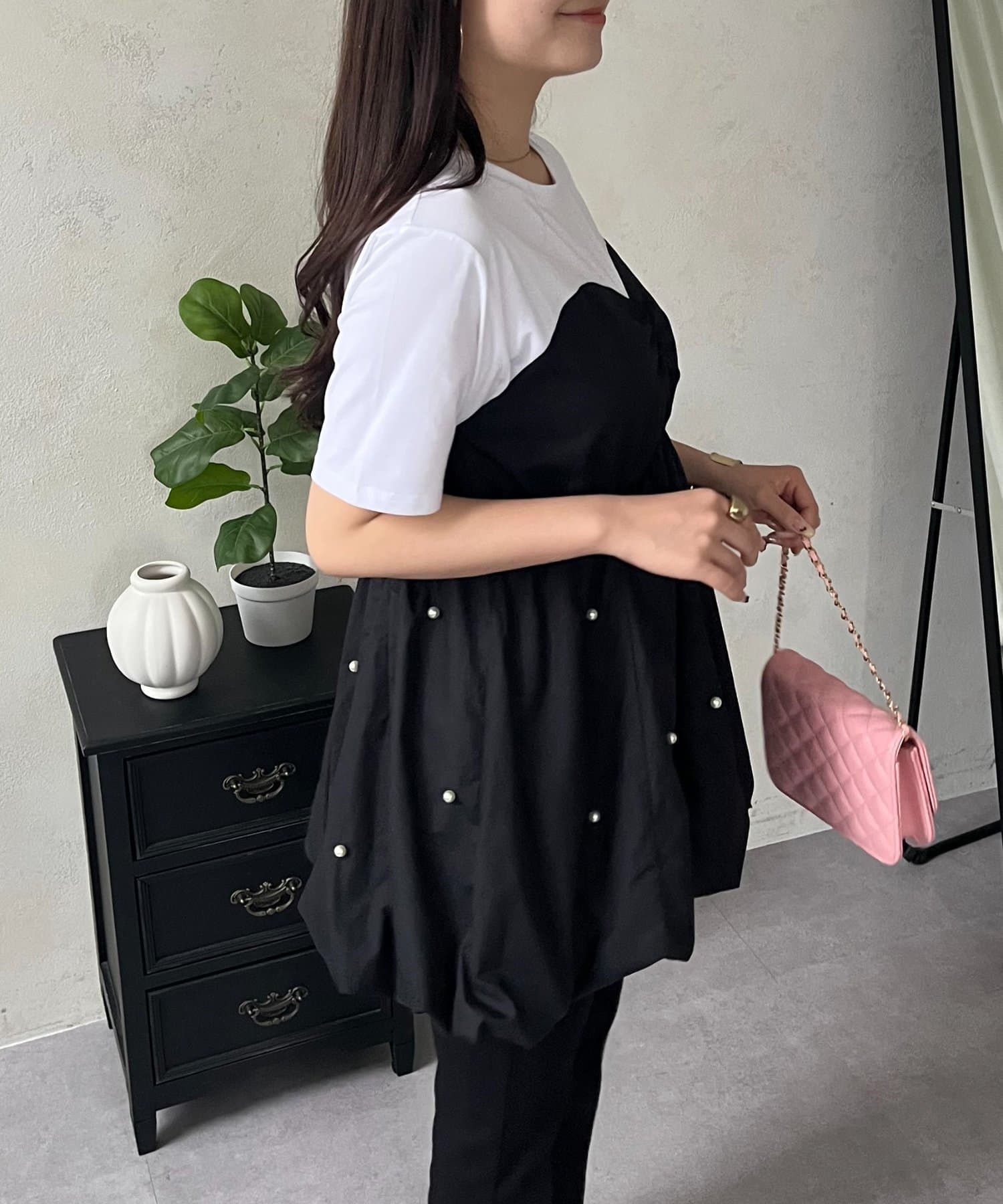 【1枚で旬のレイヤードが完成】パールが華やかなバルーンドッキングTシャツ