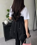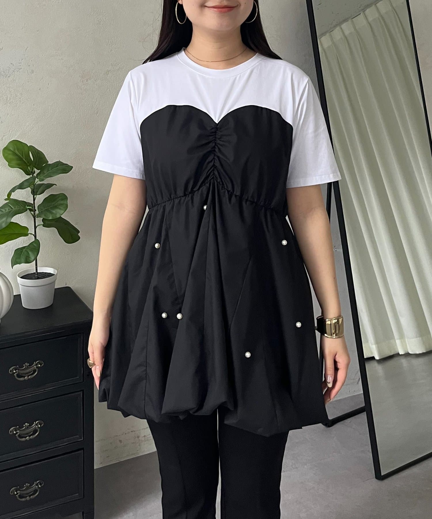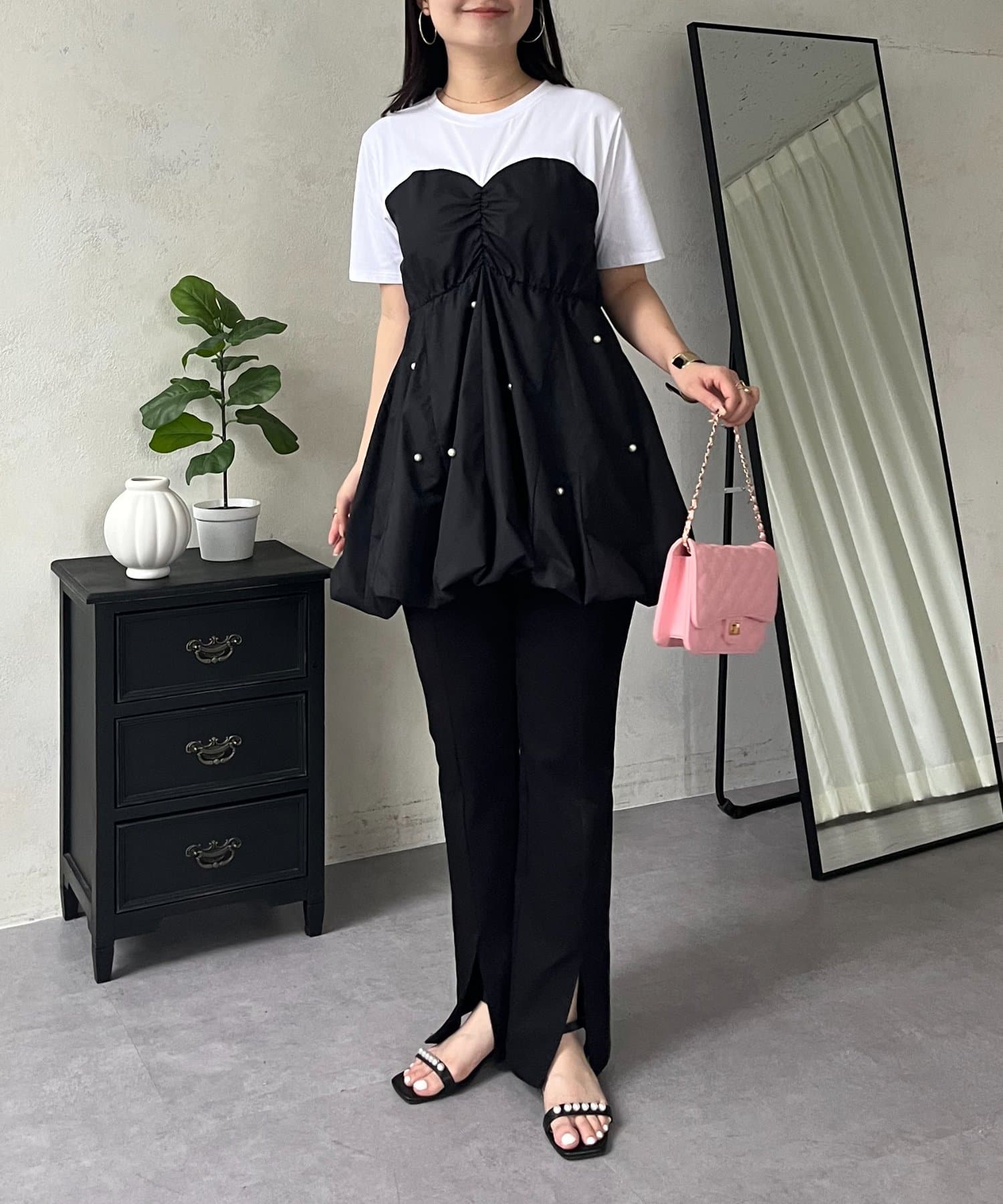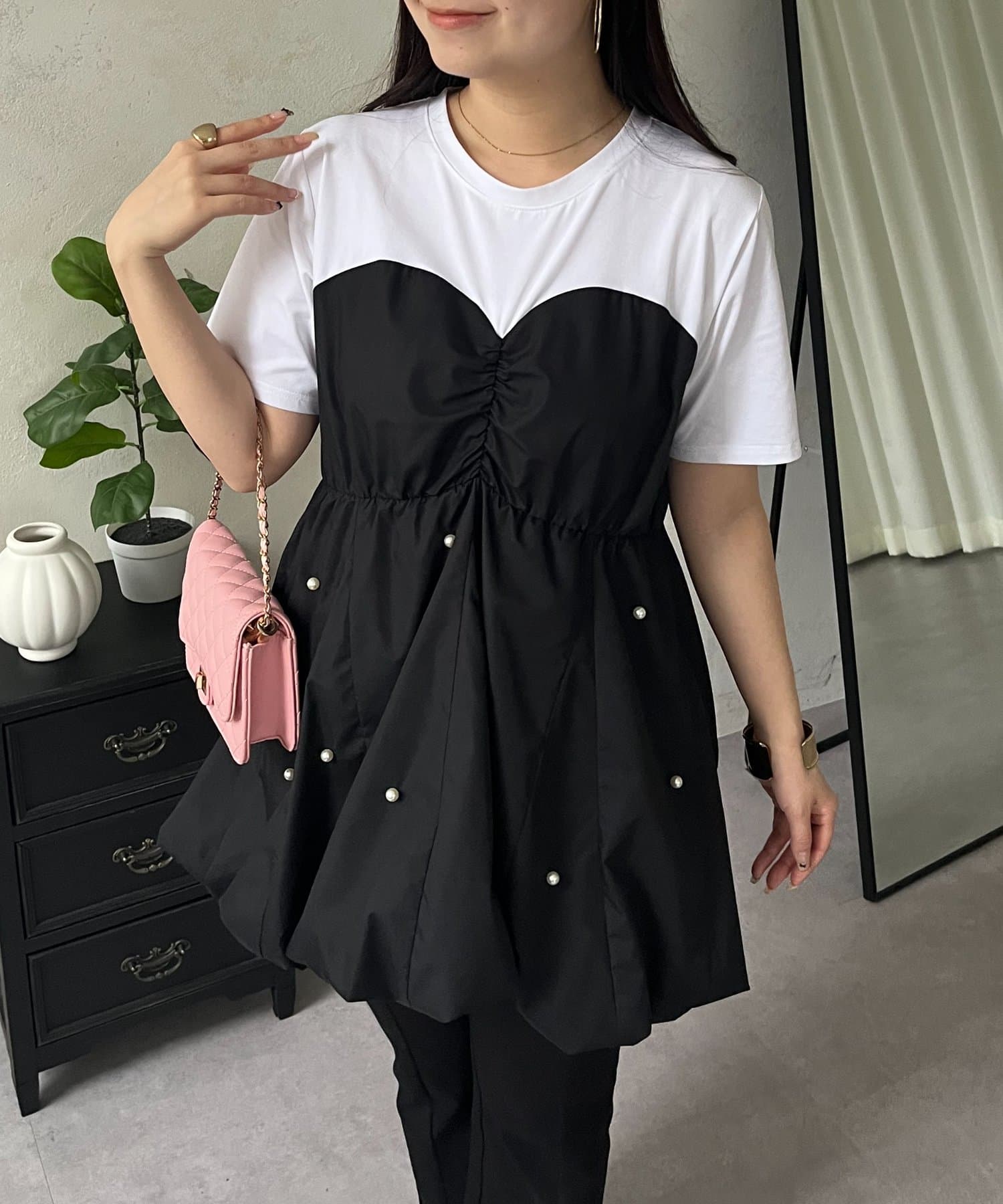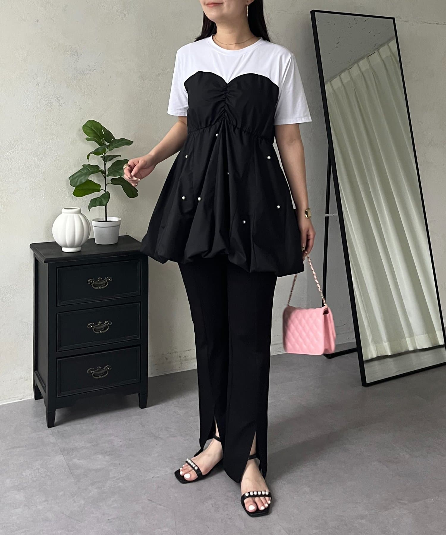 【1枚で旬のレイヤードが完成】パールが華やかなバルーンドッキングTシャツ