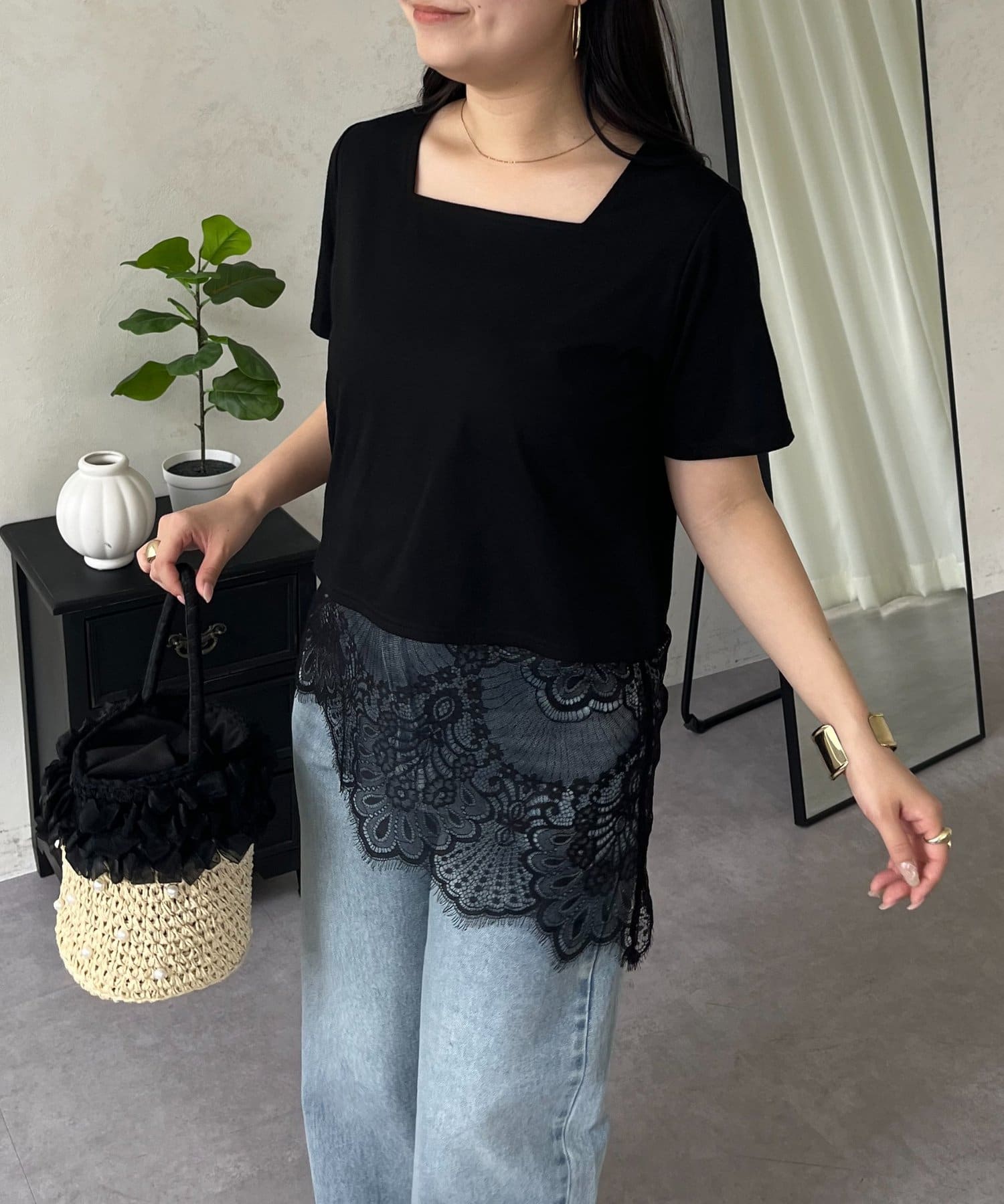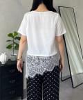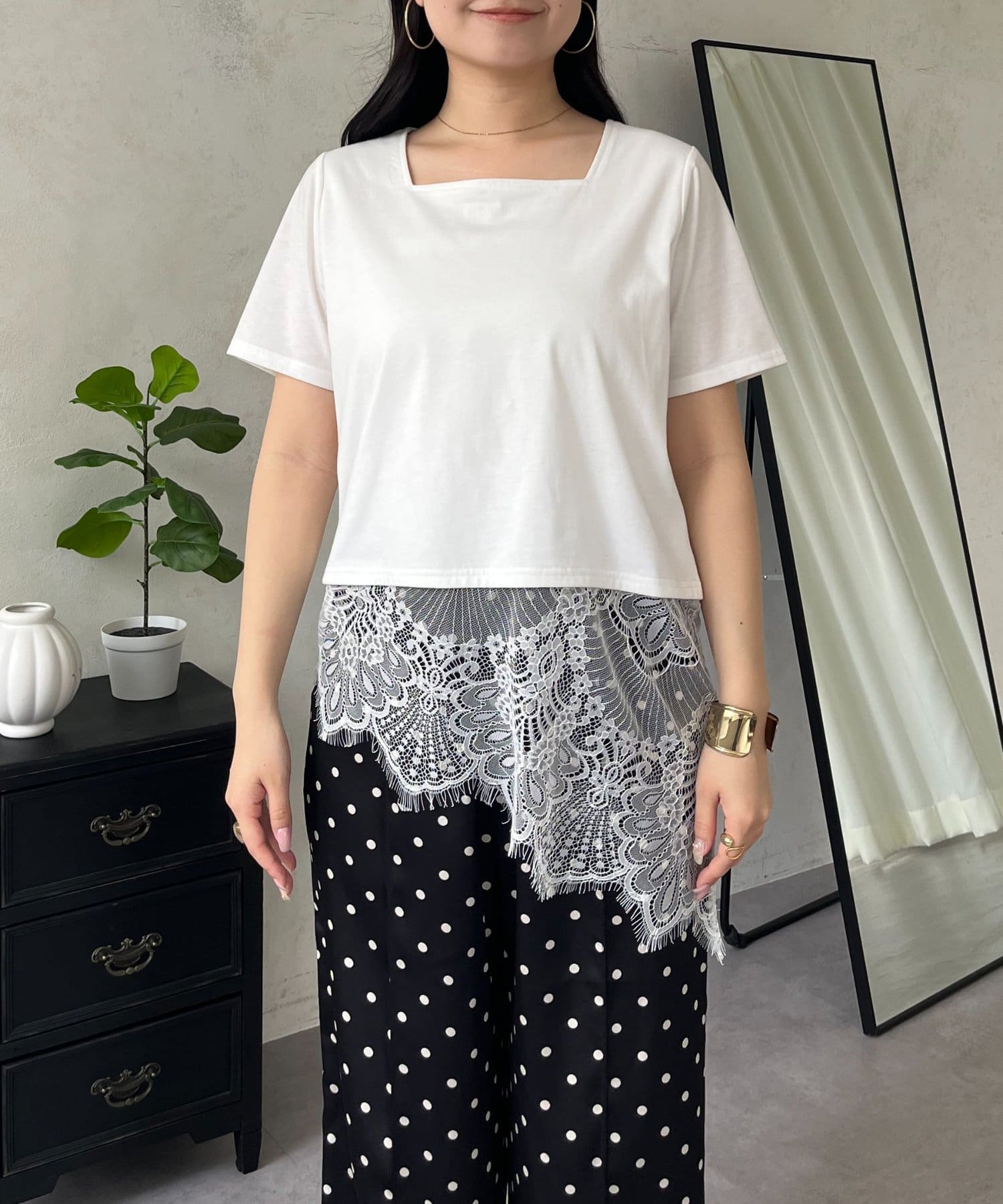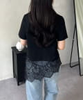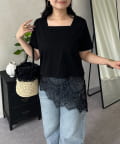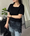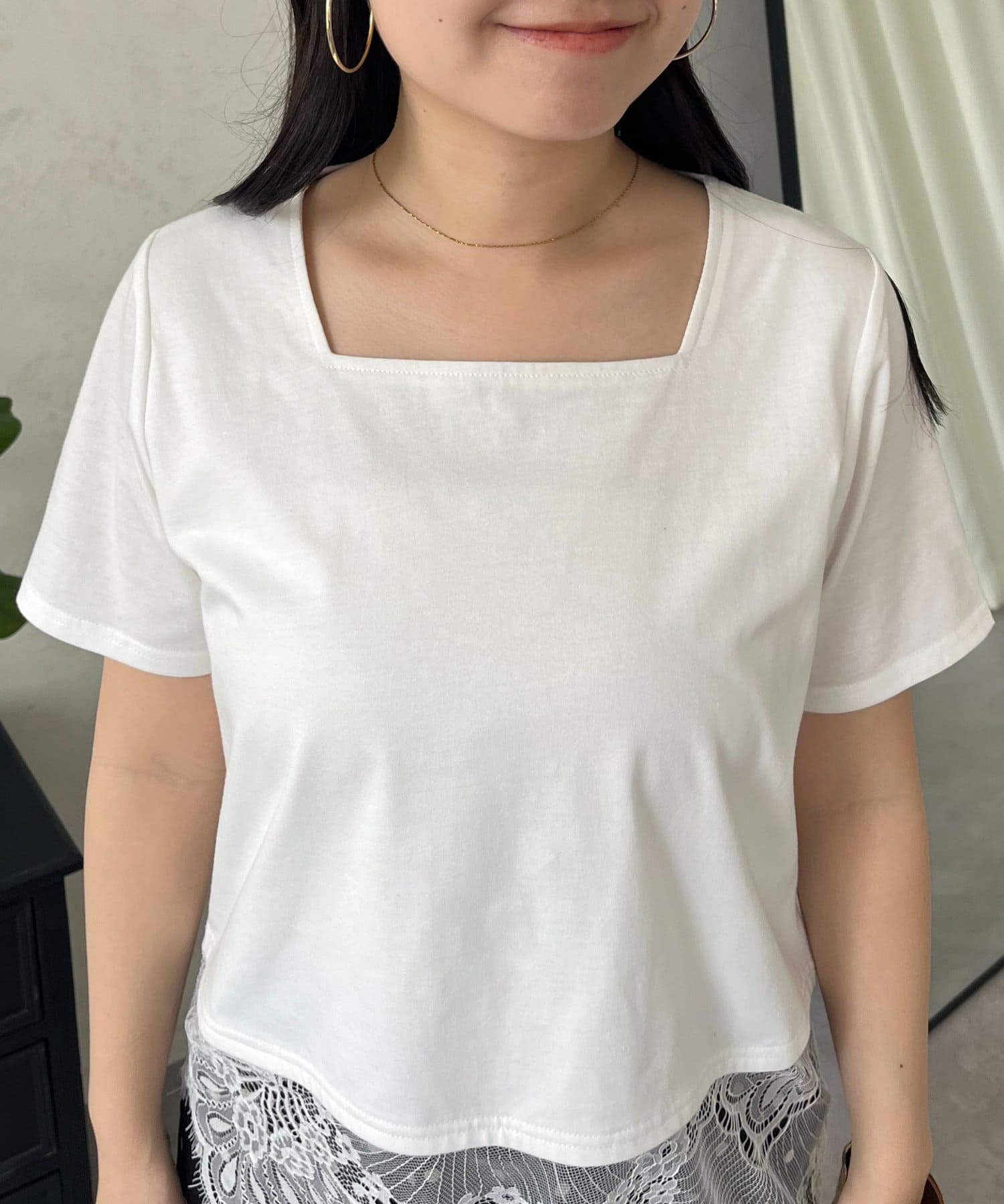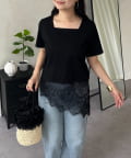 スクエアネック裾レースTシャツ