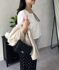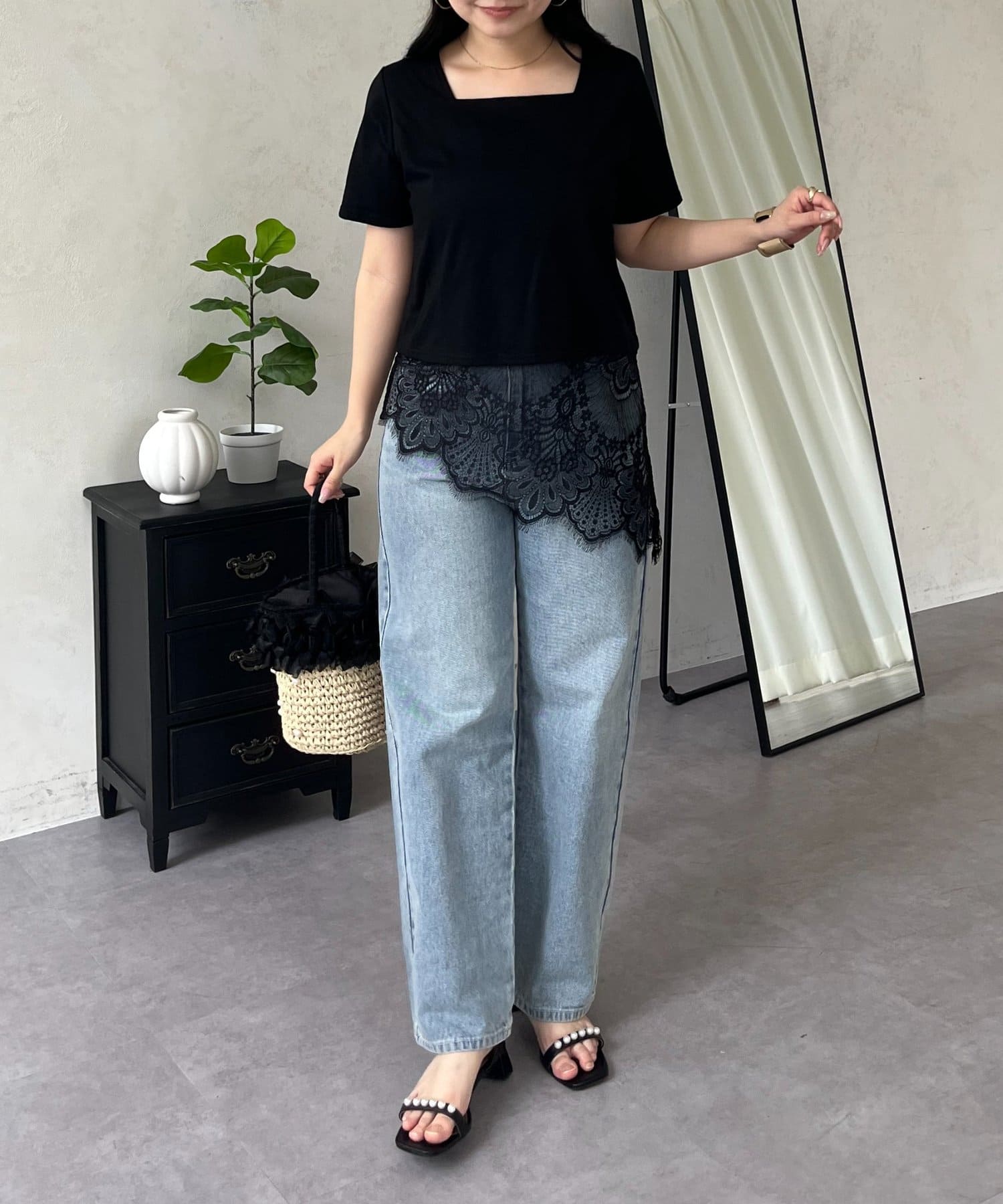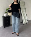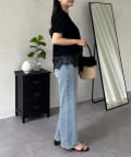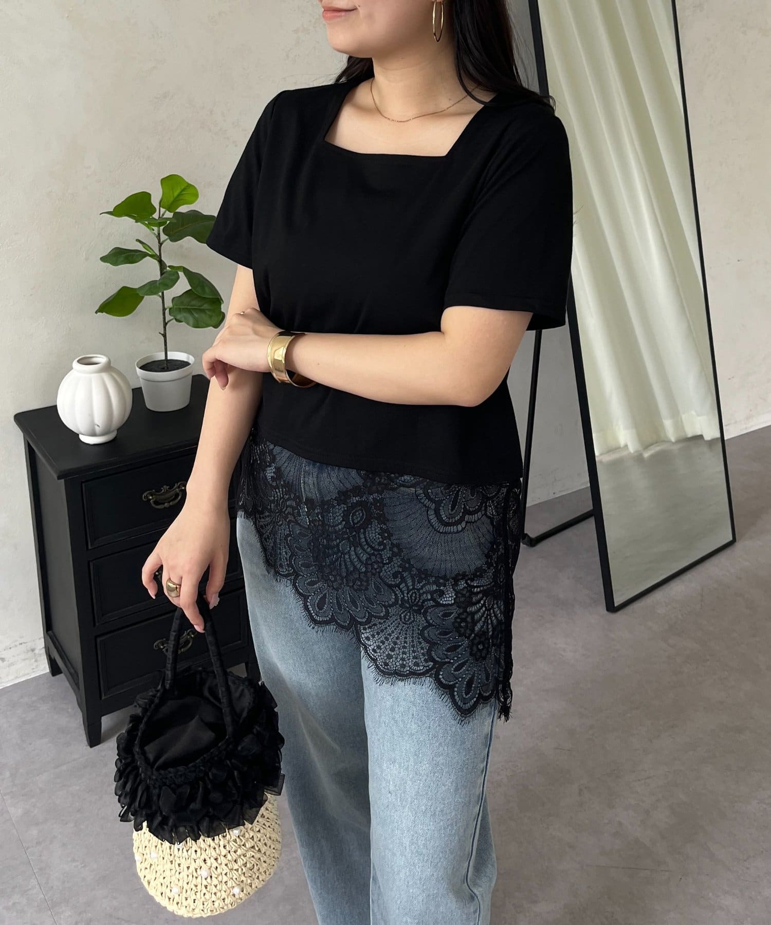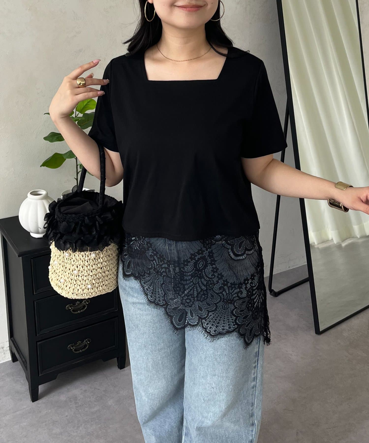 スクエアネック裾レースTシャツ