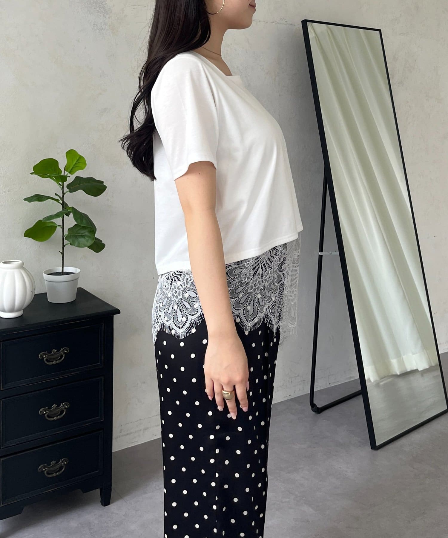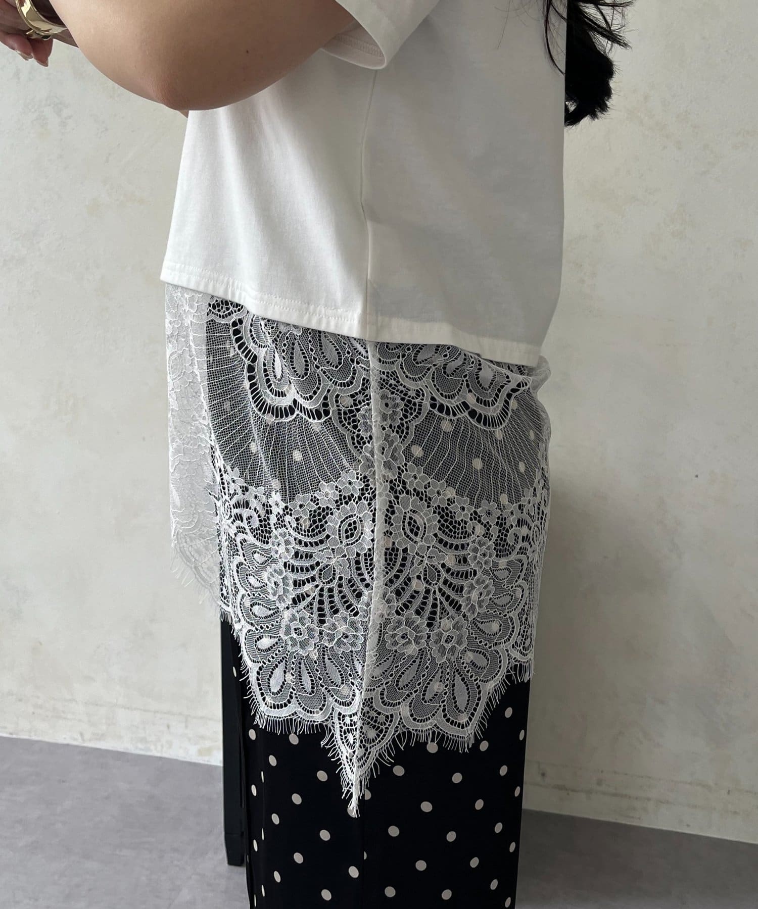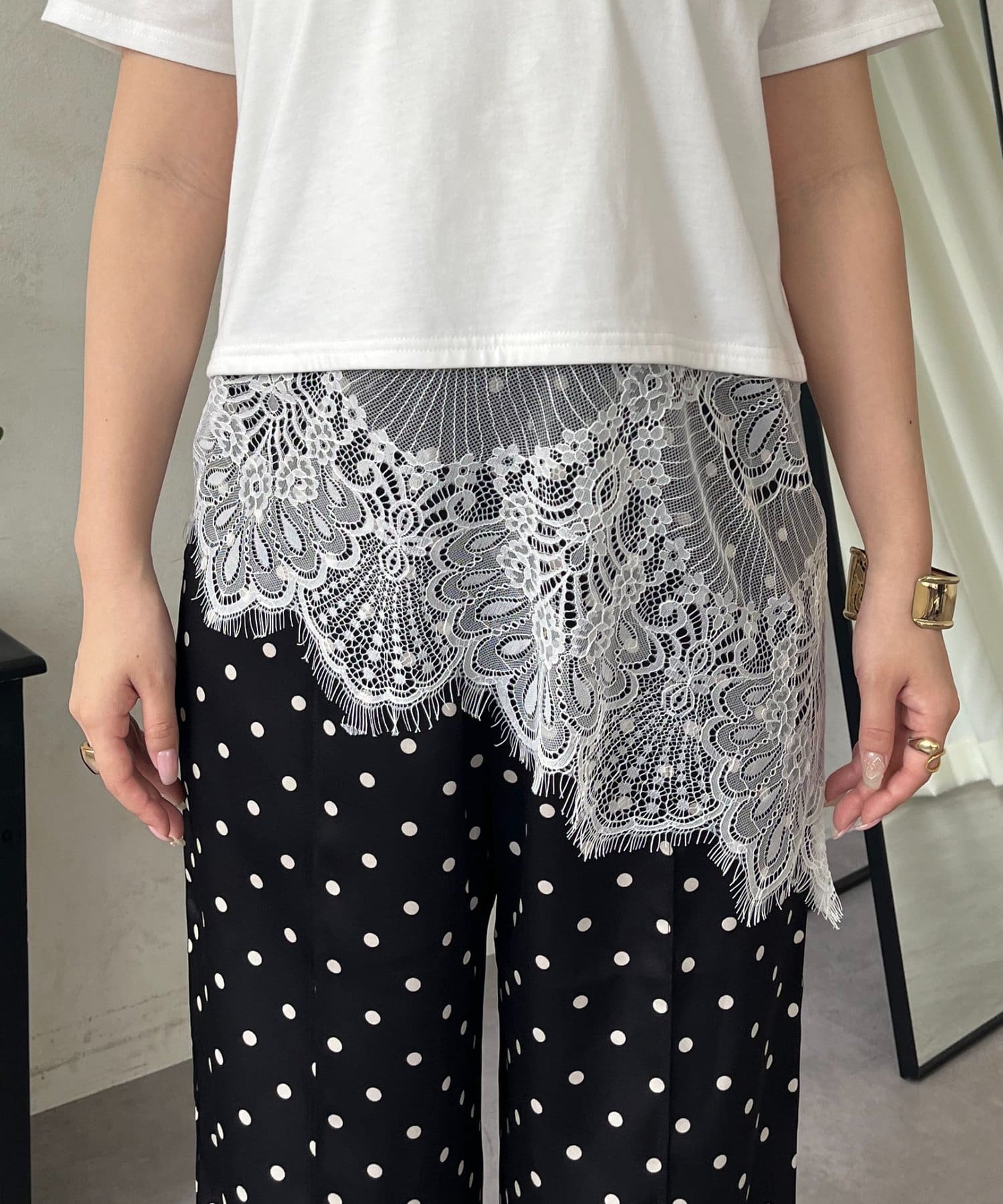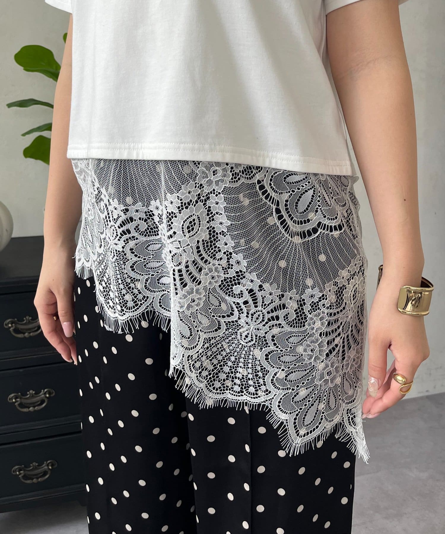 ●裾レースが、コーディネートに上品な甘さと華やかさをプラス