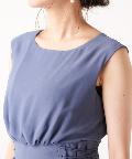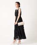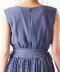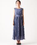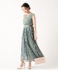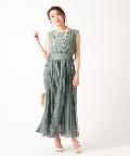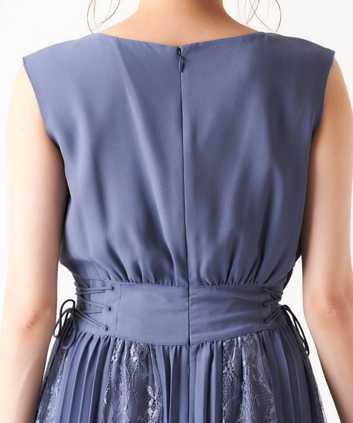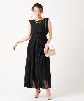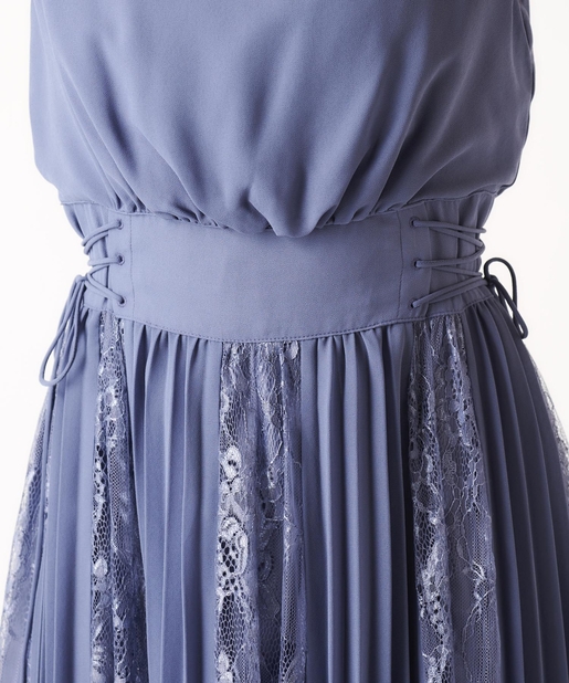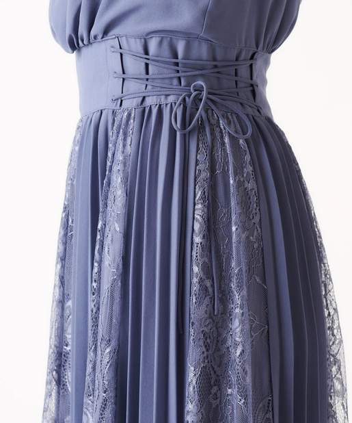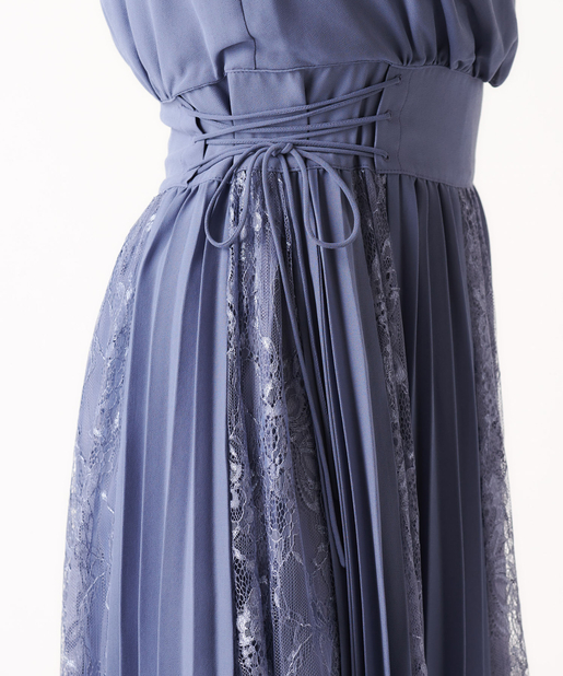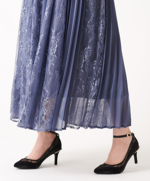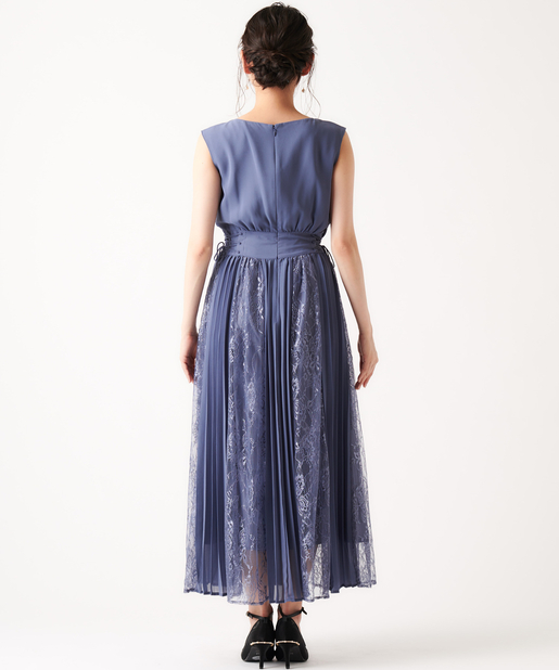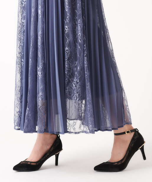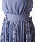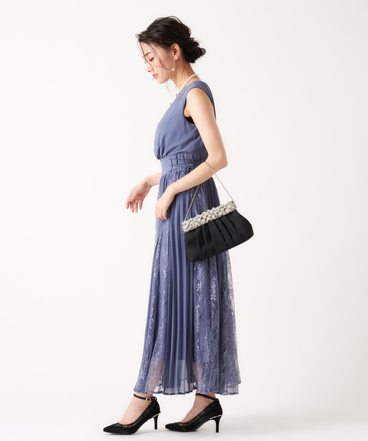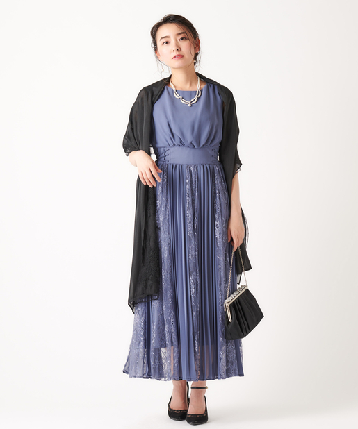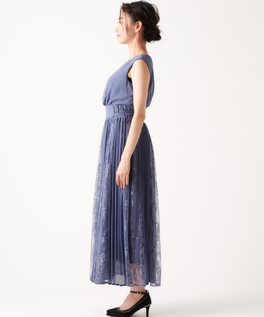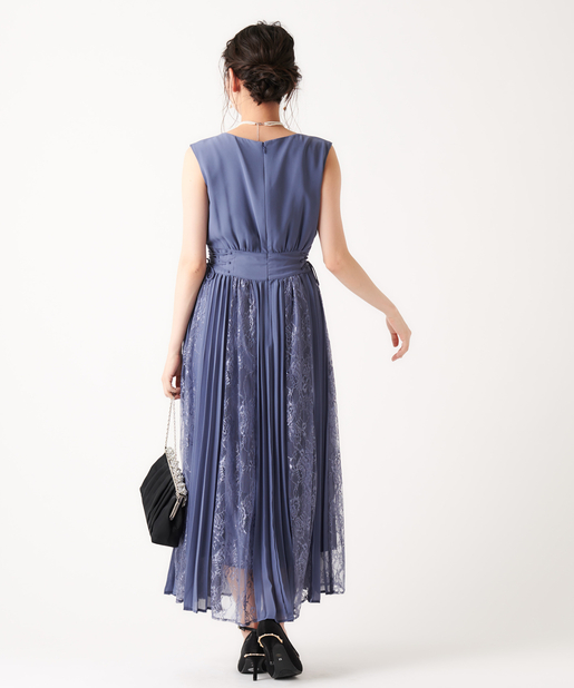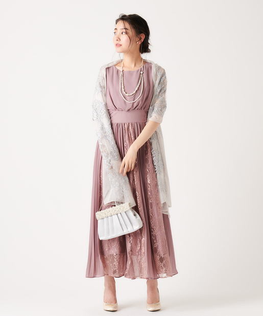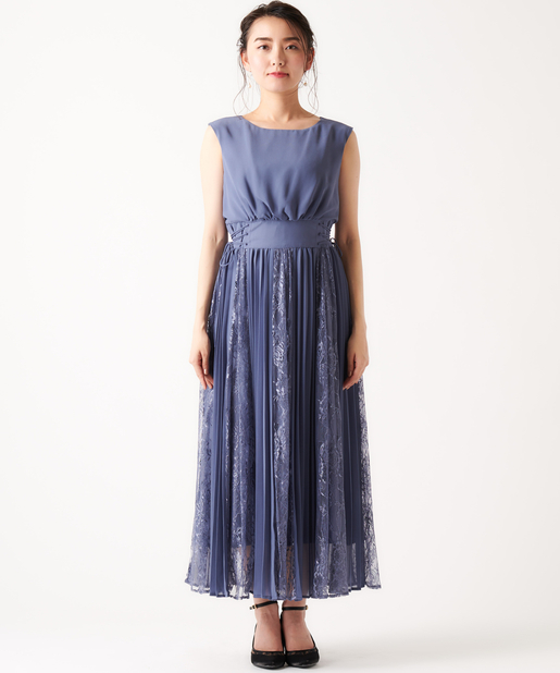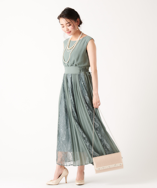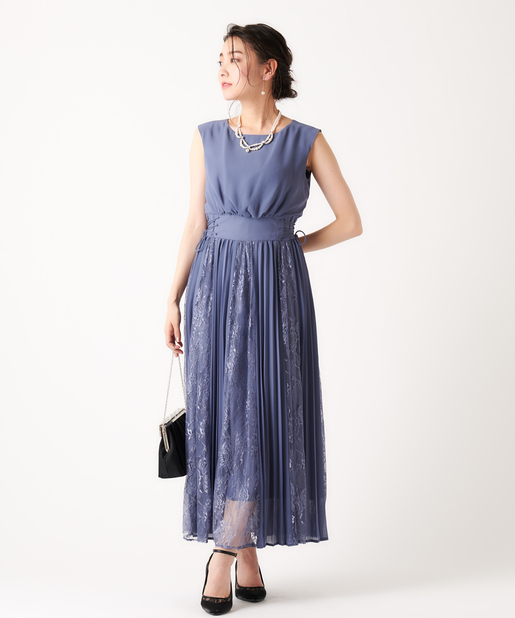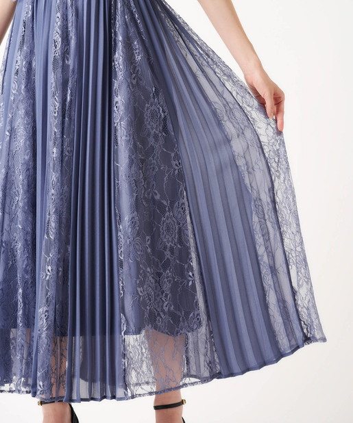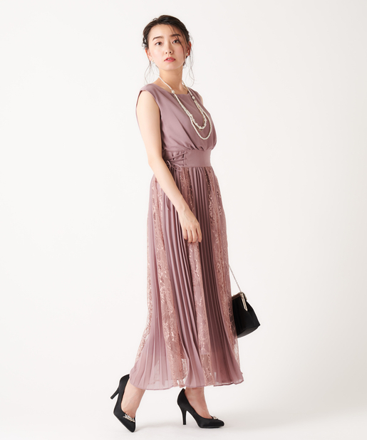 プリーツと花柄レースの切り替えが上品なワンピースドレス。