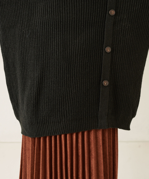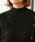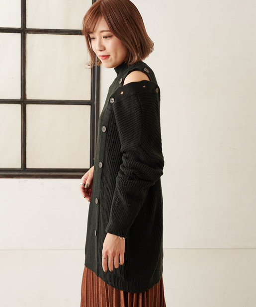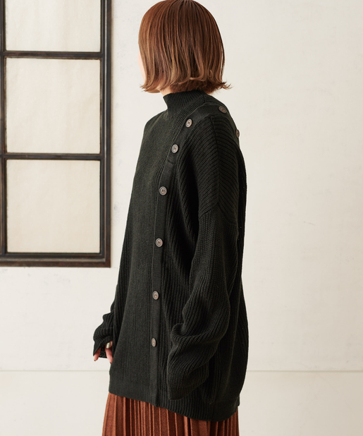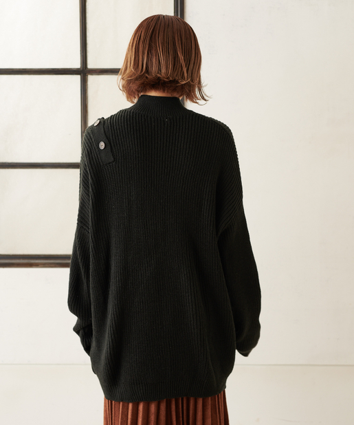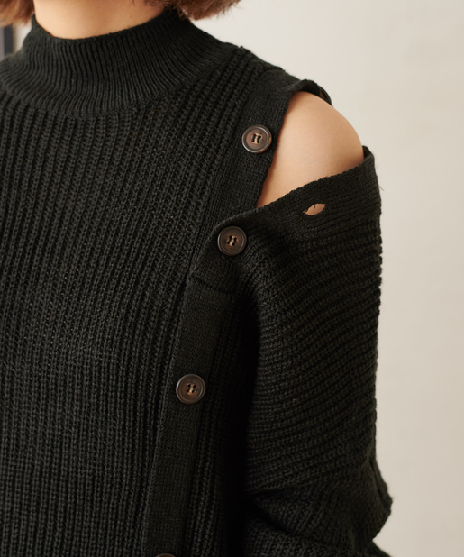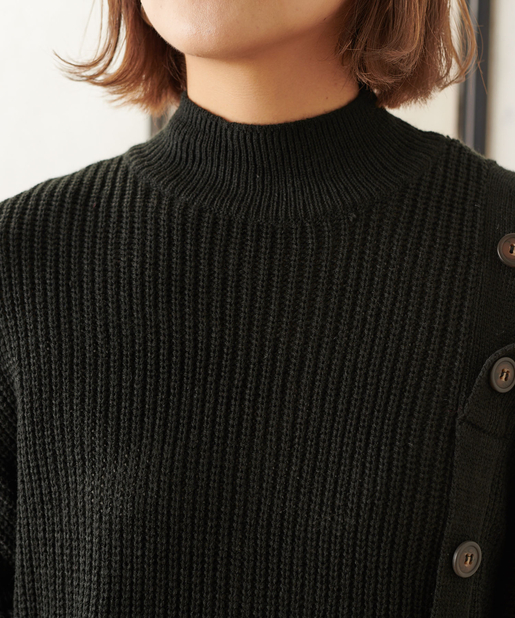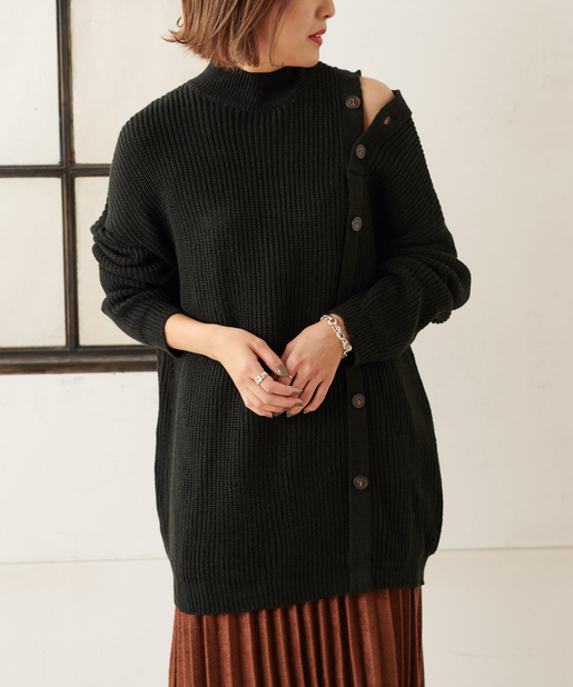 中央からずらしてあしらわれた肩ボタンがポイントのニットプルオーバー。柔らかな質感と畦編みの縦ラインで表面感のあるデザインに仕上げました。首元のハイネックで顔周りをスッキリと見せてくれます。左肩のボタンを開けて、さりげない肌見せコーデも出来る2Way仕様。アレンジスタイリングに使えるアイテムはこれからのシーズンで活躍してくれます。