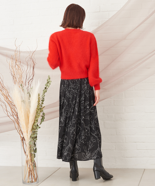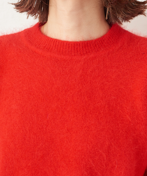 ふんわりモコモコしたソフトなタッチが魅力のアンゴラ混のプルオーバー。シンプルながらも女性らしい印象に仕上げ、短め丈でスタイル効果も狙えるオススメの一枚です。ボリューム感のあるスリーブで華奢な腕を演出。ハイウエストのボトムスと合わせれば、バランスの取れたコーディネートが完成します。