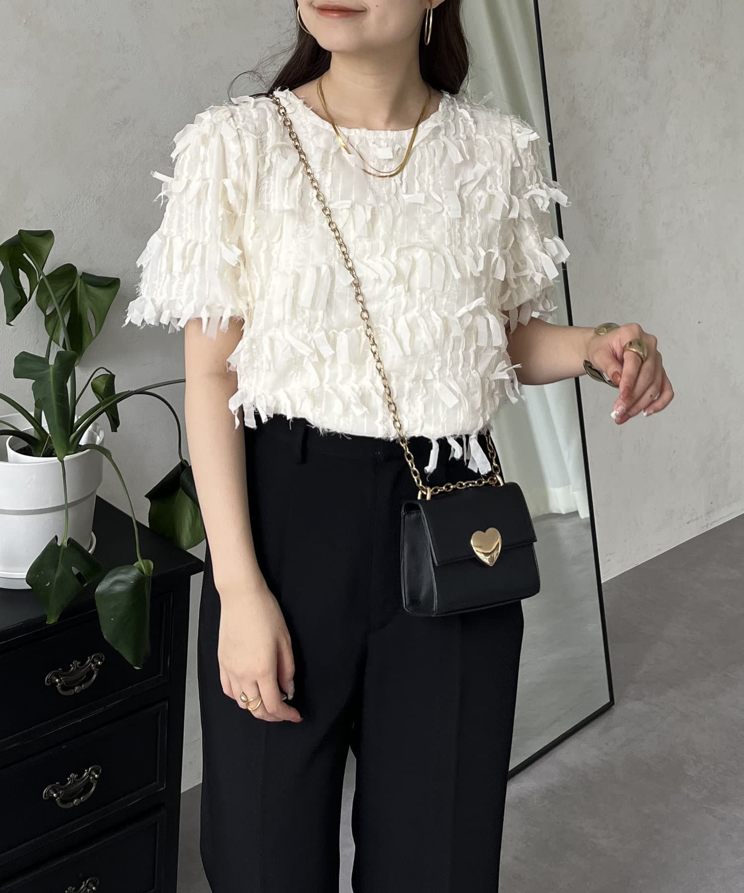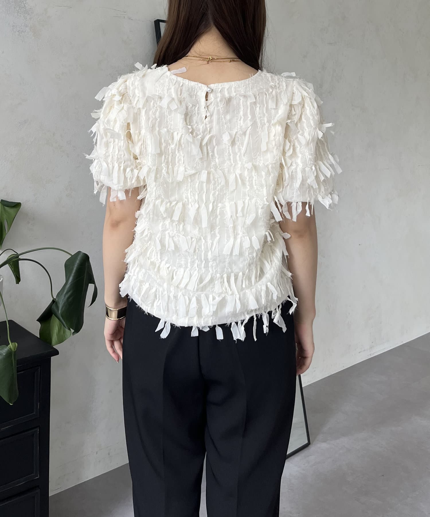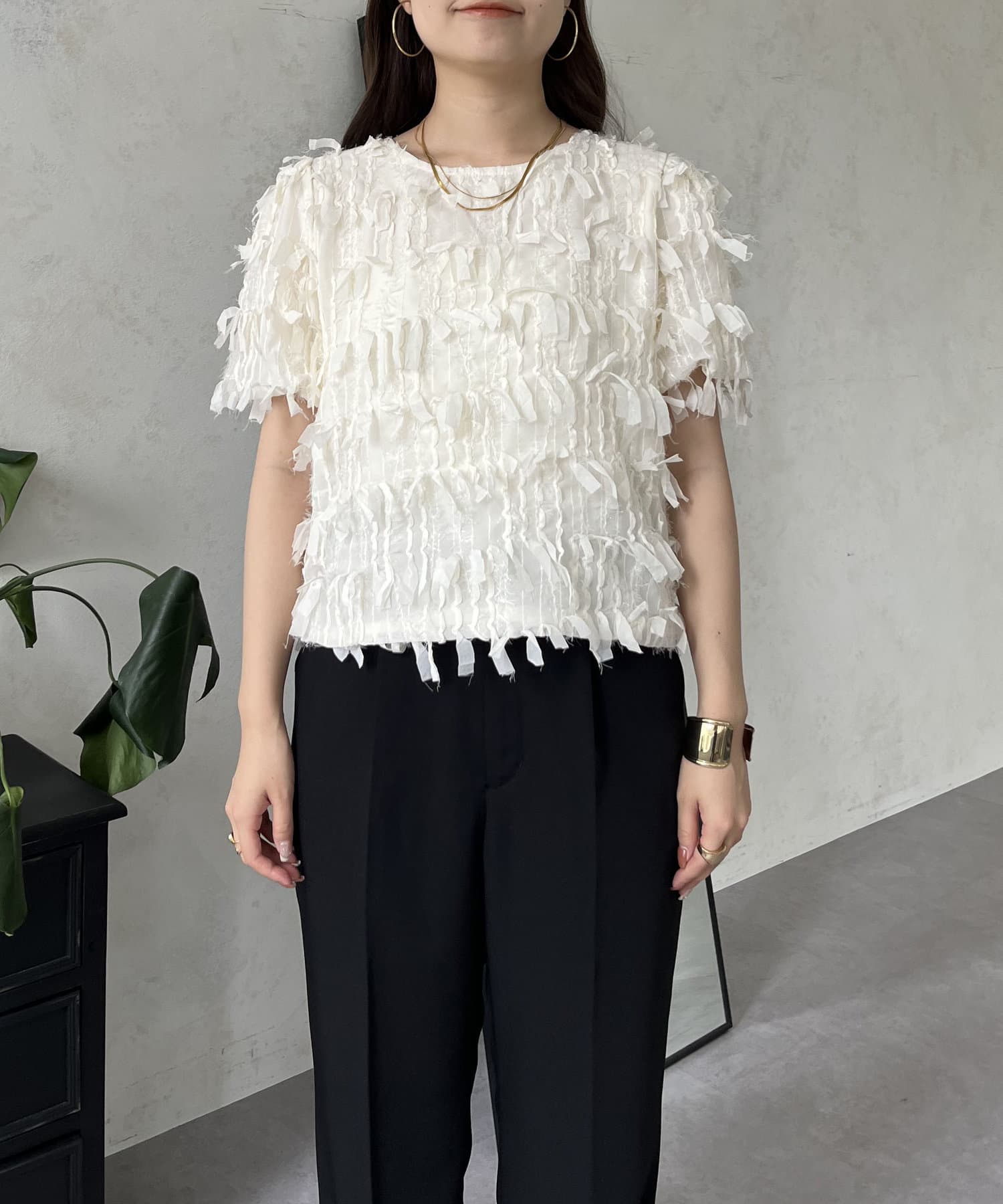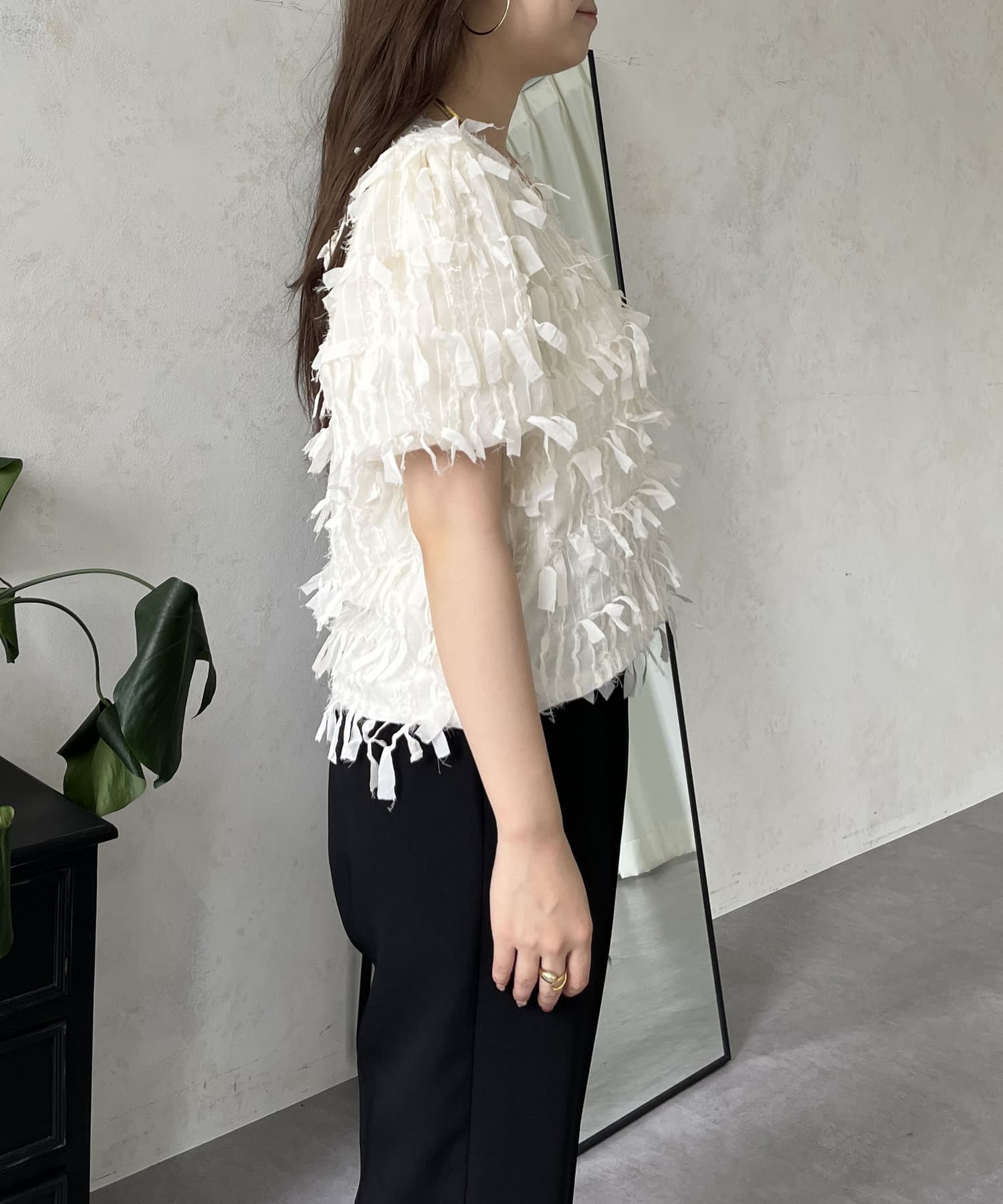 ●今年らしい立体的なフリンジデザインが大人の程よい甘さを引き出してくれるトップス