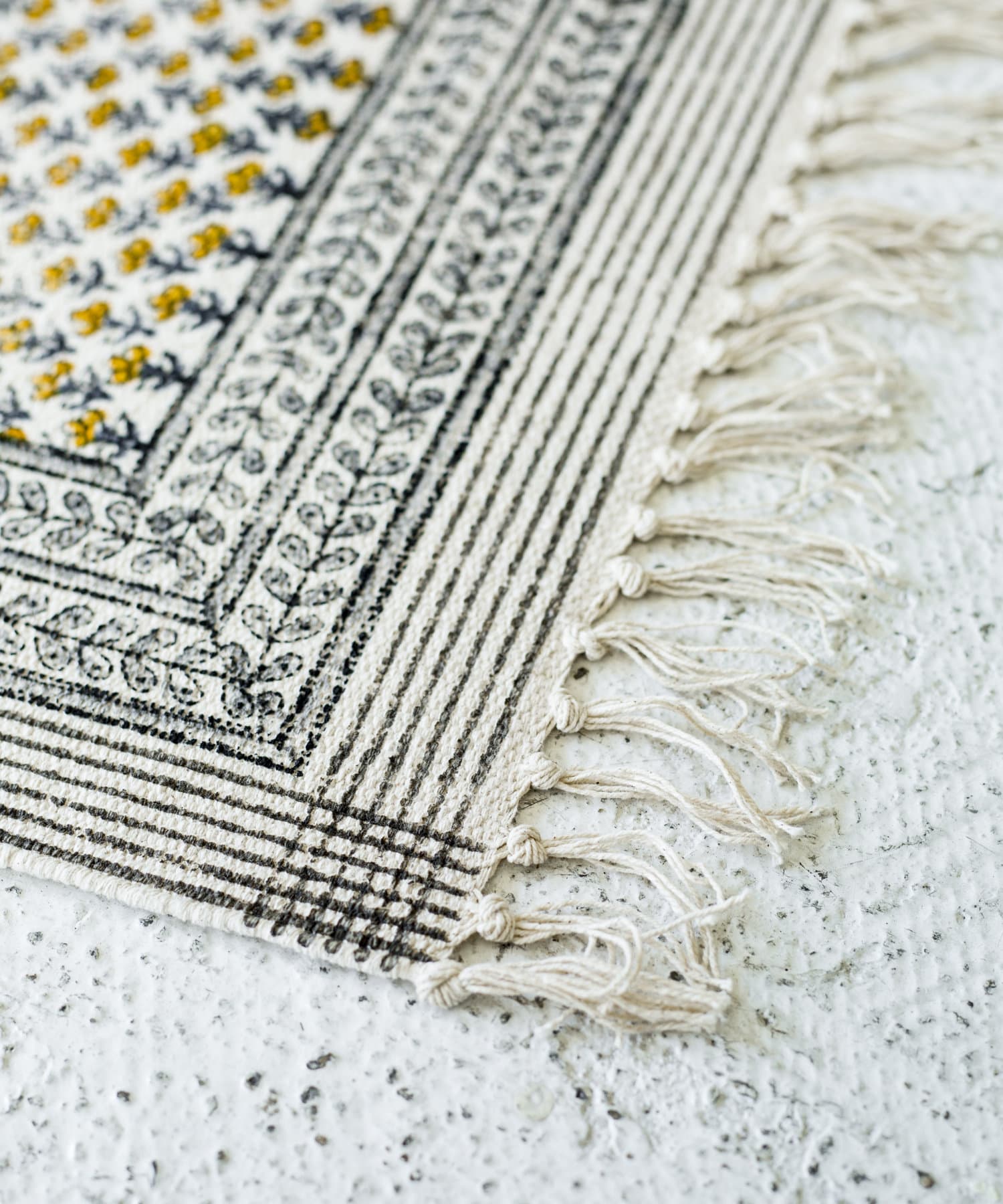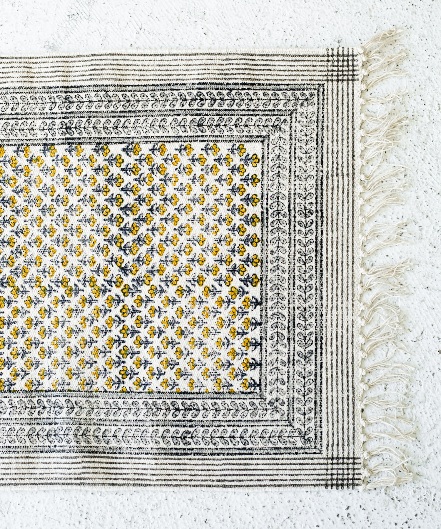 ・手織りラグマットに、小さな黄色い花のモチーフを