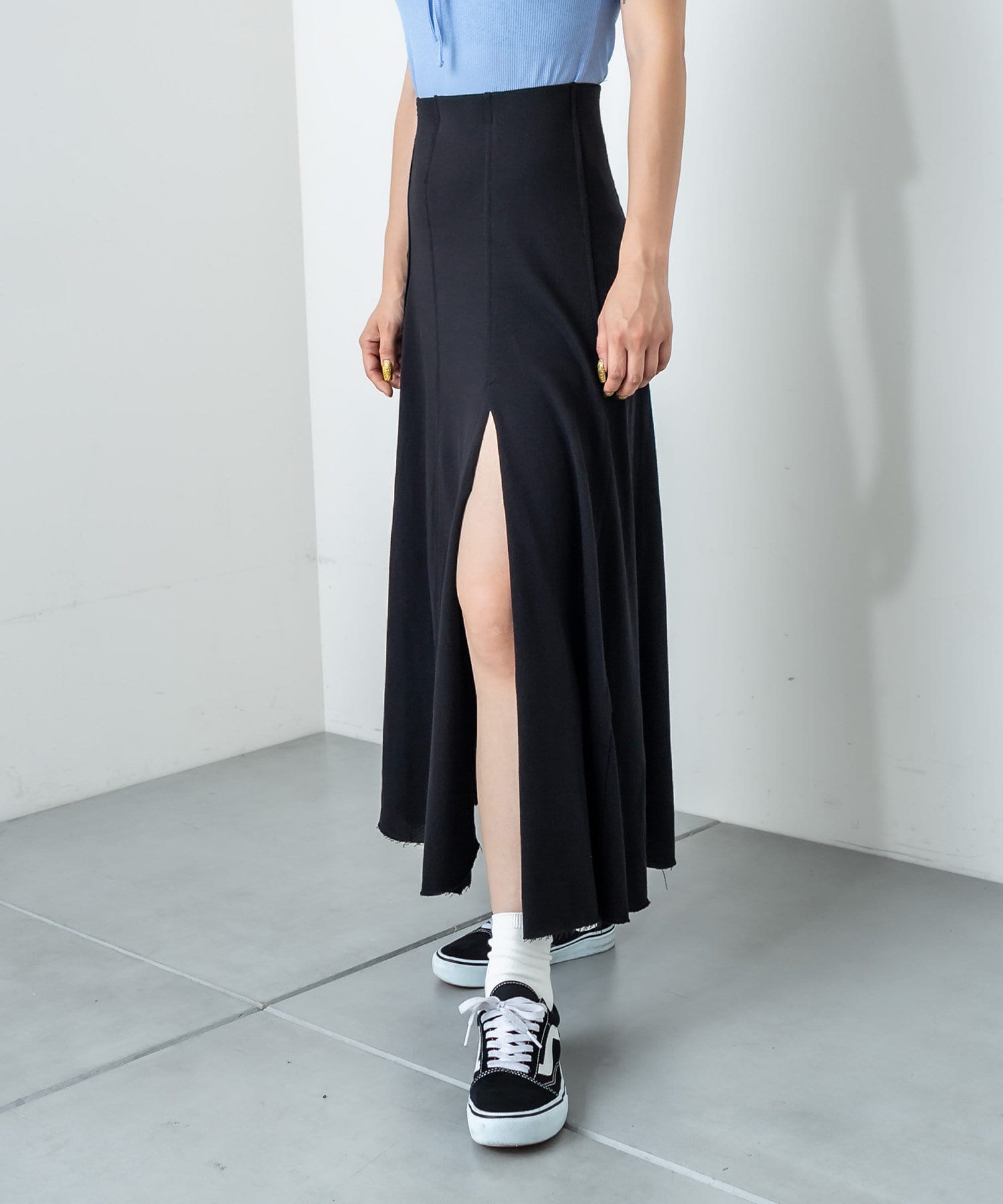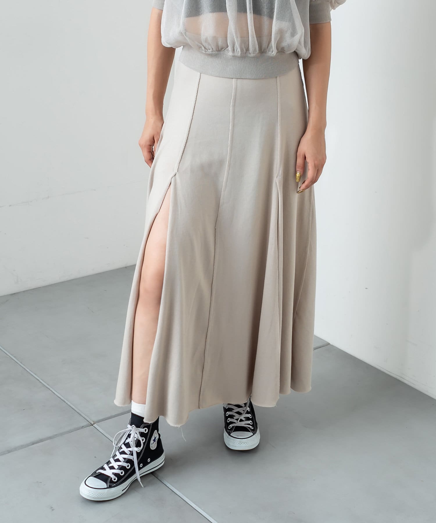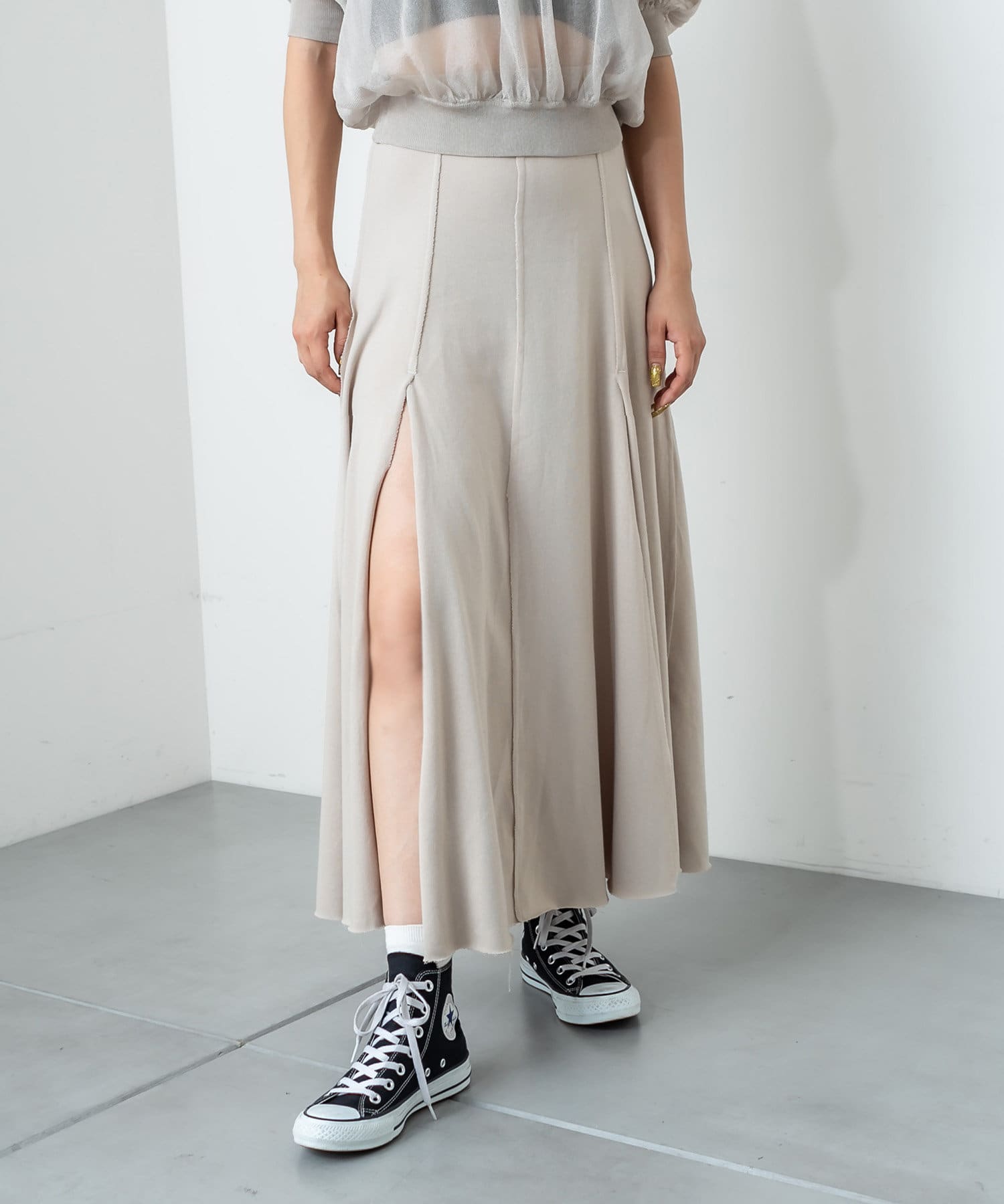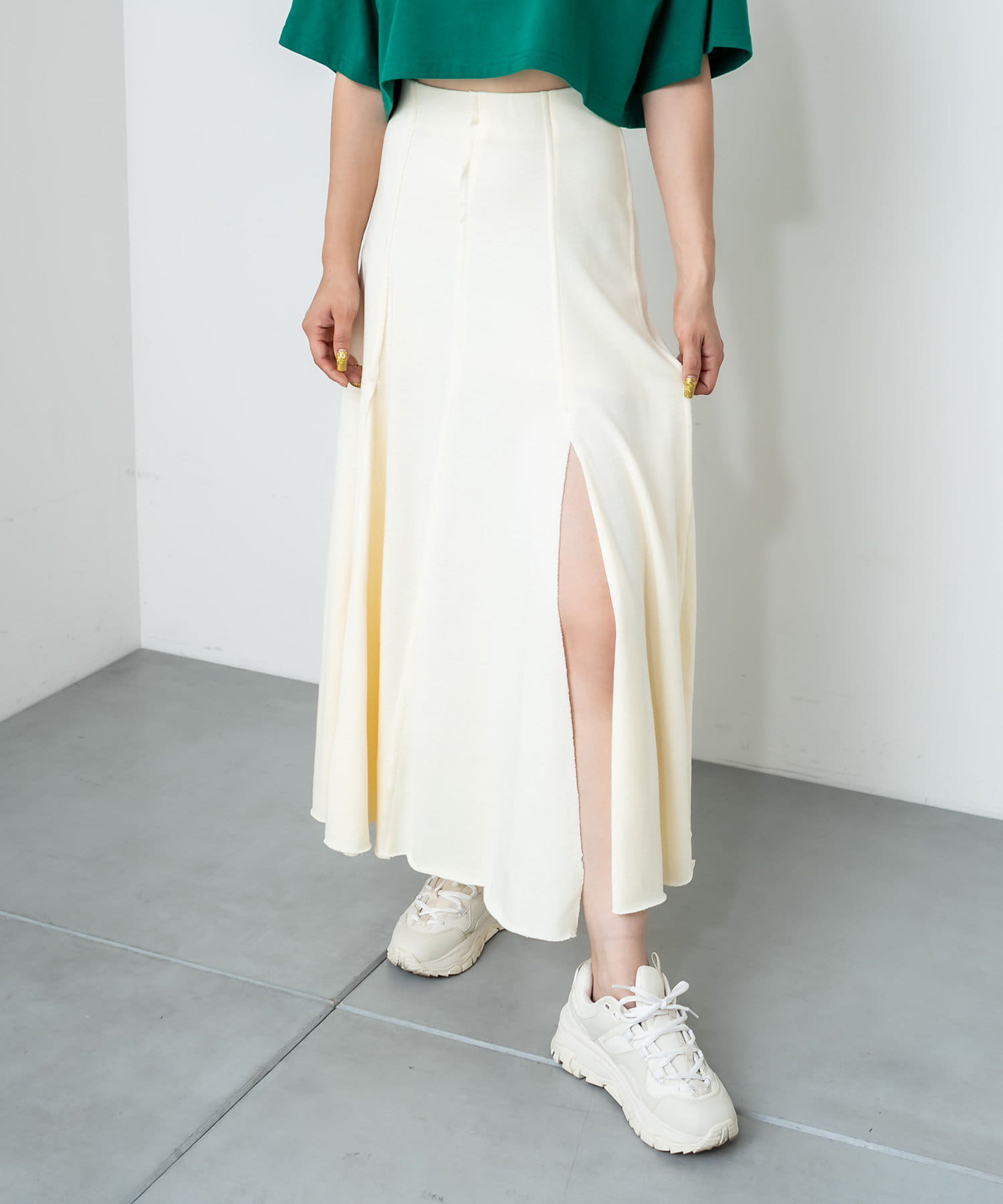 フロントに深く入ったスリットが魅力のハイスリットスカート。