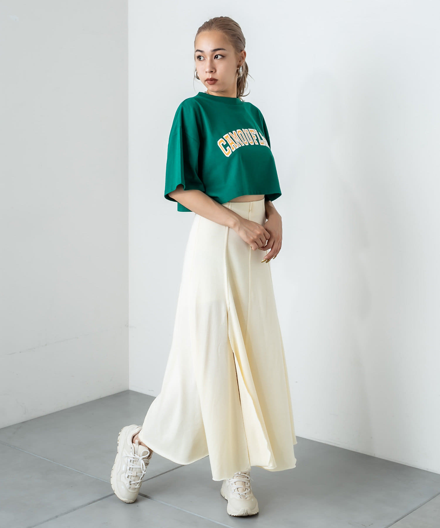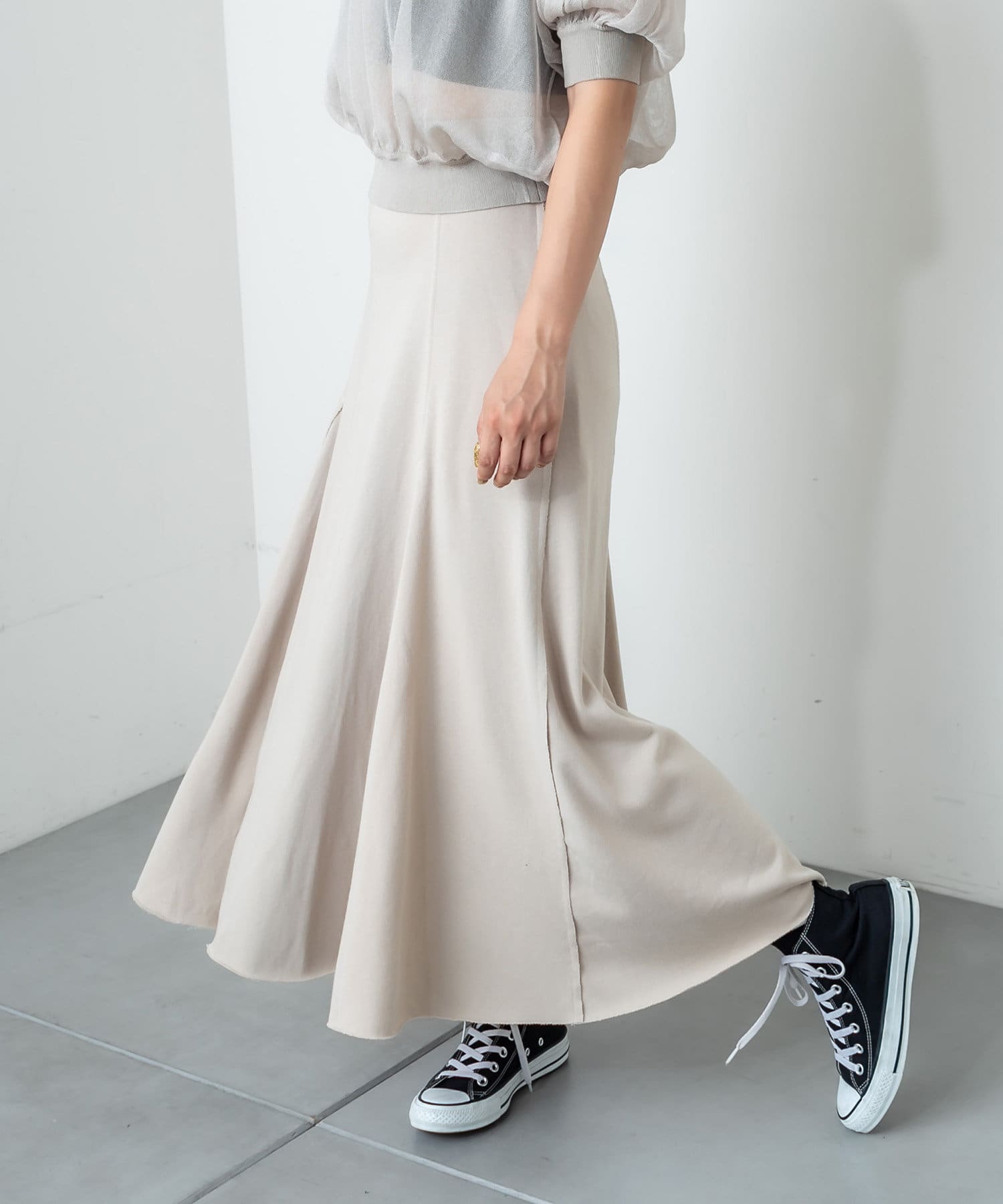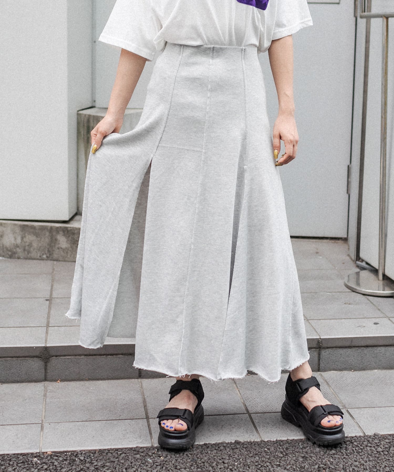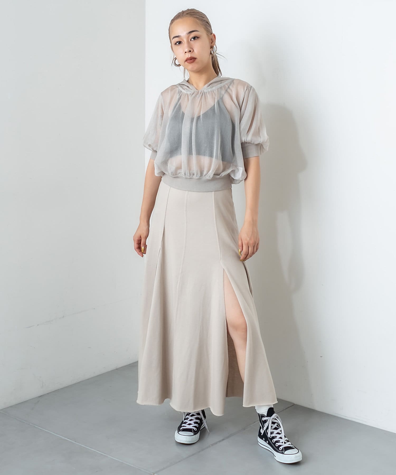 フロントに深く入ったスリットが魅力のハイスリットスカート。