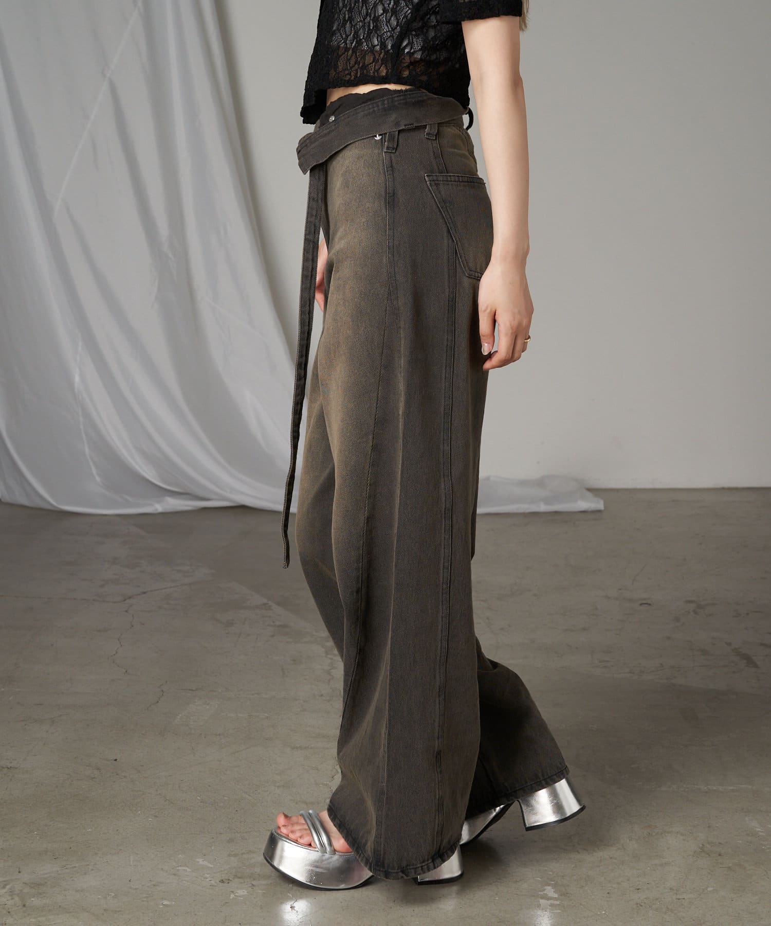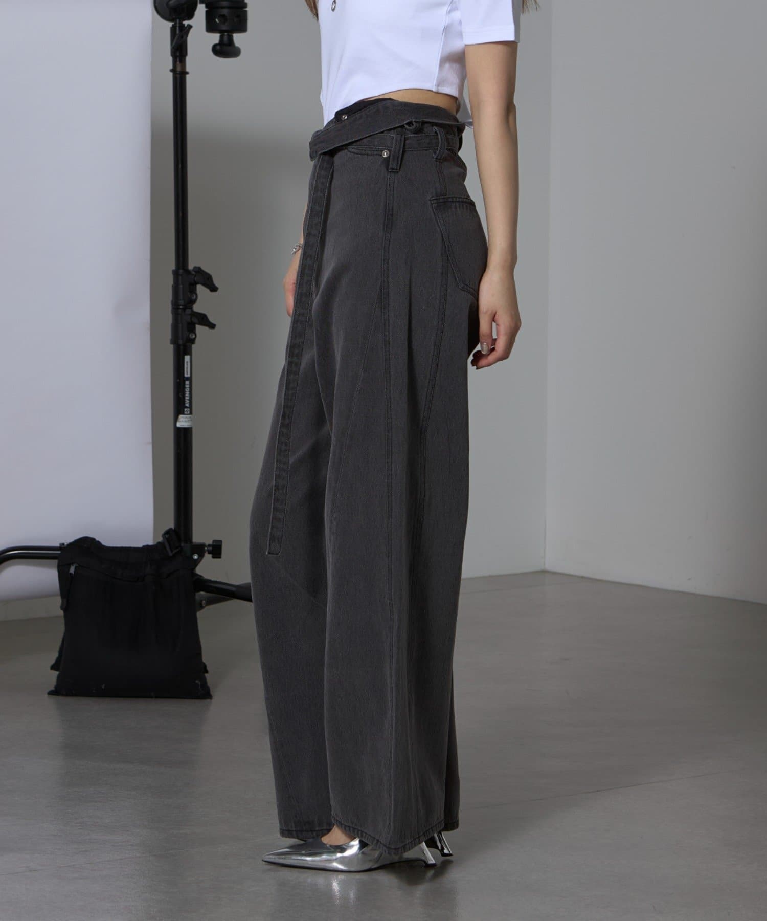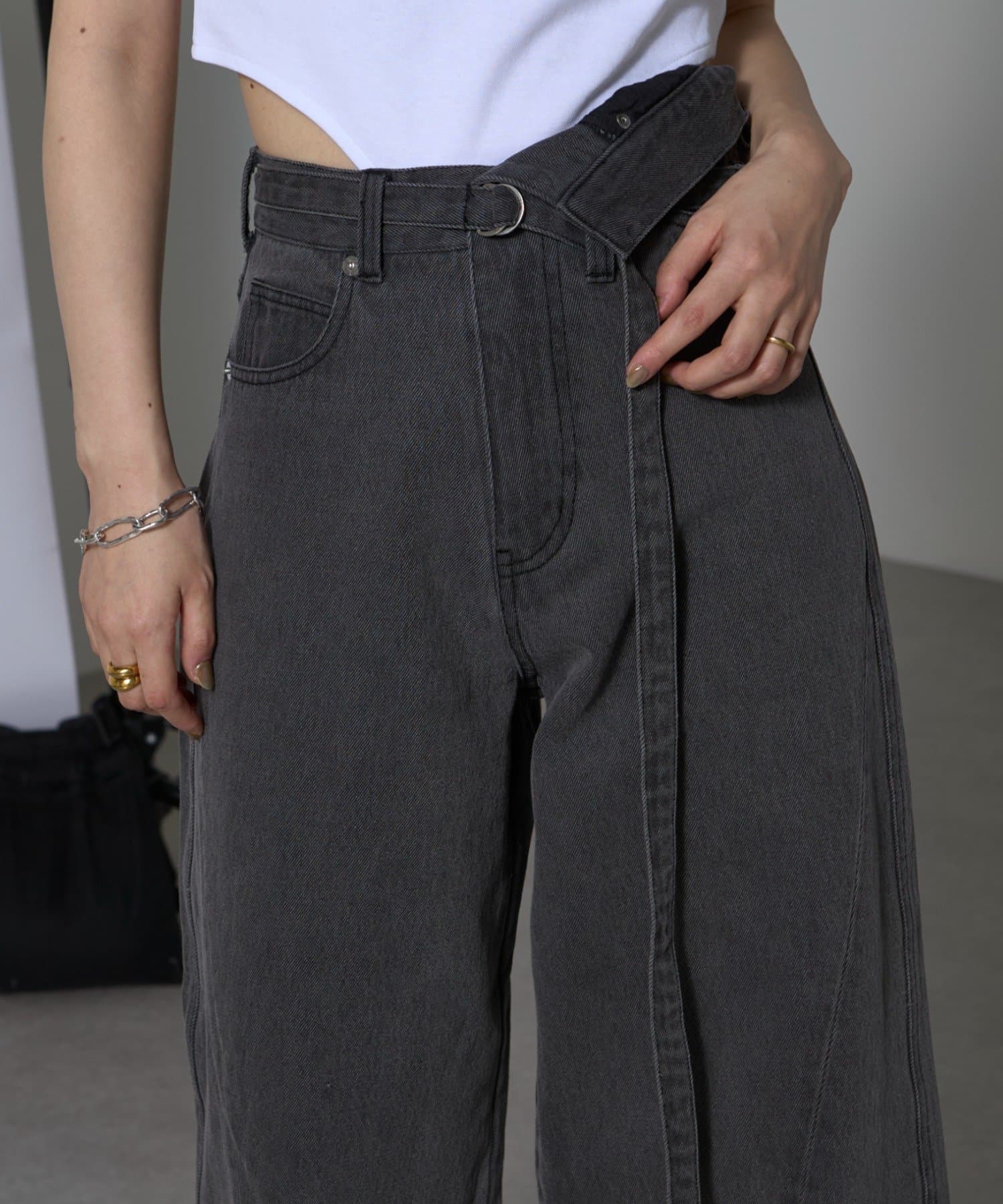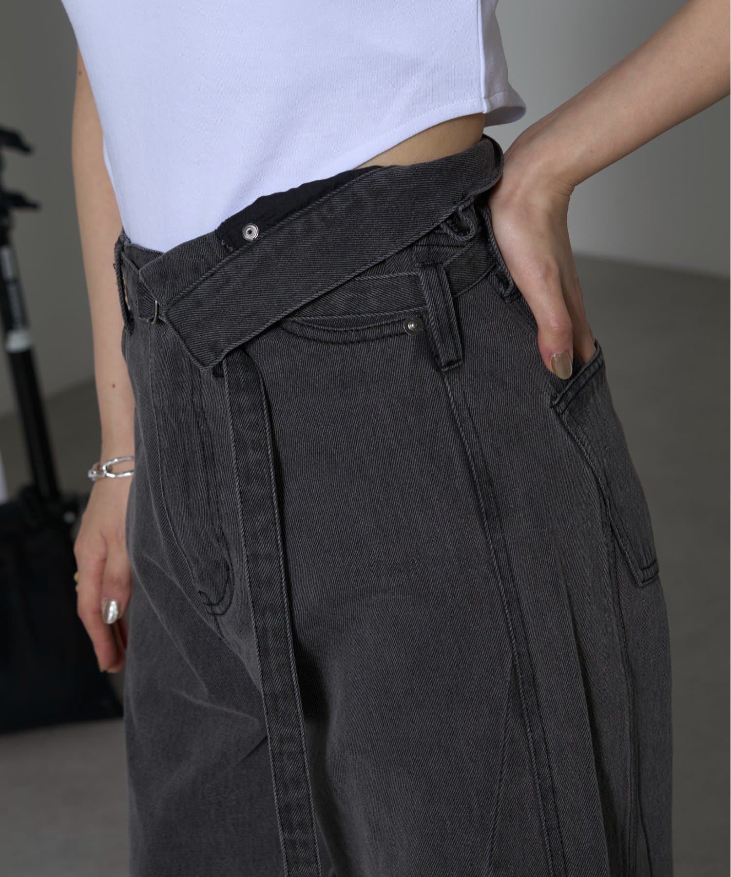ウエストのアシンメトリーデザインは折り返しても着用可能。