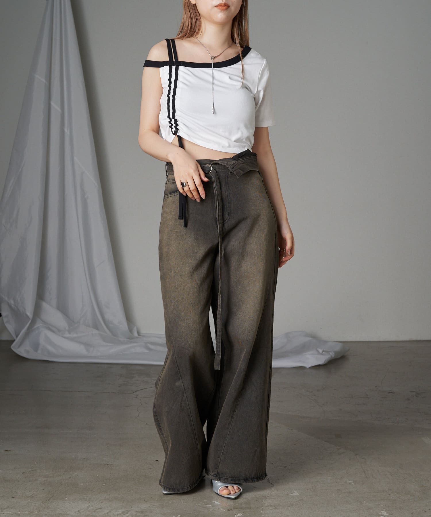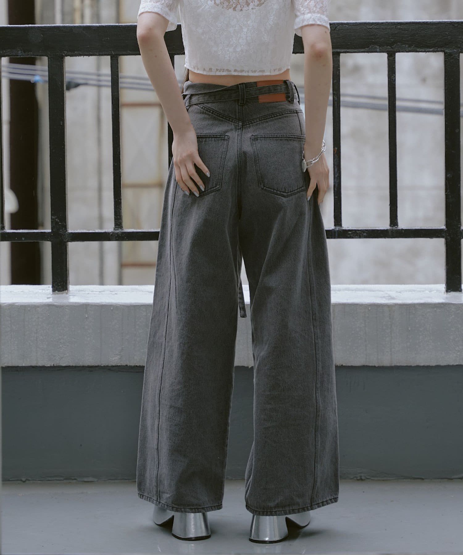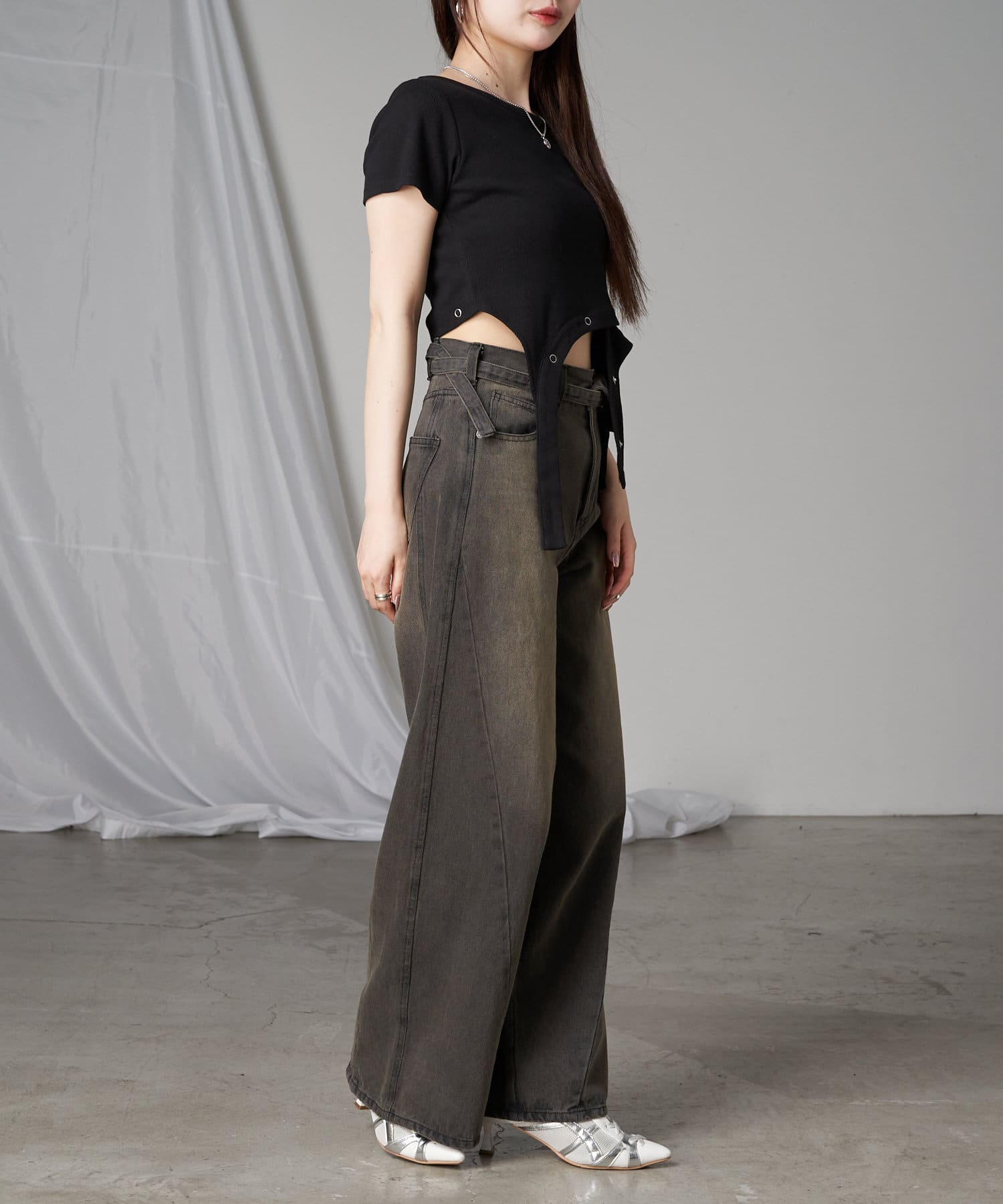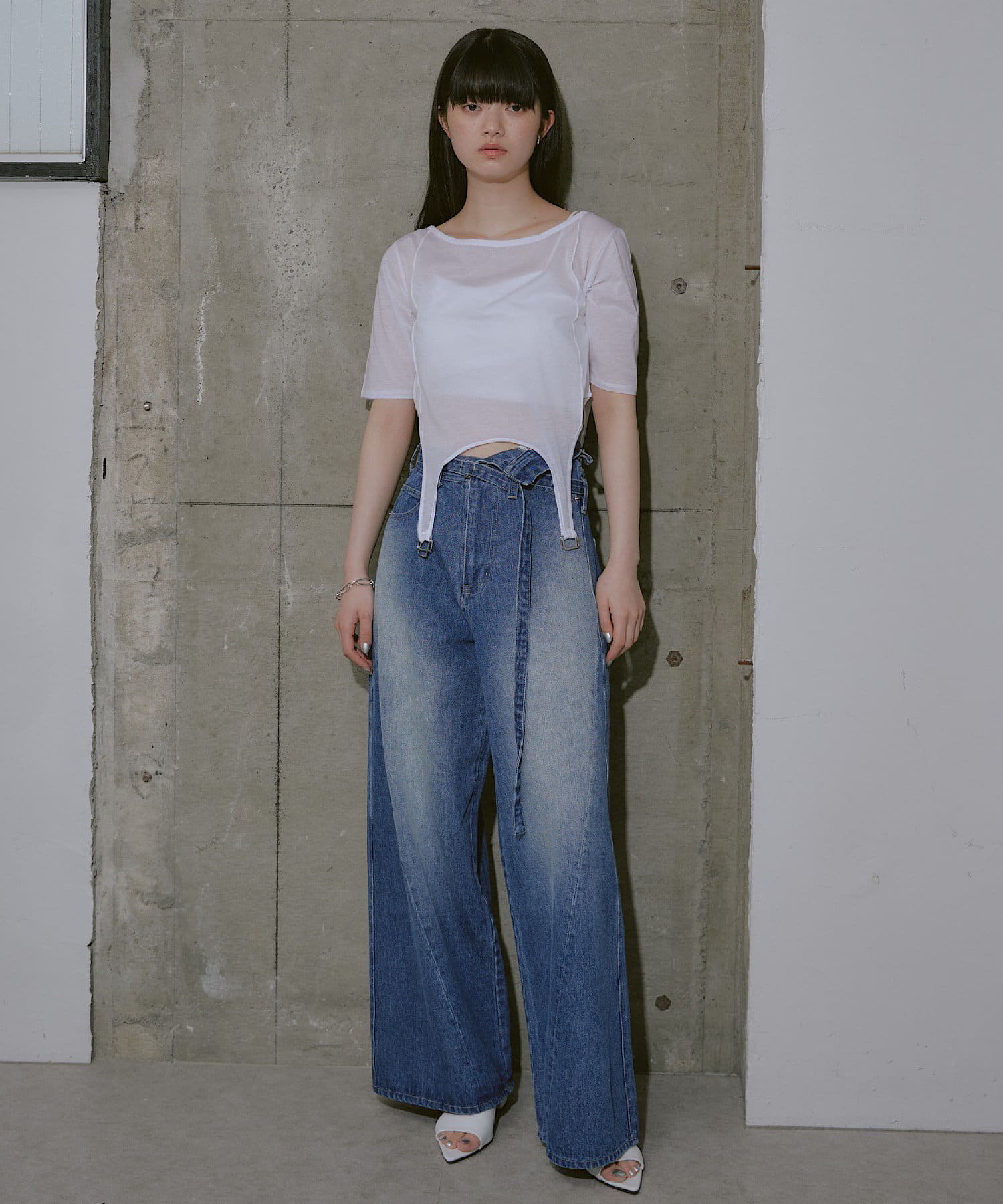ウエストのアシンメトリーデザインは折り返しても着用可能。