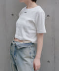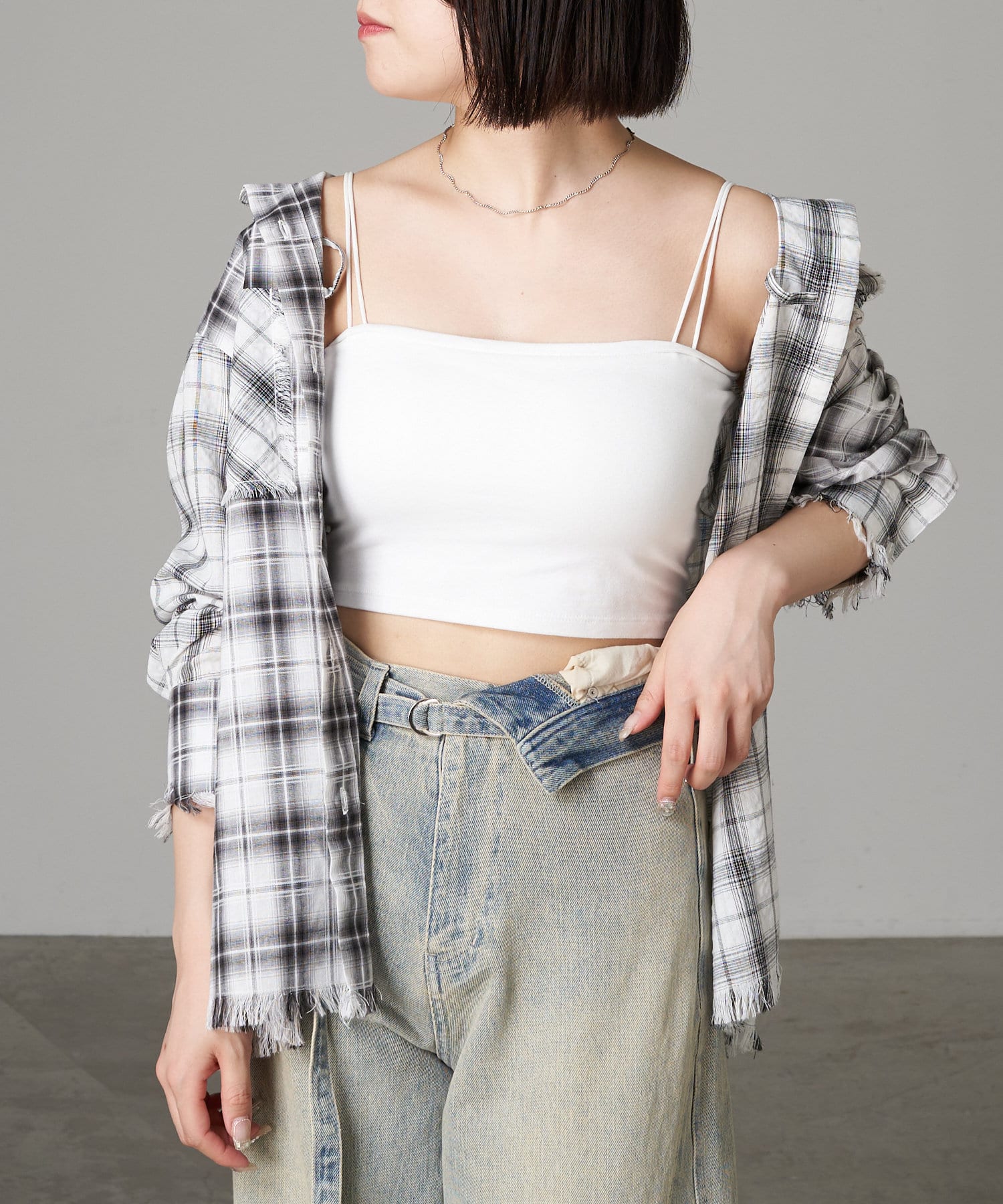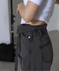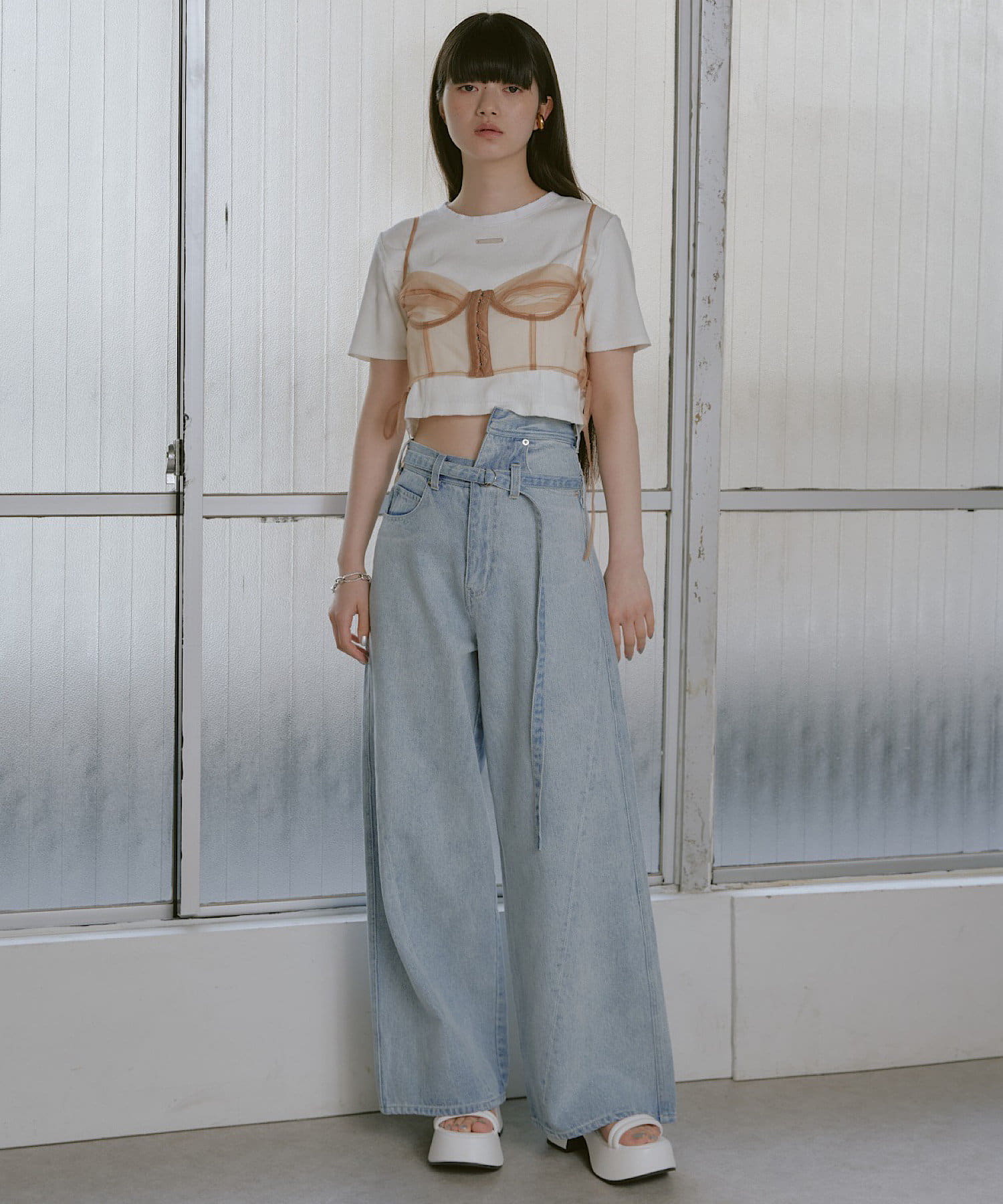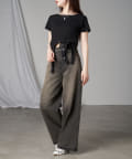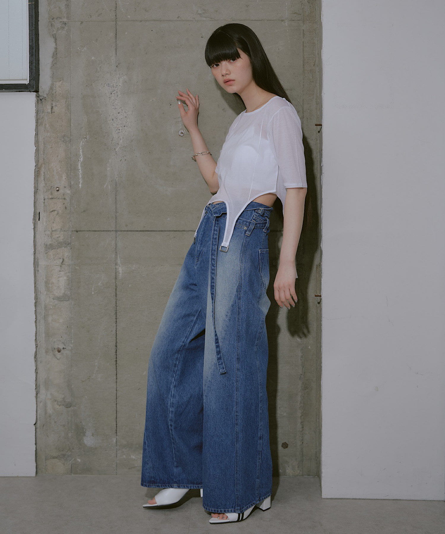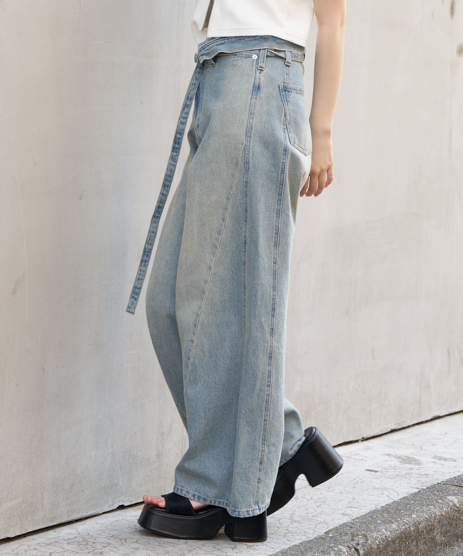ウエストのアシンメトリーデザインは折り返しても着用可能。