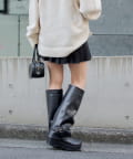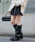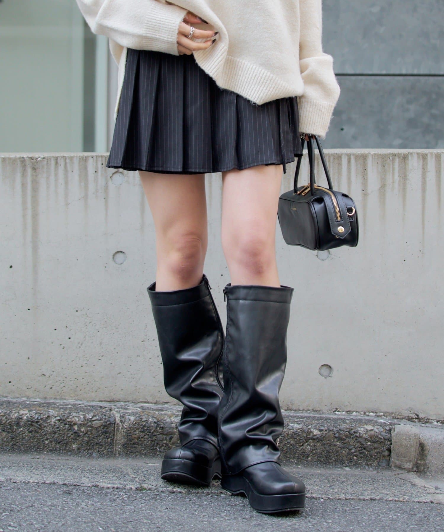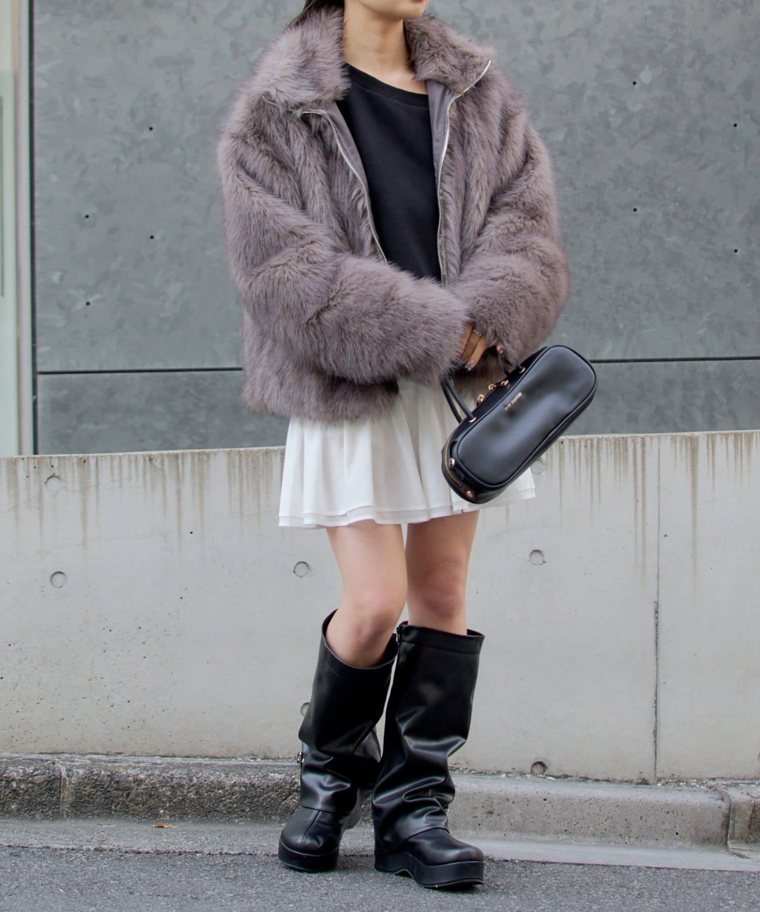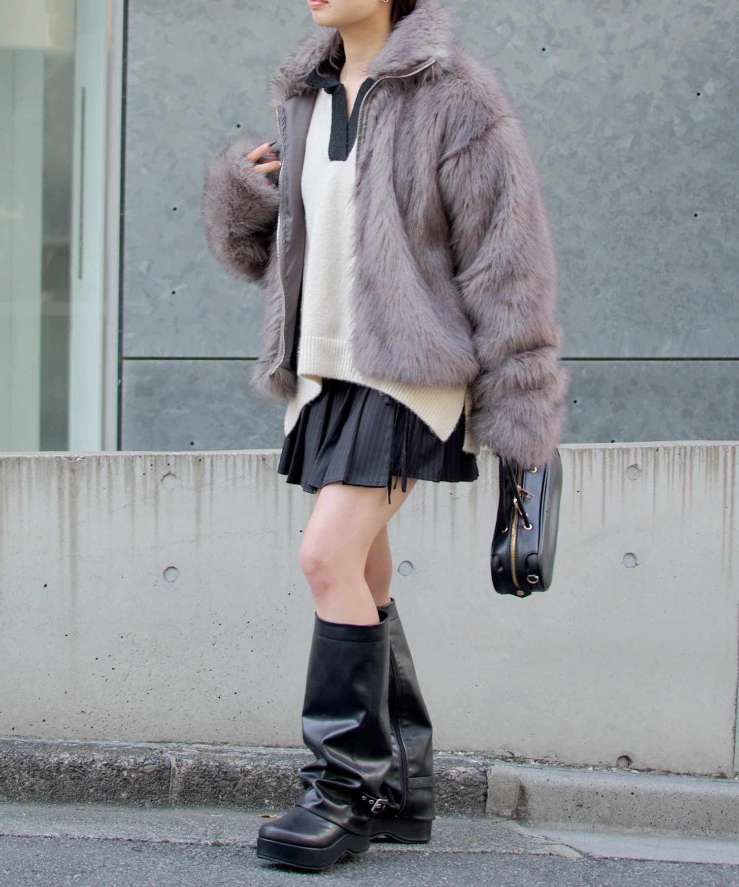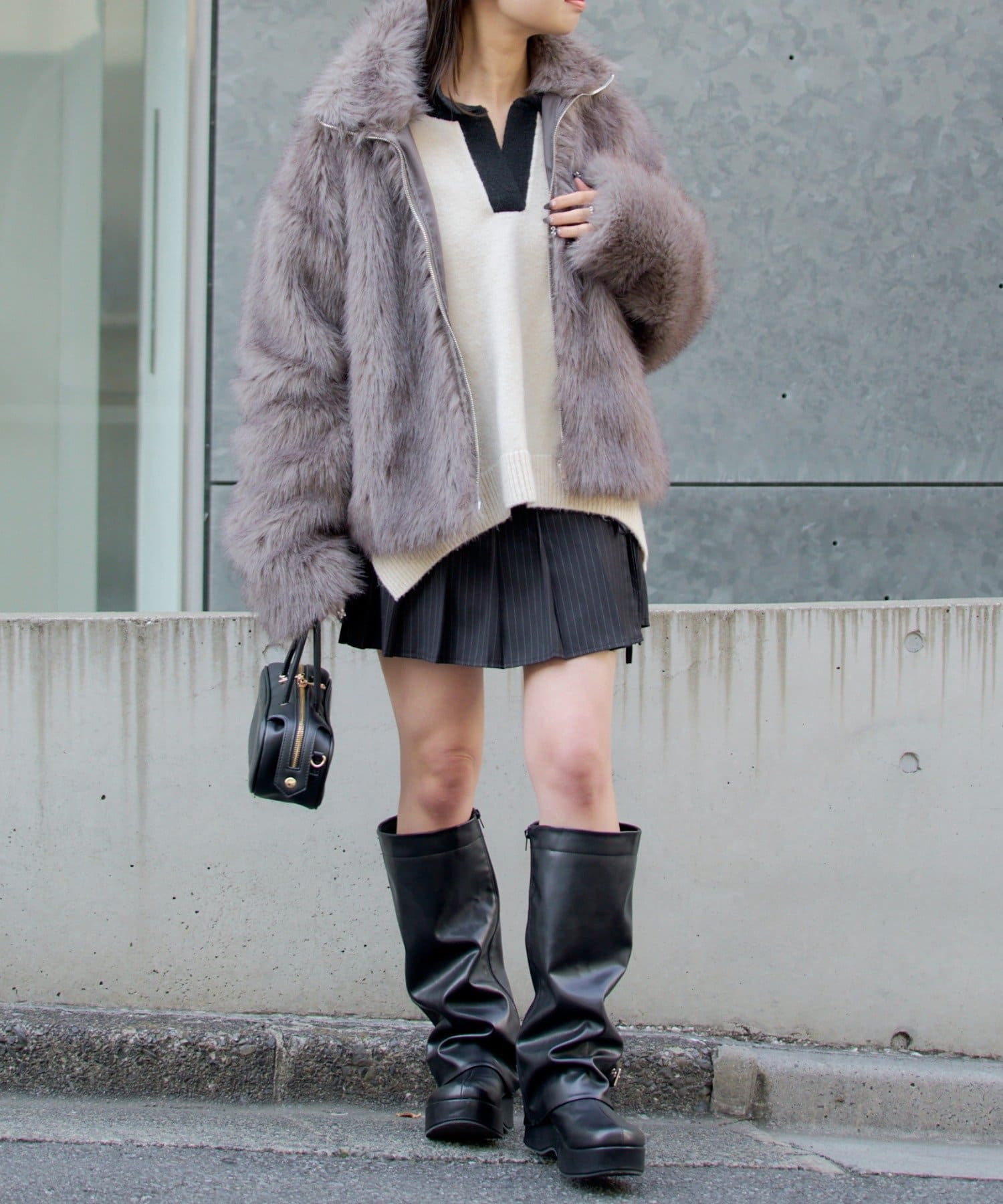 ロングブーツはミニ丈合わせでルーズ感を見せるのが○