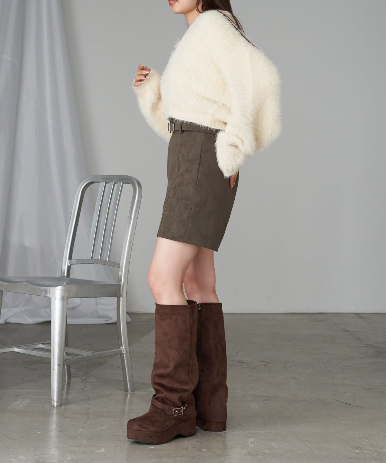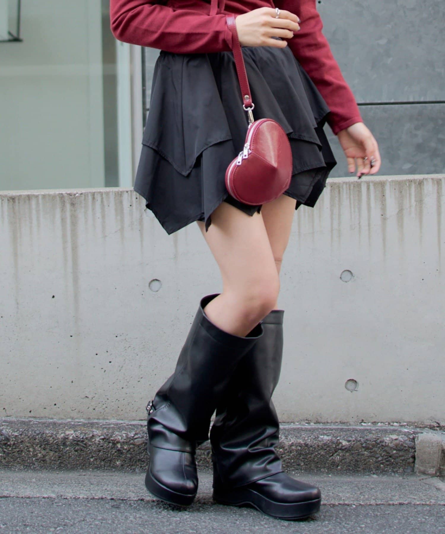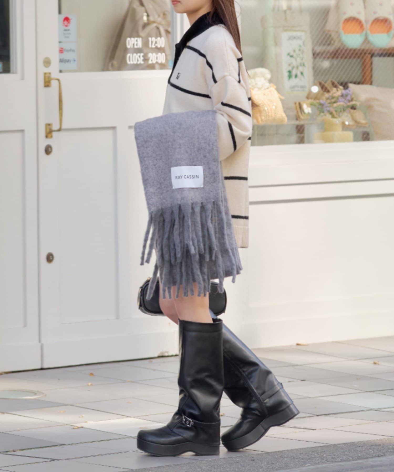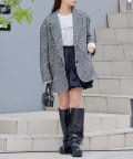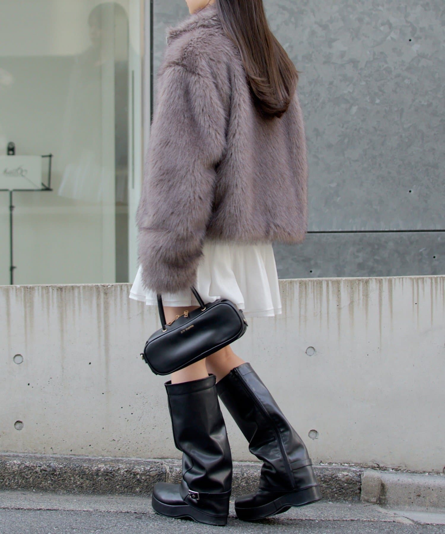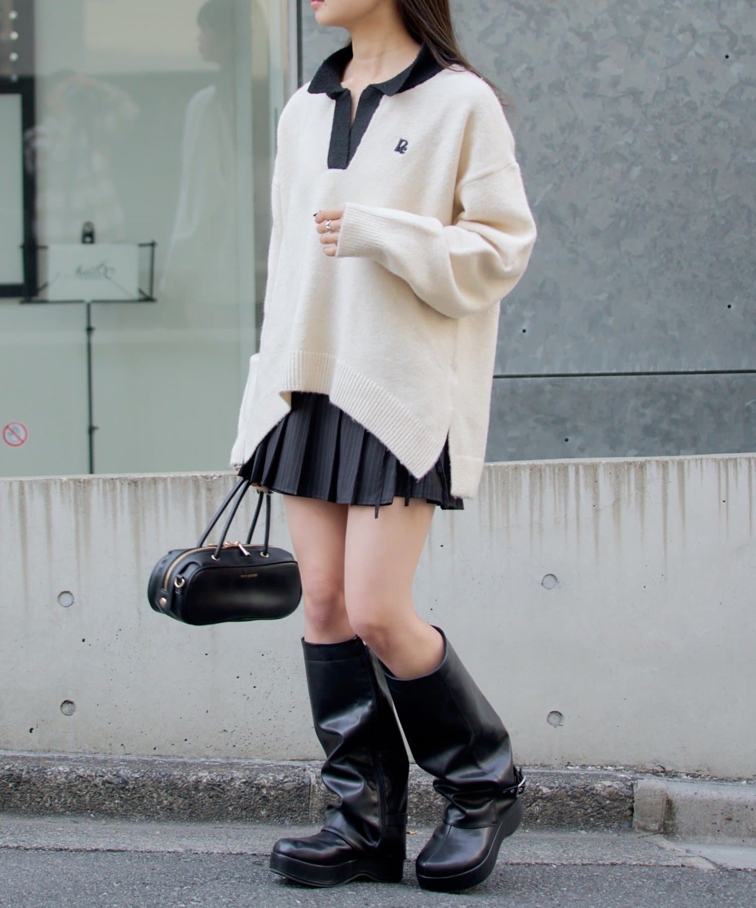 ロングブーツはミニ丈合わせでルーズ感を見せるのが○