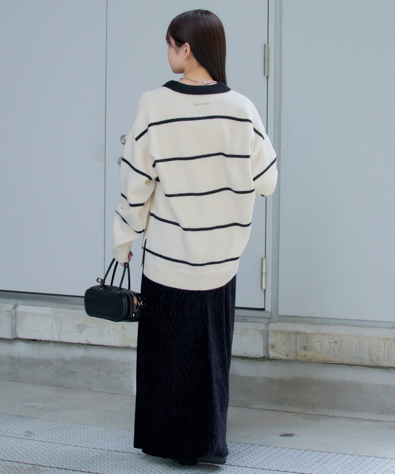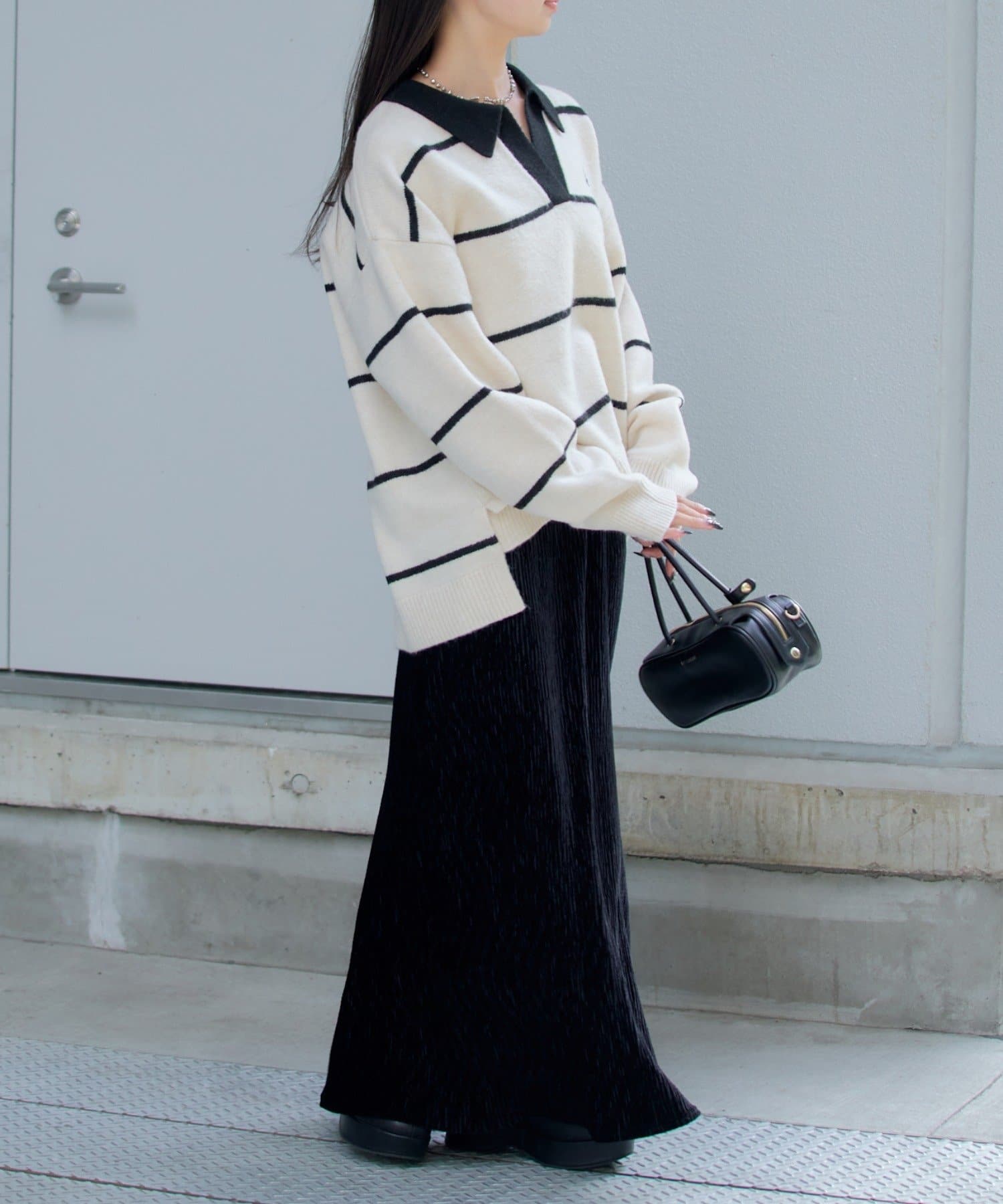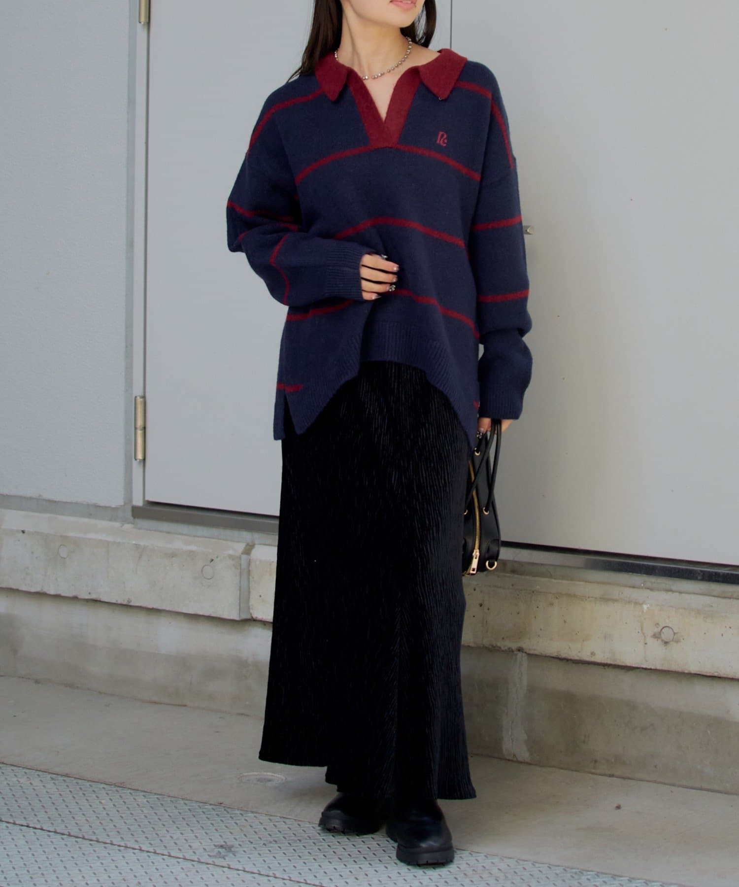 骨ストでも首元が開いていたり、ポロニットの形なので肩幅を膨張することなく着れて上半身をすっきり見せてくれます!
