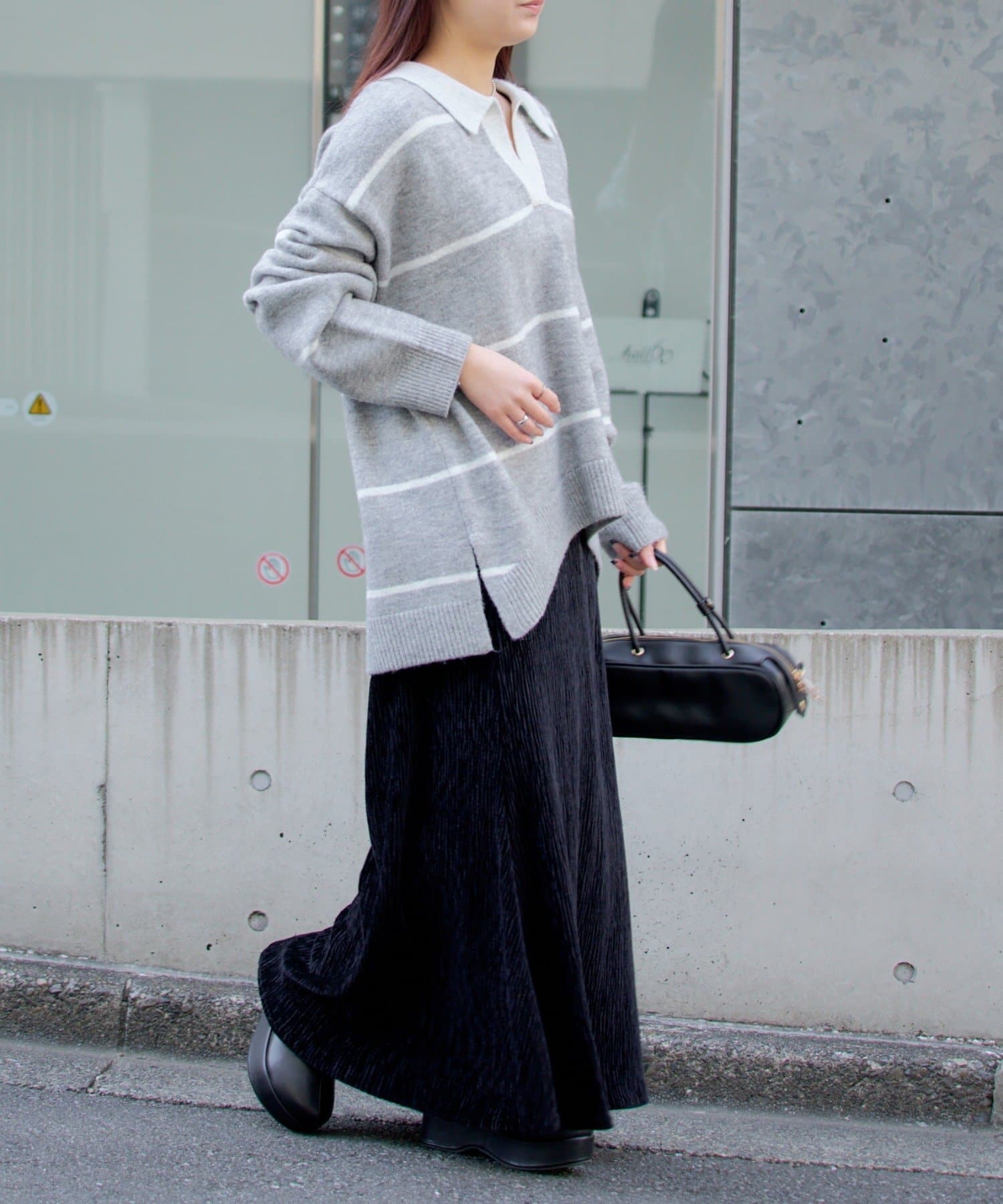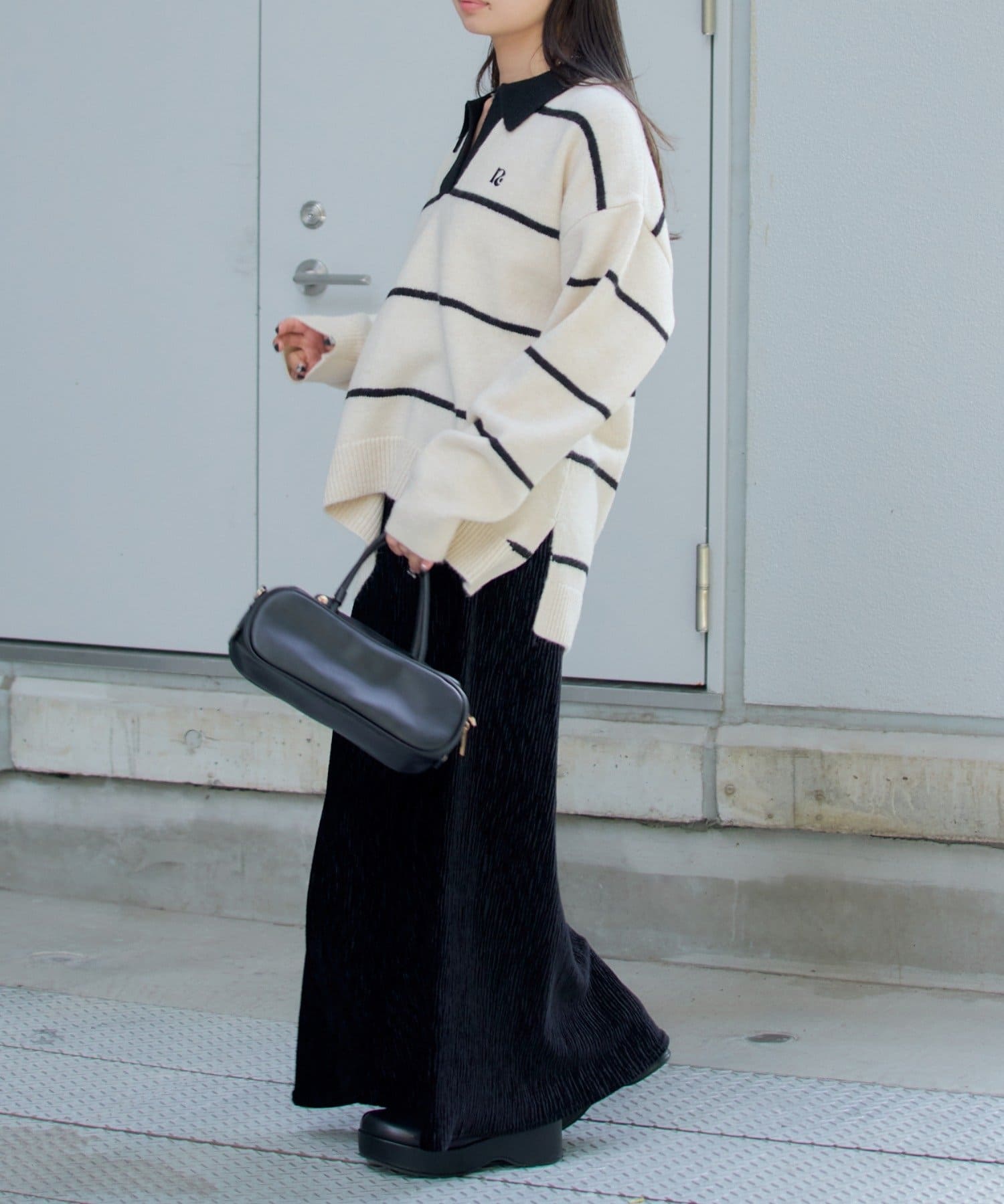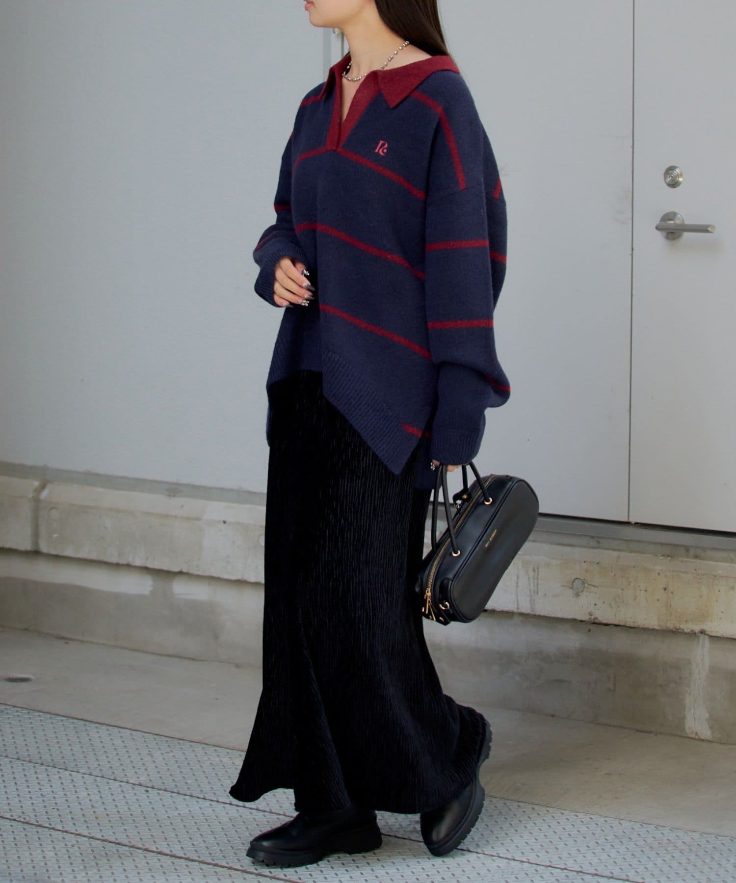 骨ストでも首元が開いていたり、ポロニットの形なので肩幅を膨張することなく着れて上半身をすっきり見せてくれます!