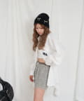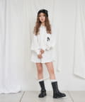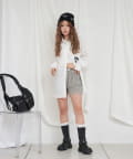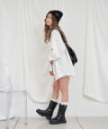 ・ミニボトムスにロングブーツ合わせで女性らしい大人スタイルに。