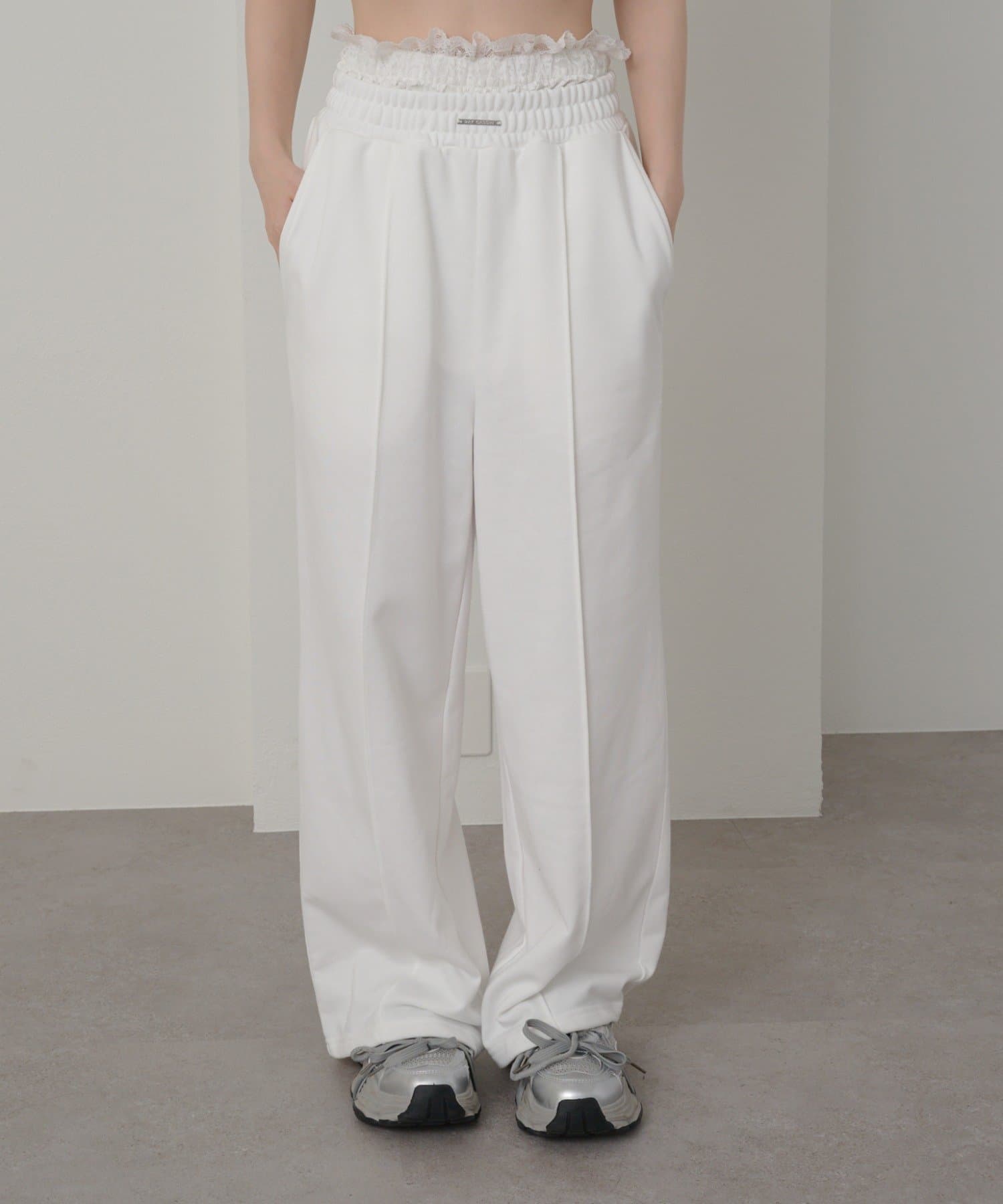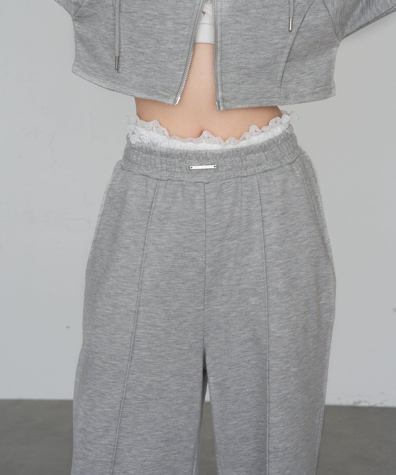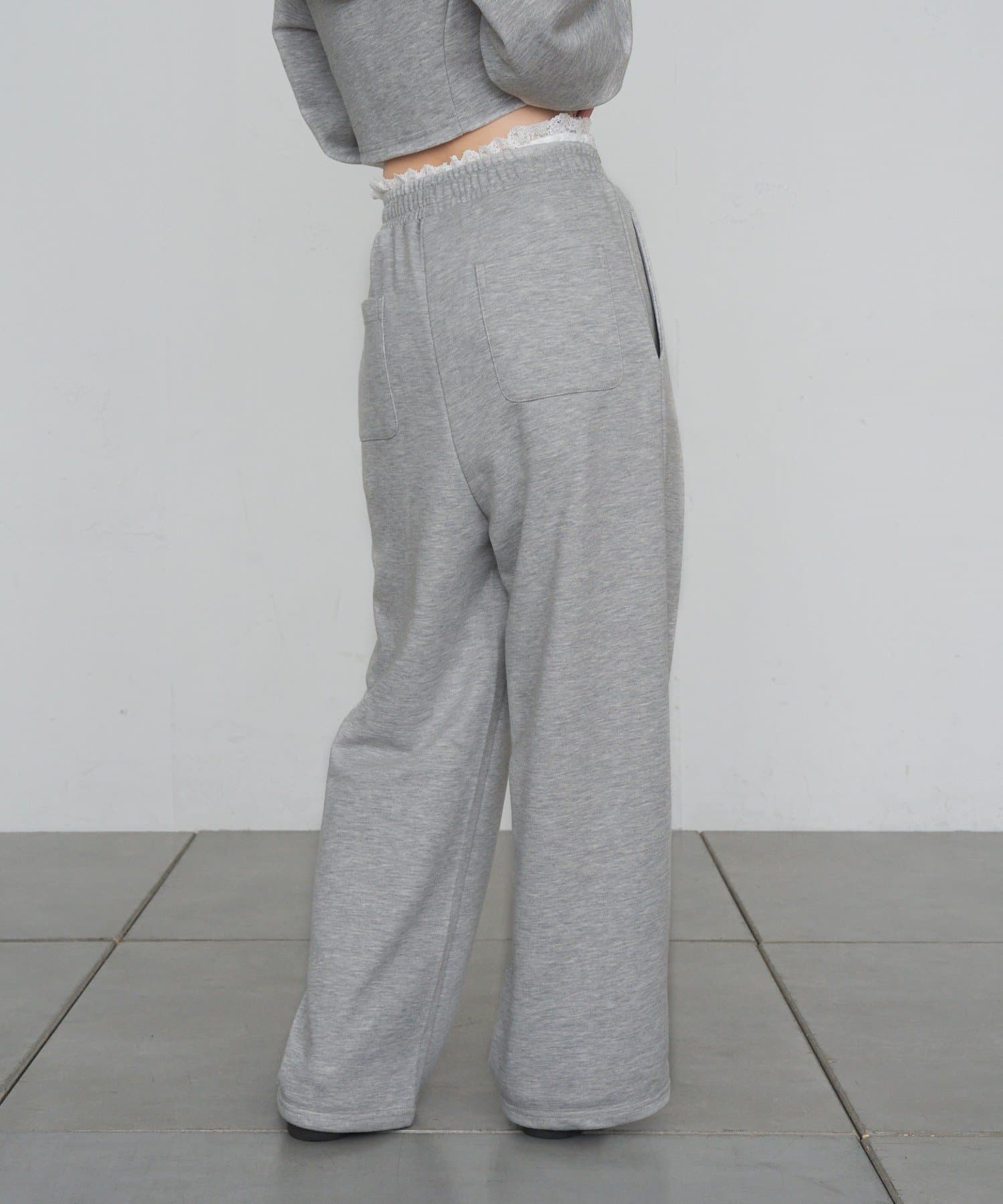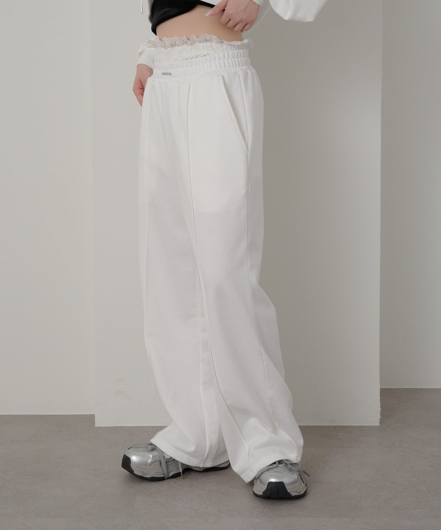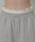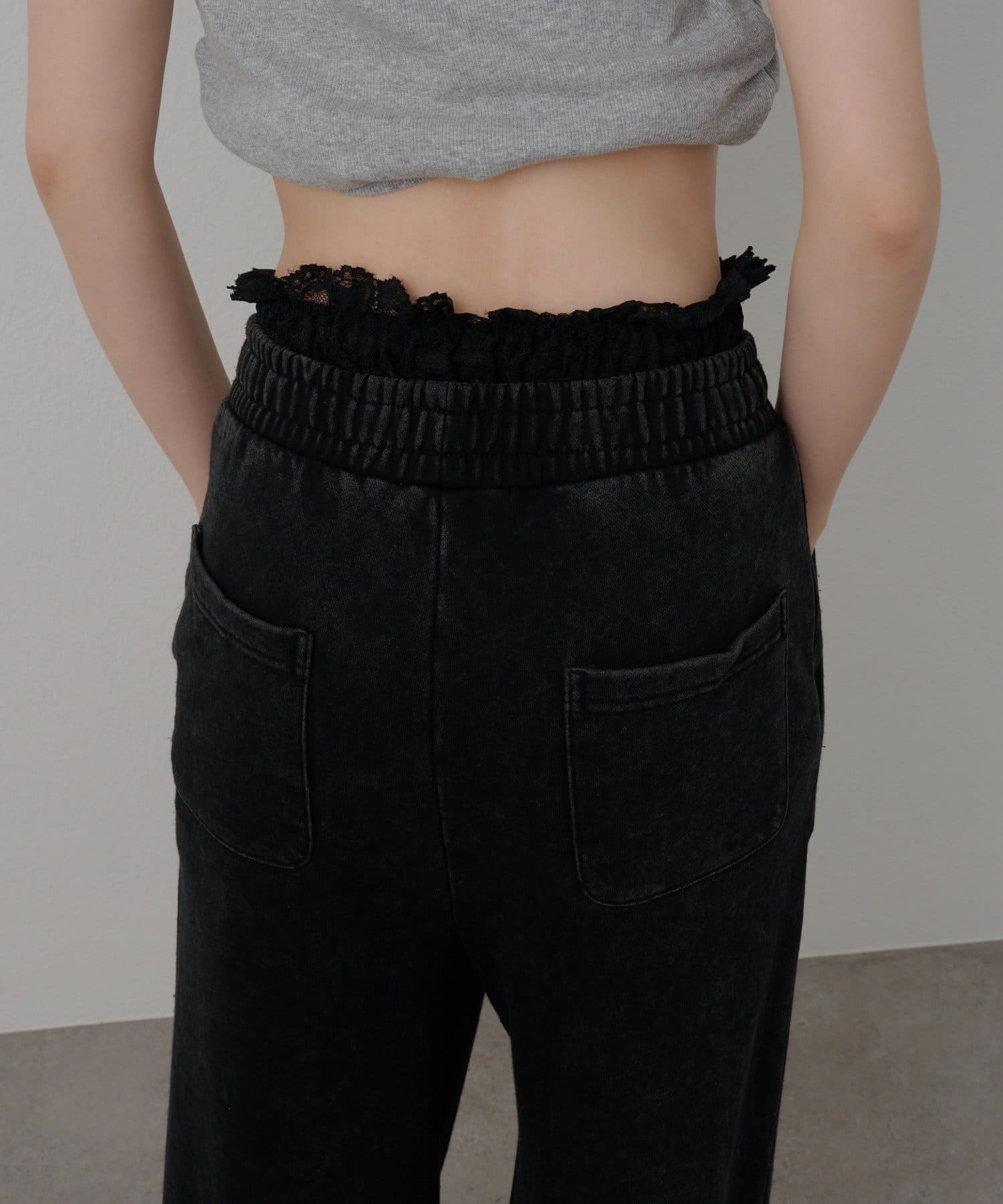 ・ウエストのレースがポイントのレイヤードスウェットパンツ。