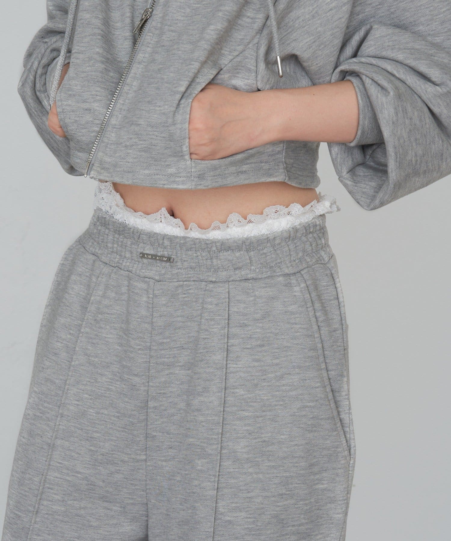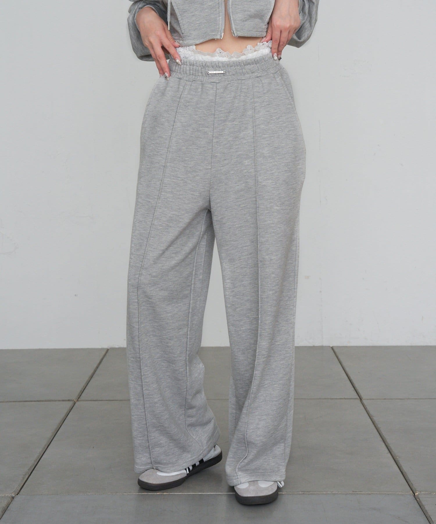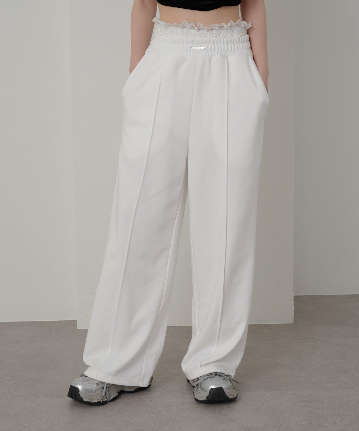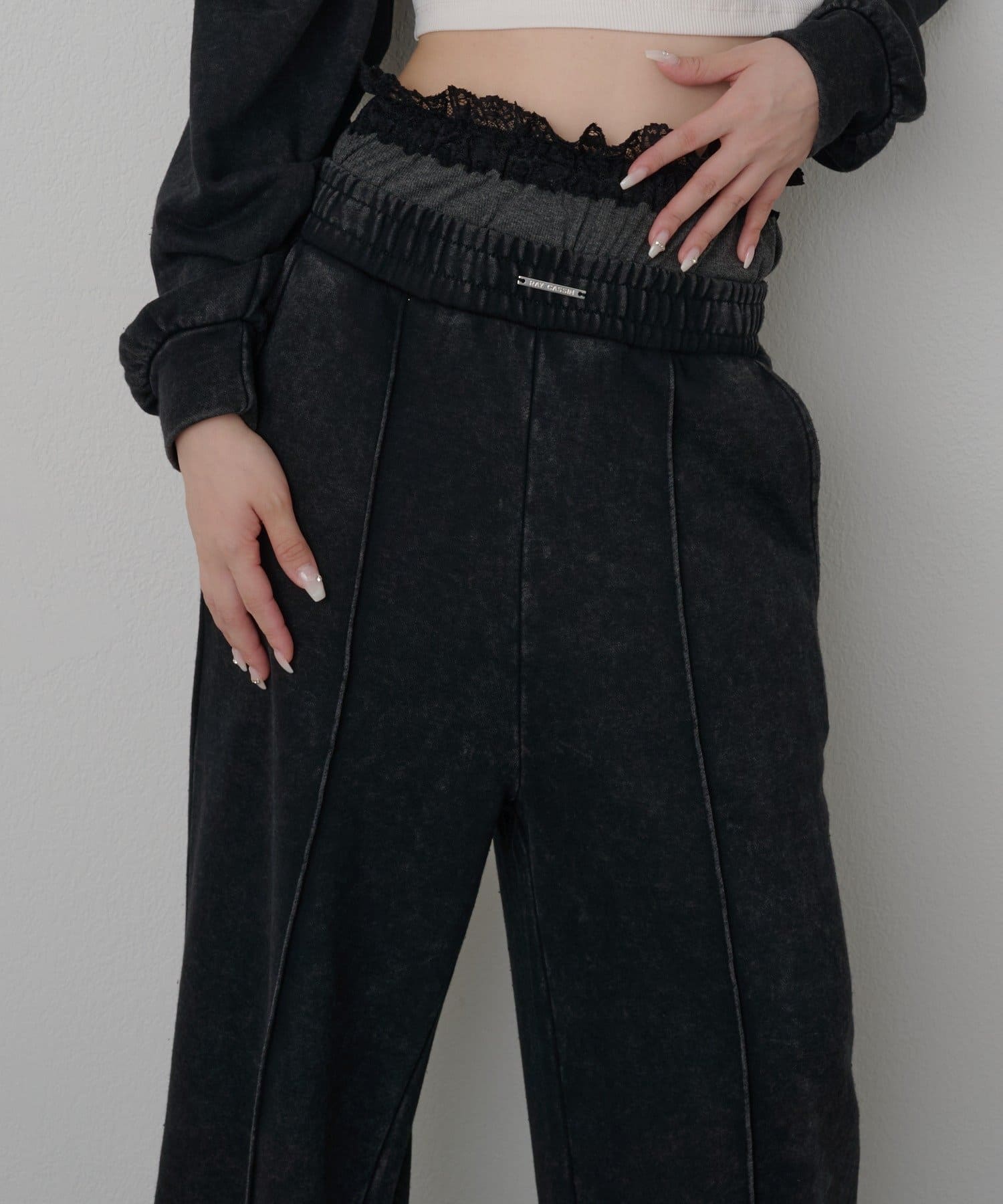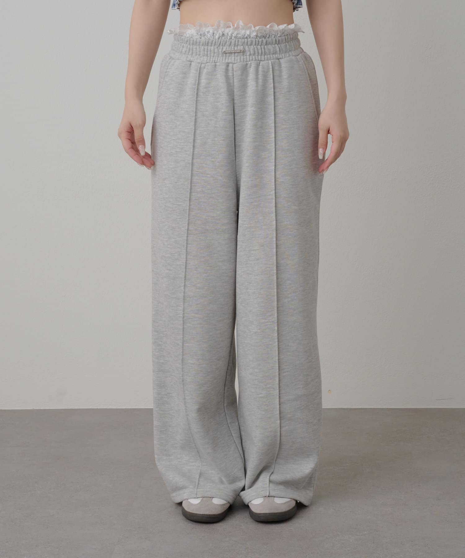 ・ウエストのレースがポイントのレイヤードスウェットパンツ。