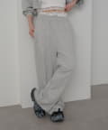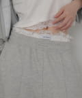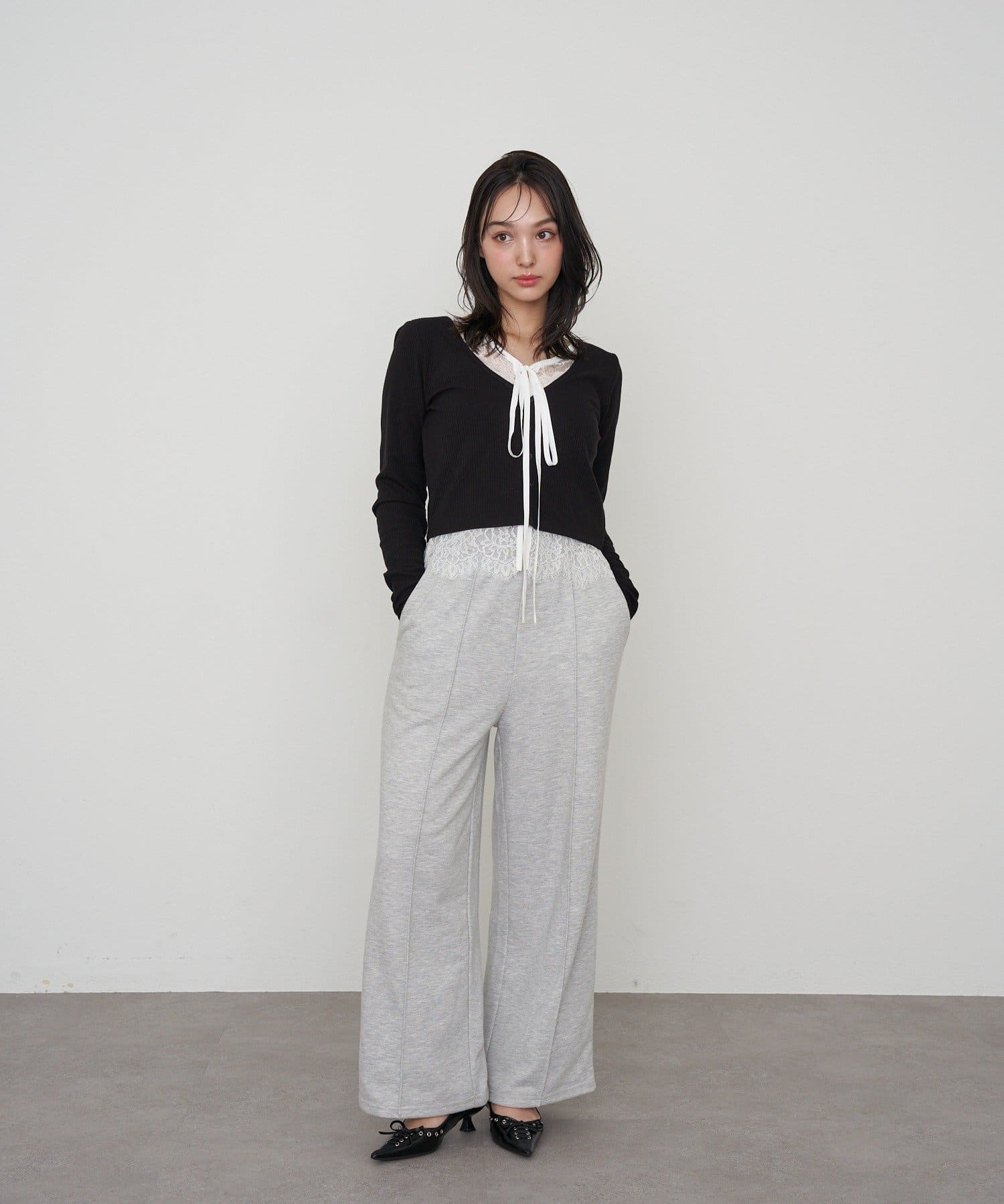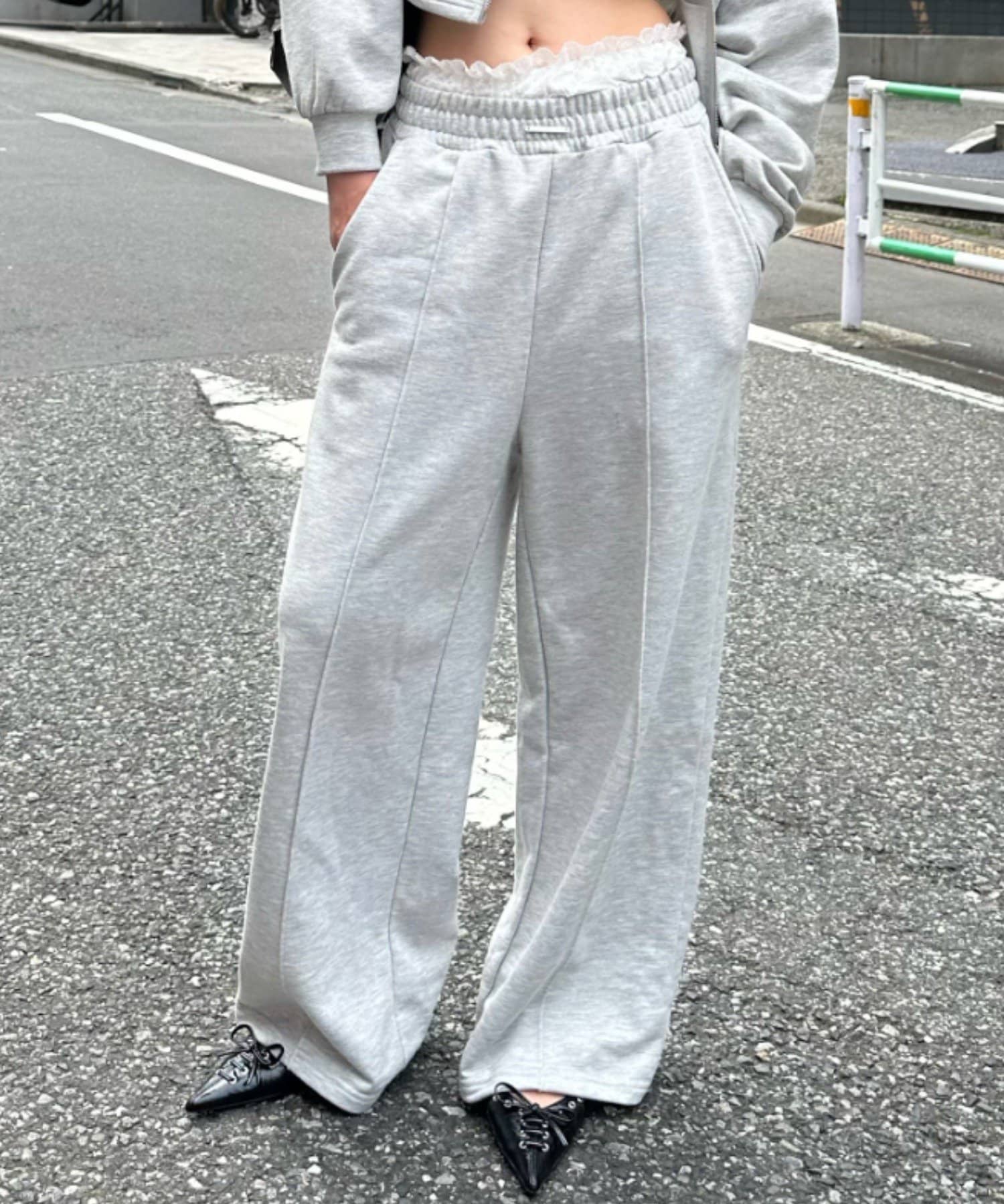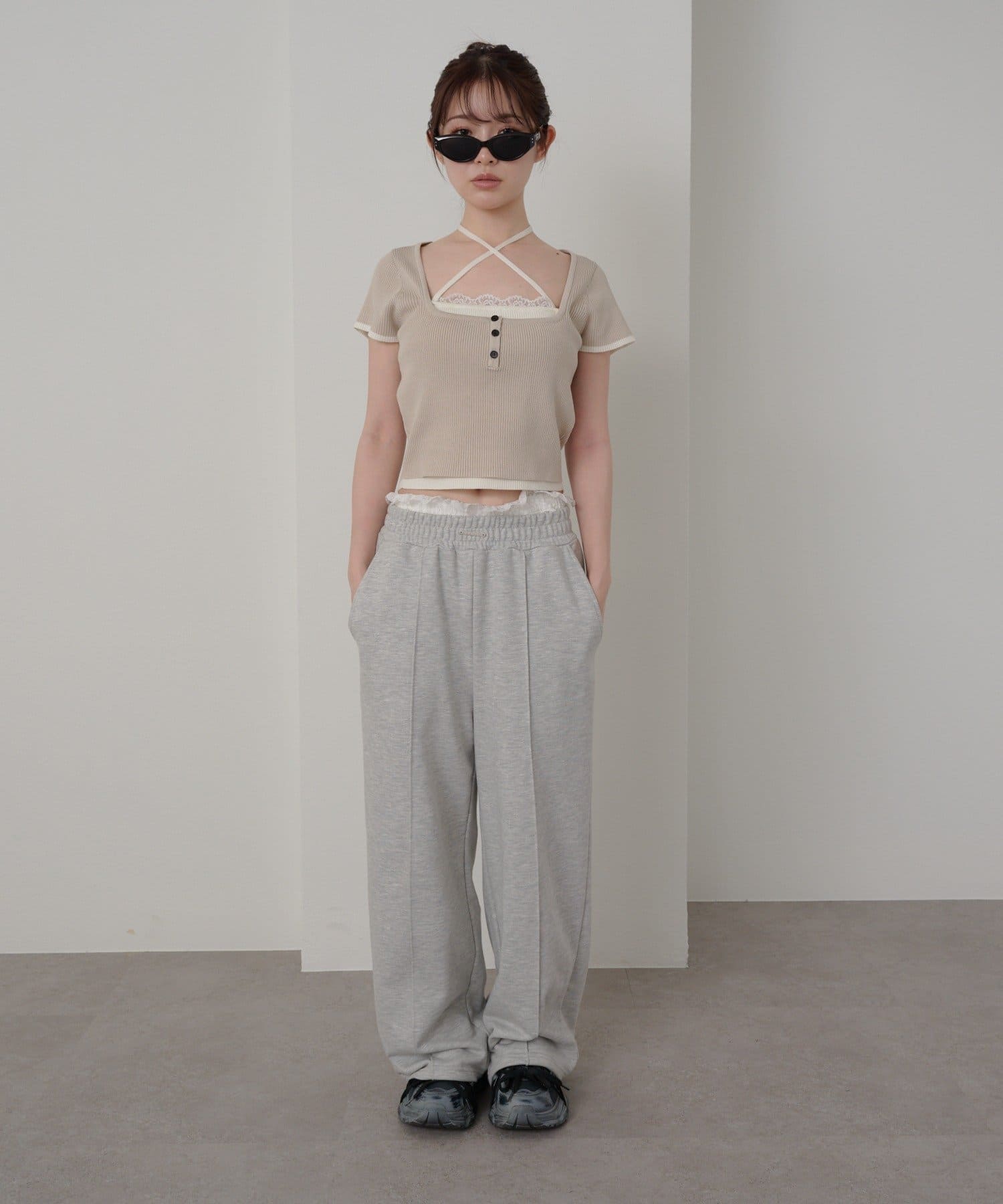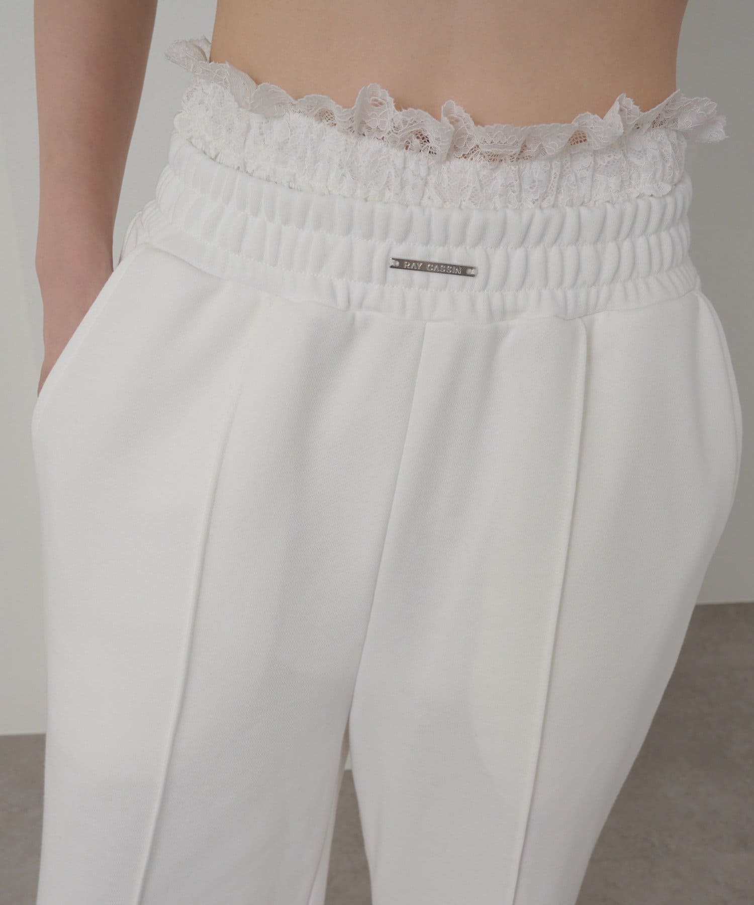 ・ウエストのレースがポイントのレイヤードスウェットパンツ。
