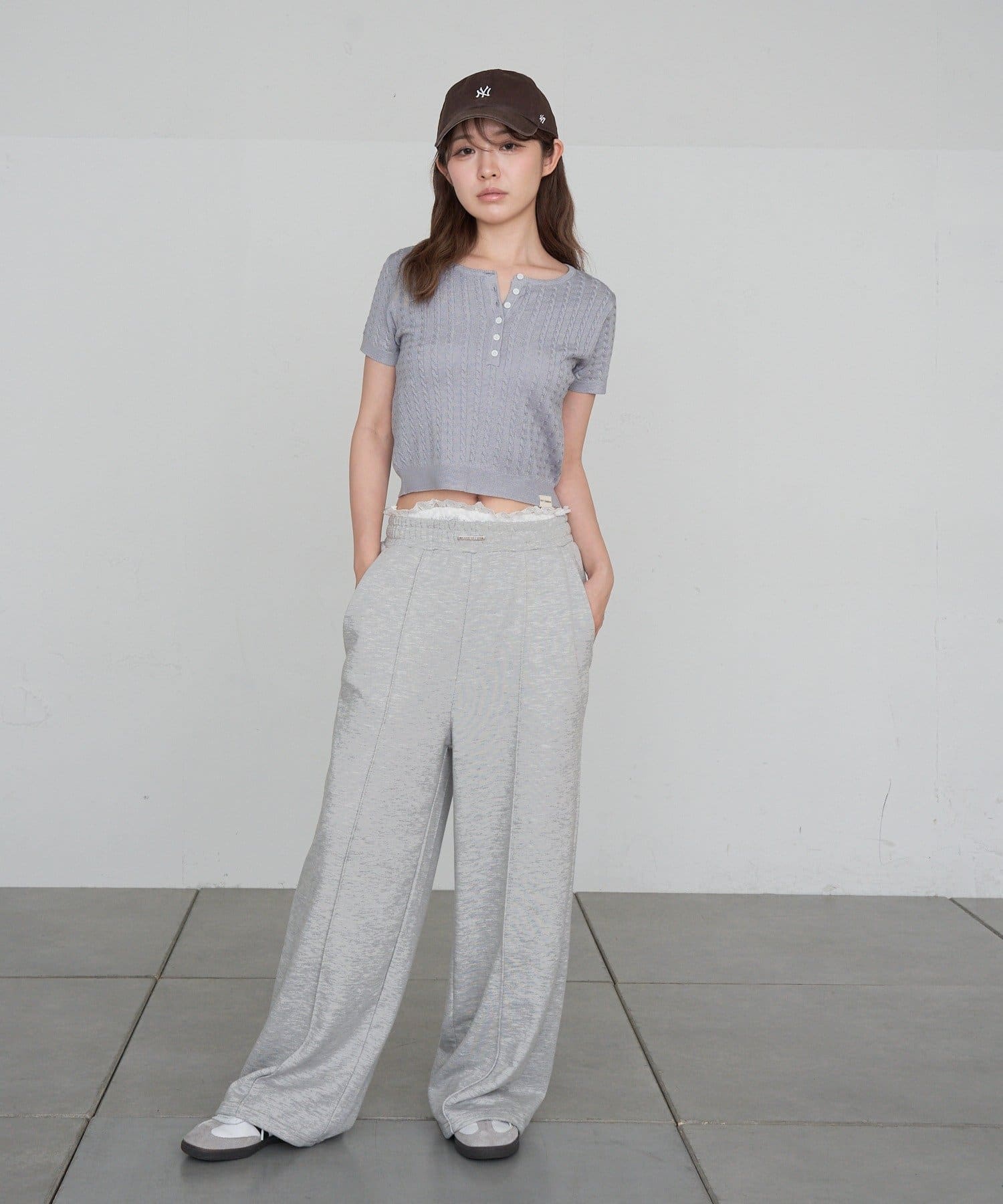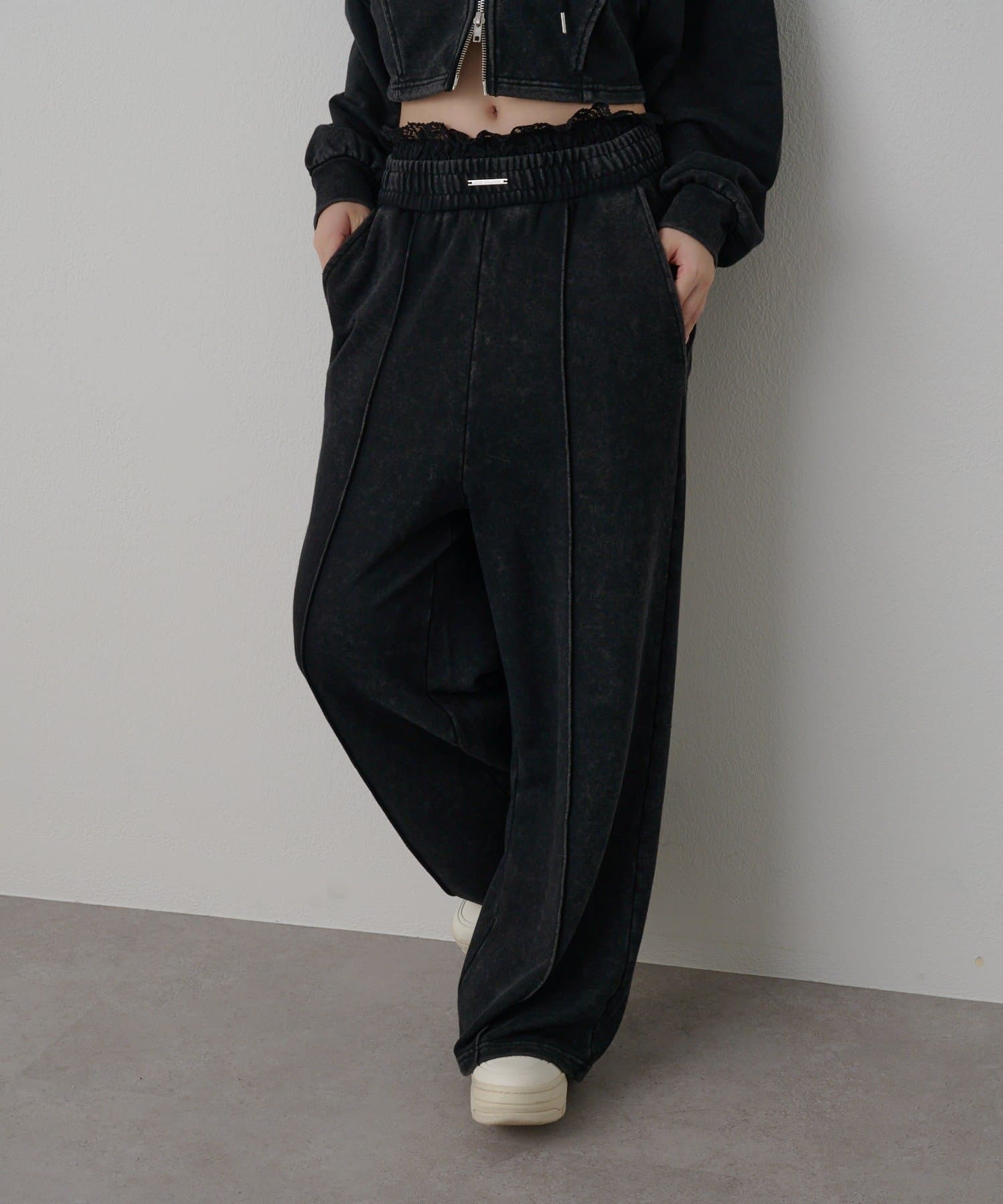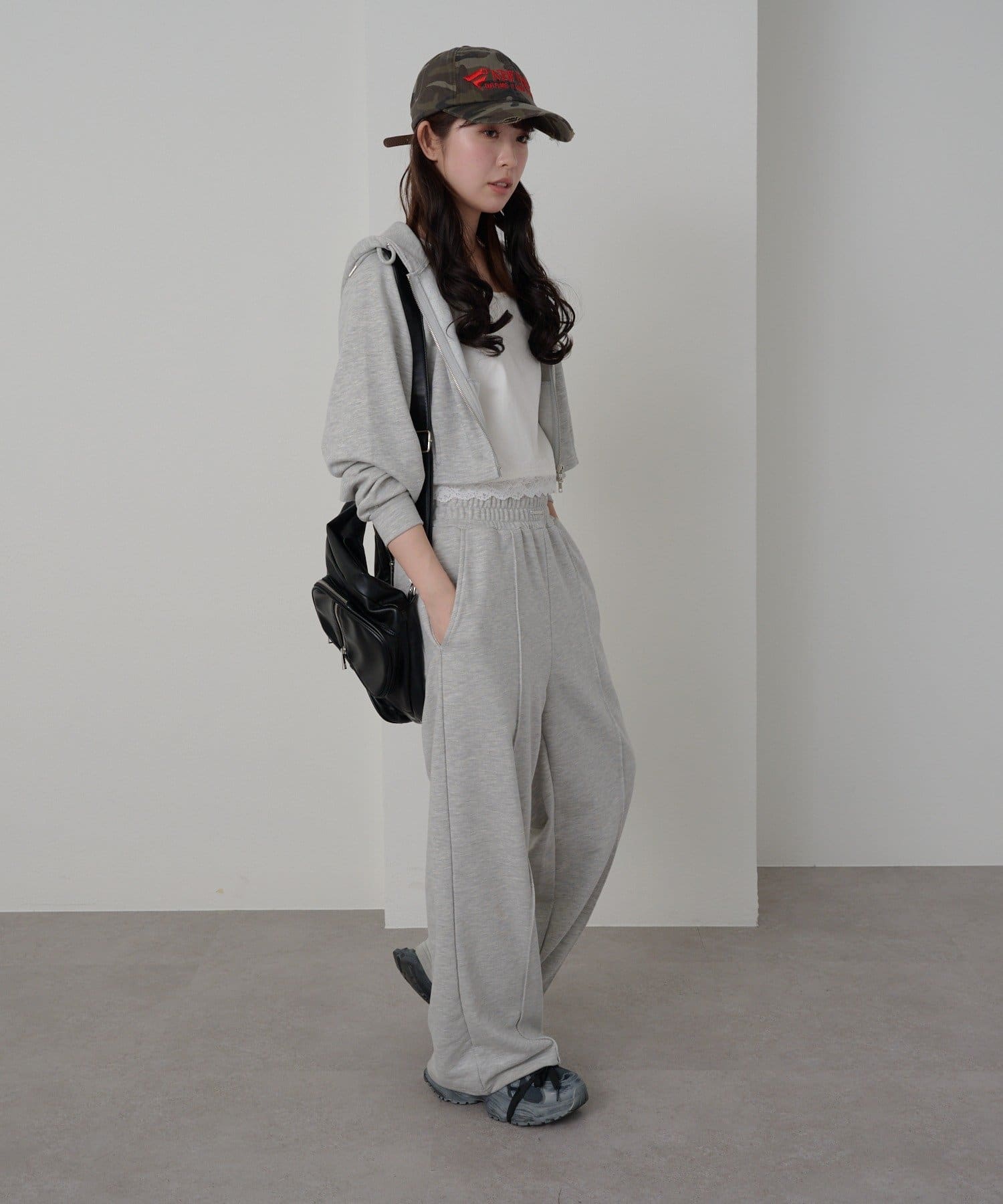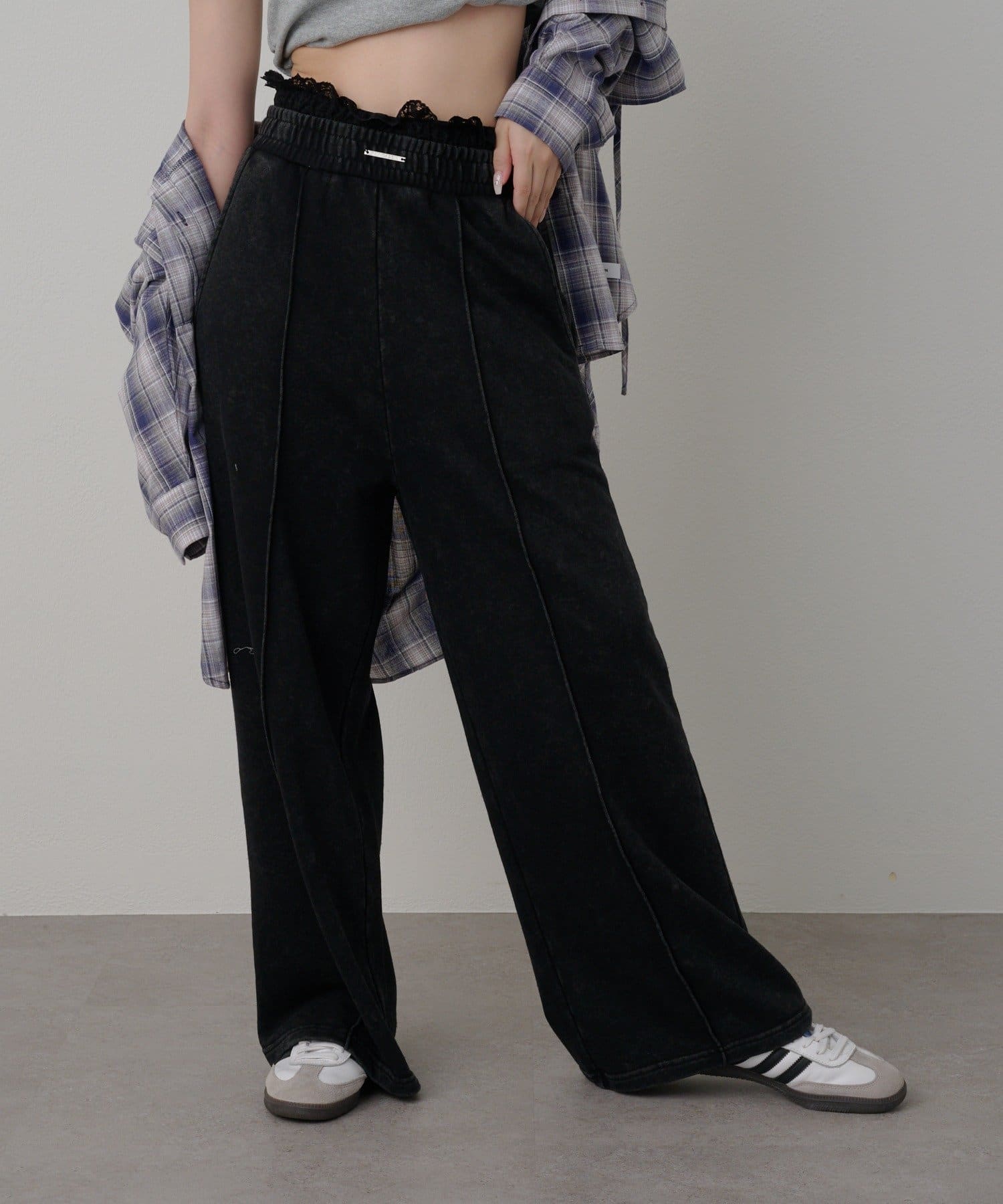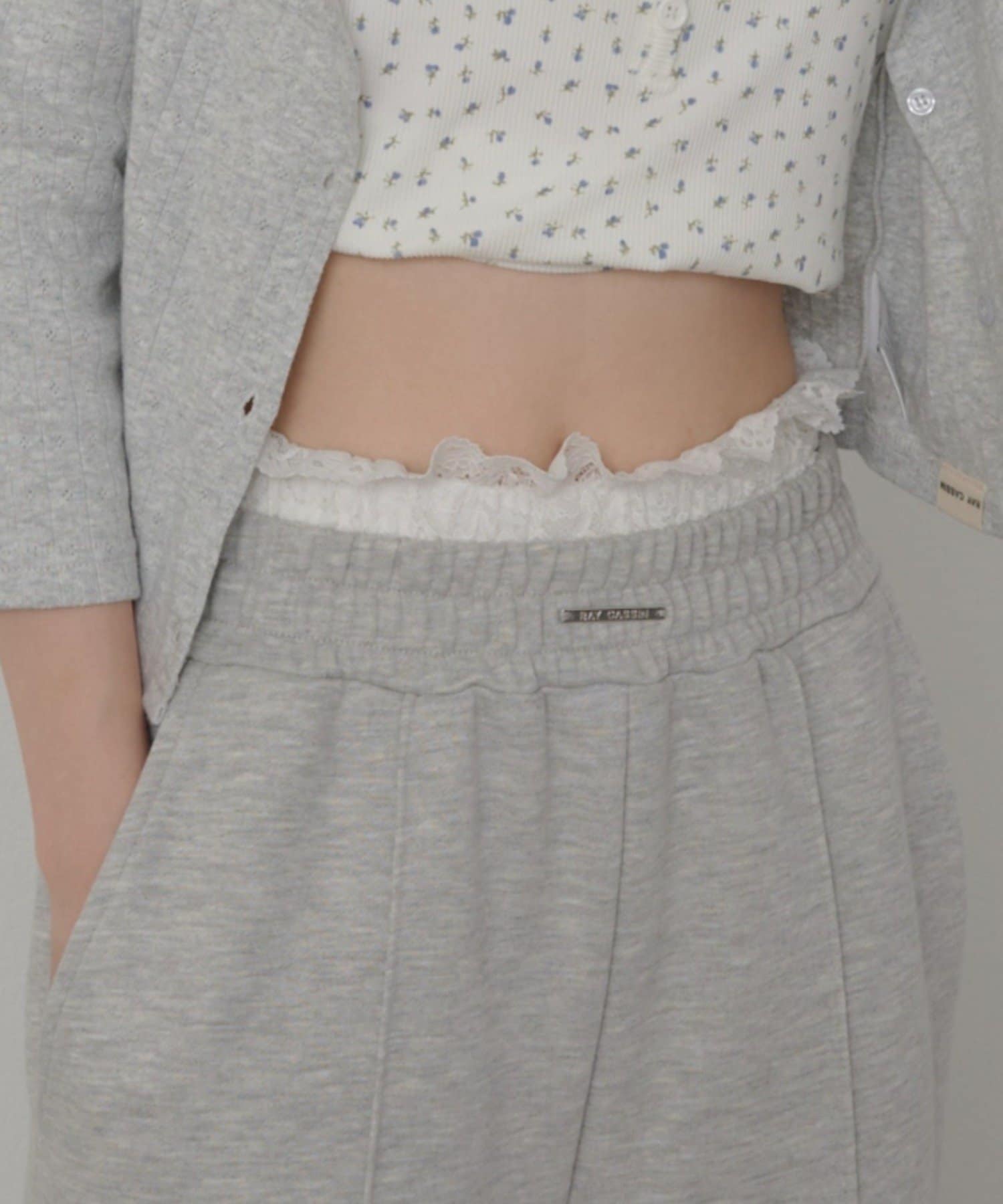 ・ウエストのレースがポイントのレイヤードスウェットパンツ。