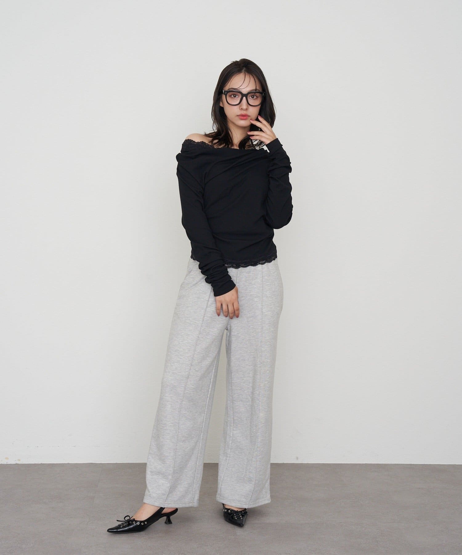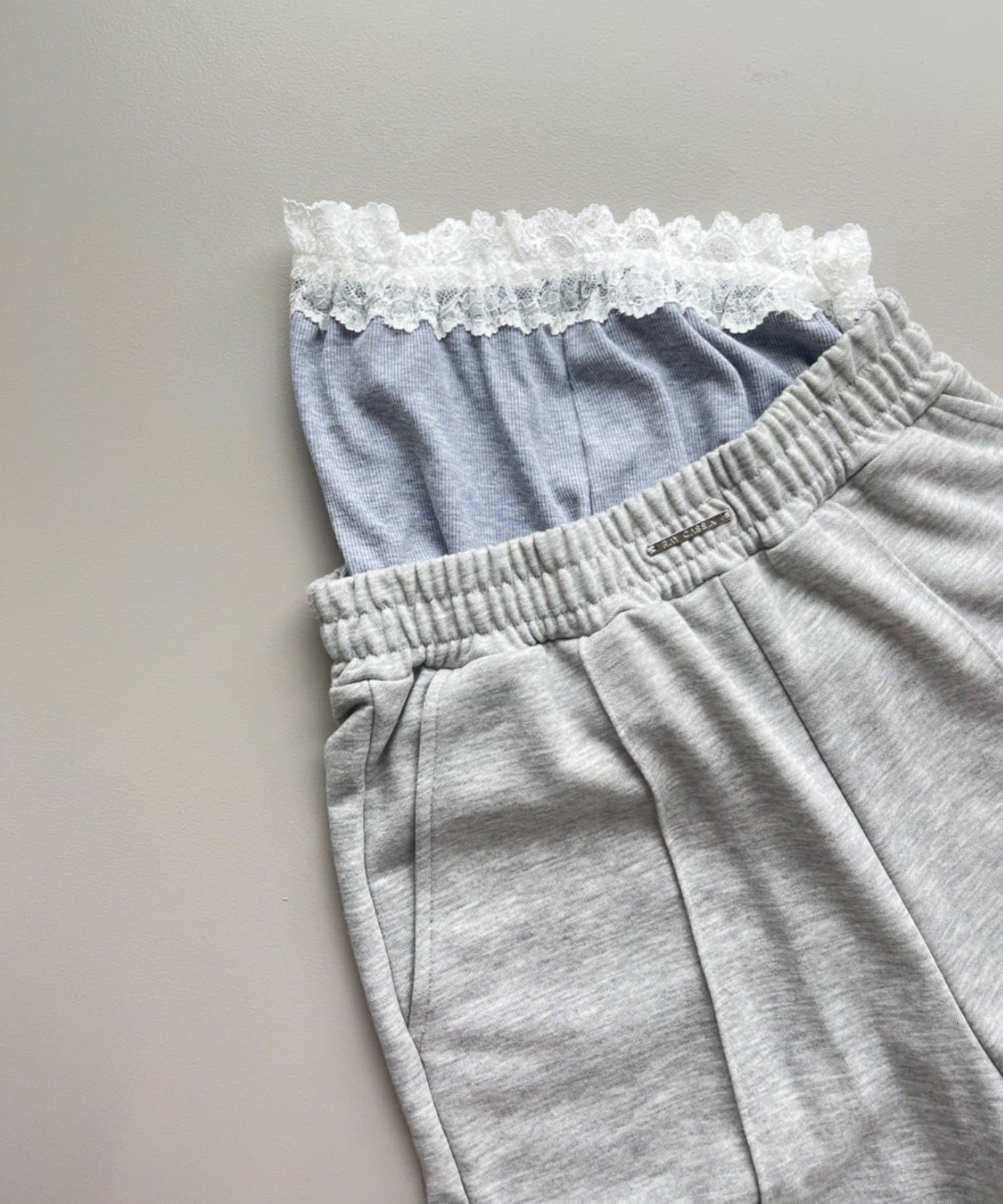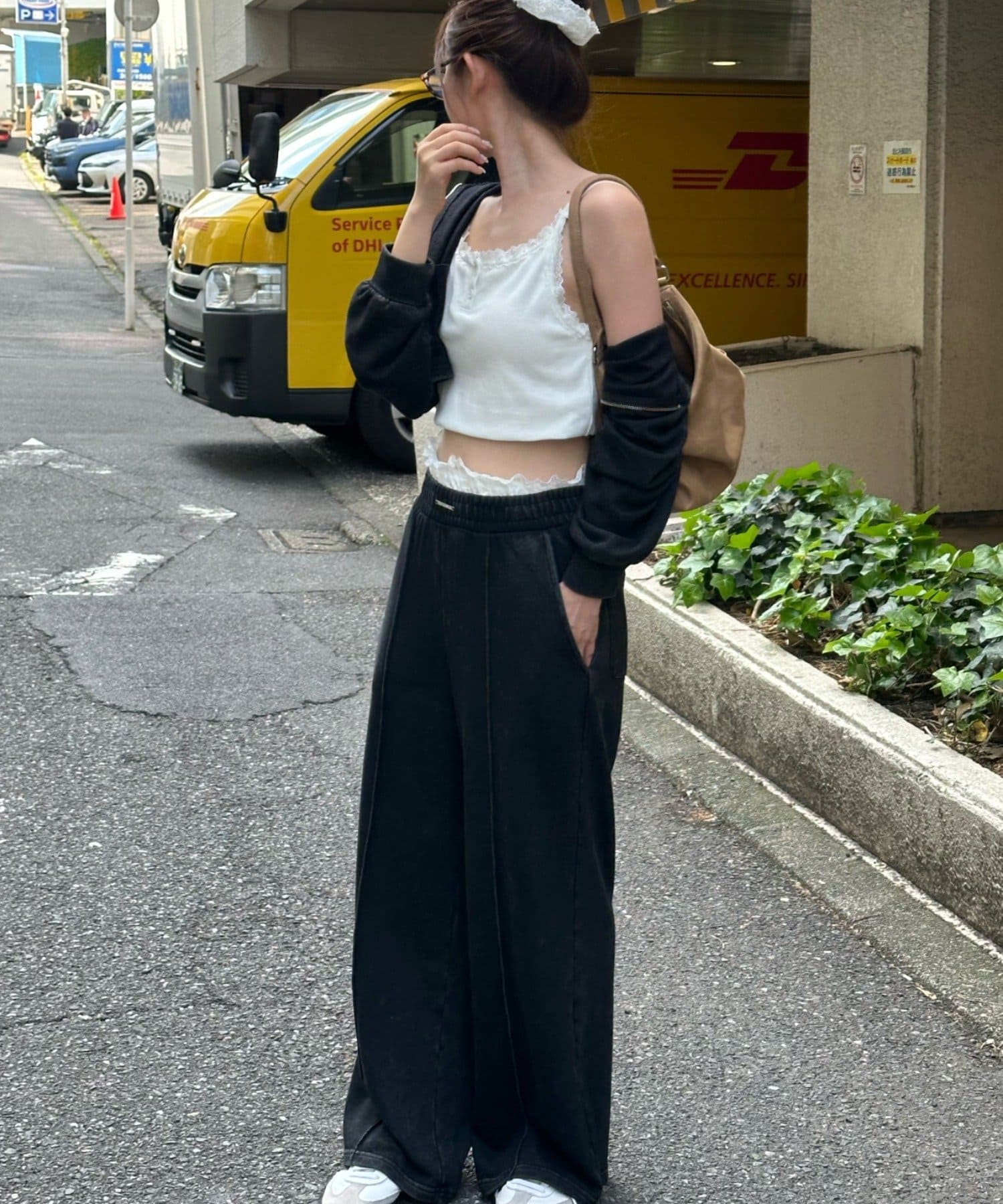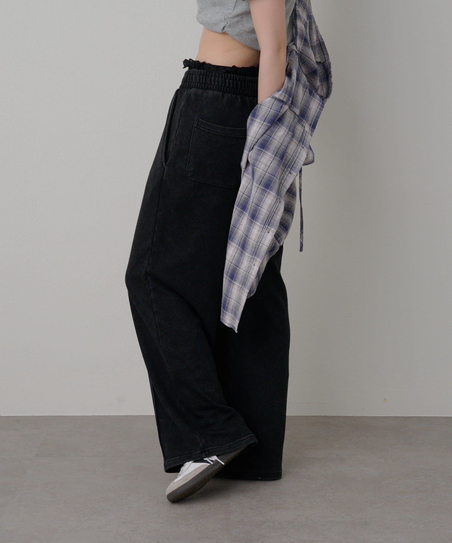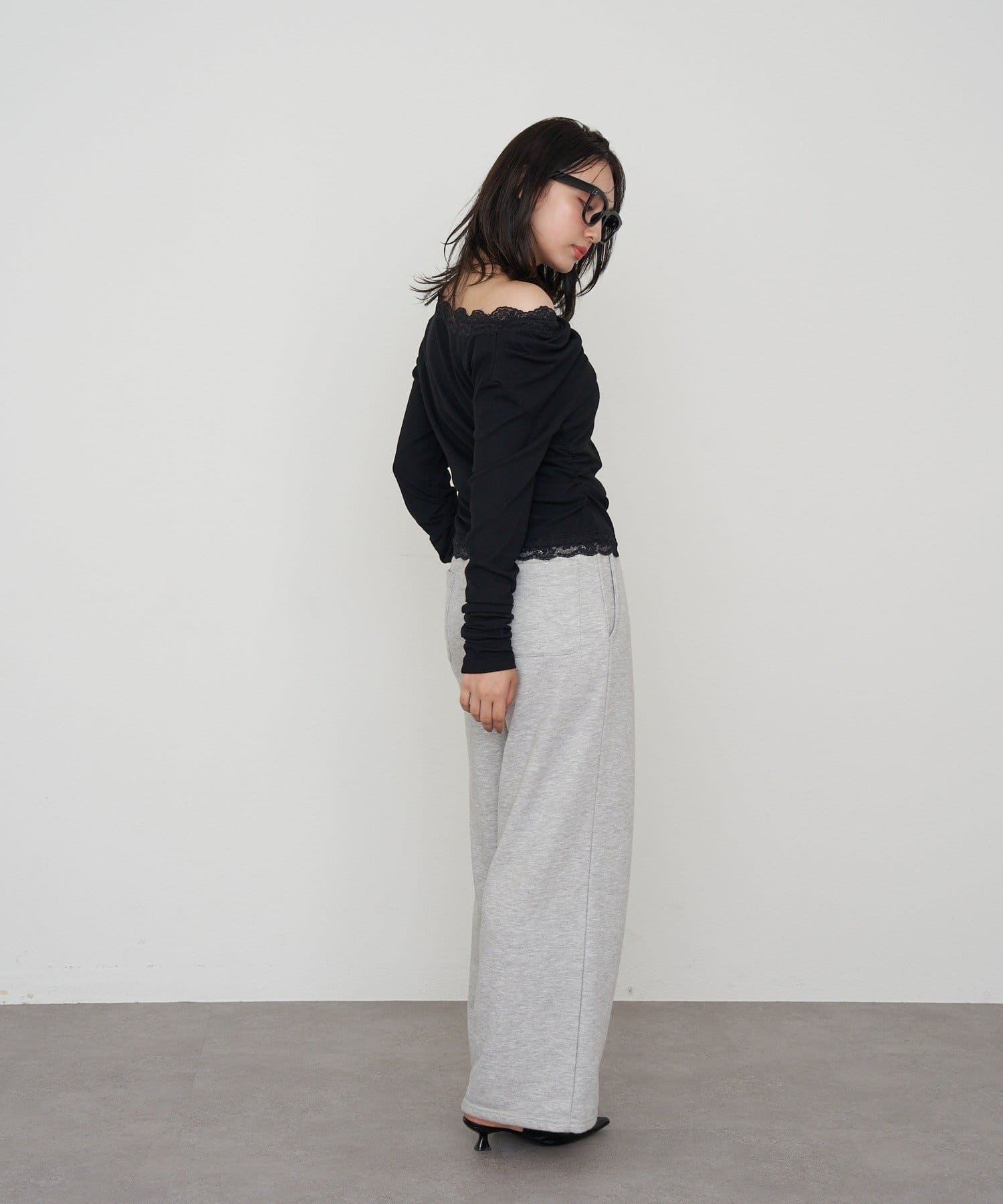 ・ウエストのレースがポイントのレイヤードスウェットパンツ。
