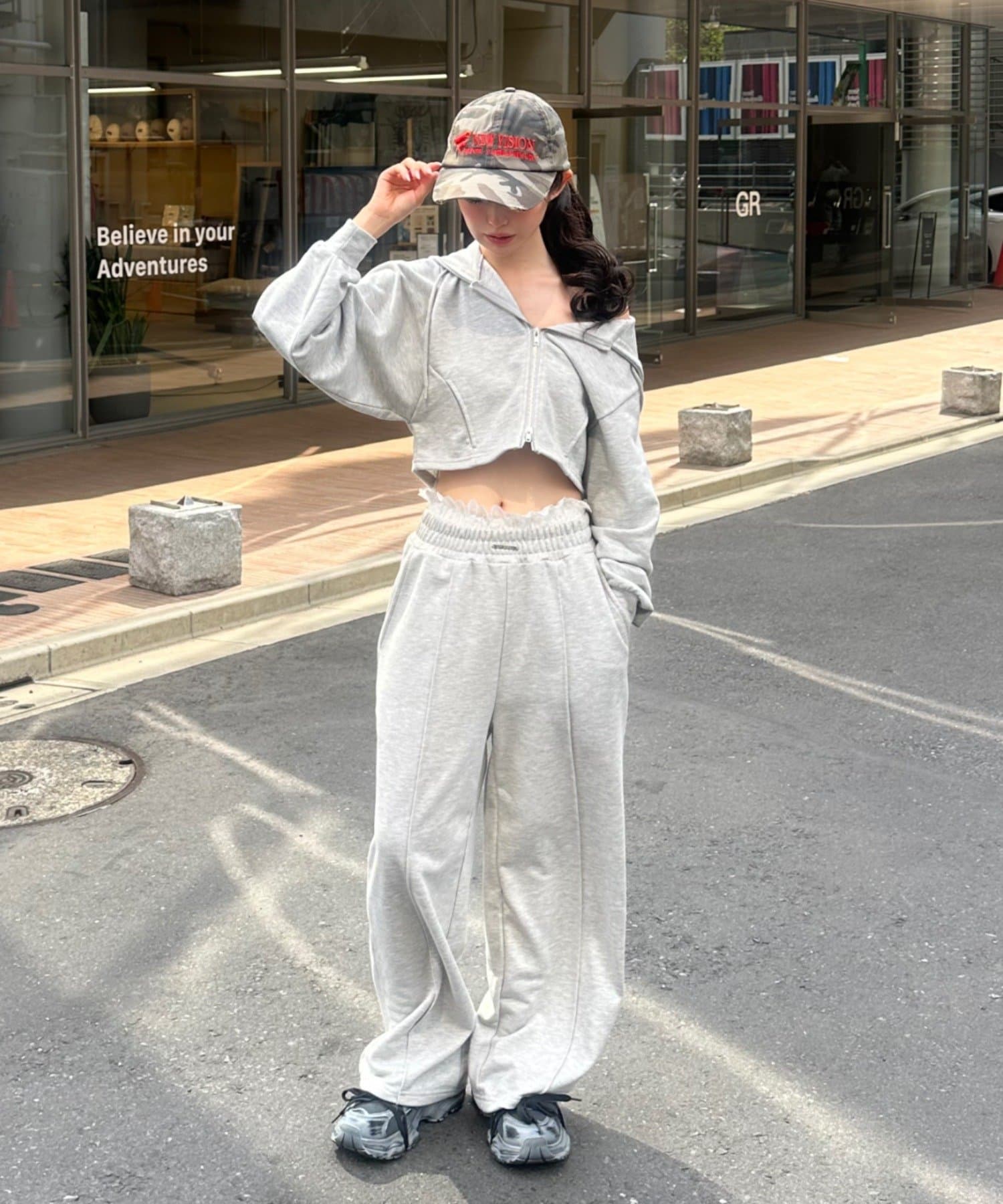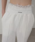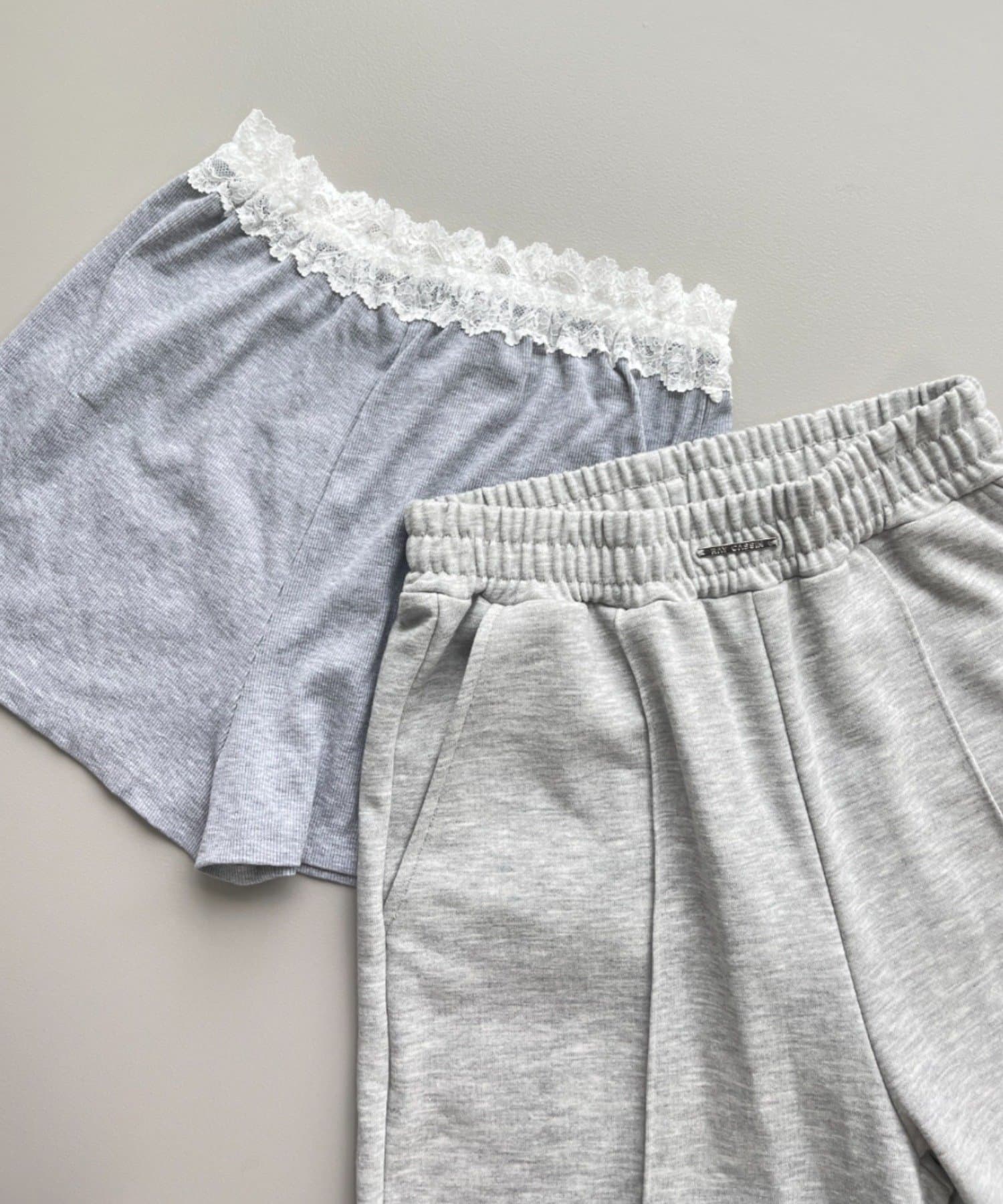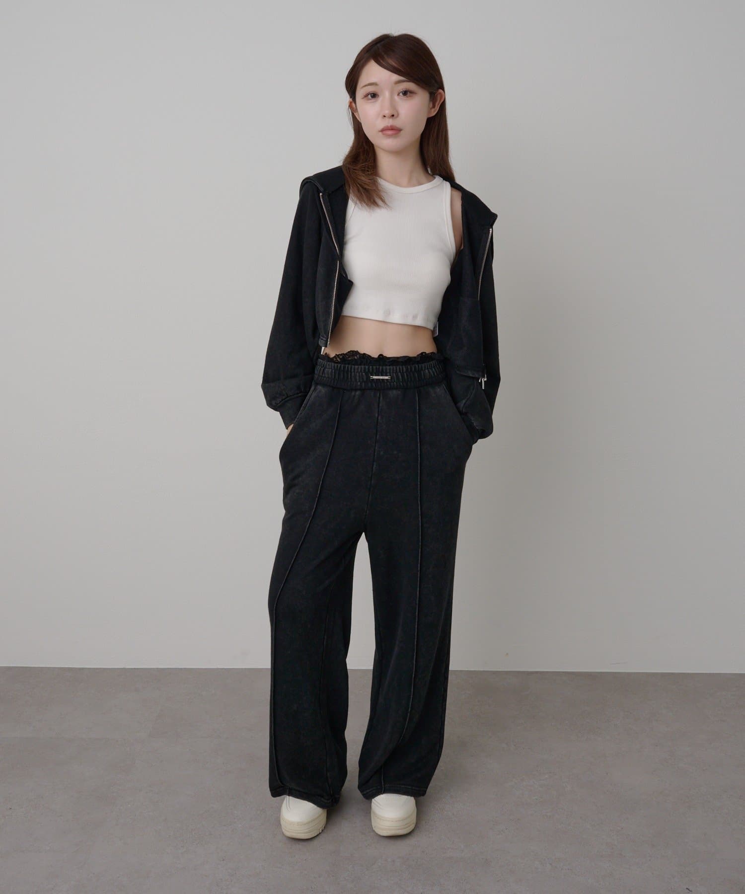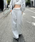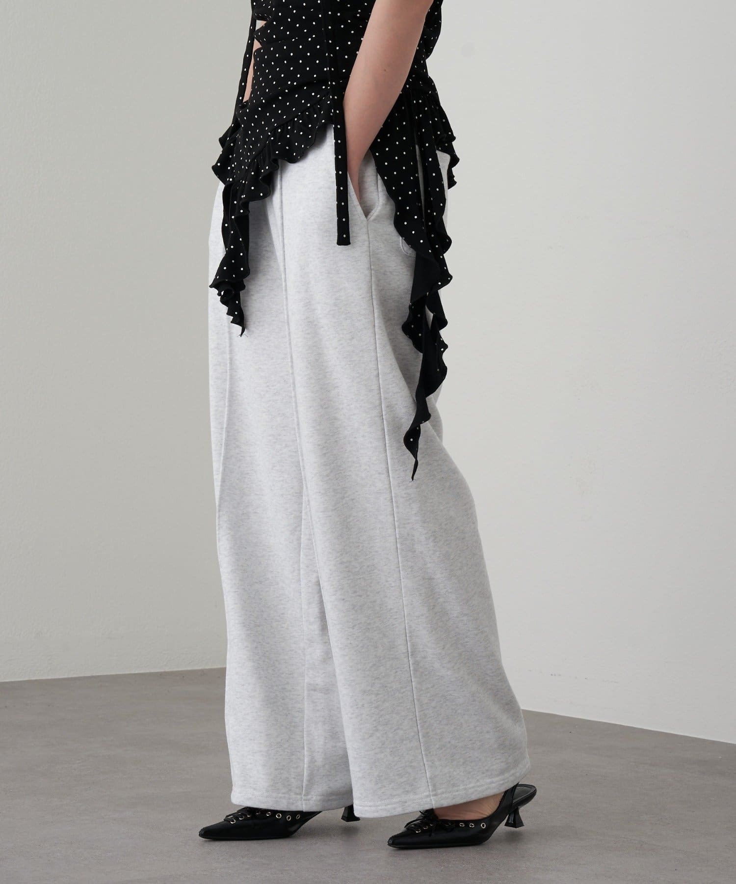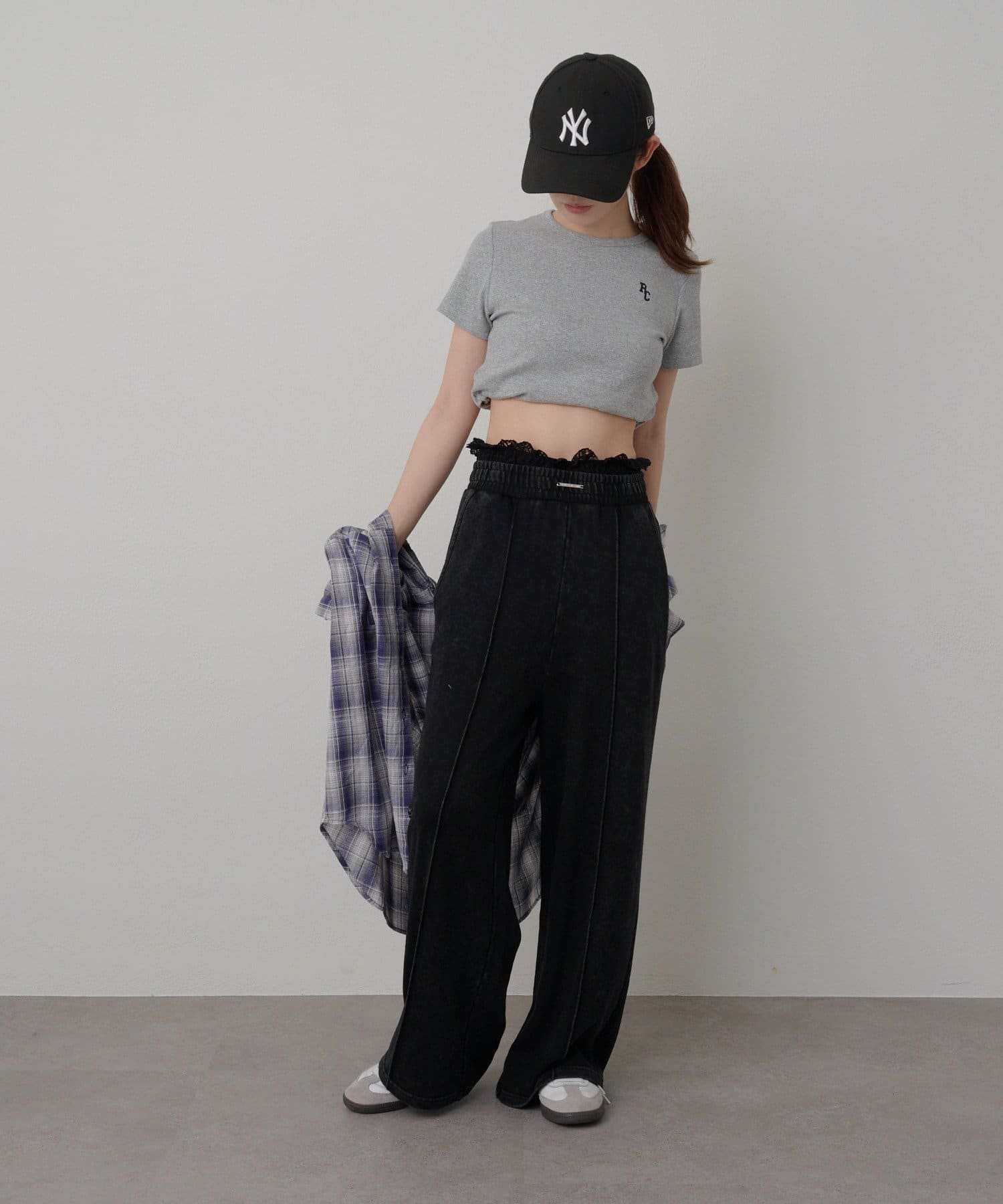 ・ウエストのレースがポイントのレイヤードスウェットパンツ。