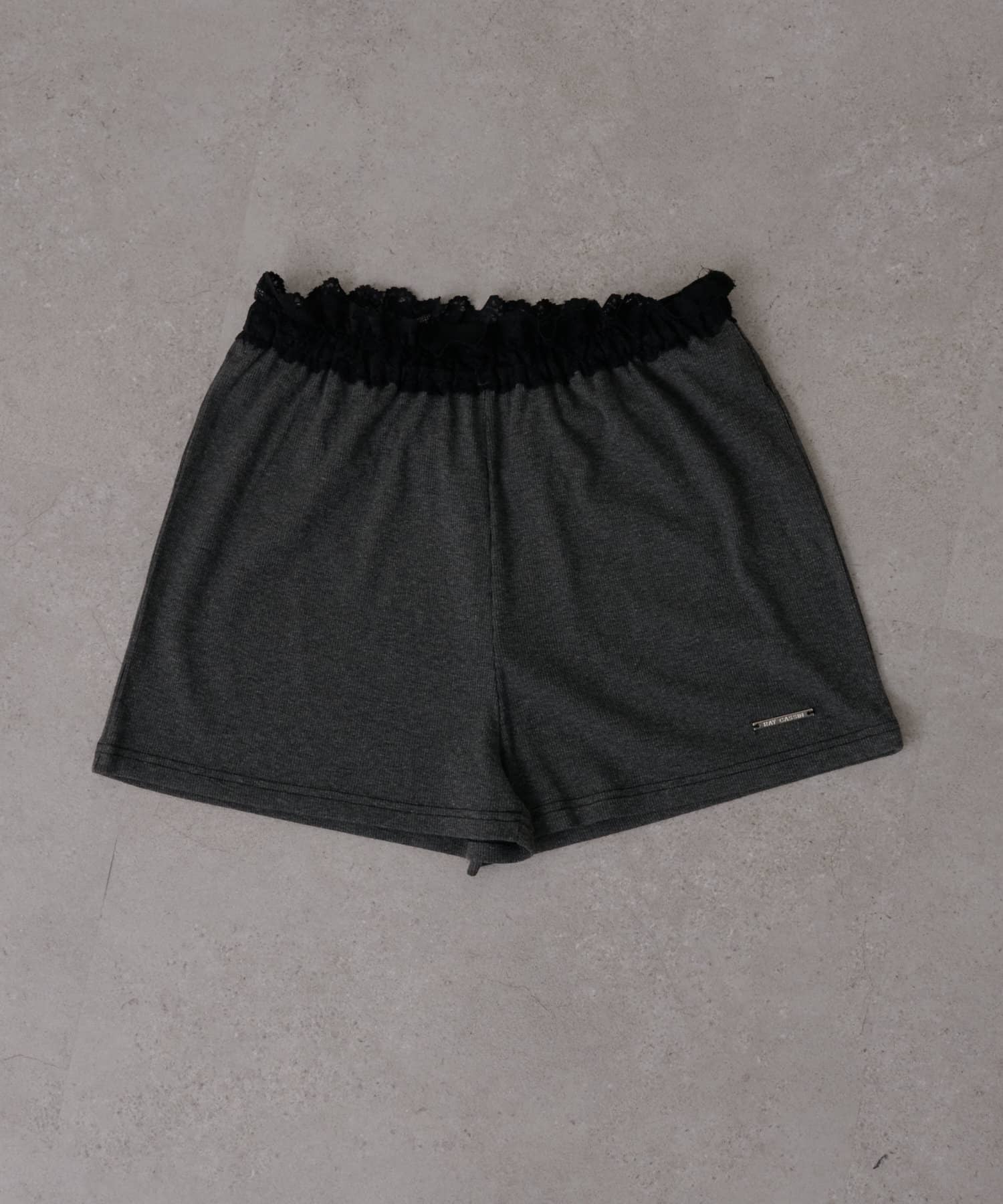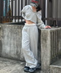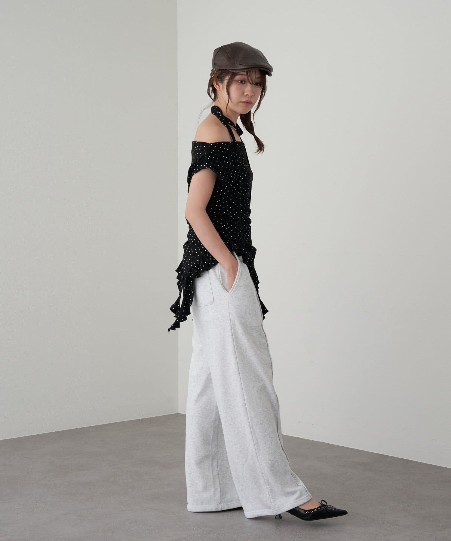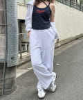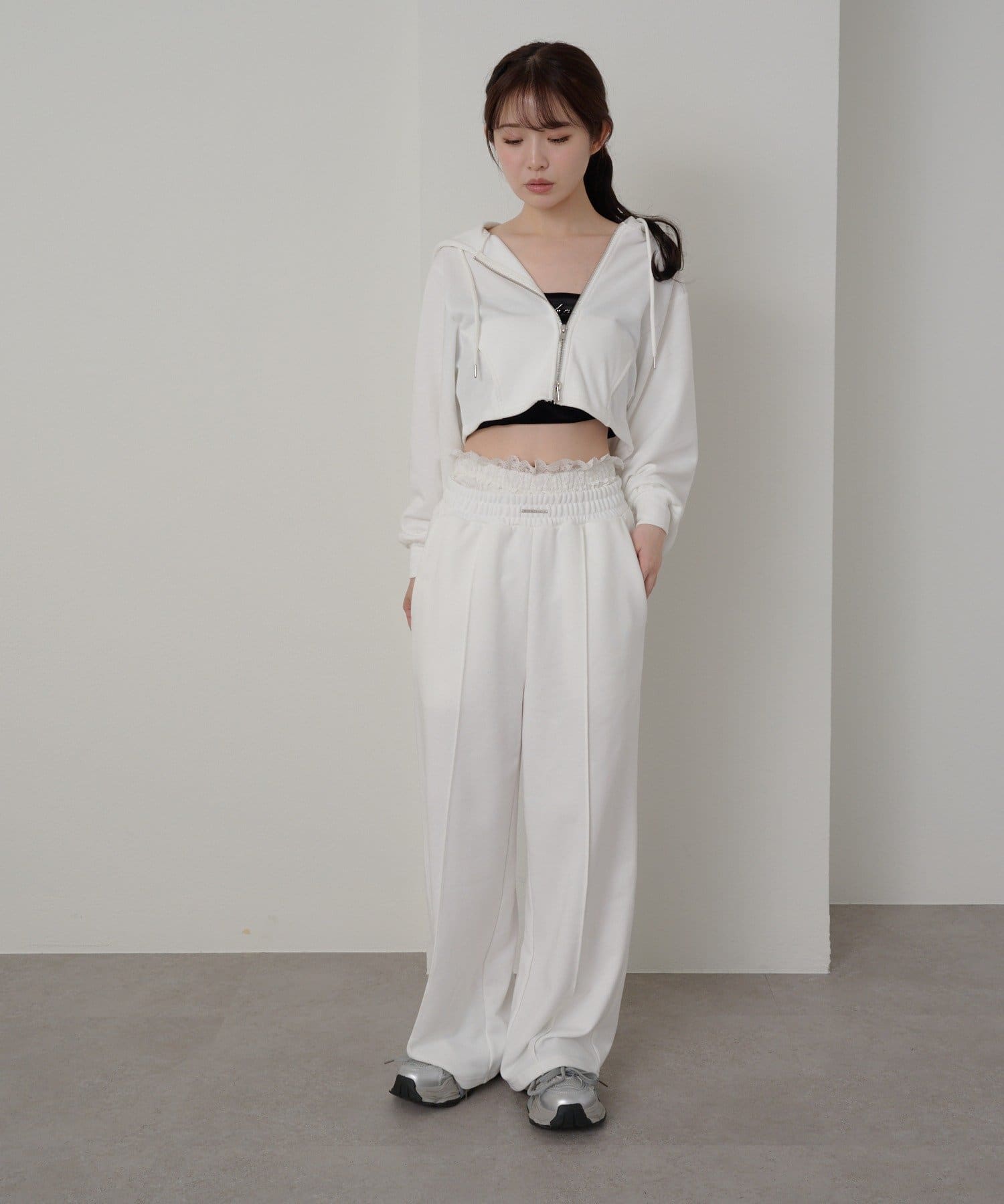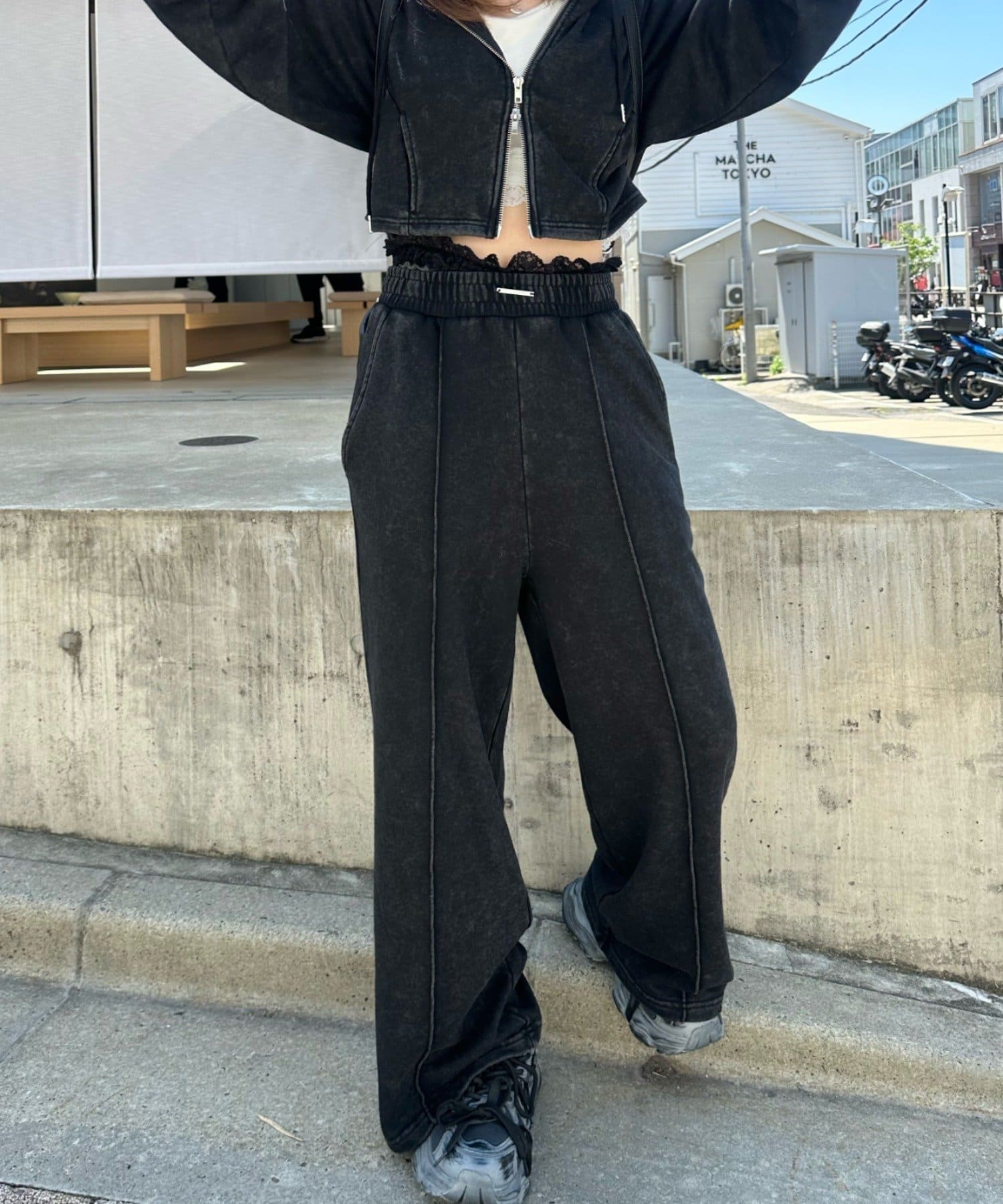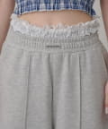 ・ウエストのレースがポイントのレイヤードスウェットパンツ。