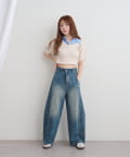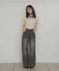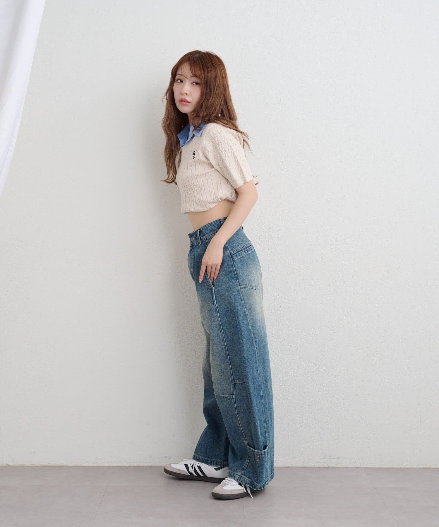 ・定番デニム合わせでは、ニットを折り込んでヘルシー見せしたスタイルがおすすめ。