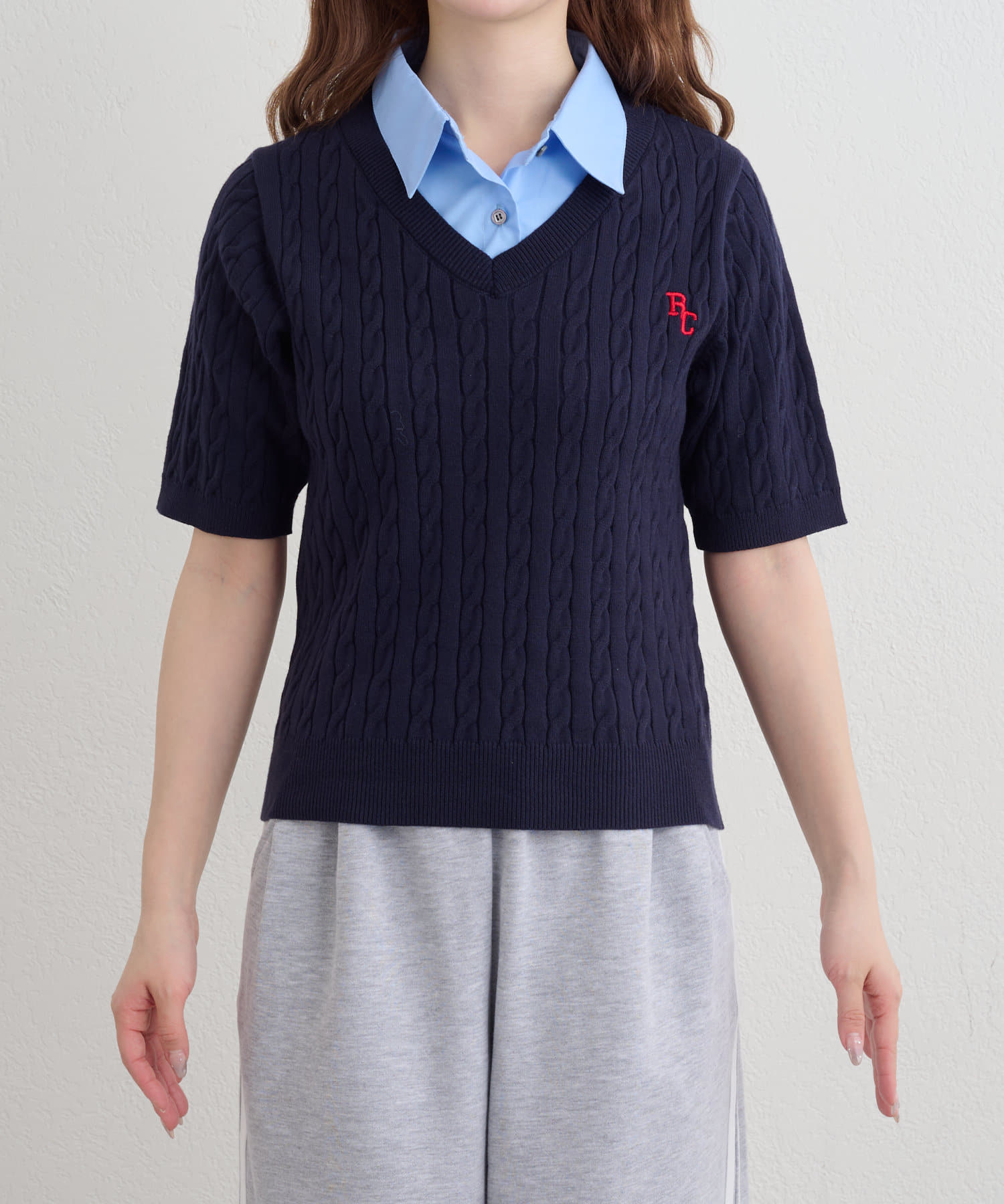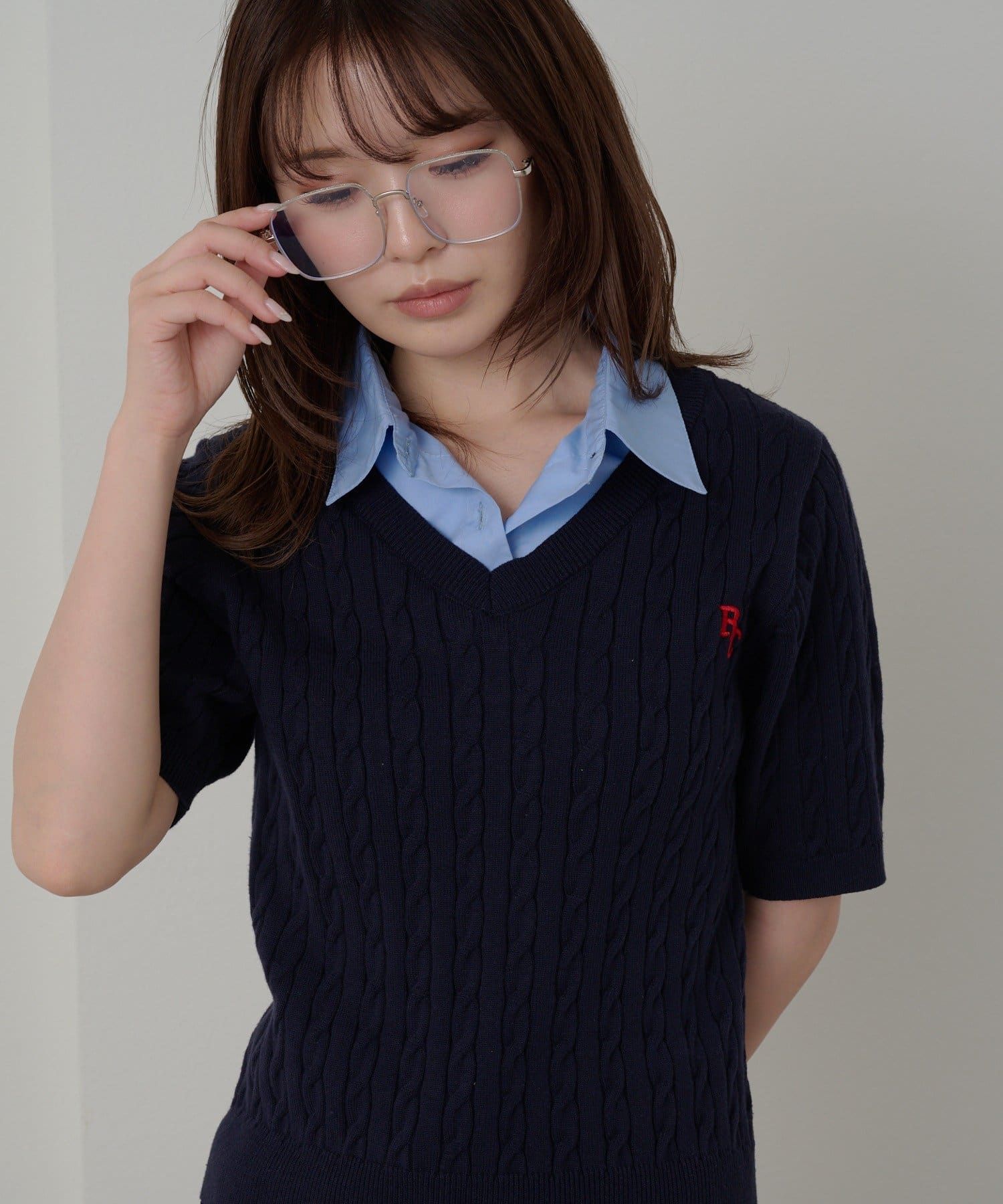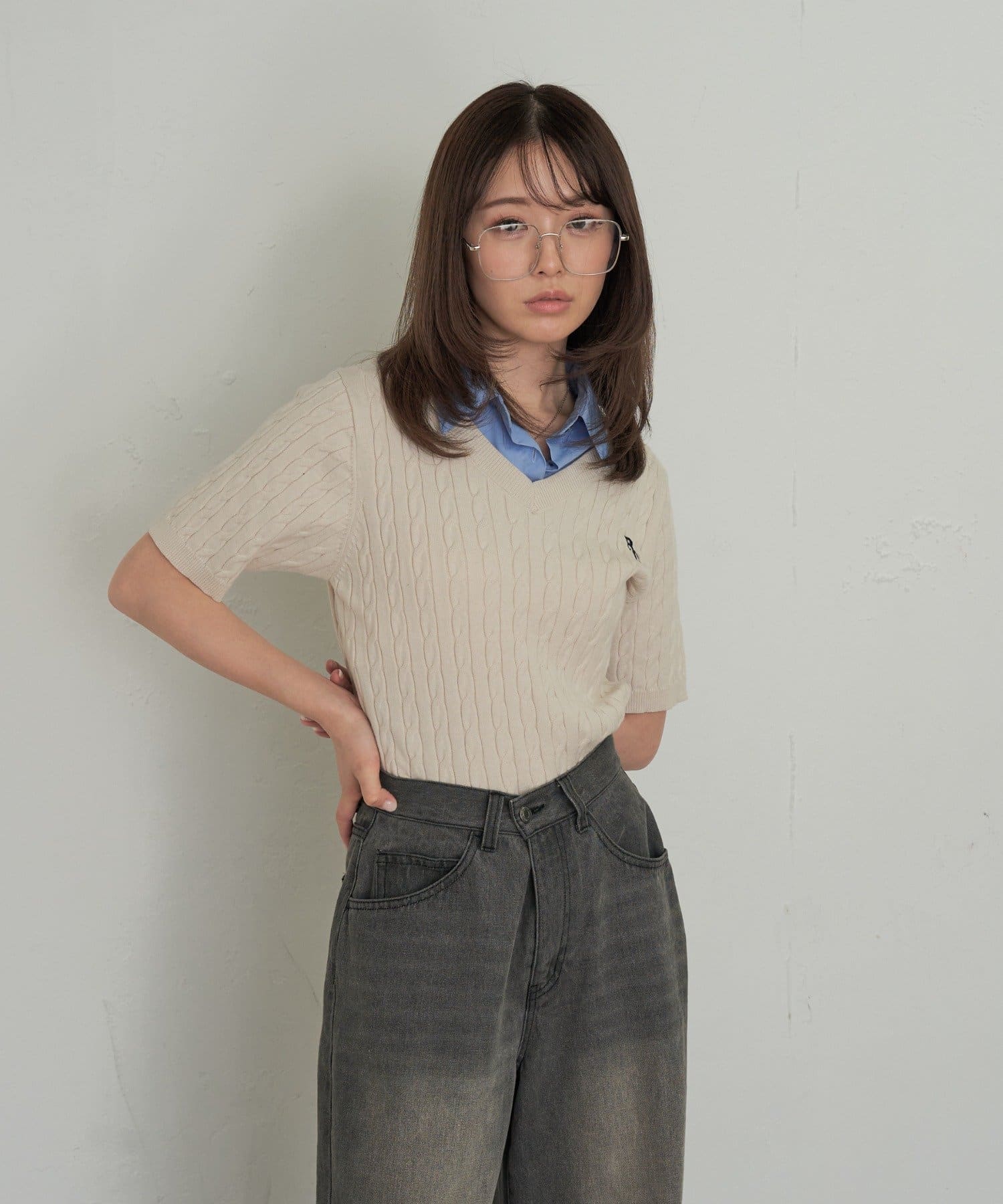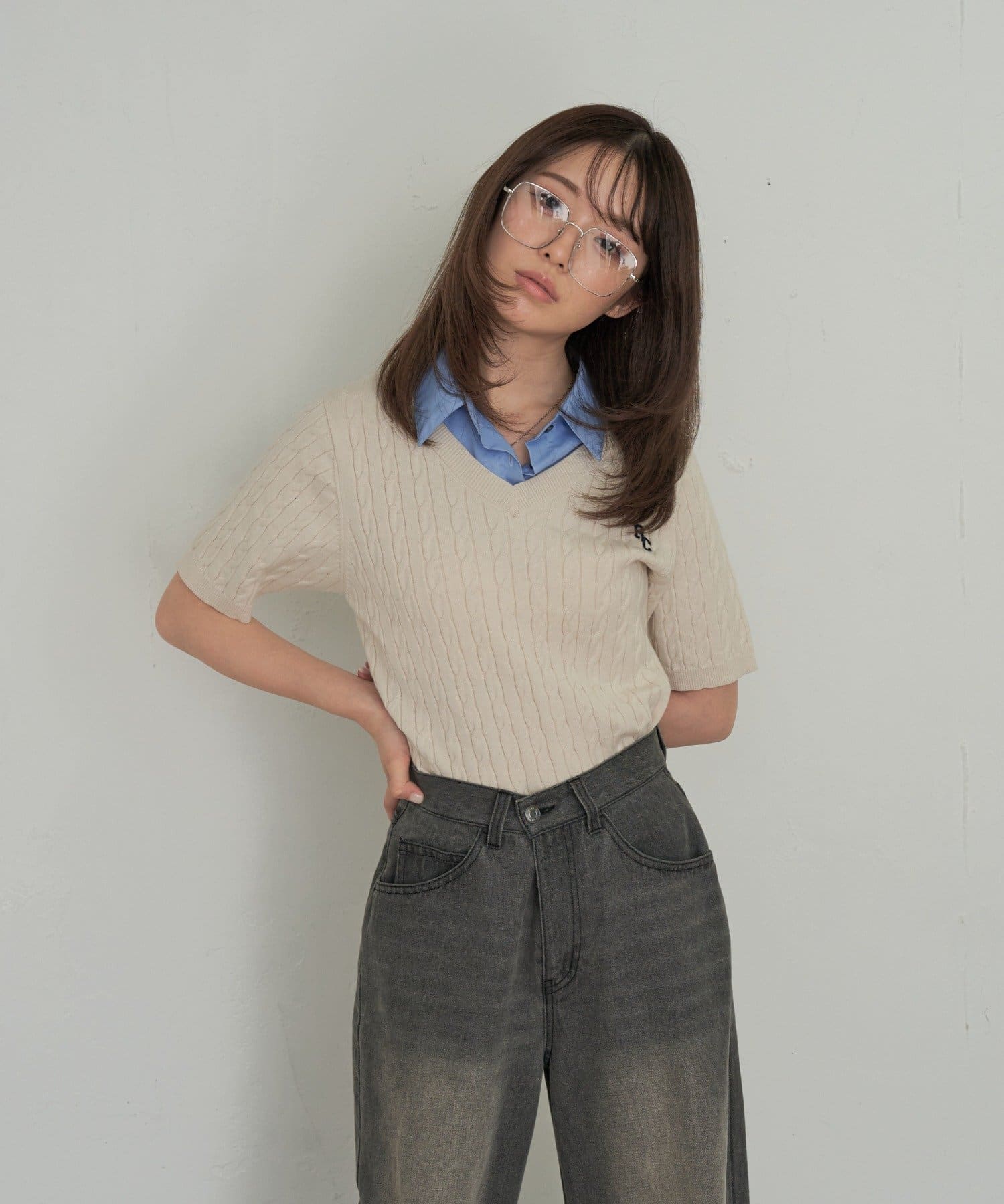 大人気のトップス、襟付ルーズケーブルVネックニットに半袖が登場!!