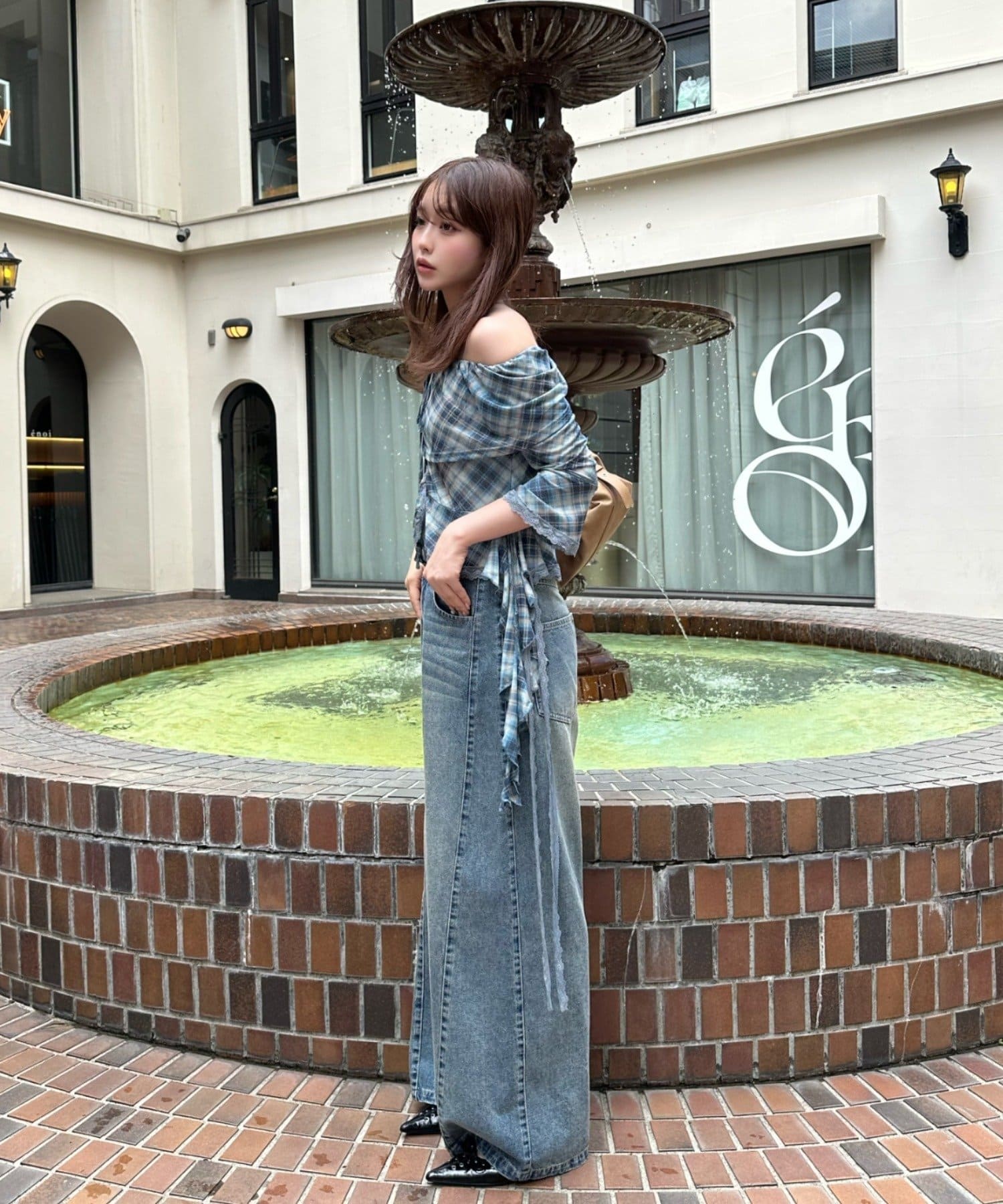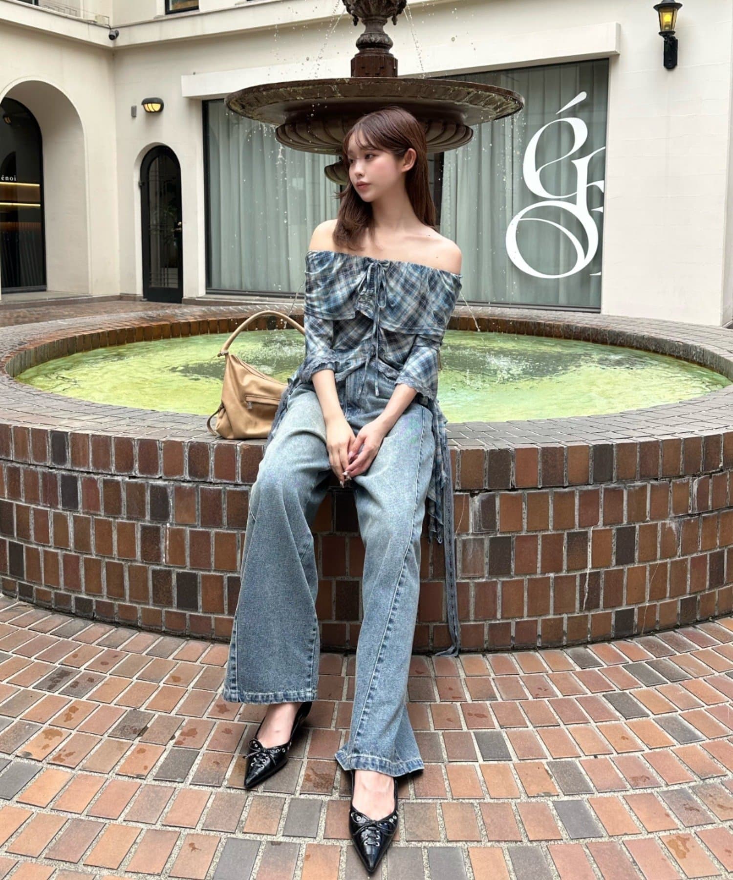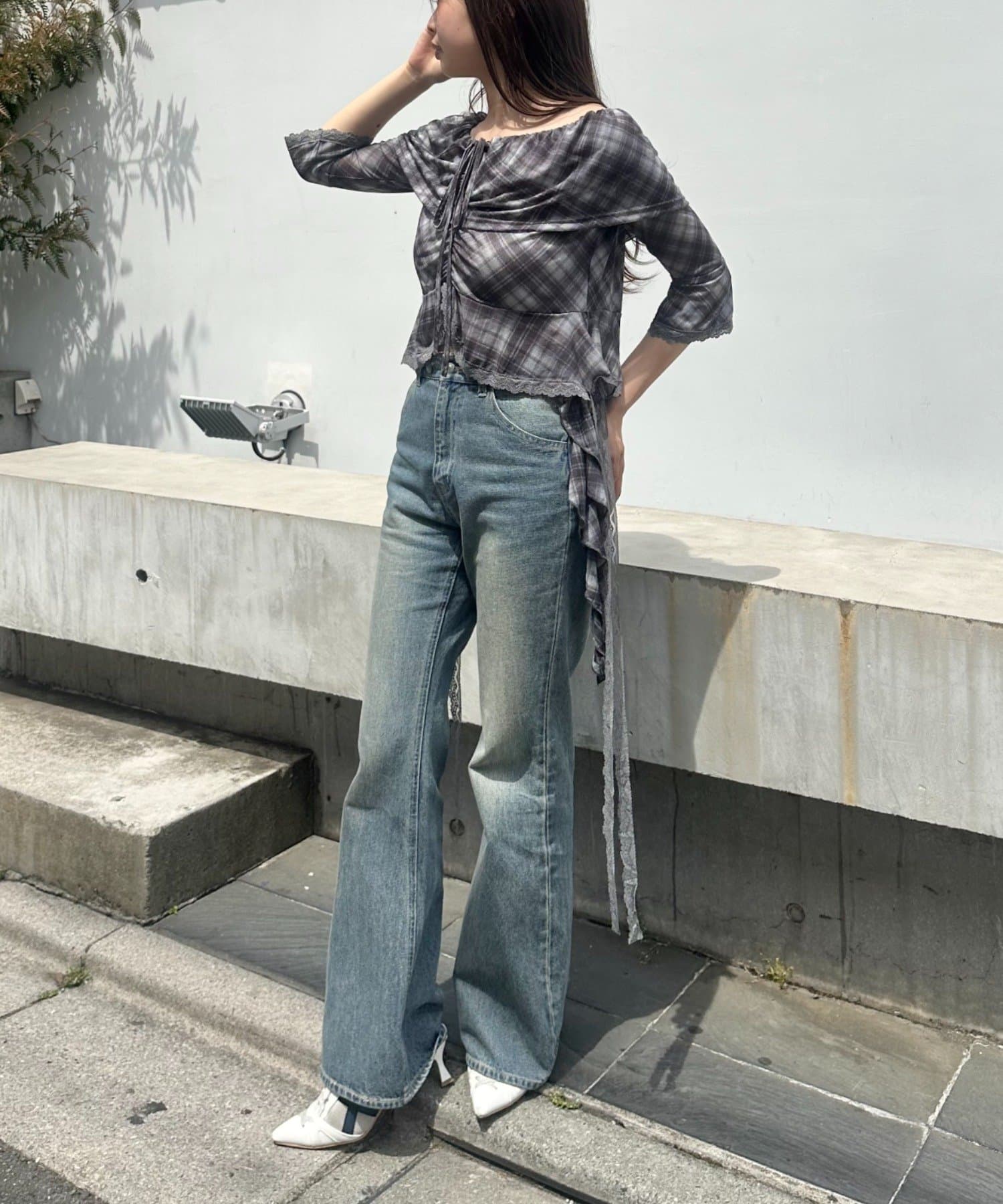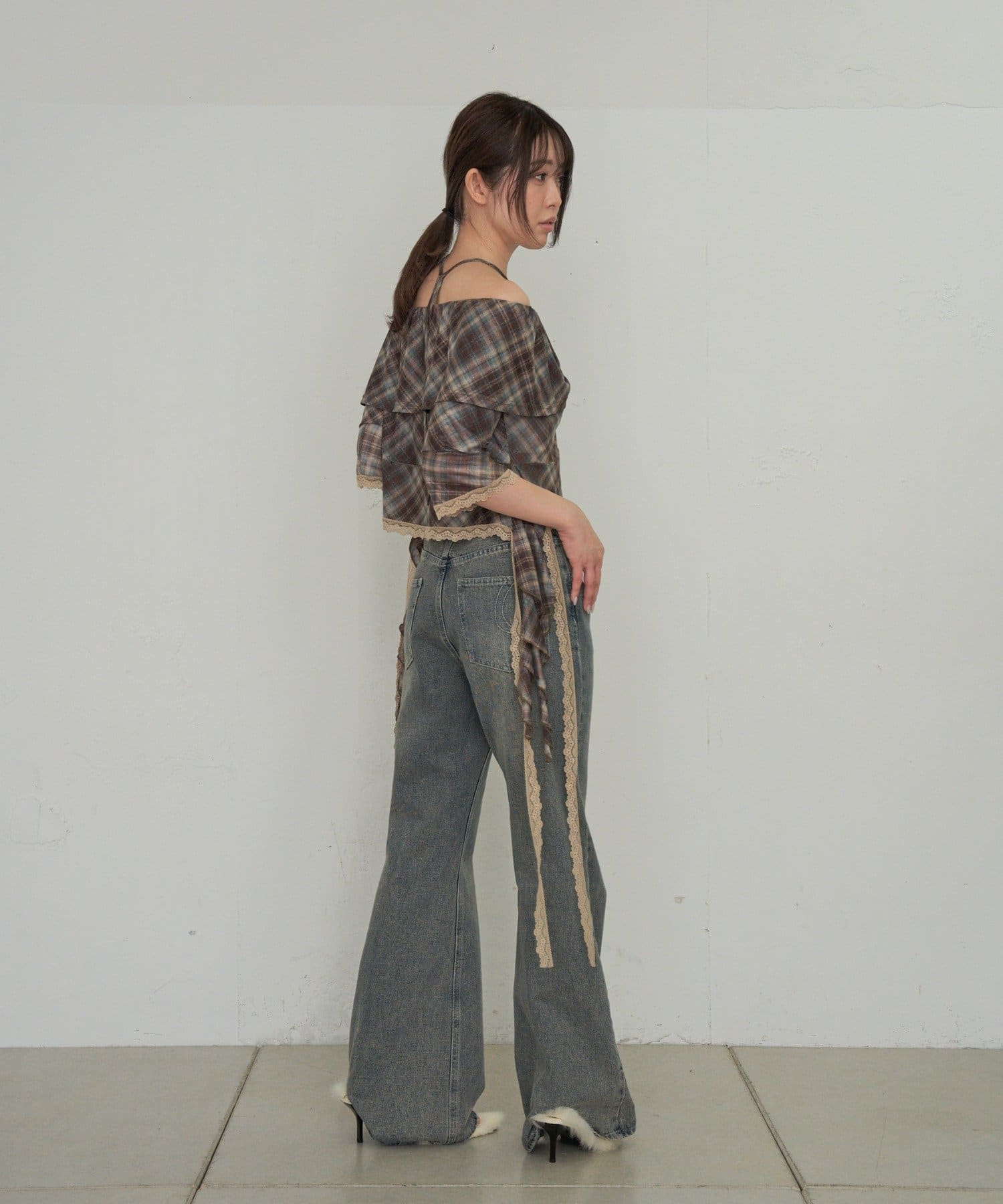 ▶甘め:フレアデニムパンツ、ウエストレイヤードスウェットパンツ、スニーカーミュール