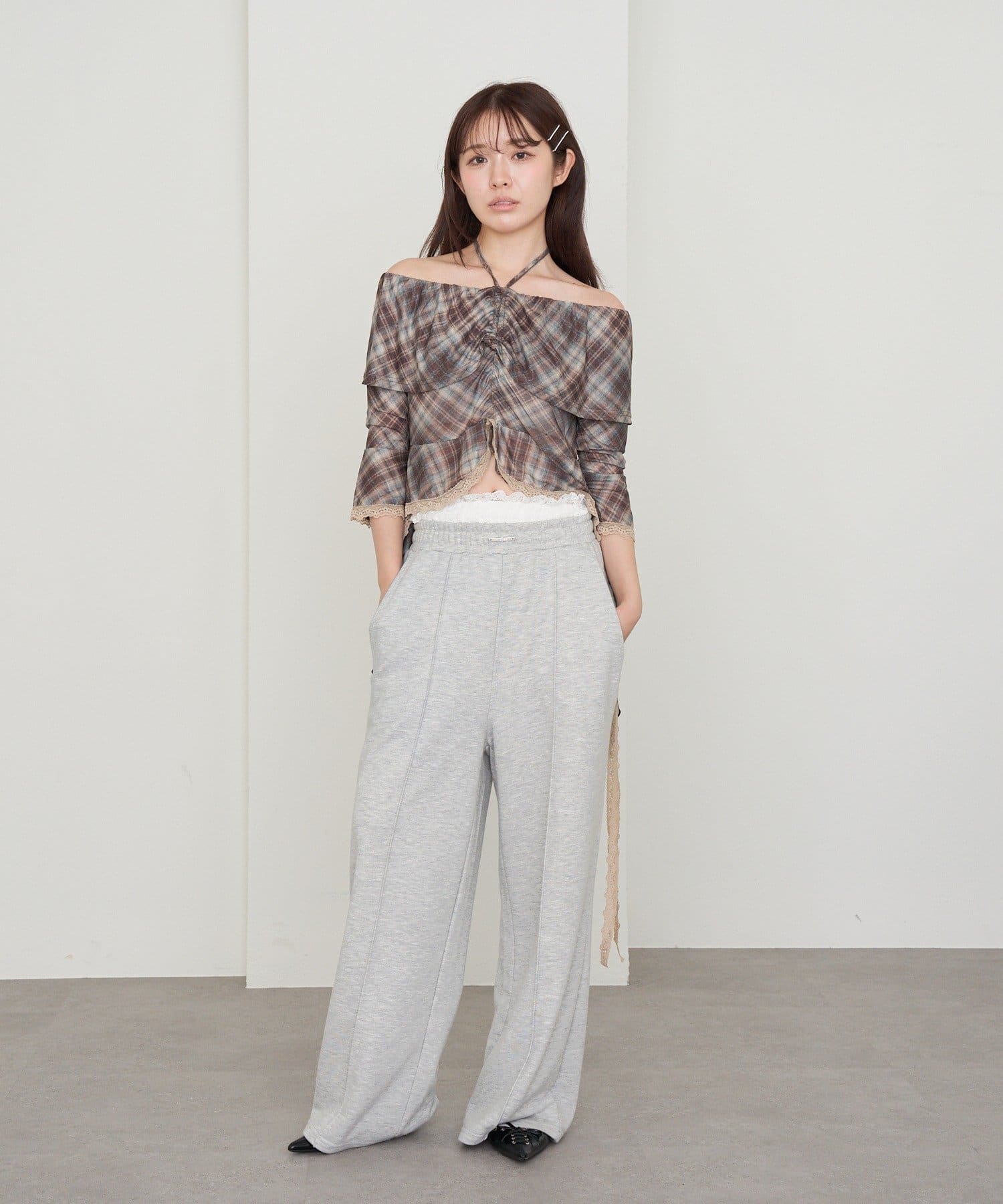 ・スウェットパンツと合わせると、トレンド感満載のカジュアルな肌見せスタイルが完成。