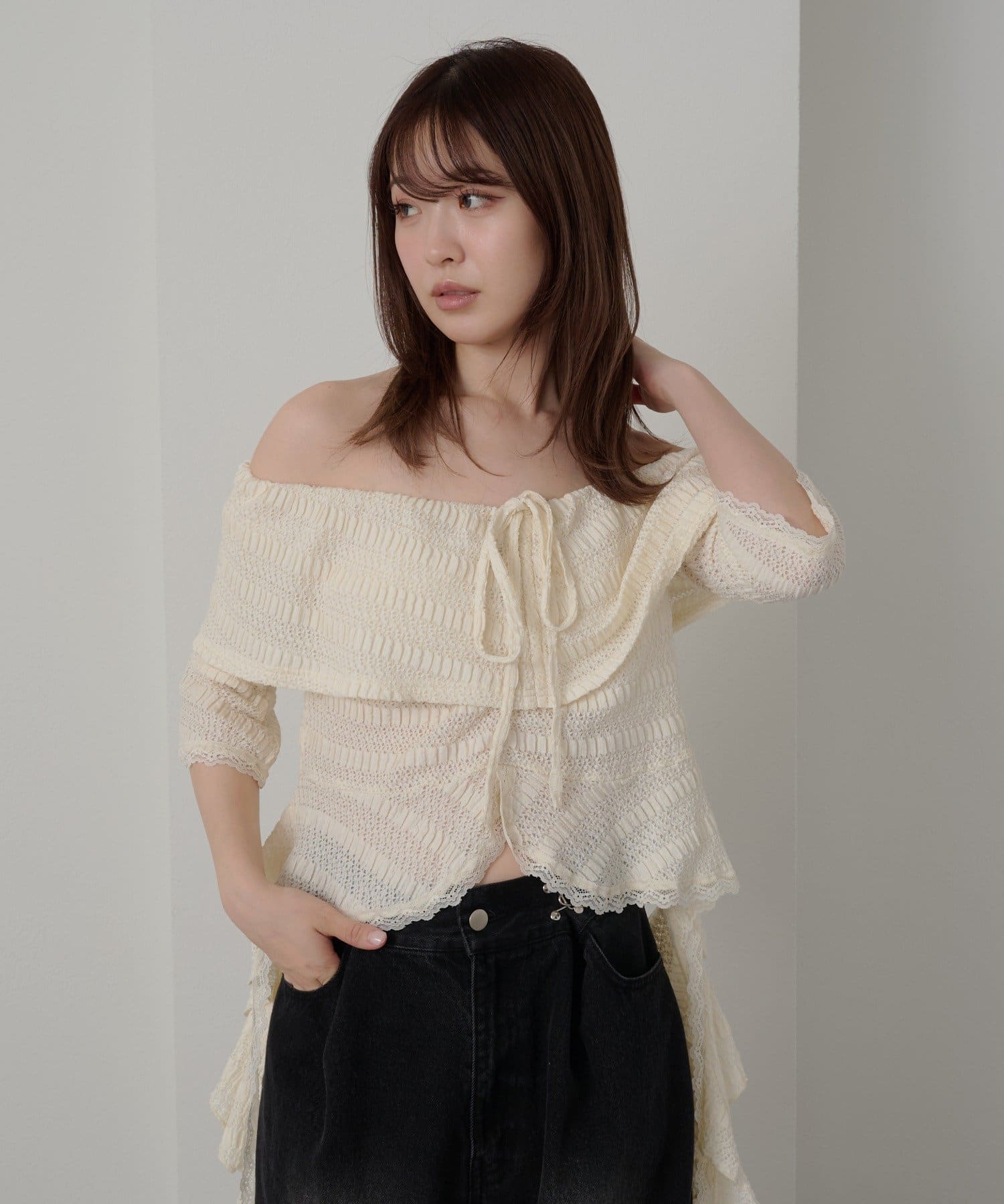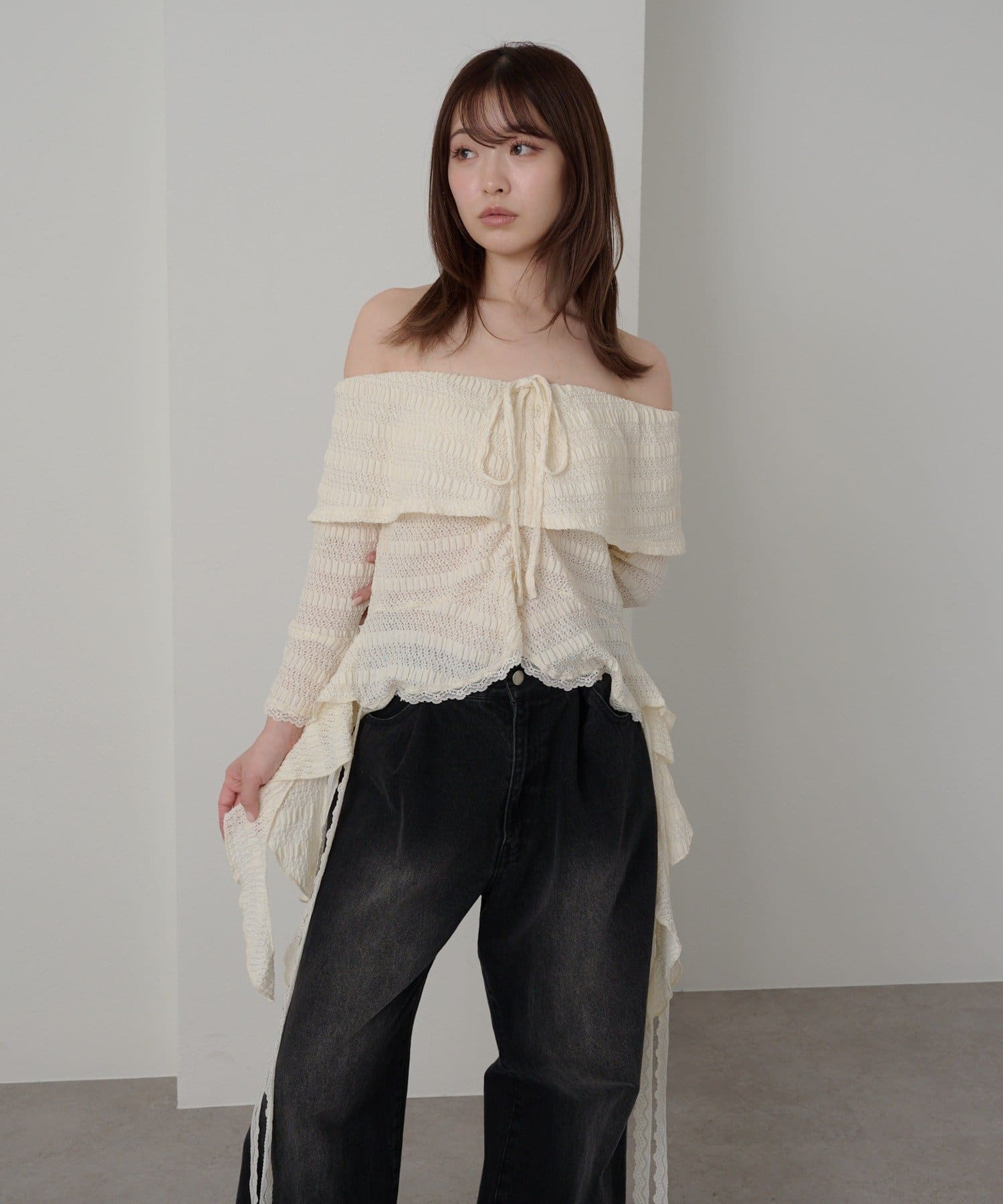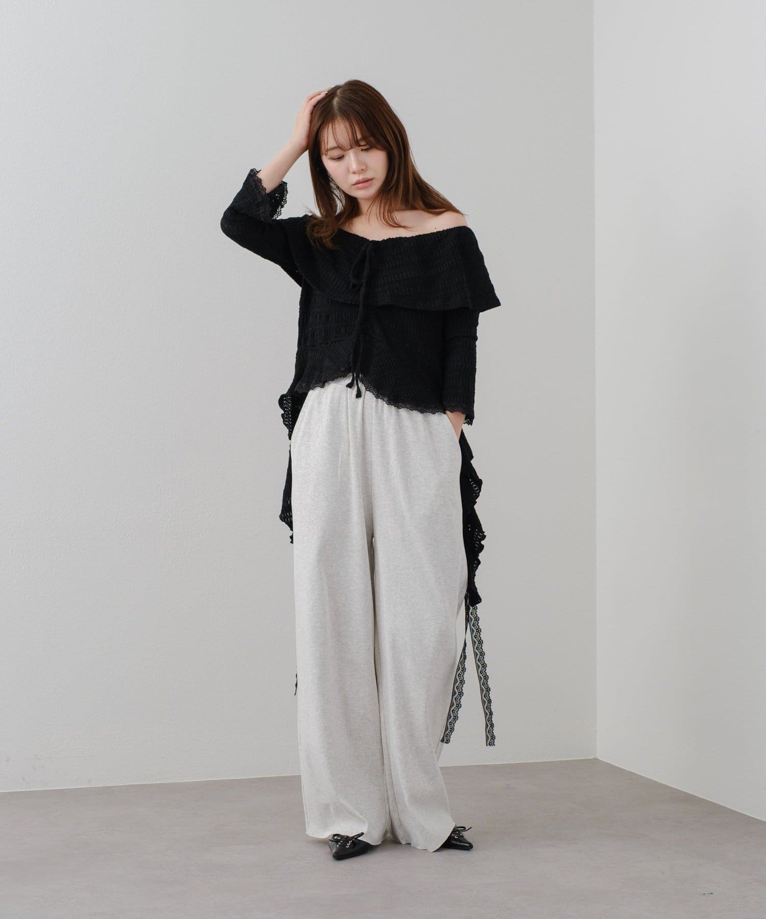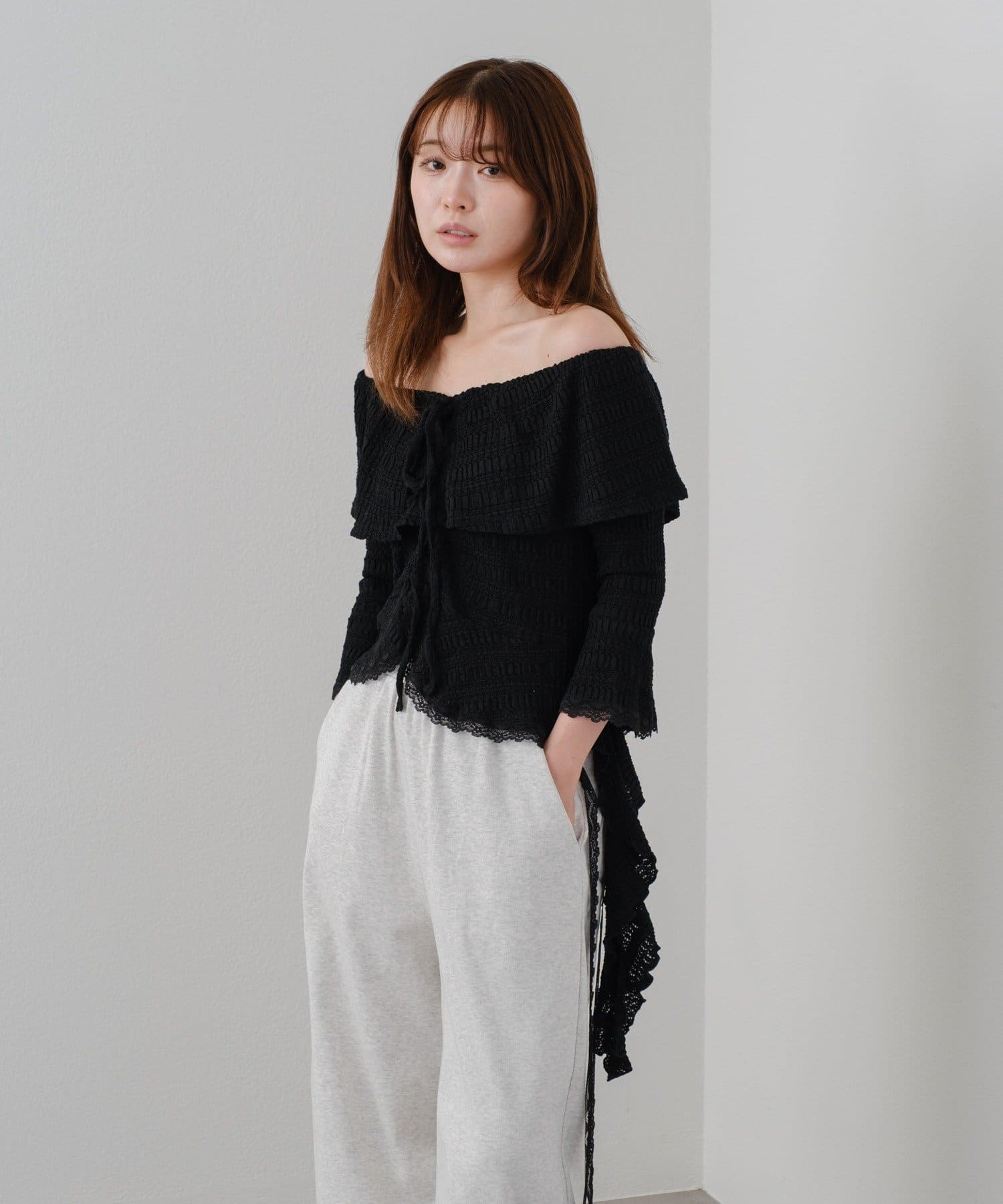 オフショルにせずプルオーバーとしても着用していただけるので、肌見せに抵抗のある方にもおすすめ!