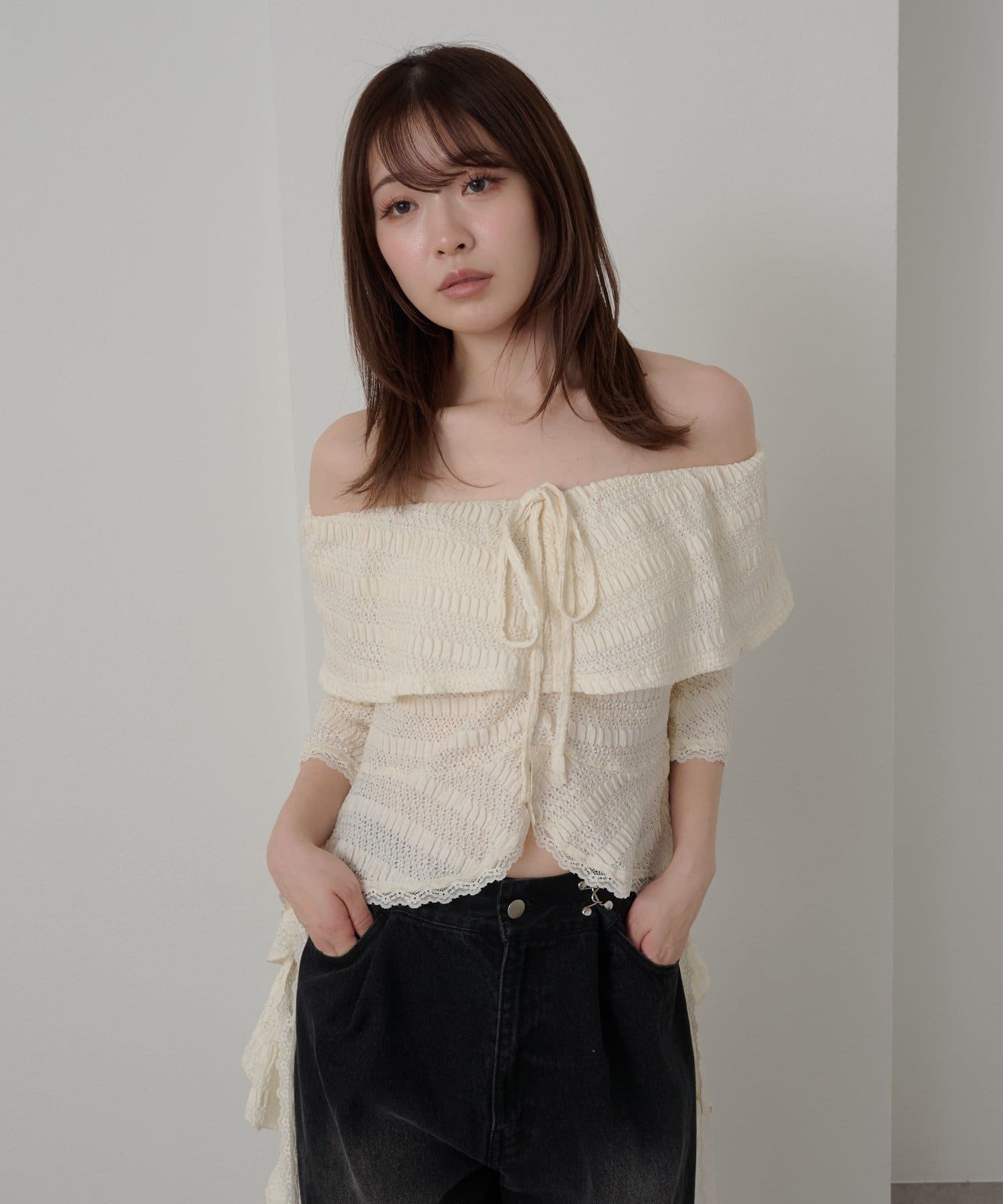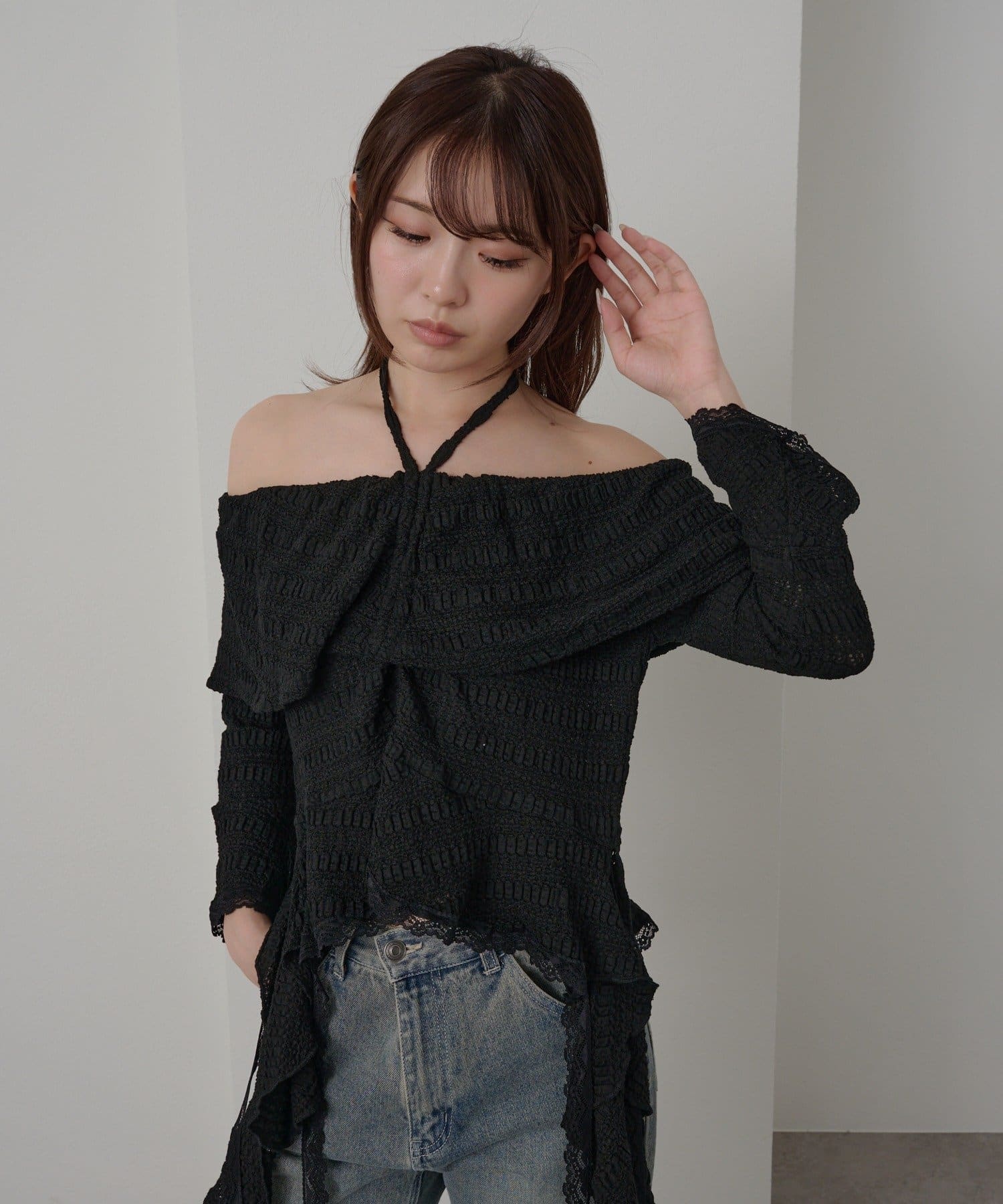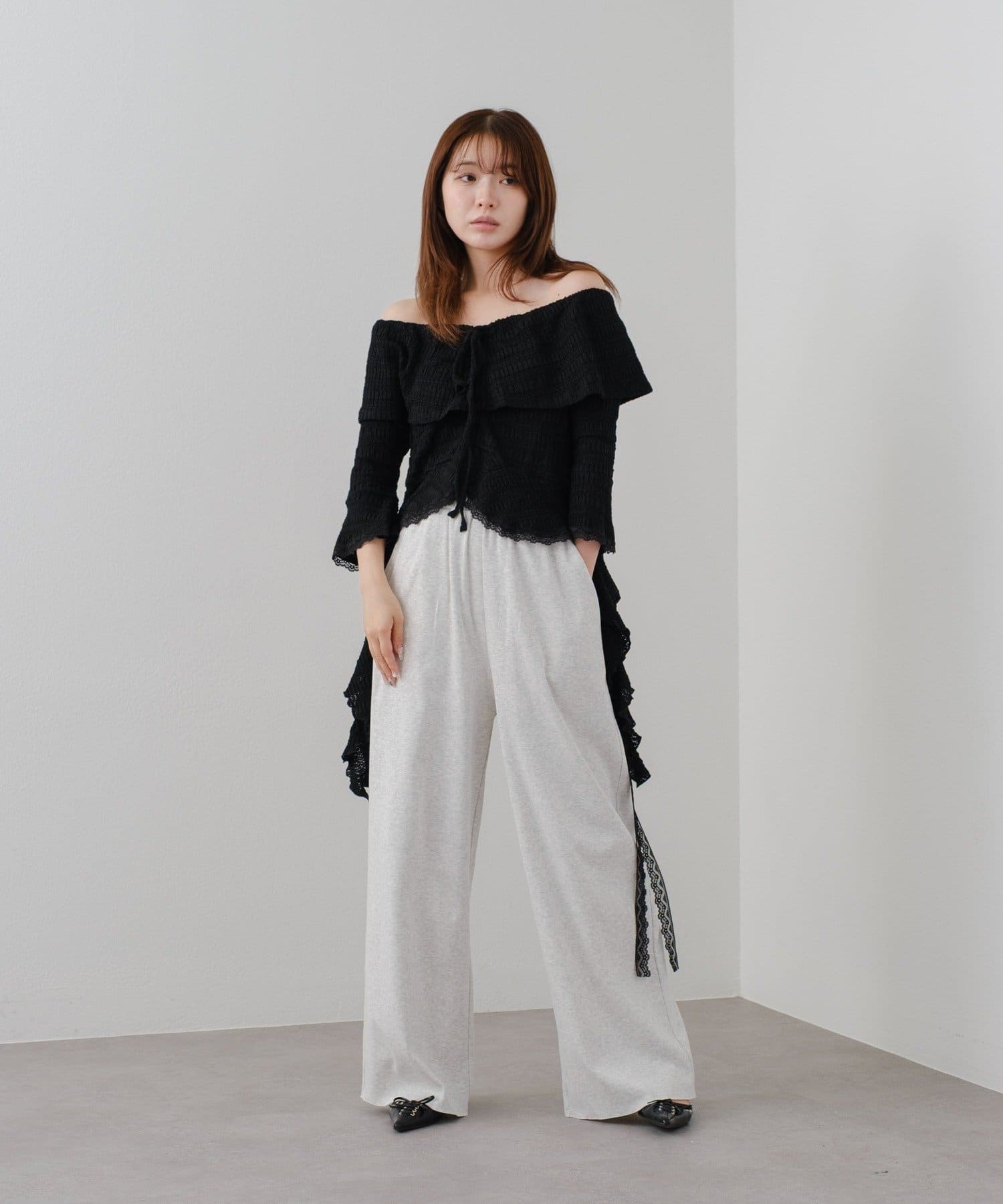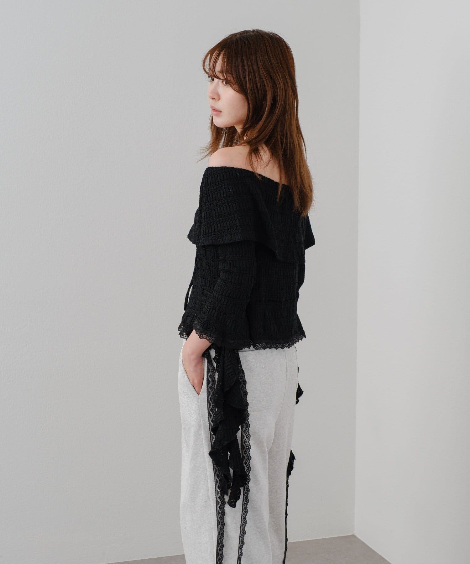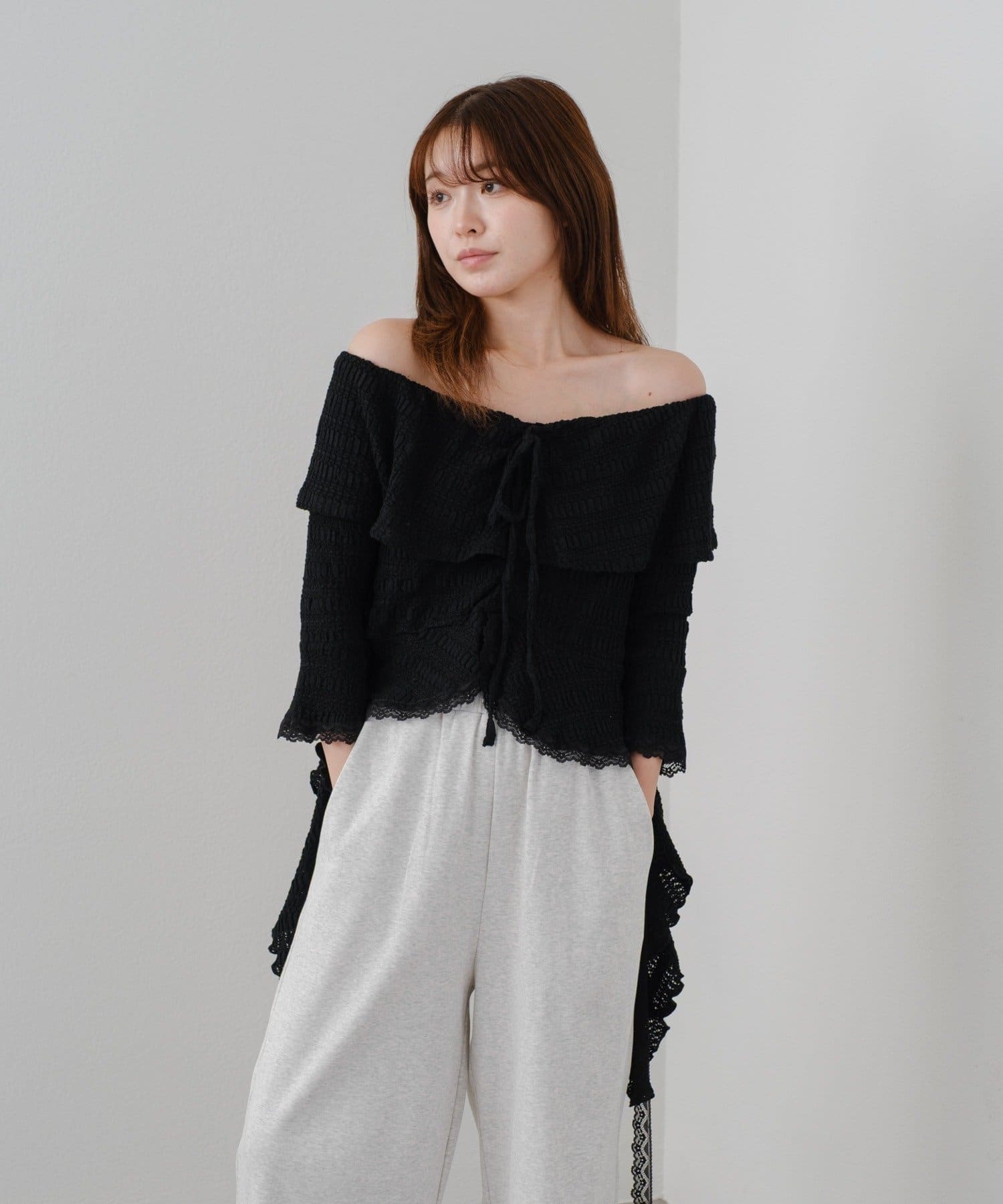 オフショルにせずプルオーバーとしても着用していただけるので、肌見せに抵抗のある方にもおすすめ!
