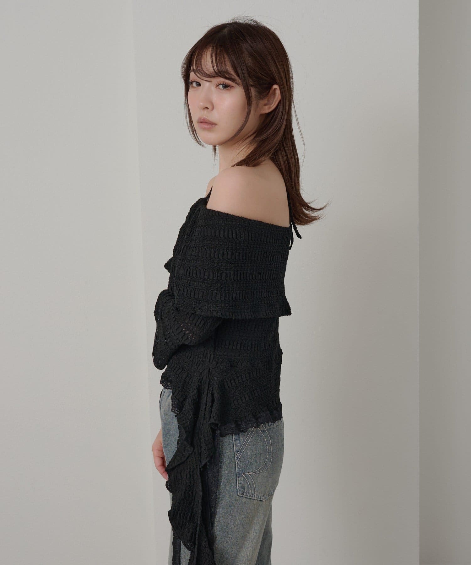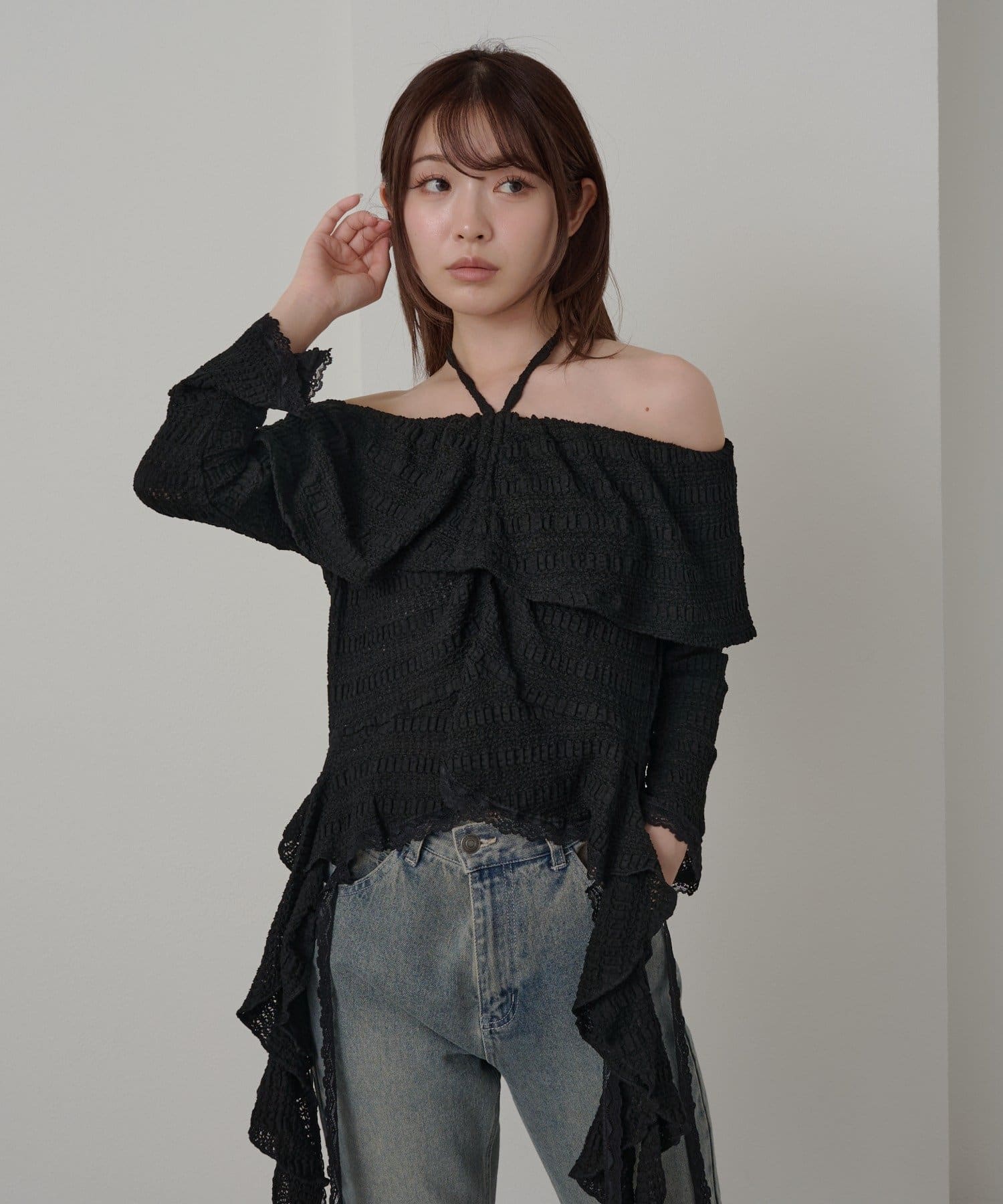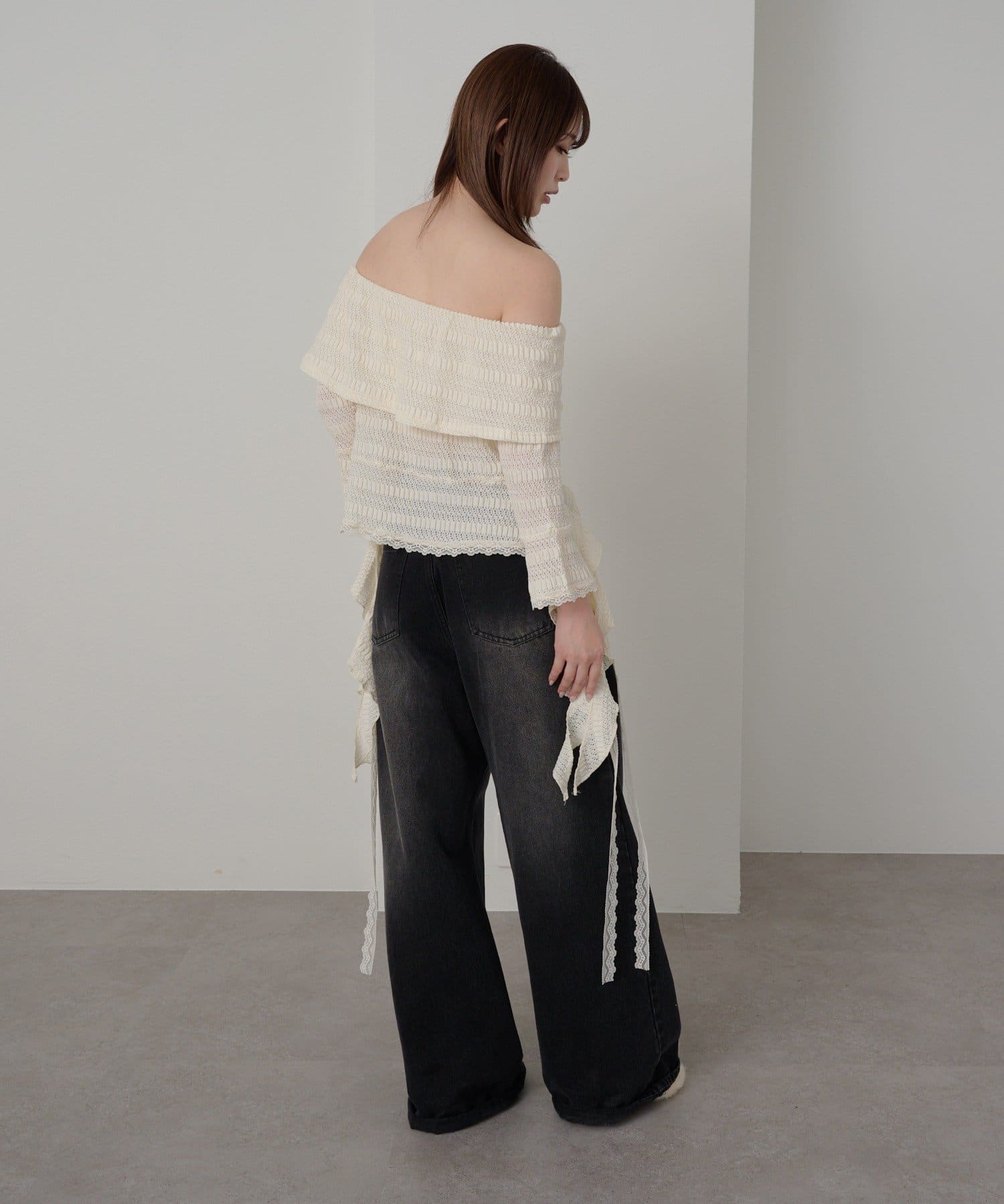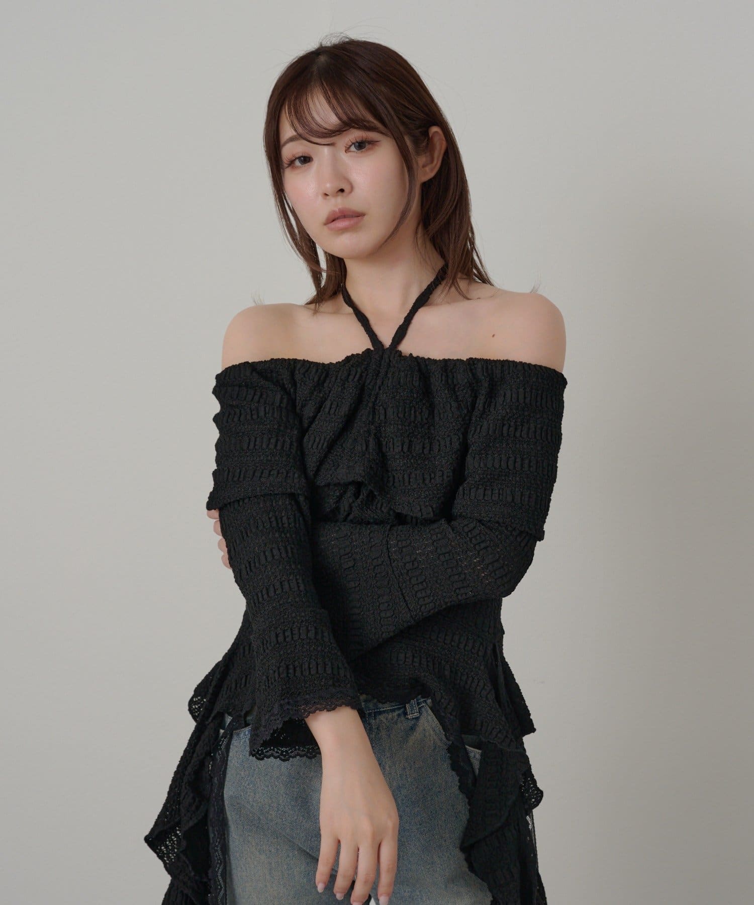 オフショルにせずプルオーバーとしても着用していただけるので、肌見せに抵抗のある方にもおすすめ!