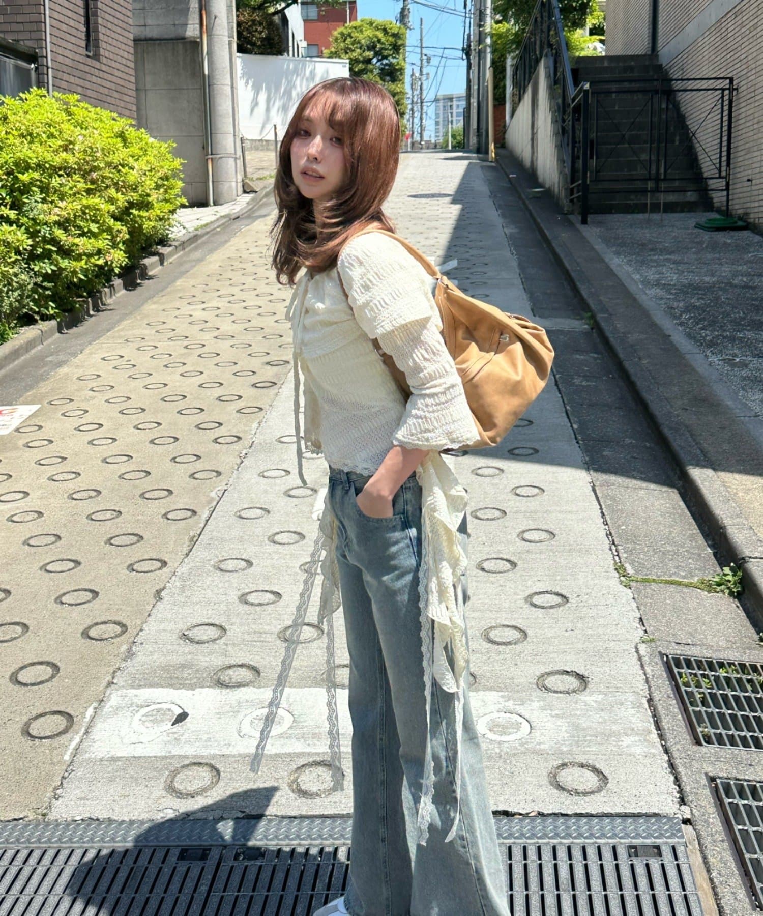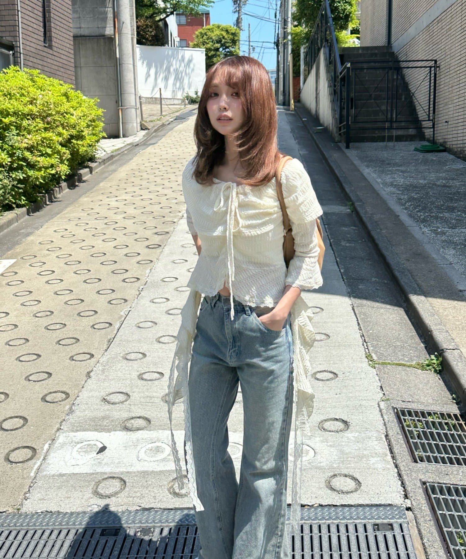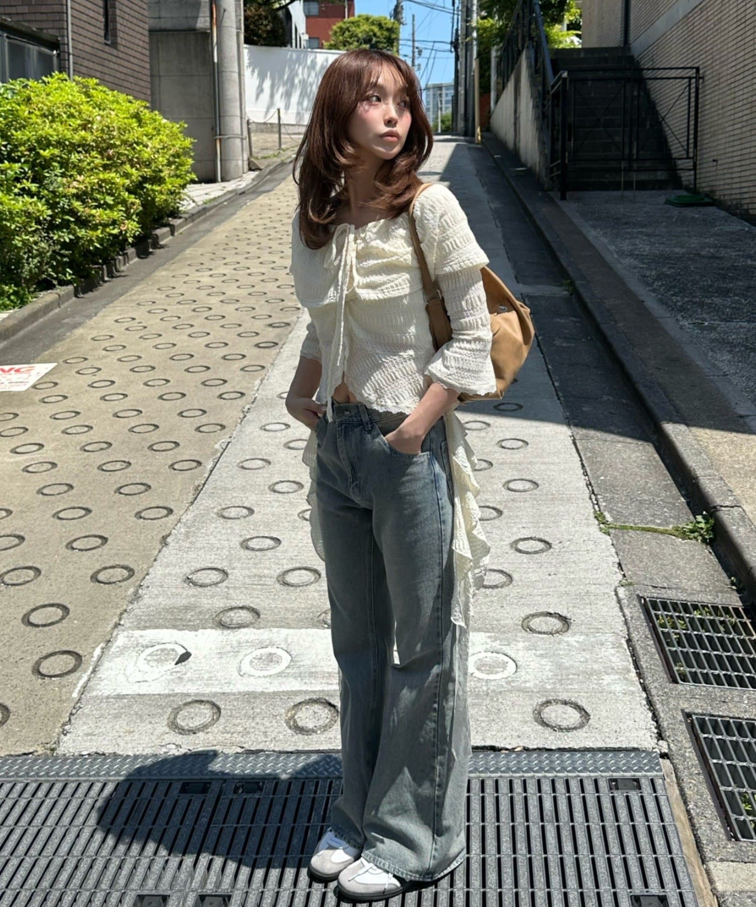 ・上からアウターを重ねても下から見える紐がトレンドスタイルに。