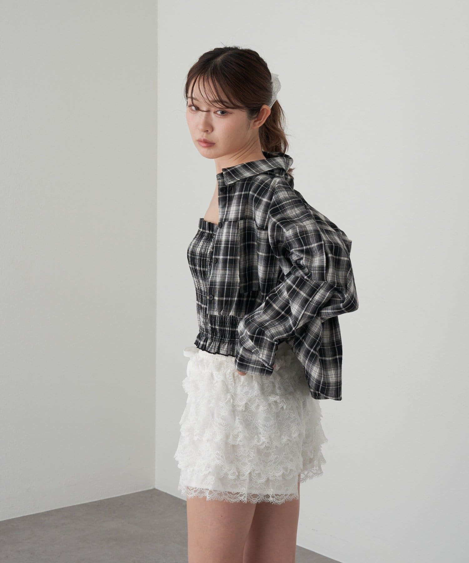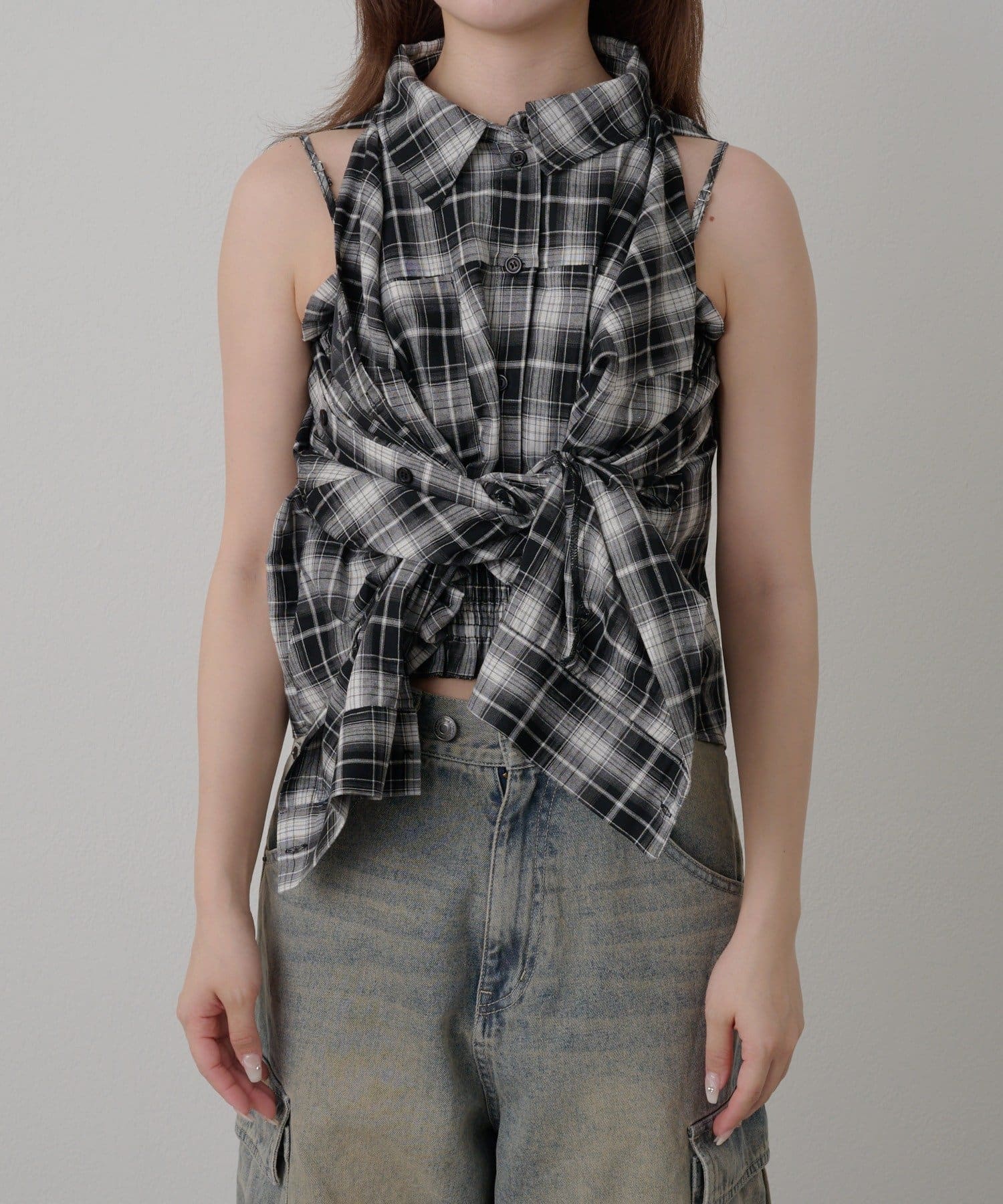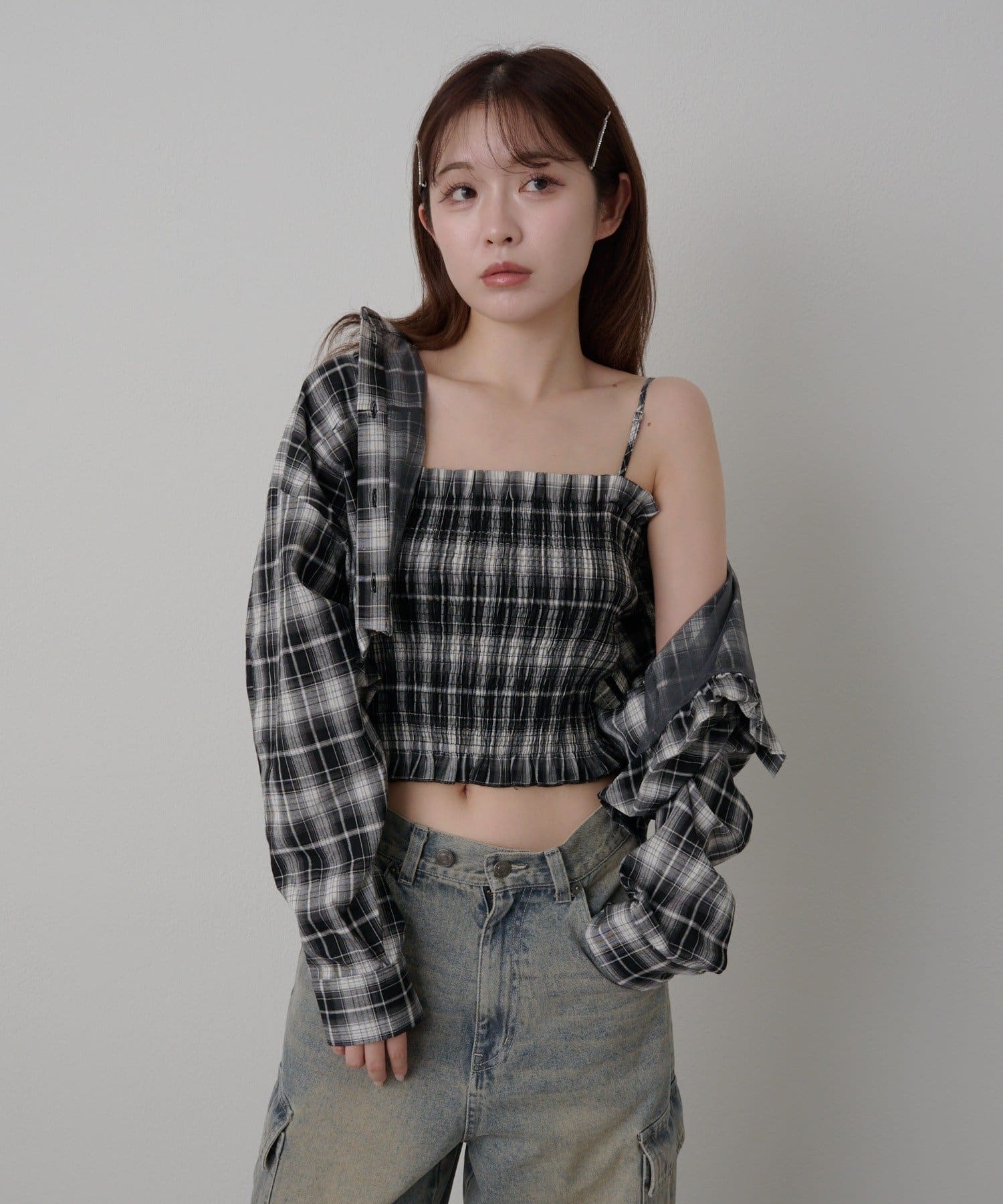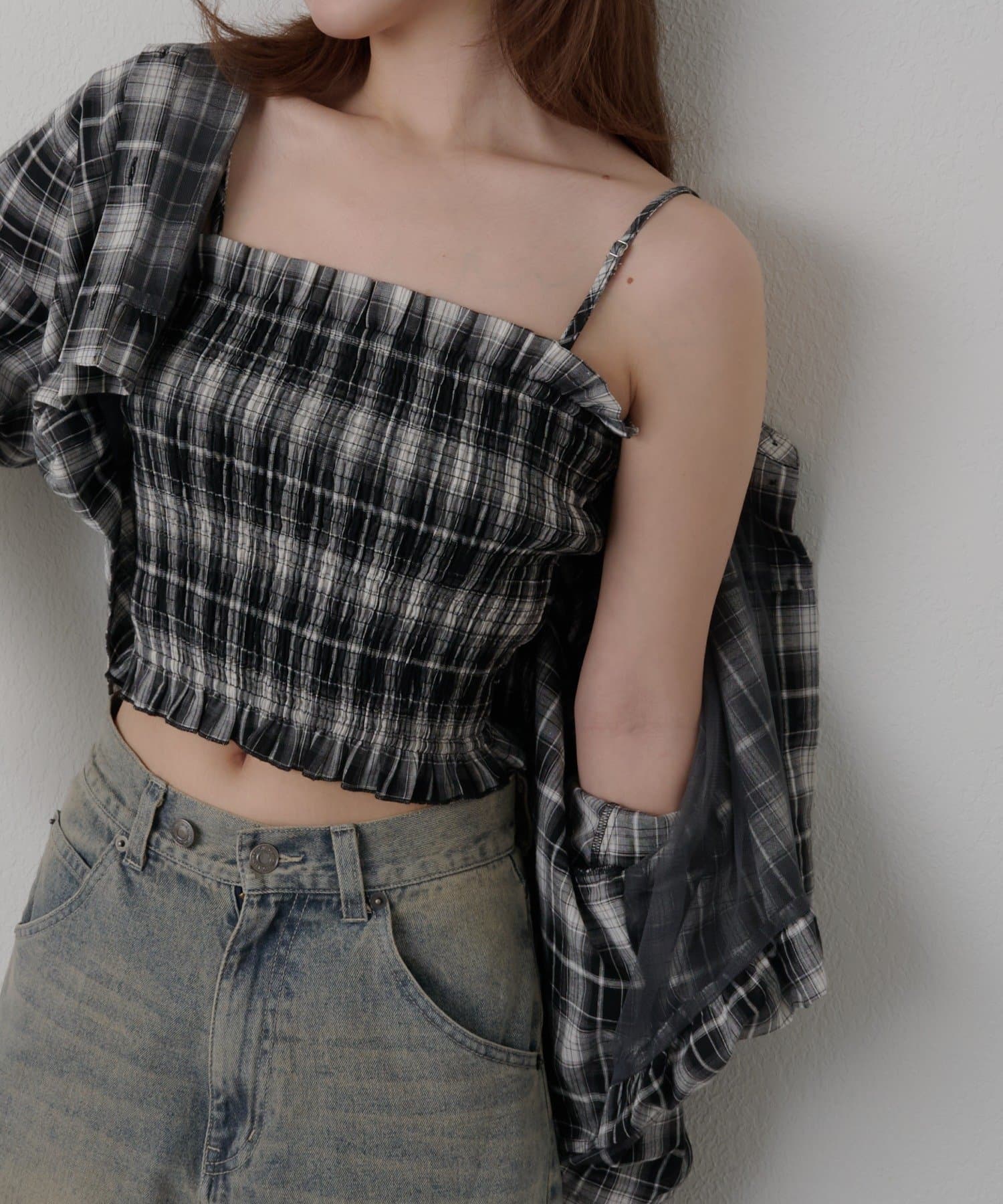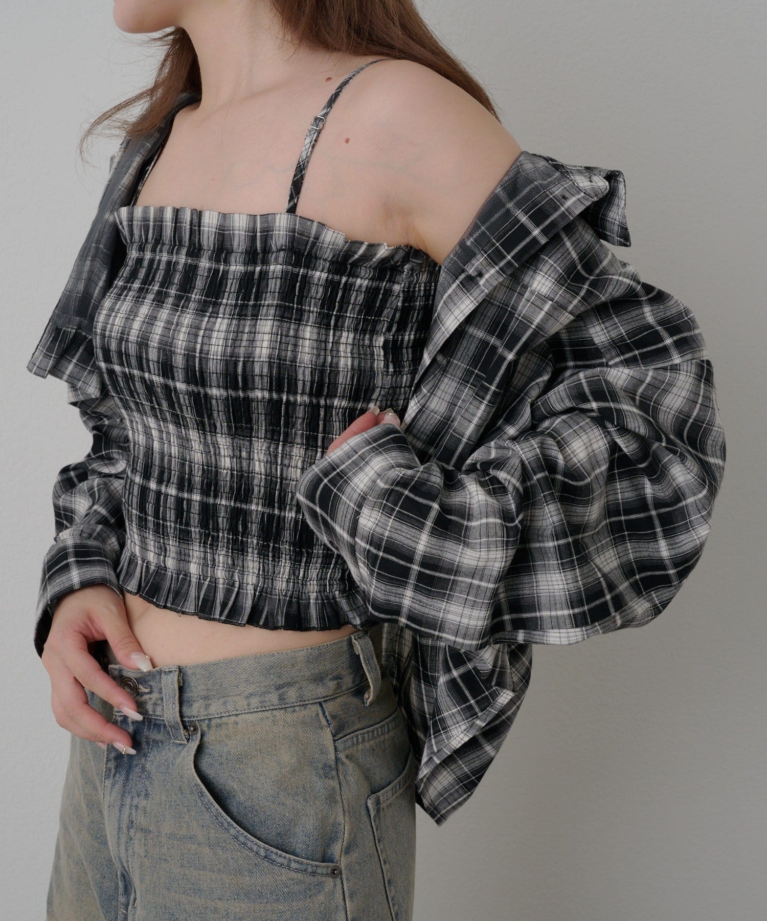 ・伸縮性があり肌にフィットするビスチェがセットのチェックシャツ。