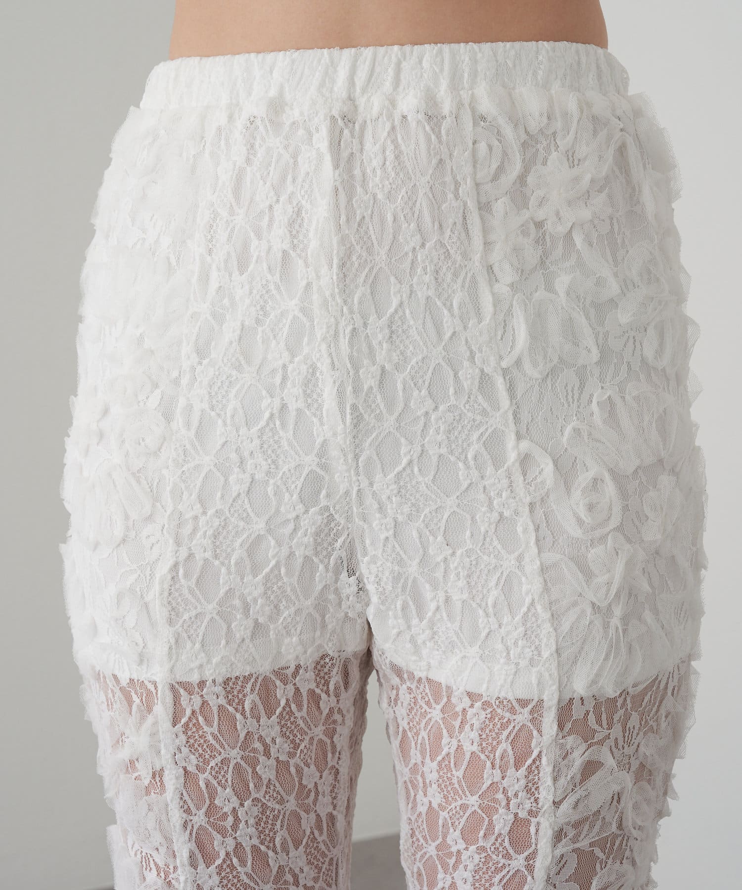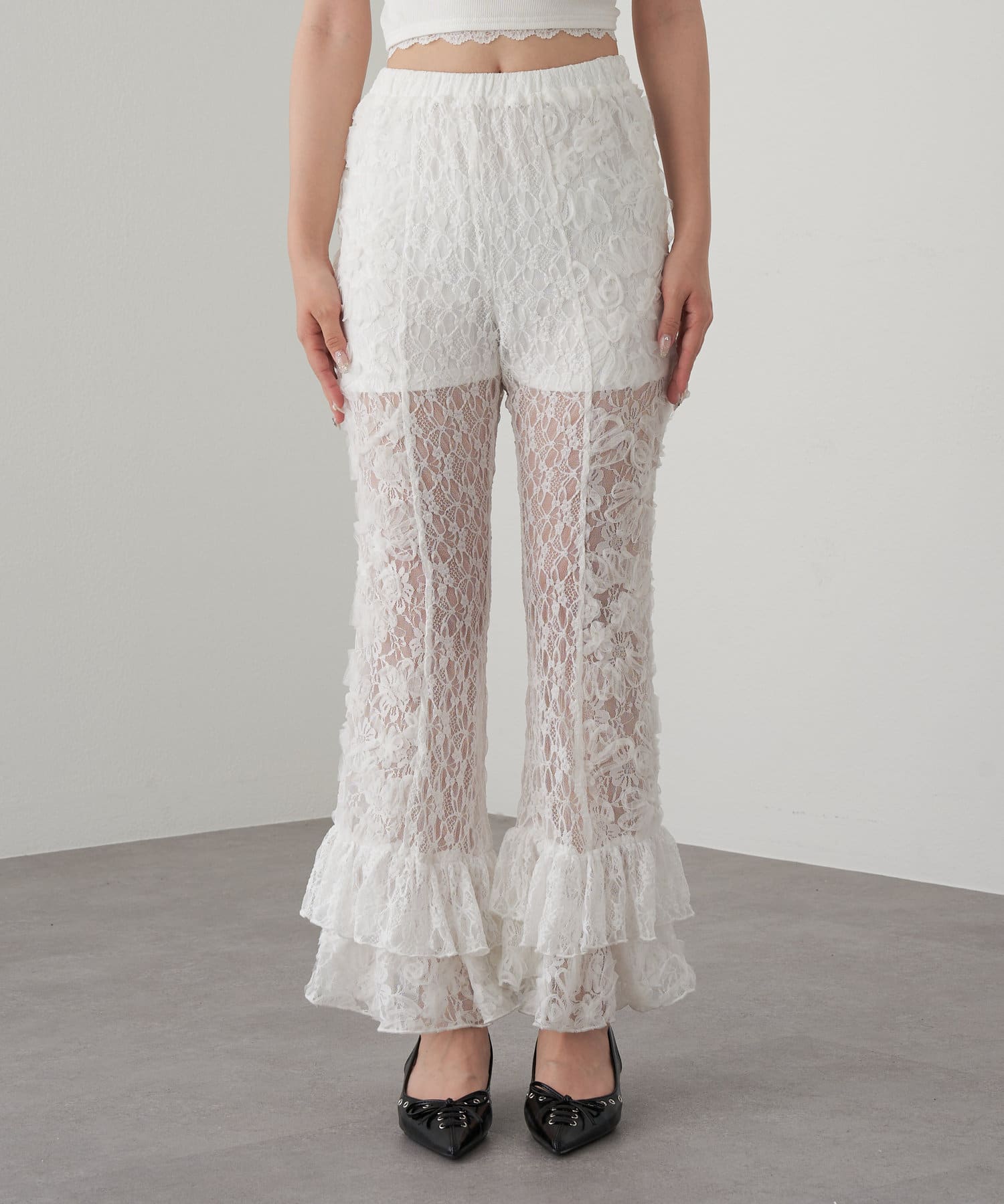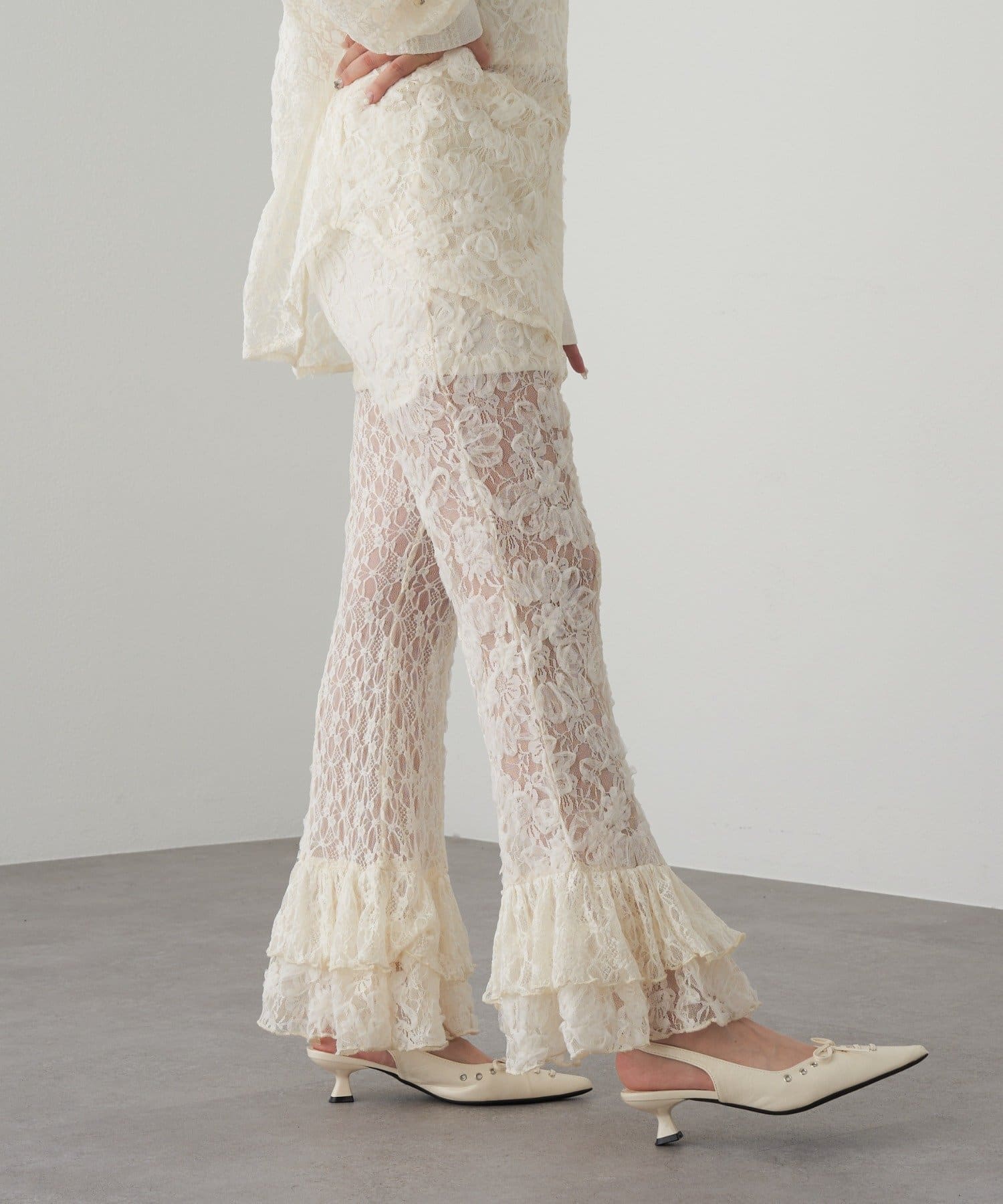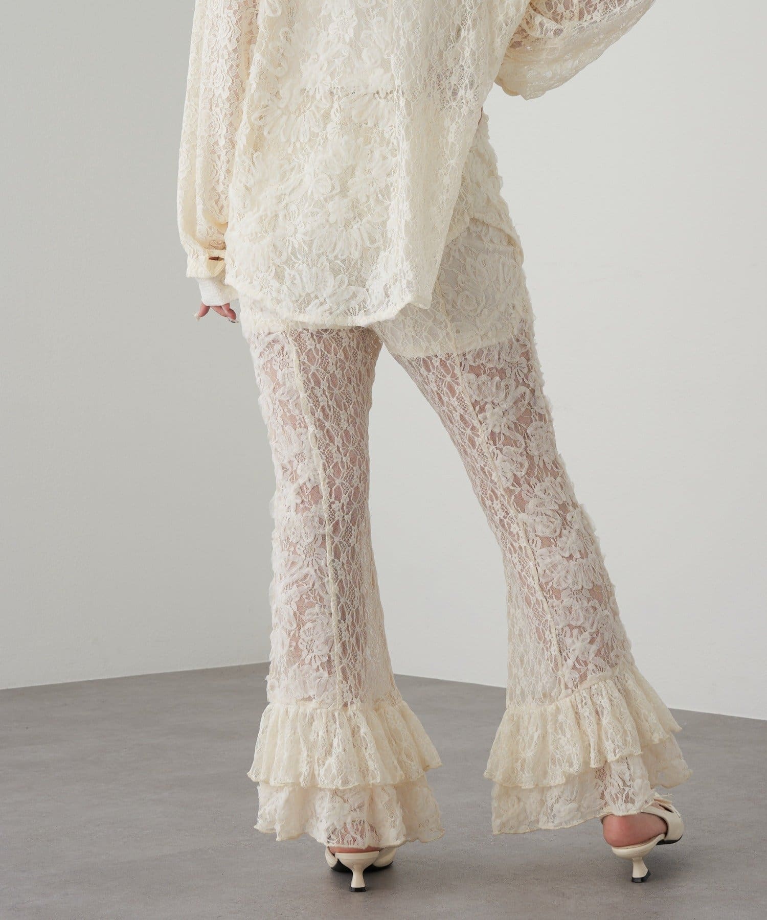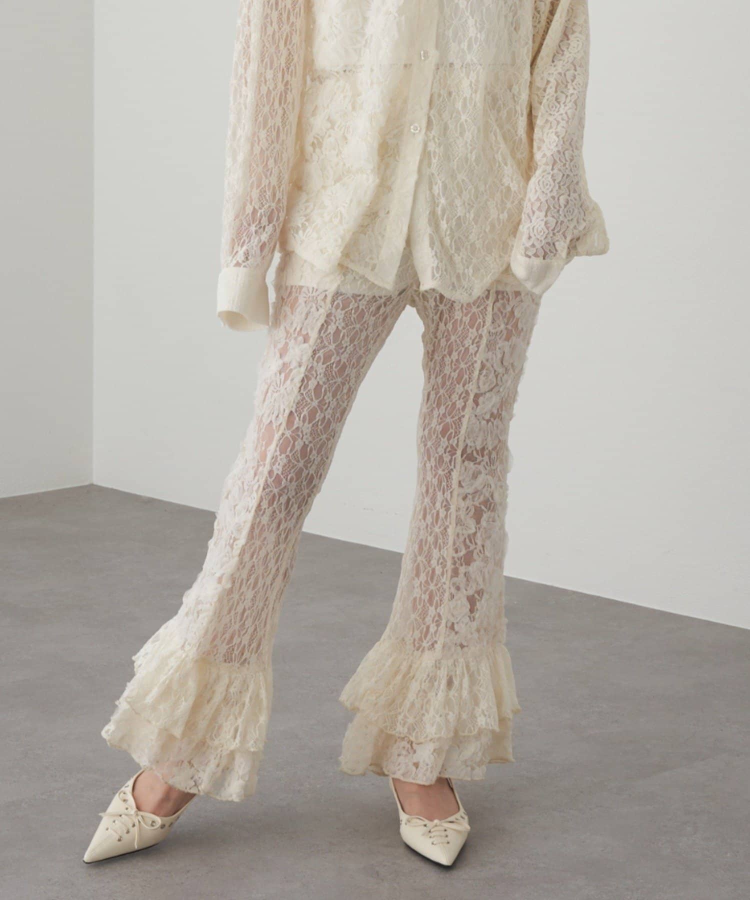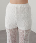 レースシャツと同素材のレースパンツ。