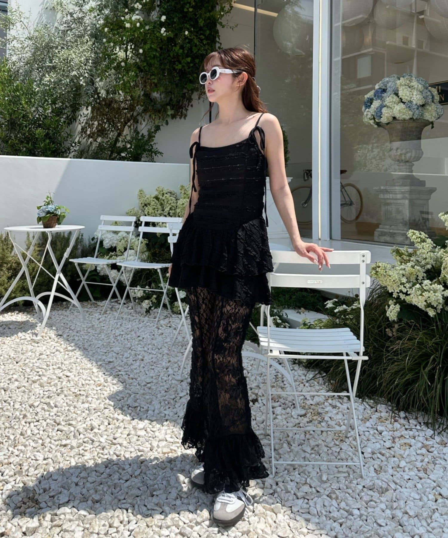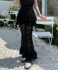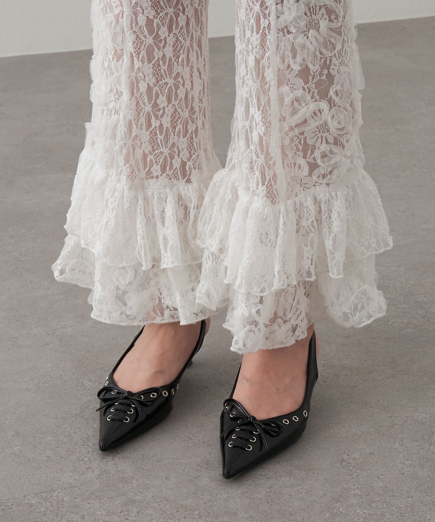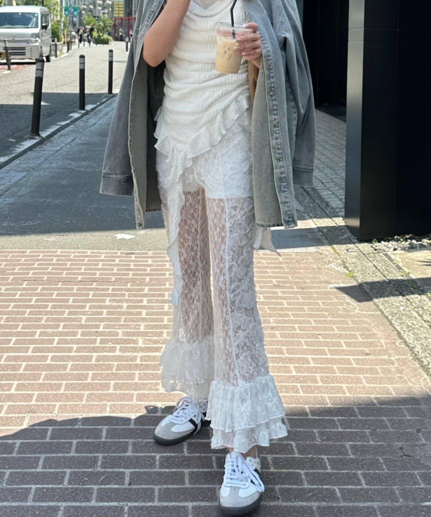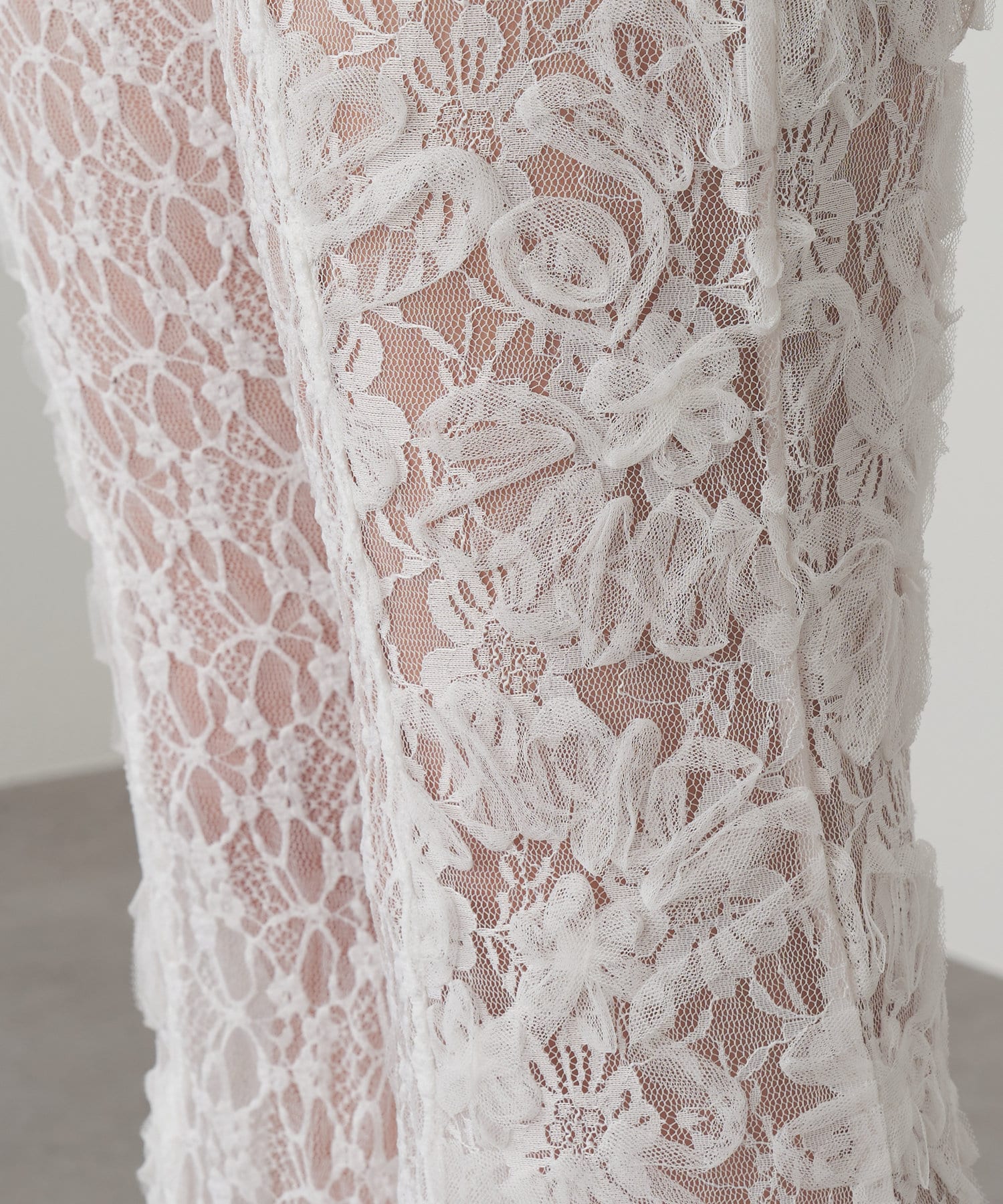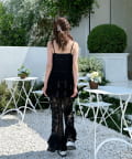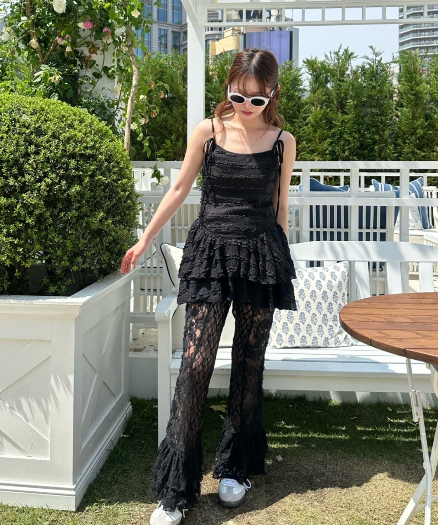 レースシャツと同素材のレースパンツ。