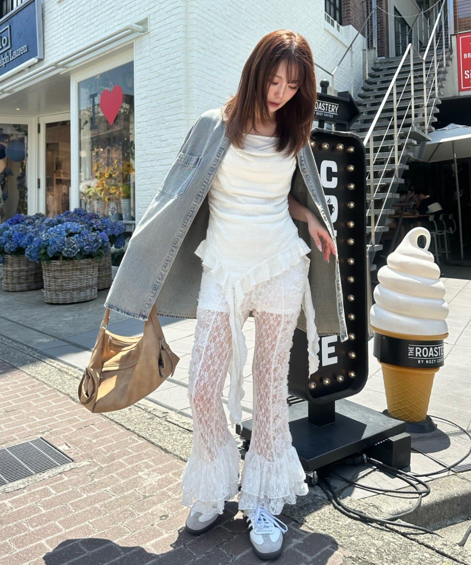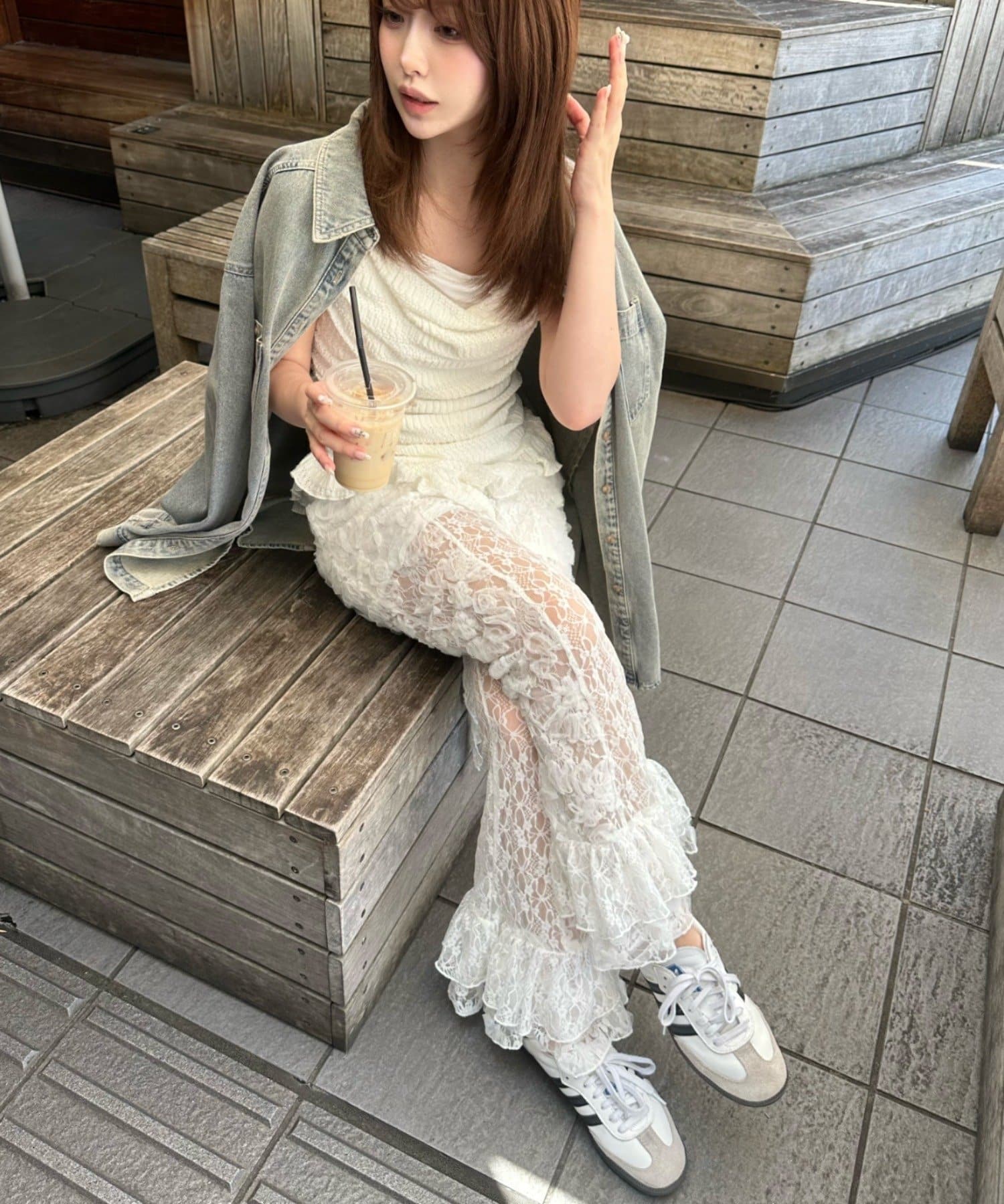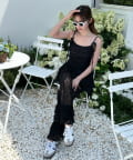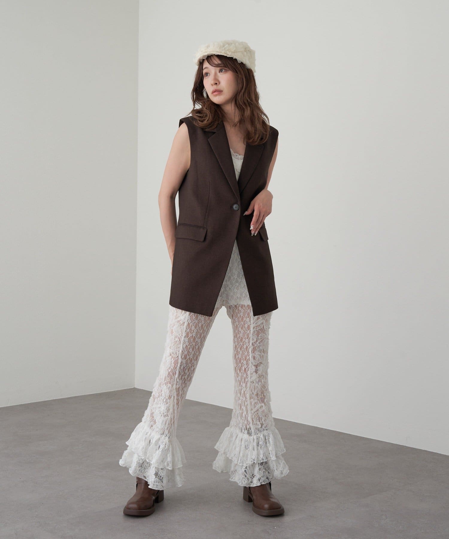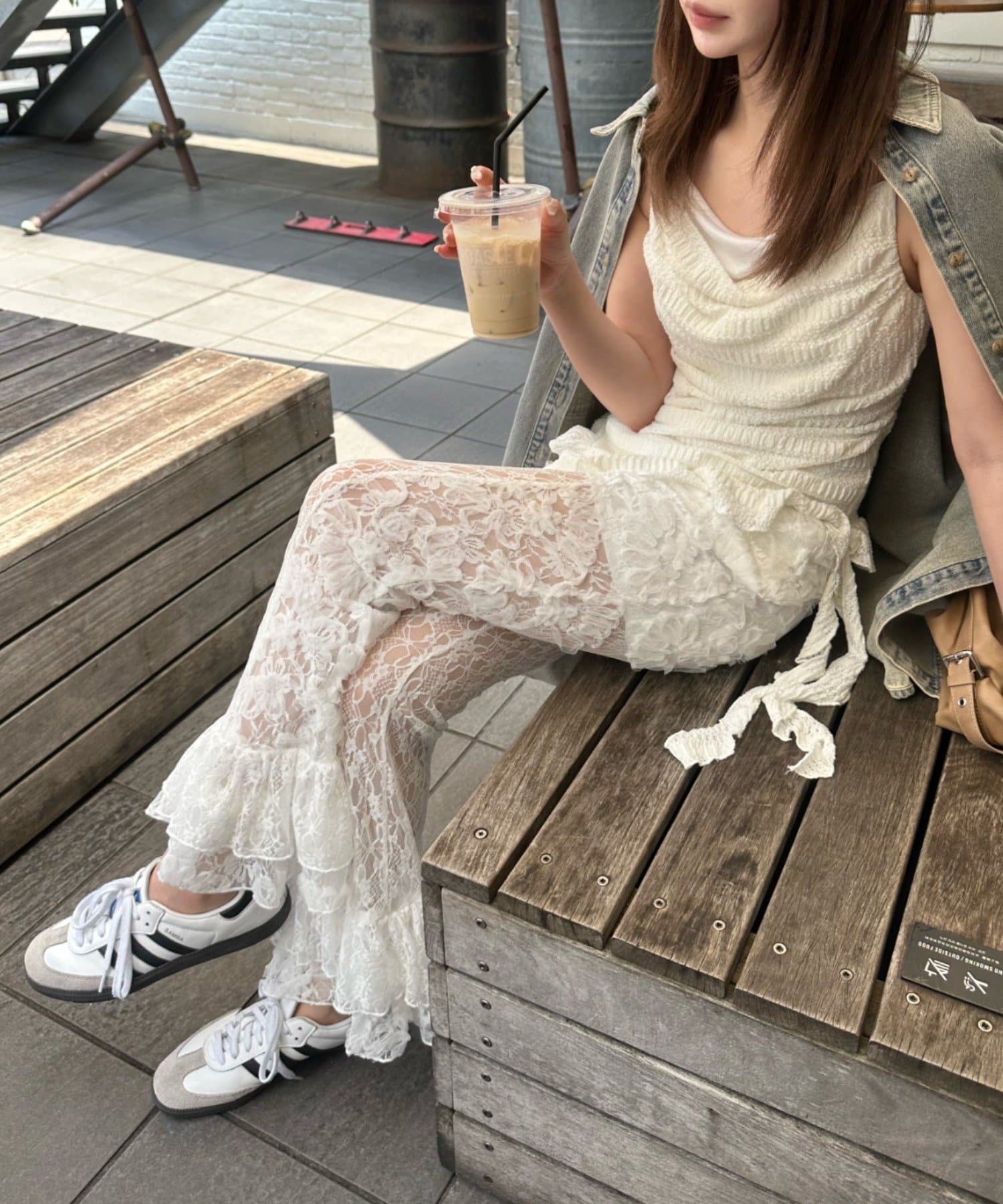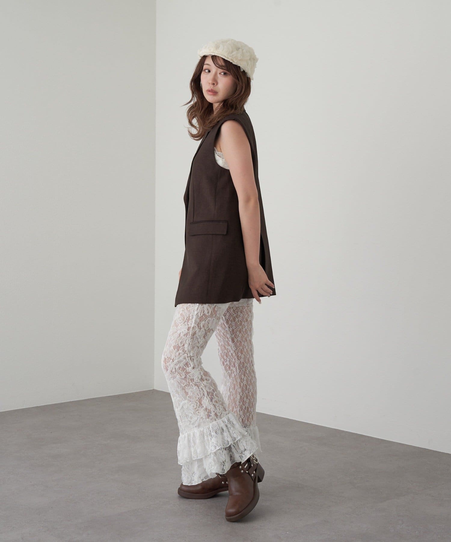 レースシャツと同素材のレースパンツ。