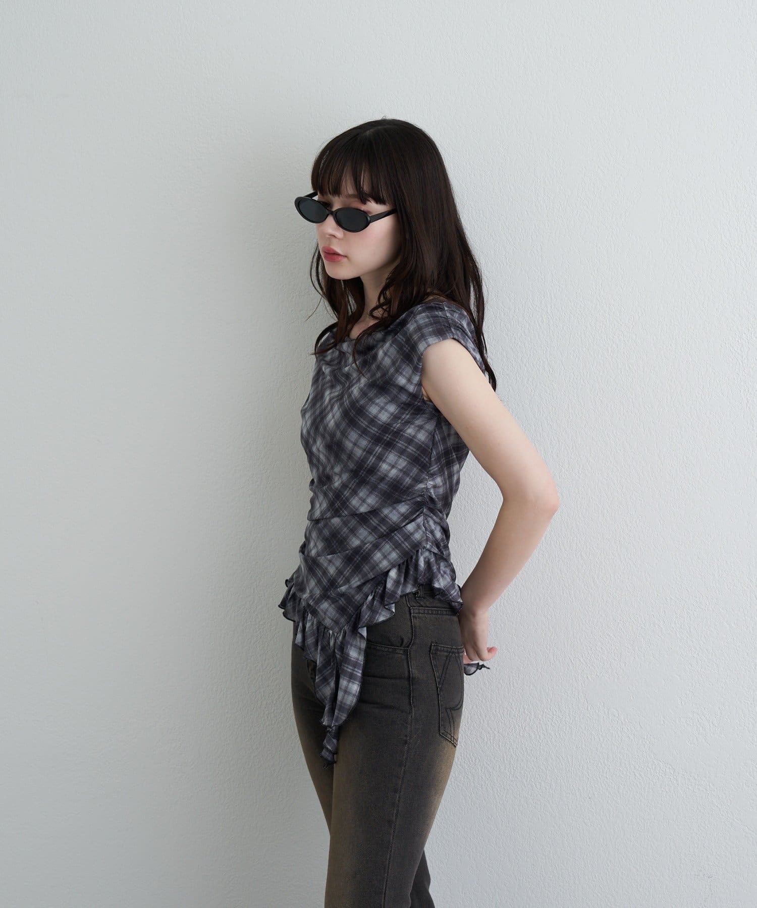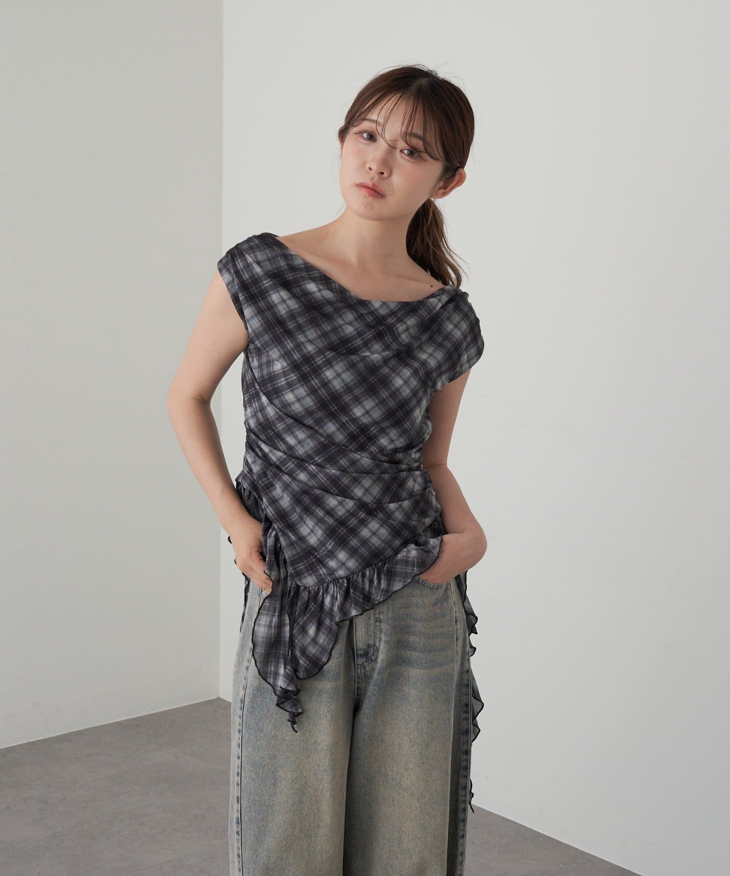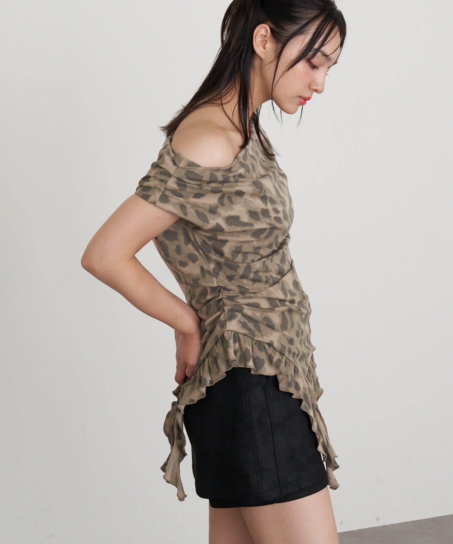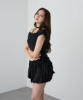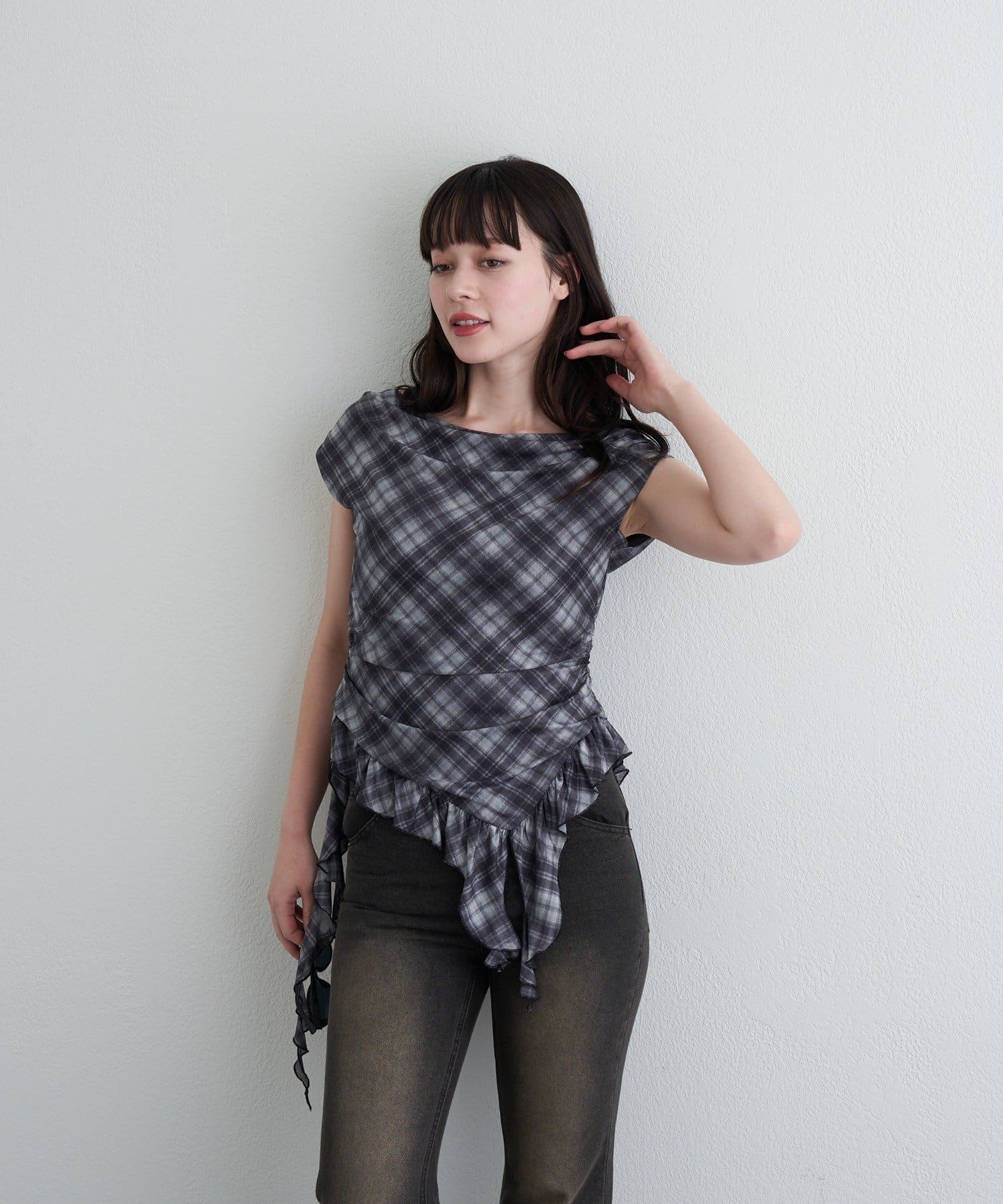 ・裾のフリルとサイドのギャザーで着瘦せ効果も抜群です。