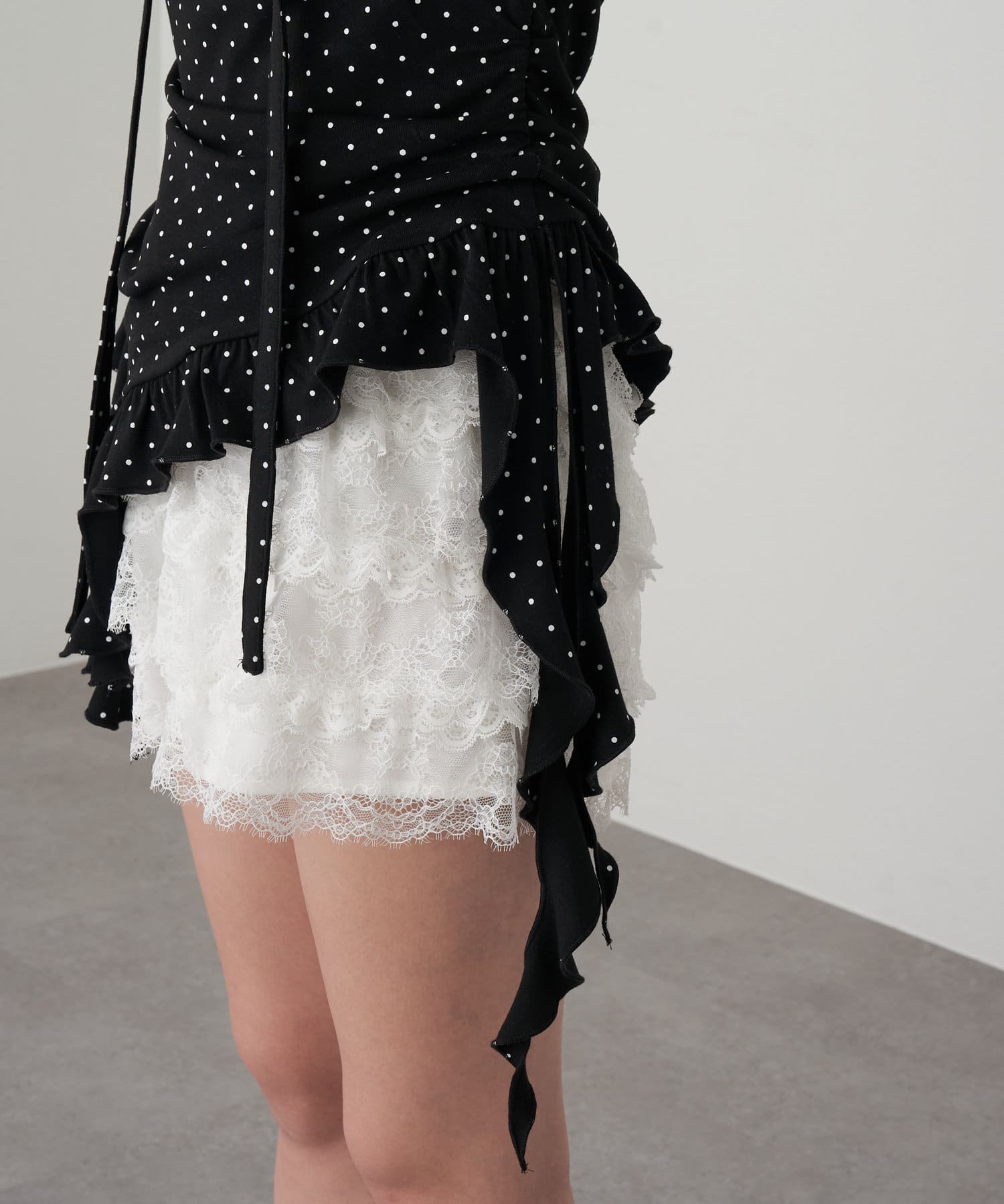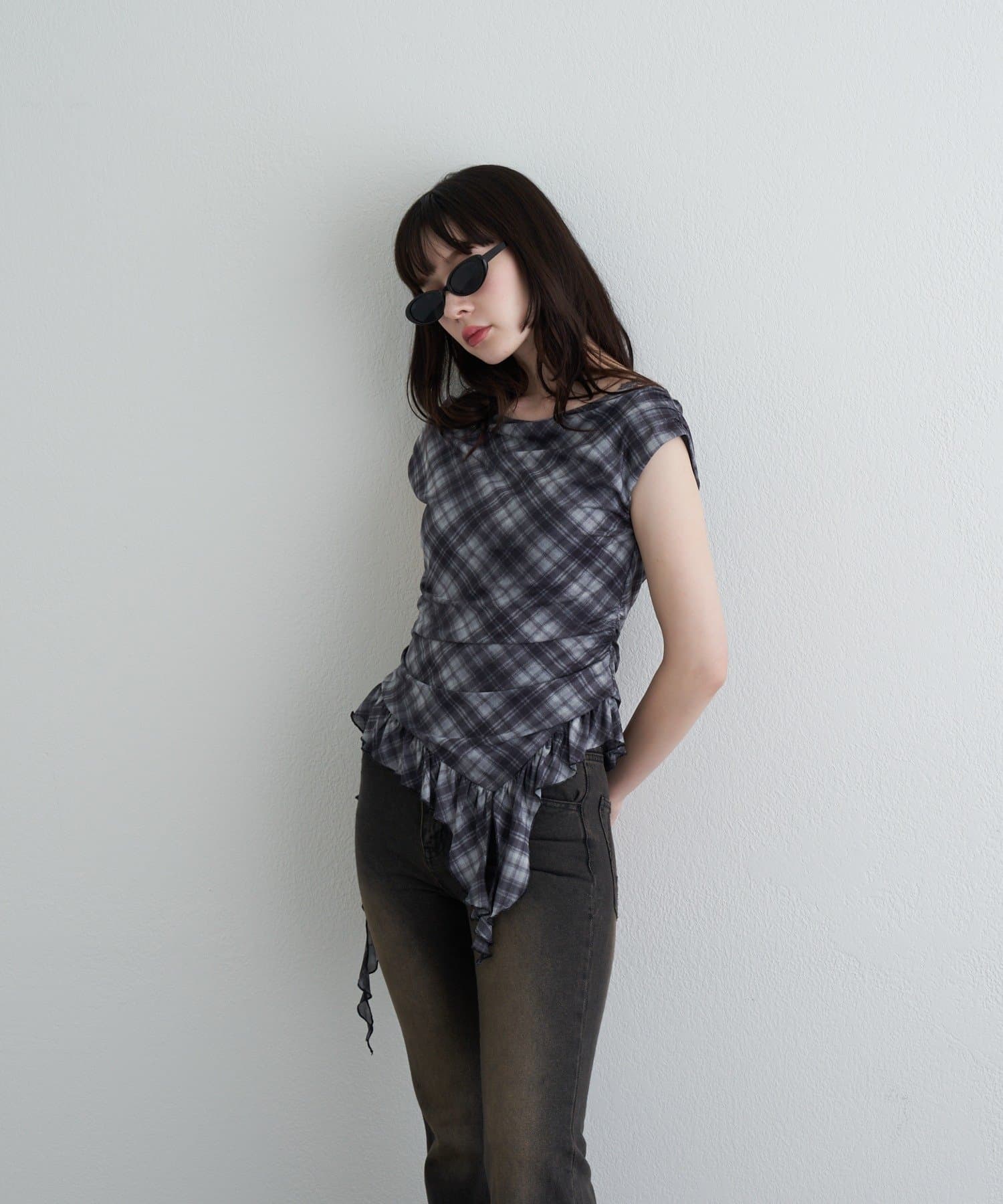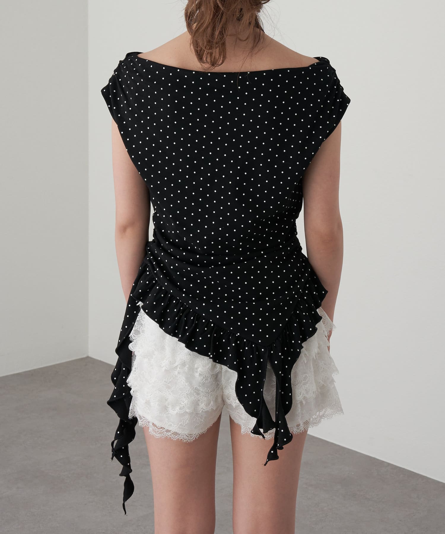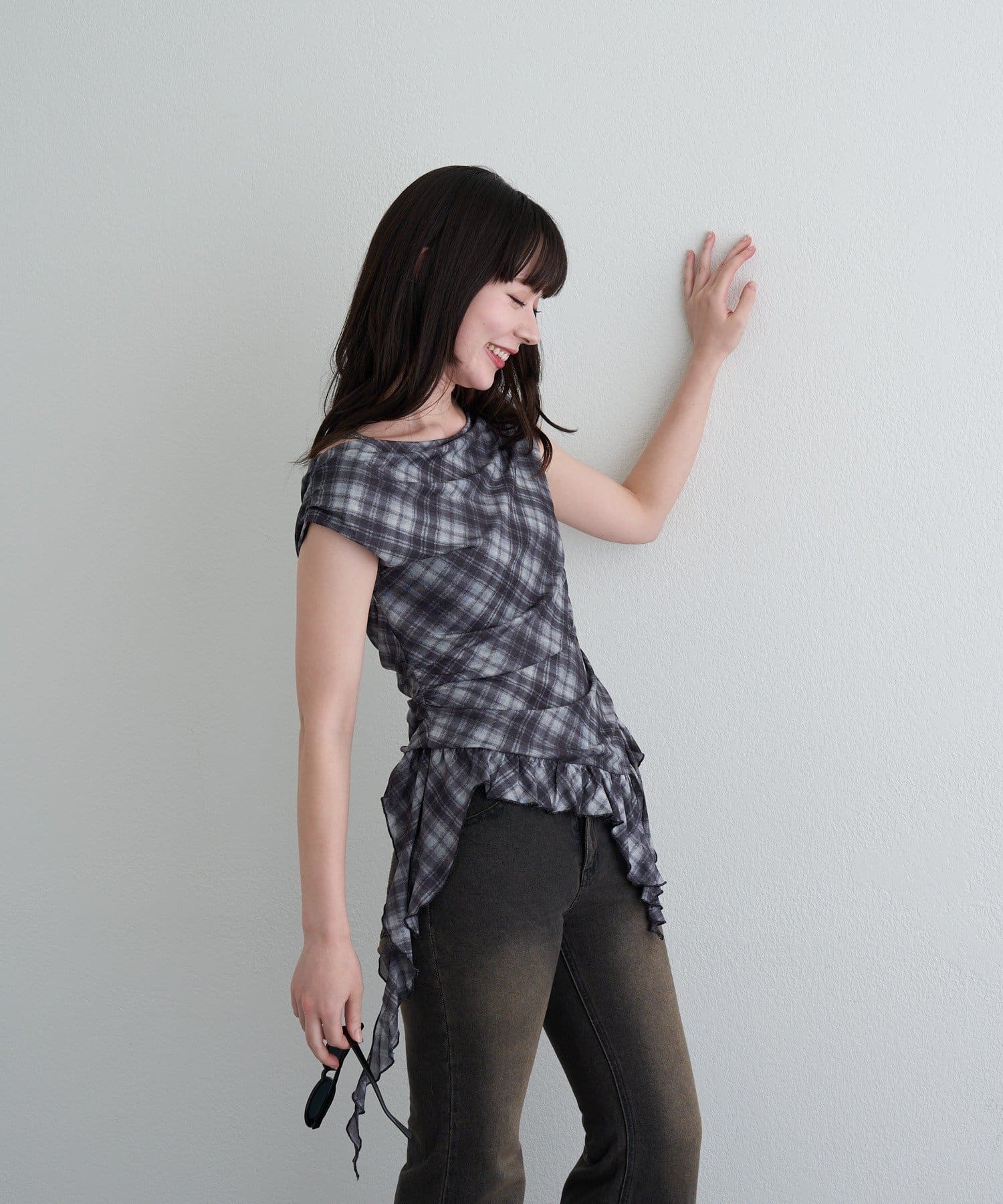 ・裾のフリルとサイドのギャザーで着瘦せ効果も抜群です。