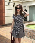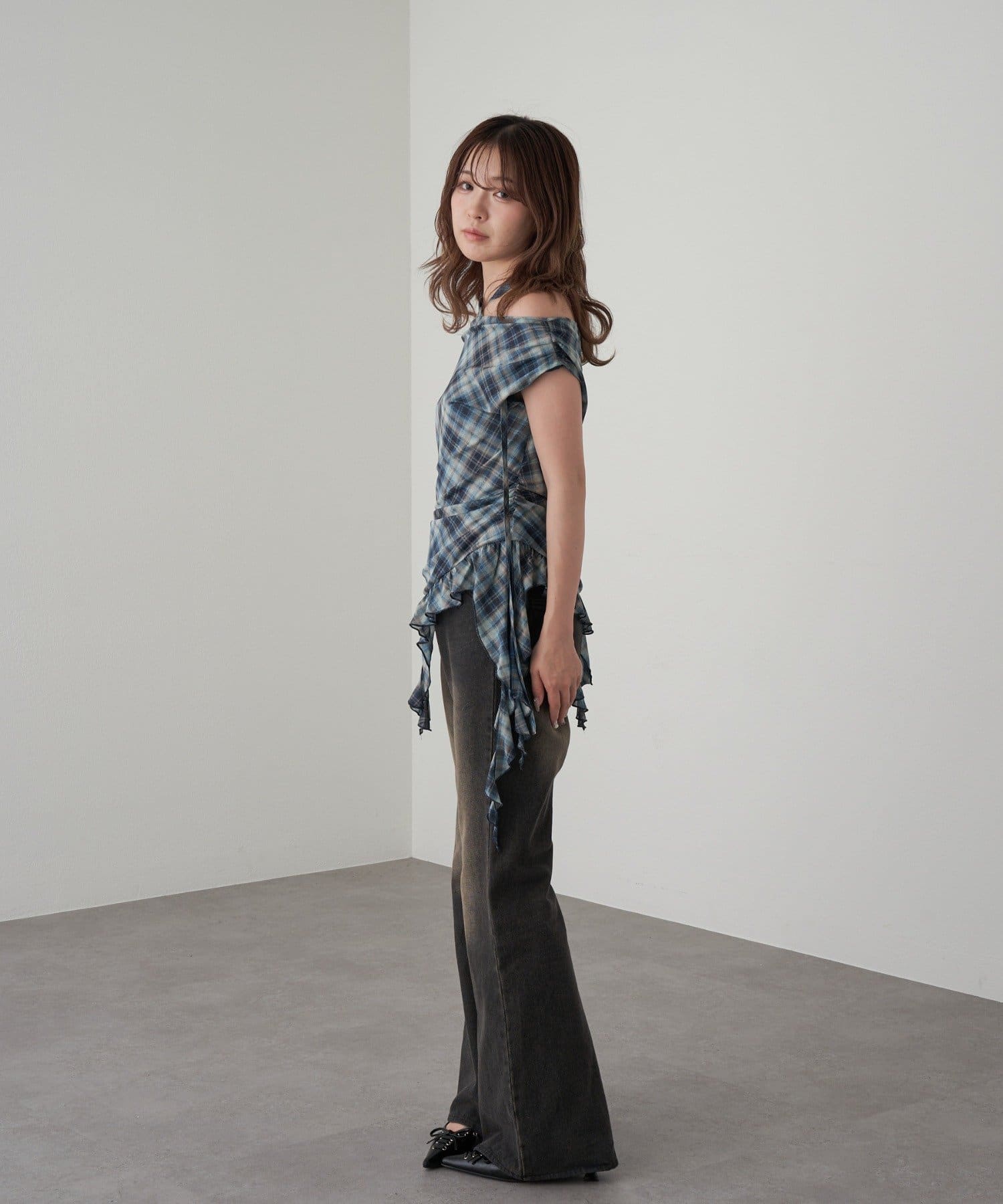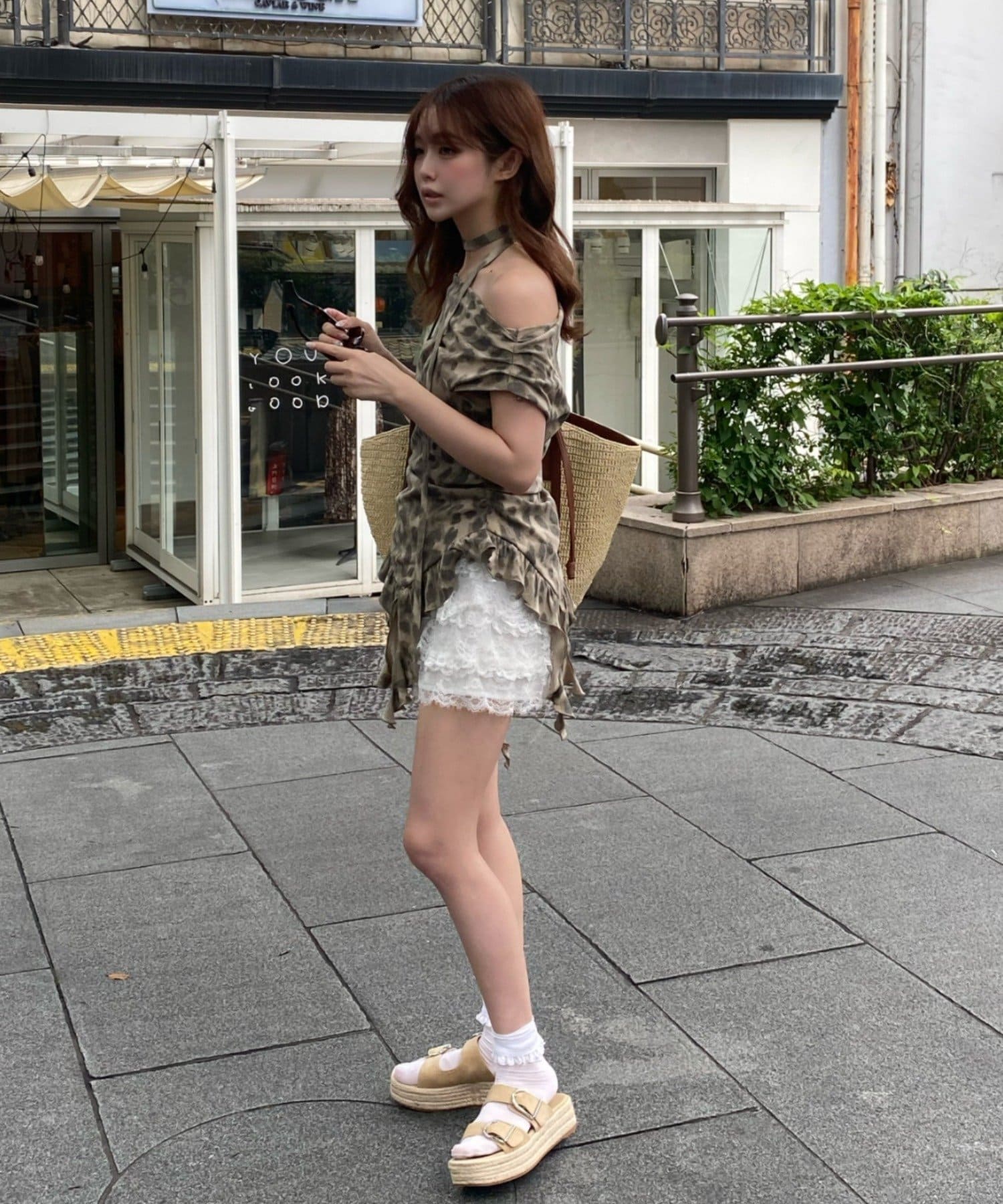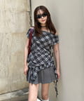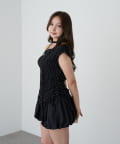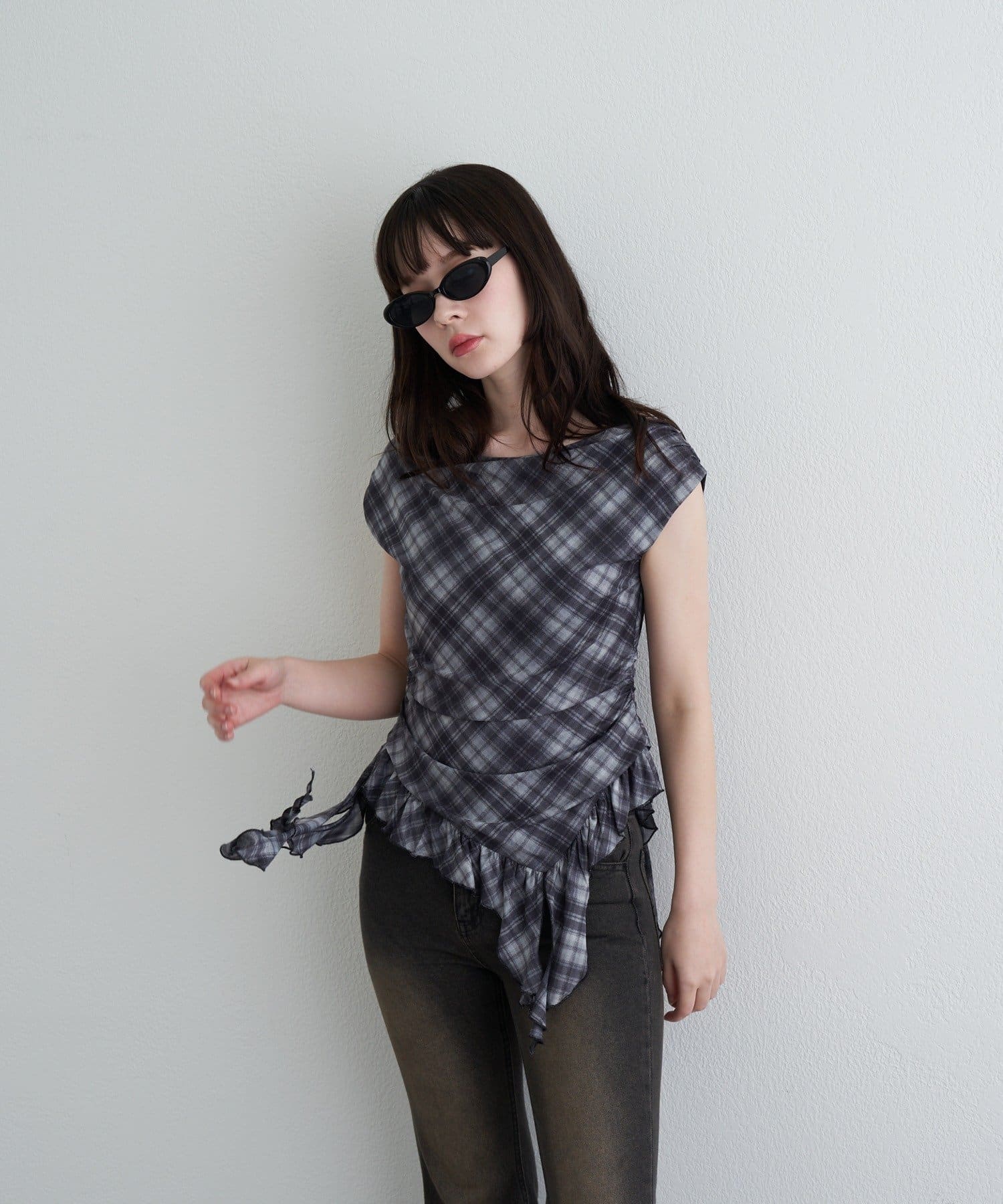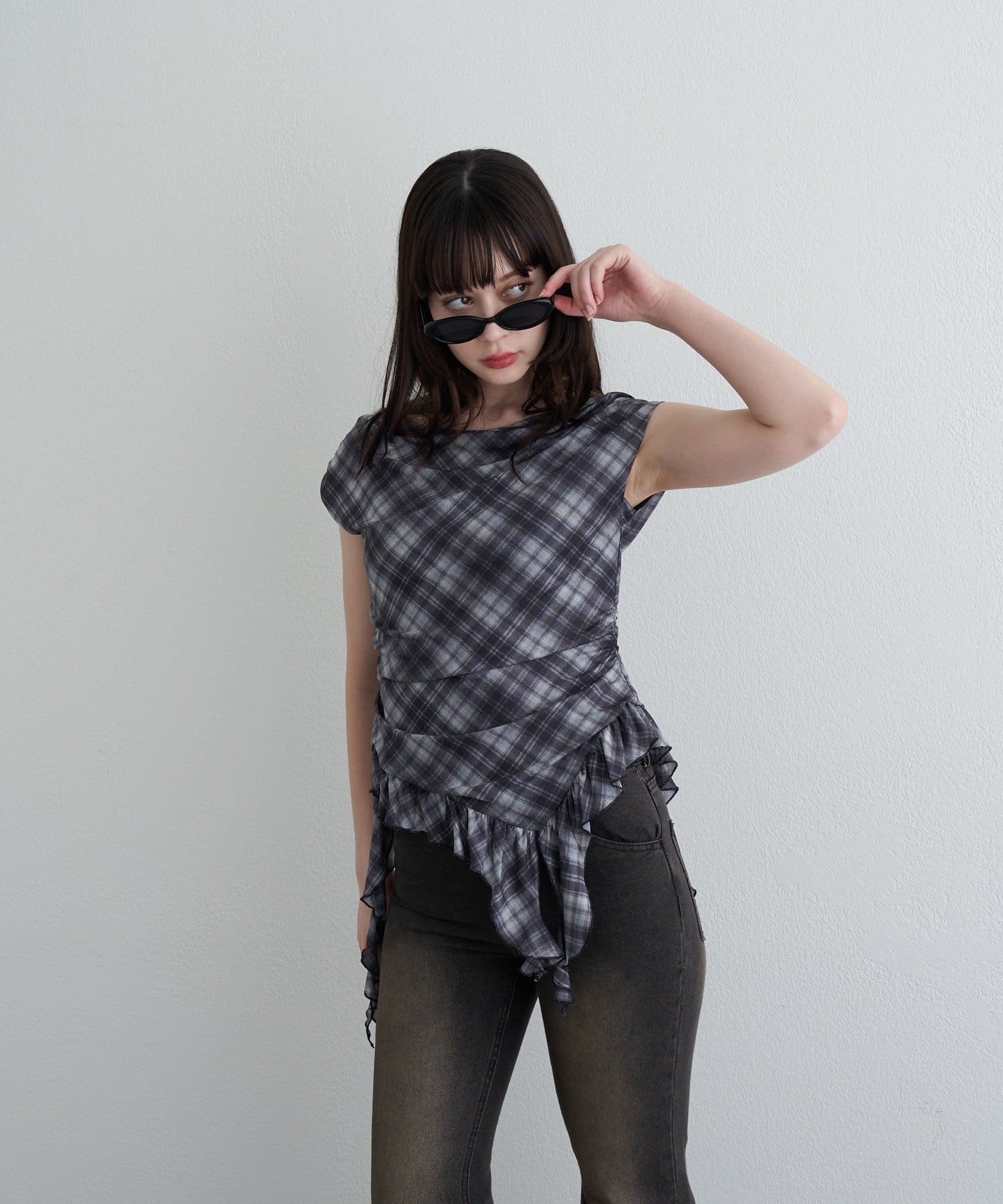 ・裾のフリルとサイドのギャザーで着瘦せ効果も抜群です。