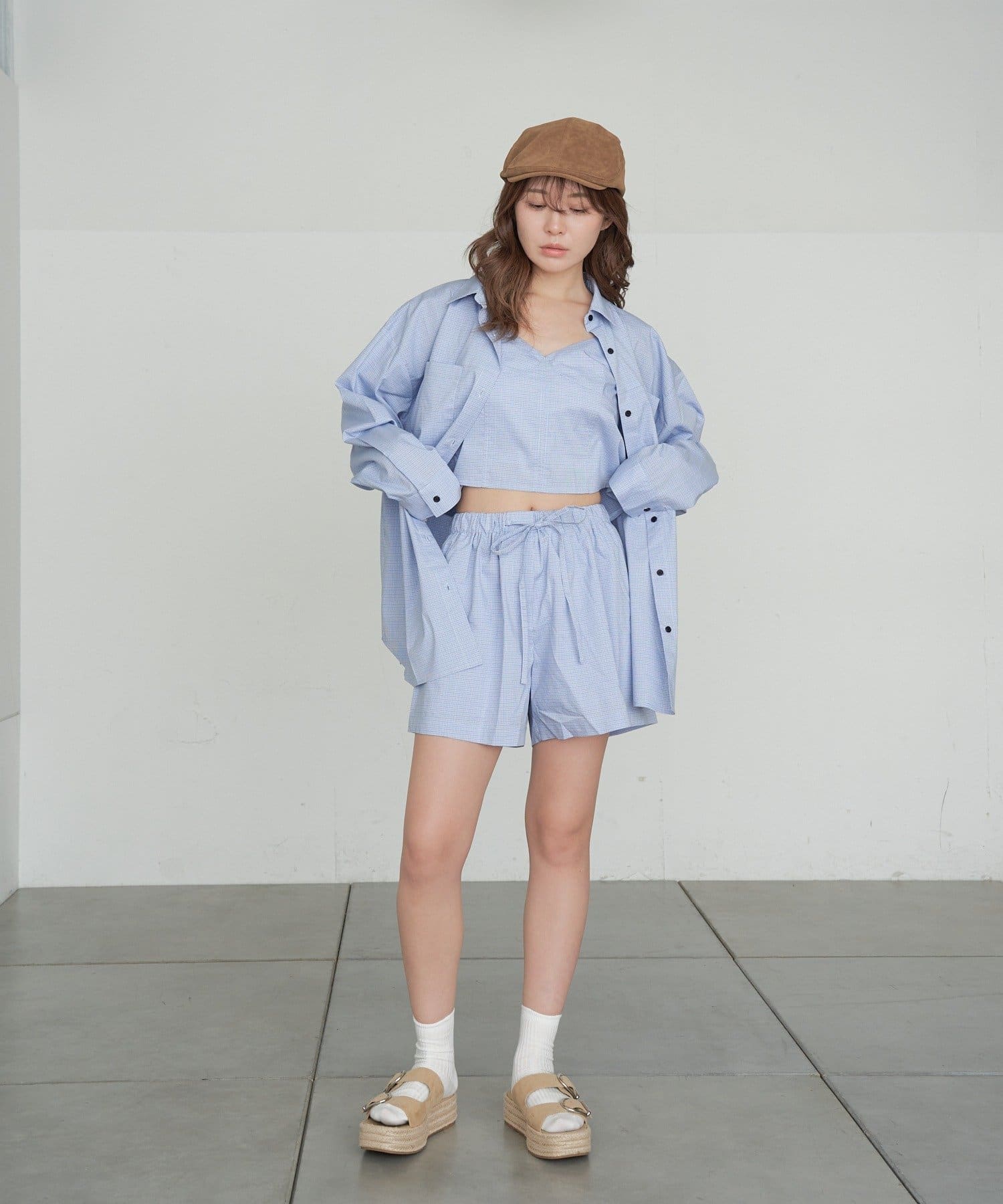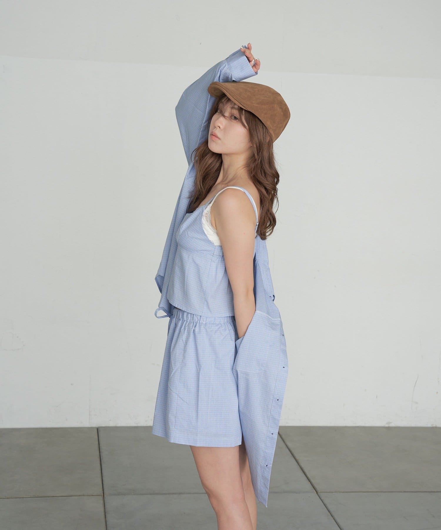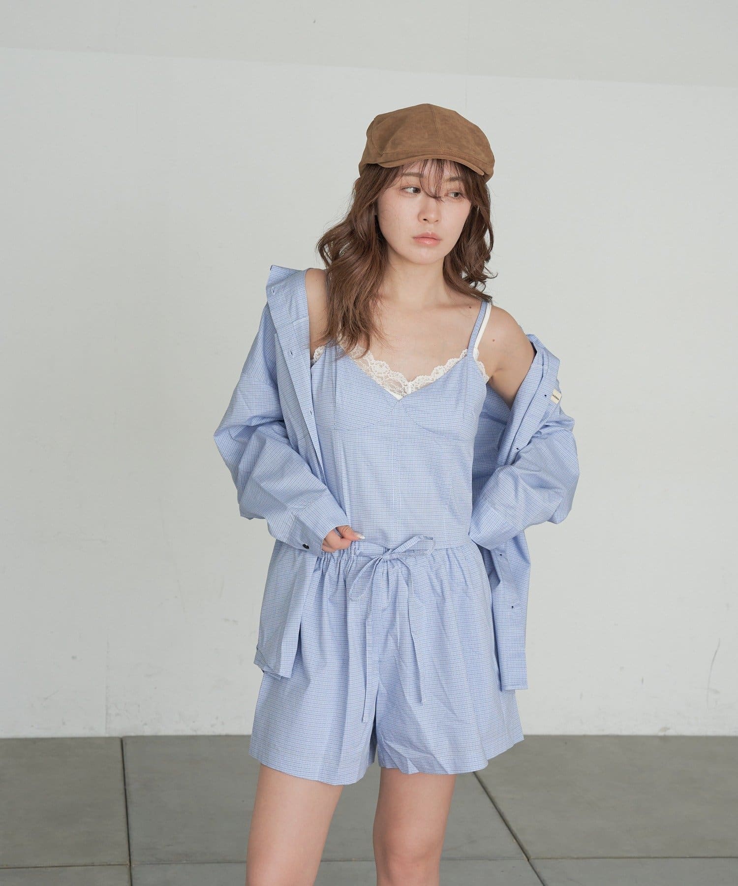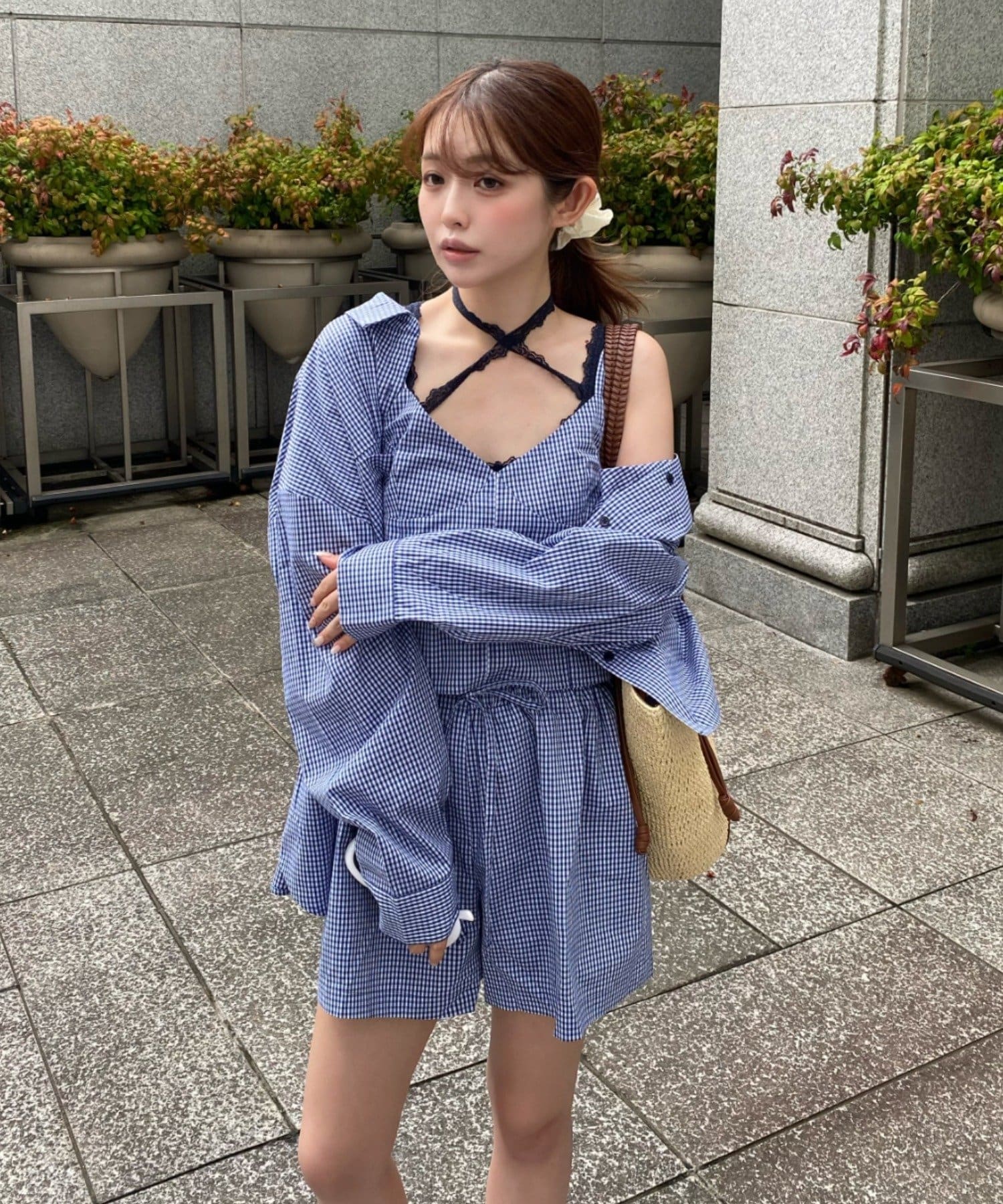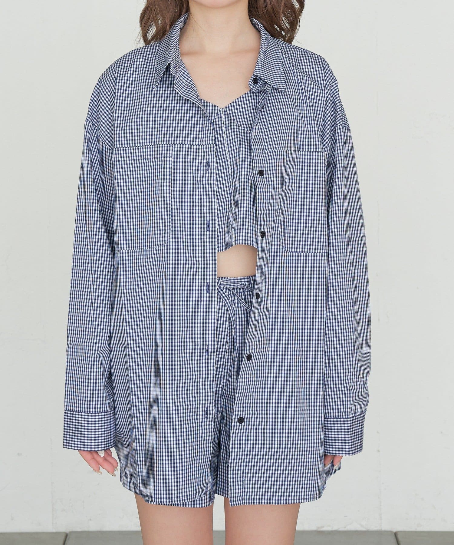 【セットアップ/3点セット】ルーズチェックシャツフリルキャミSET