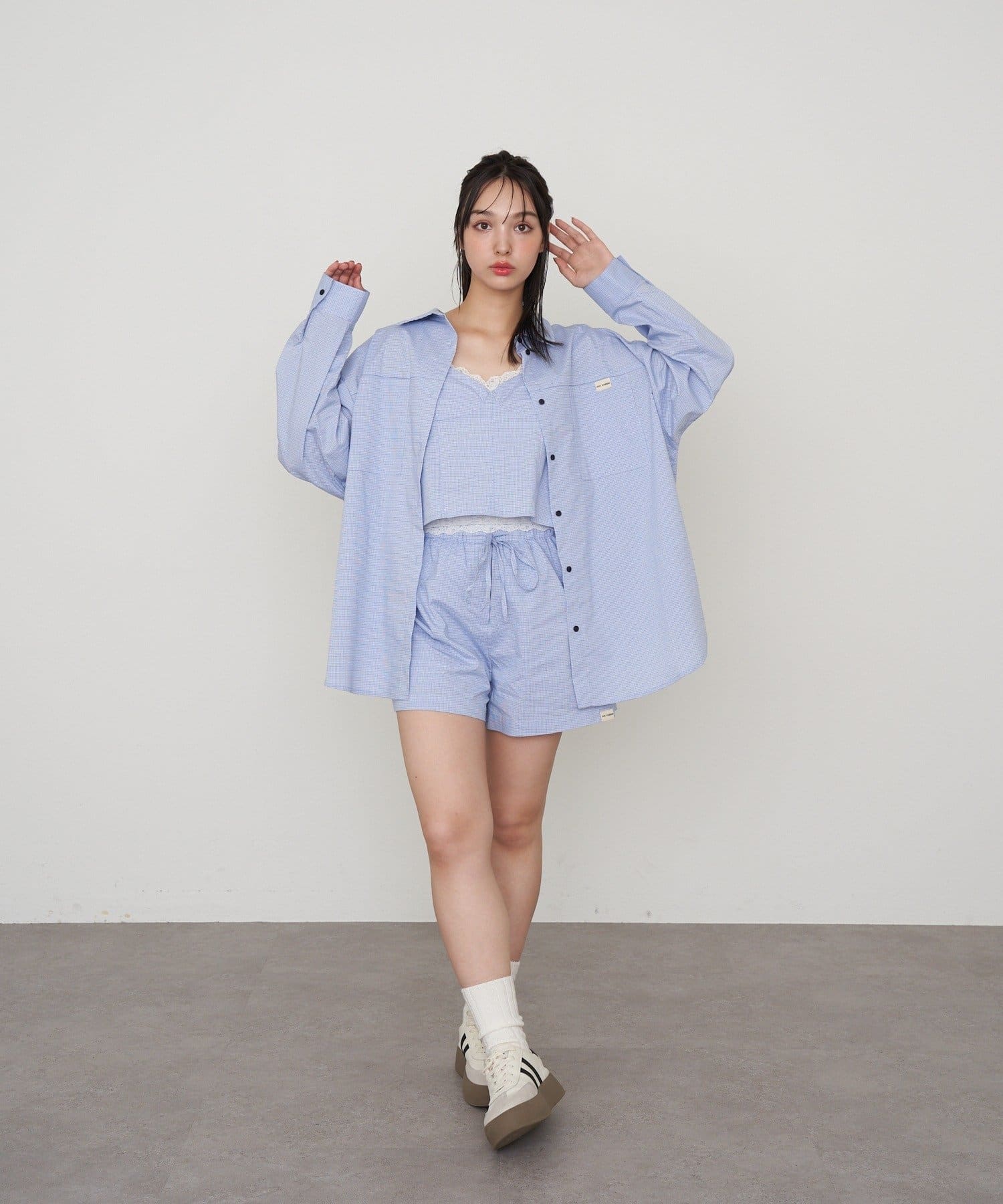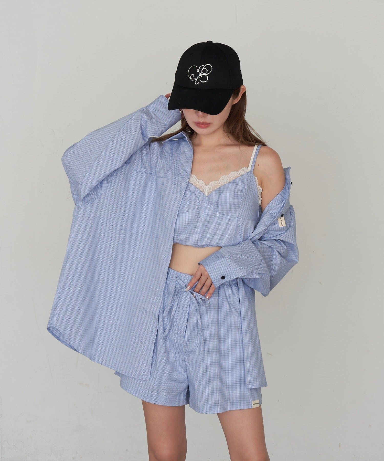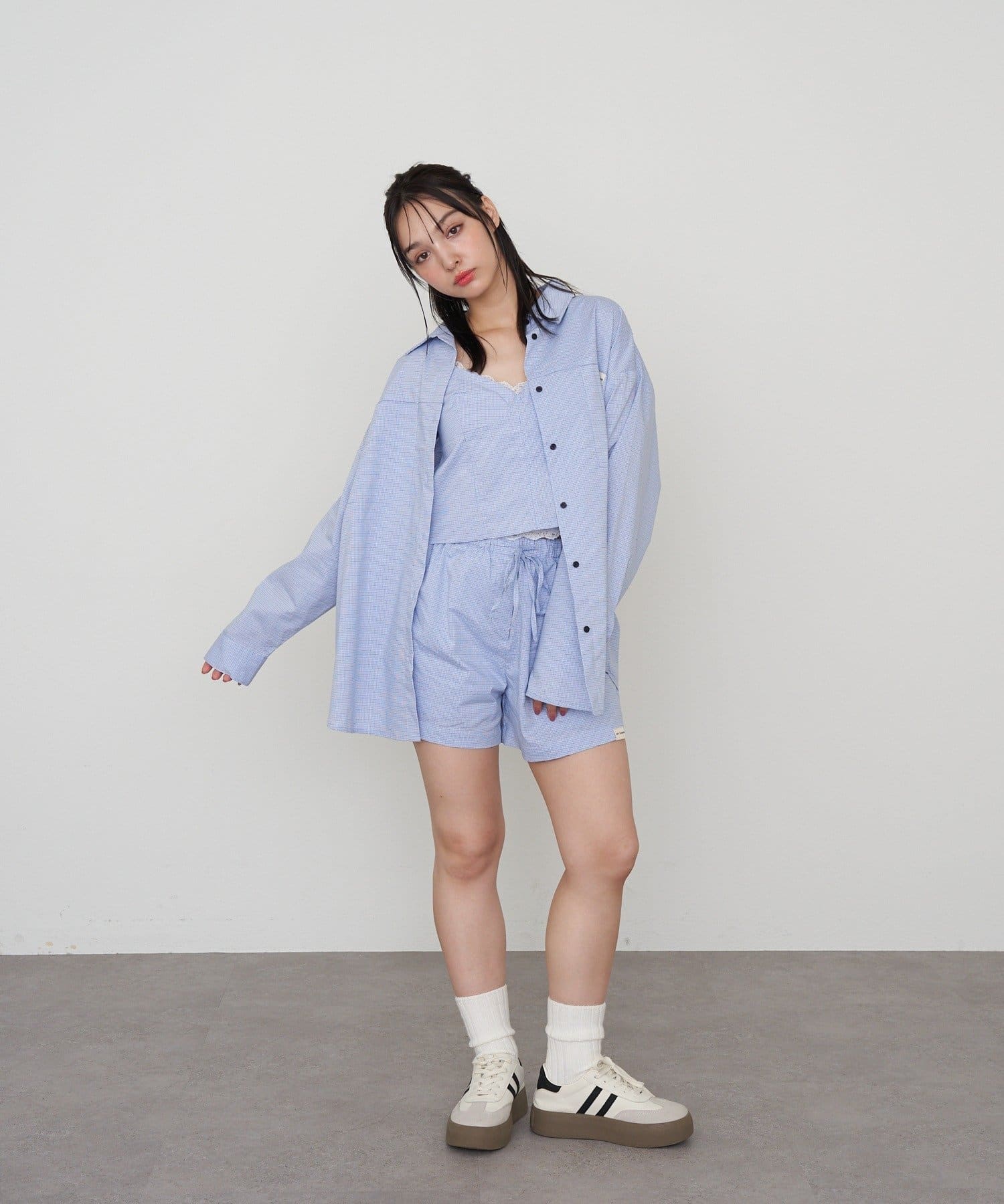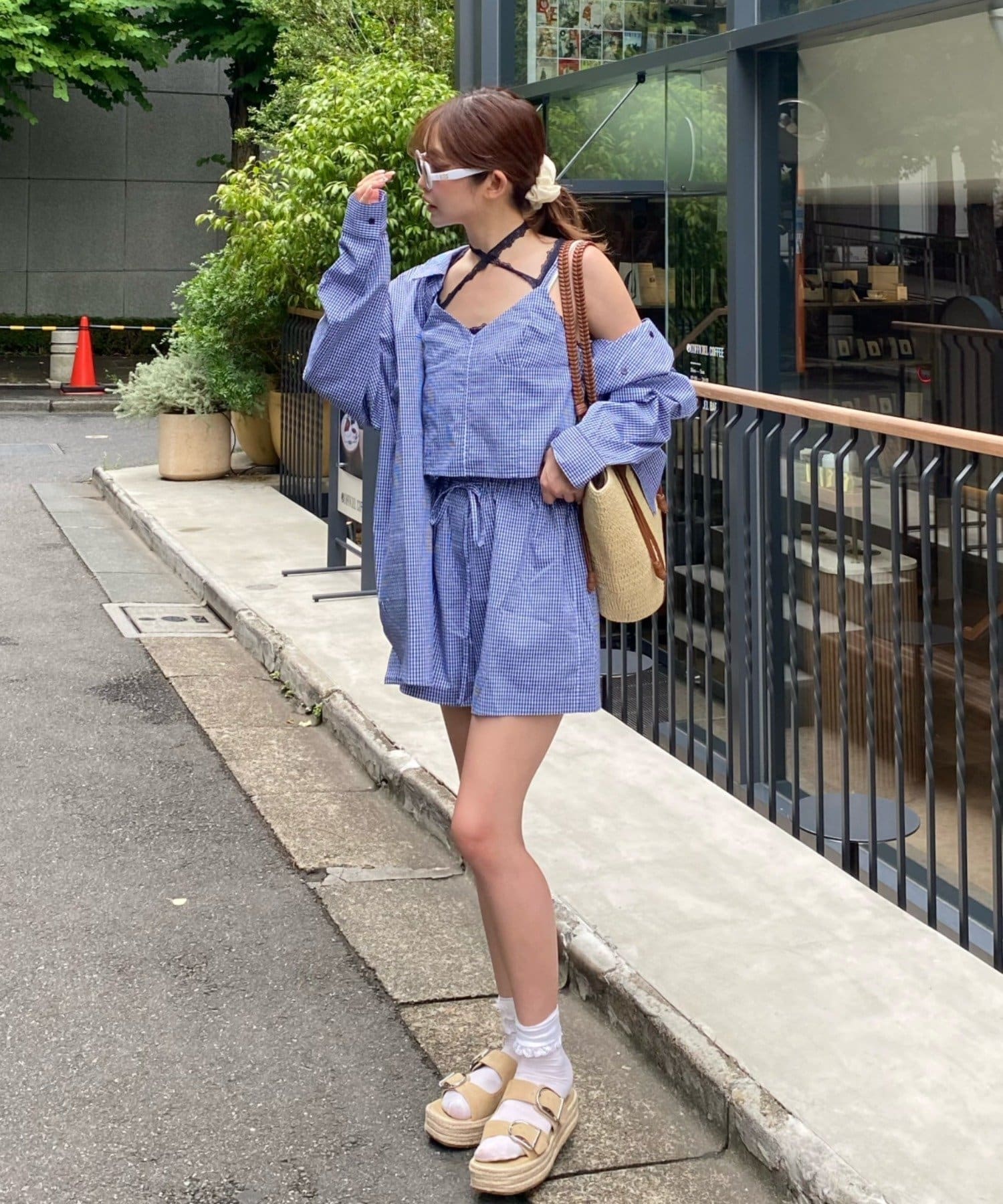 【セットアップ/3点セット】ルーズチェックシャツフリルキャミSET