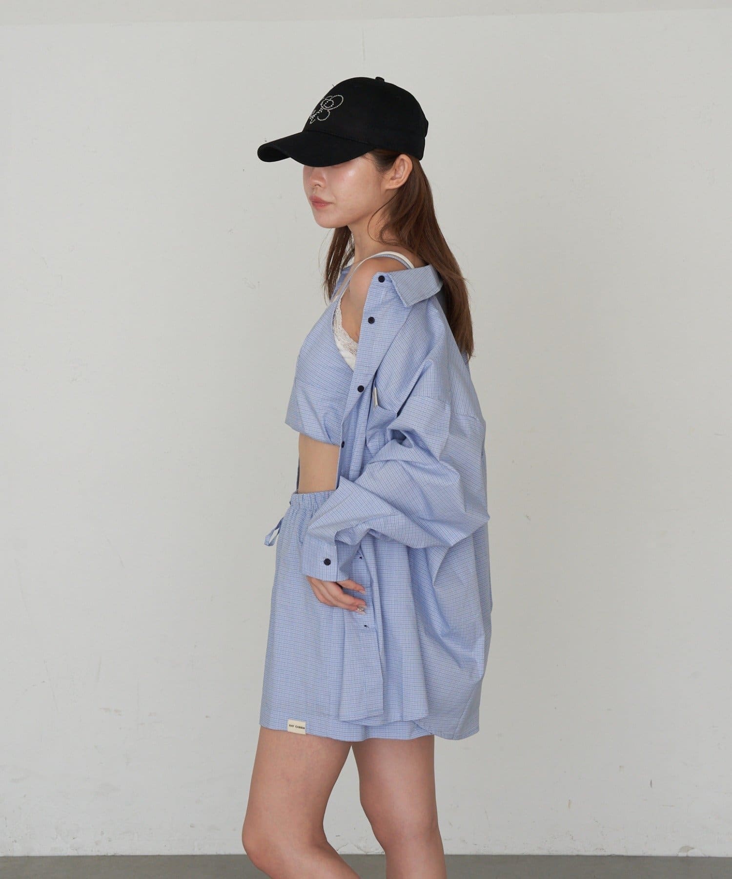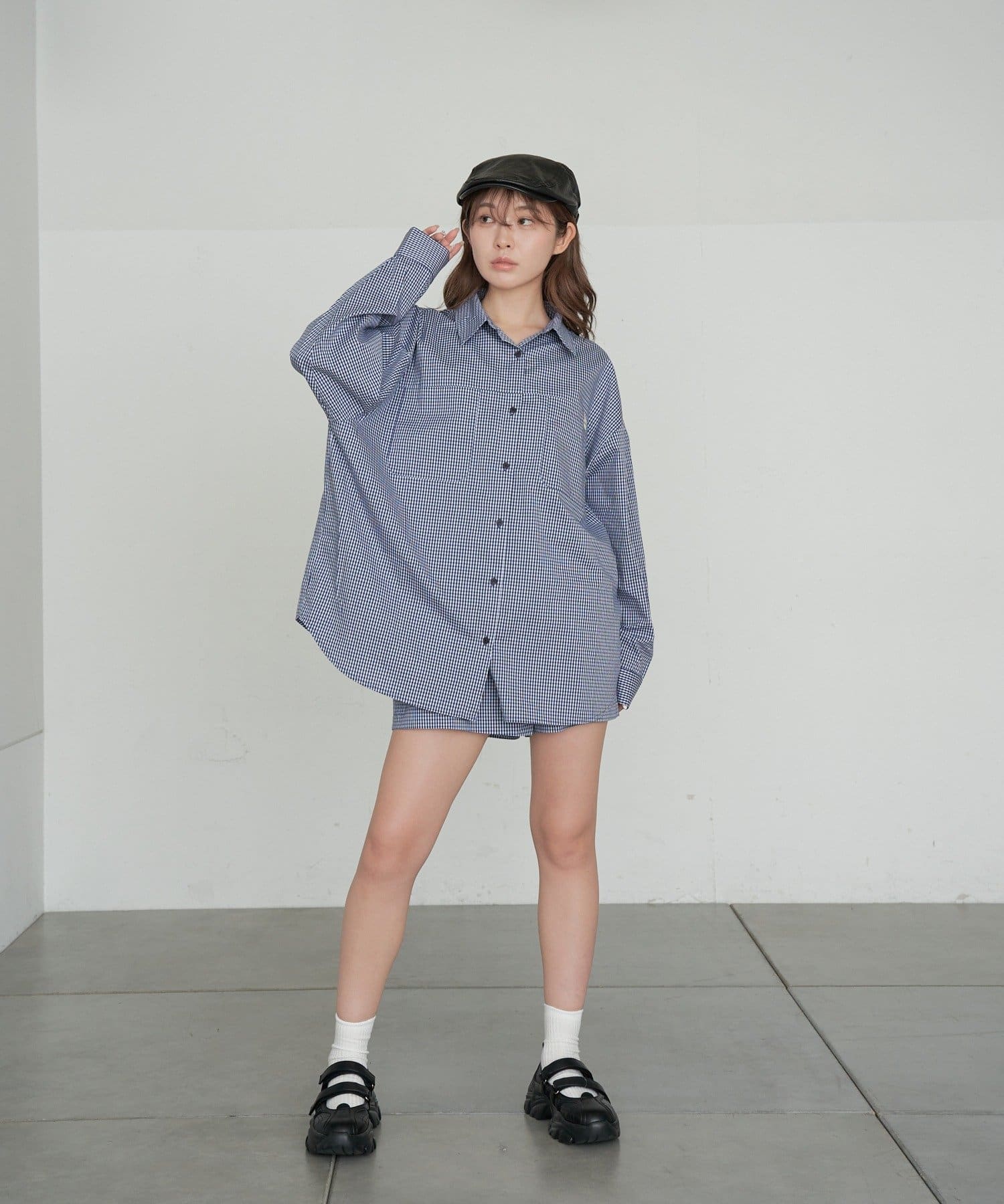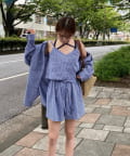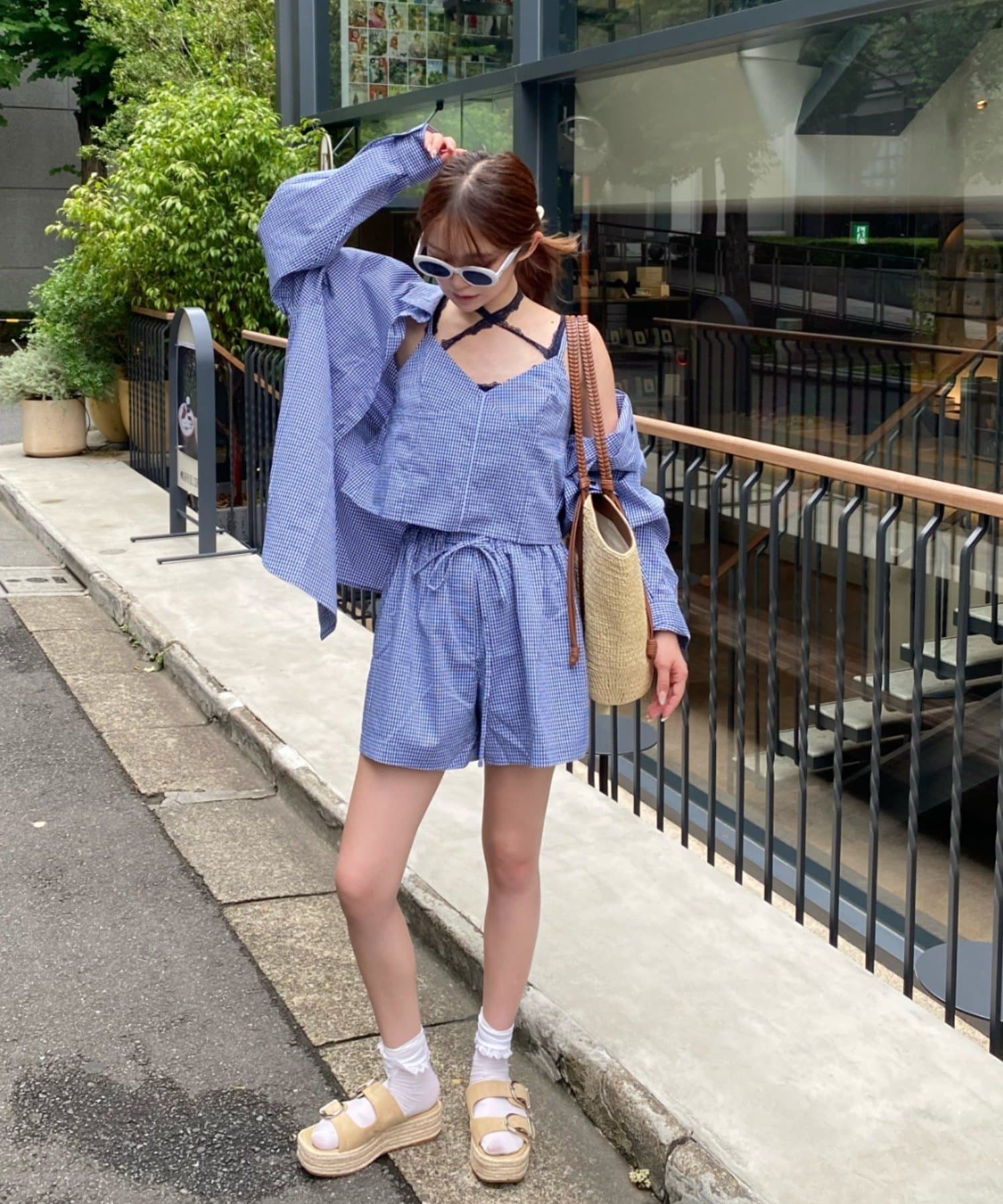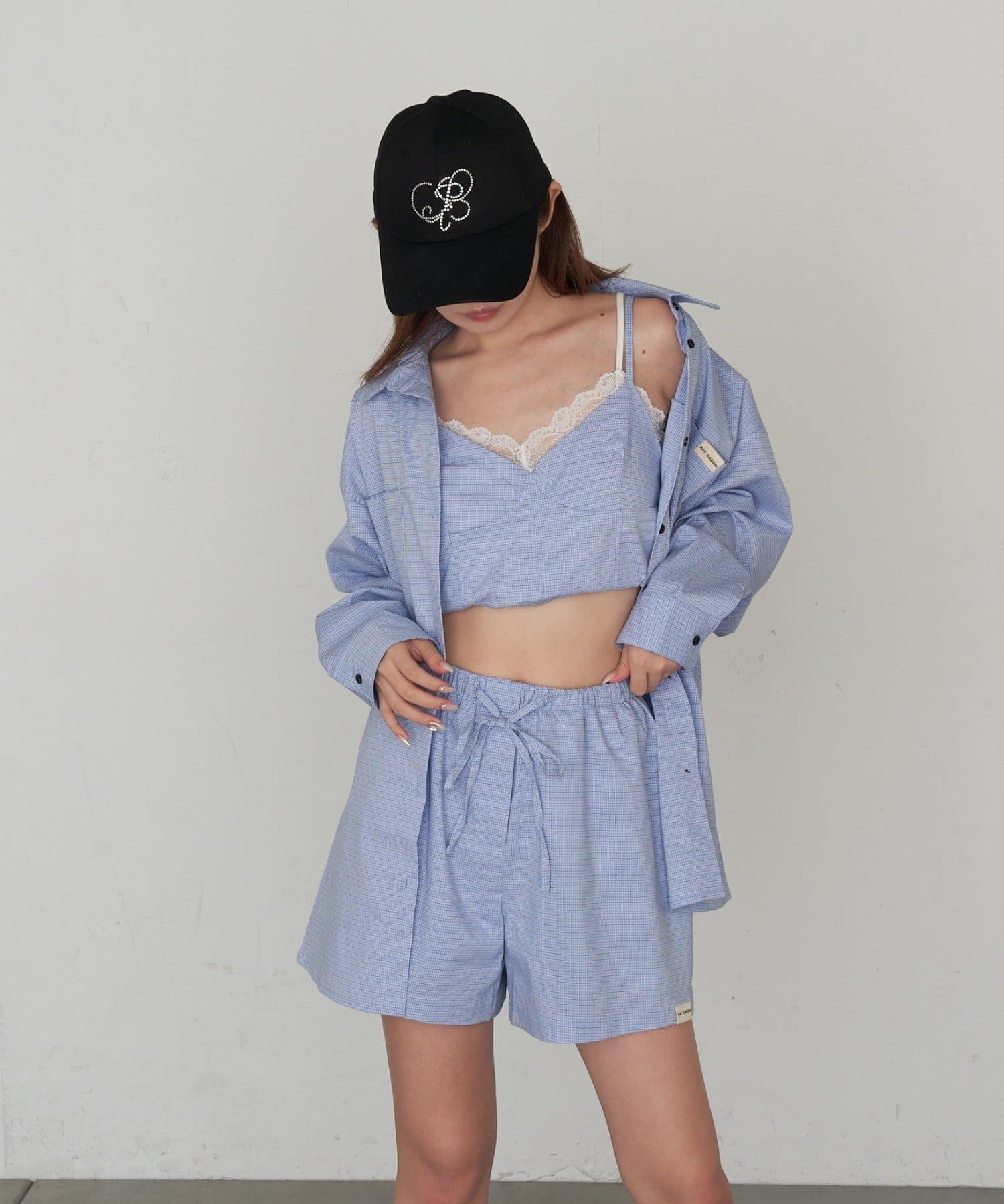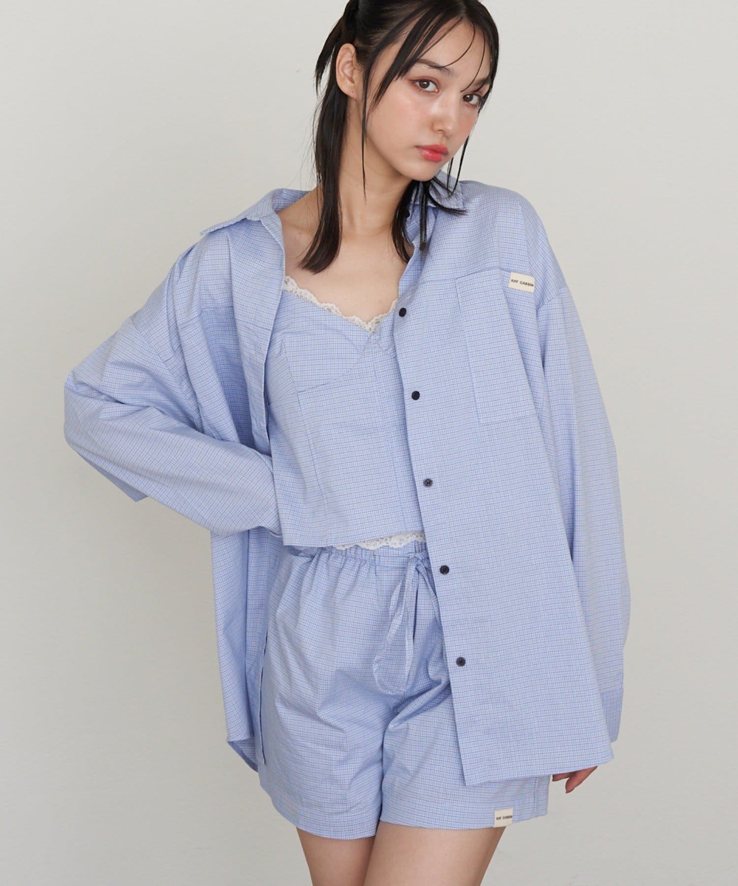 【セットアップ/3点セット】ルーズチェックシャツフリルキャミSET