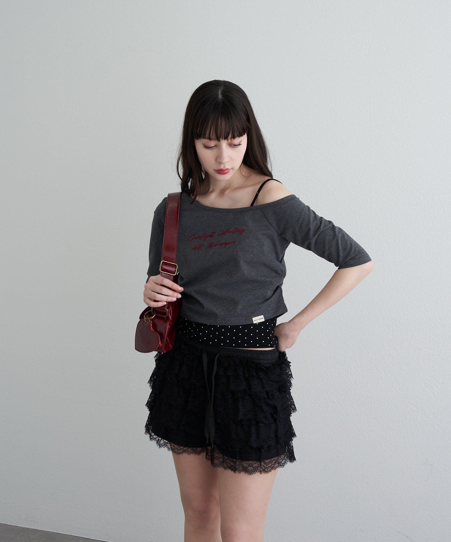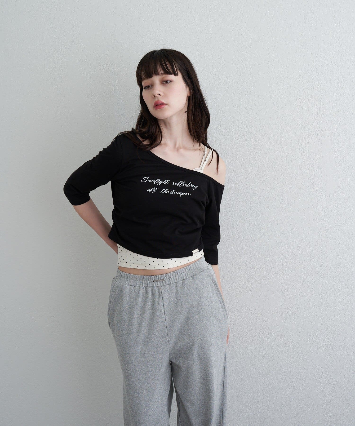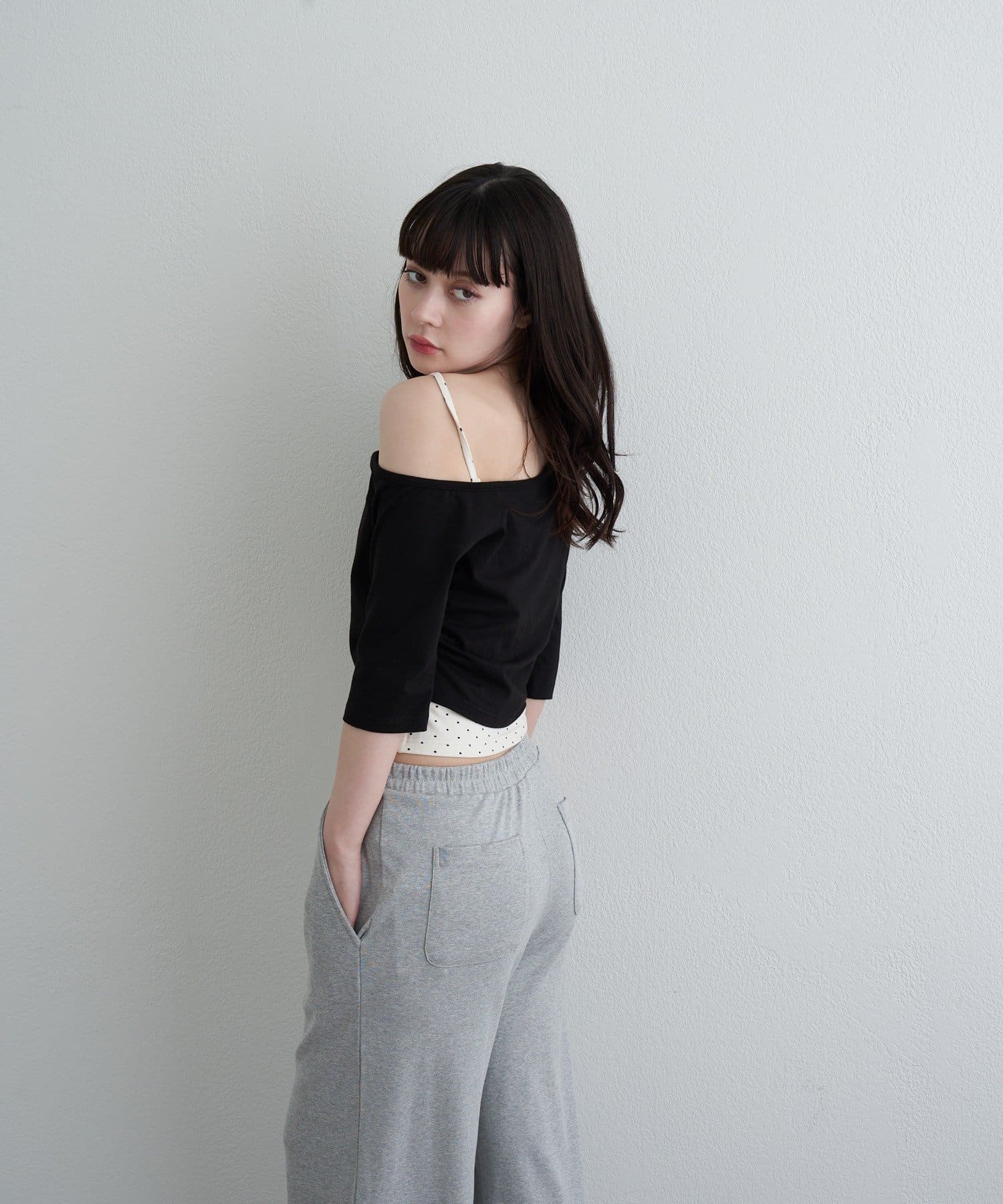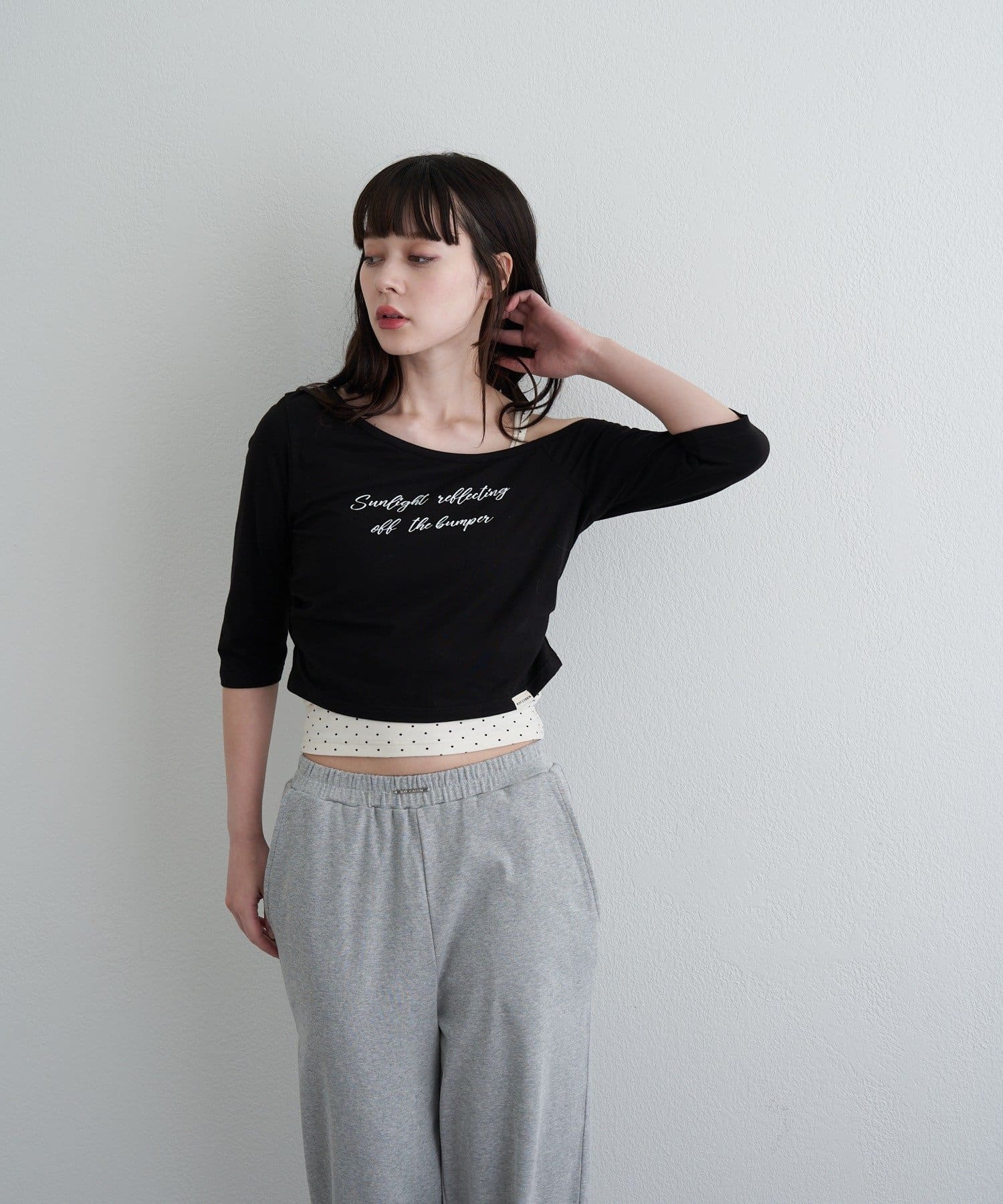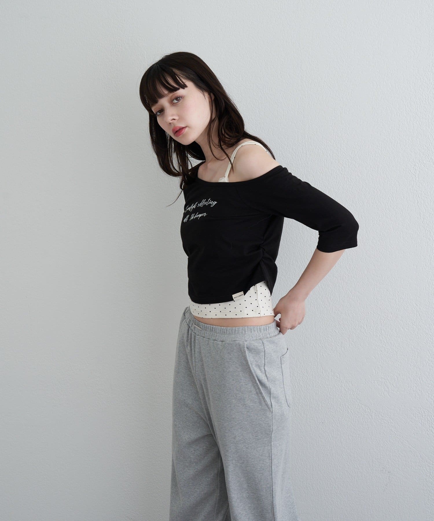 ・コンパクトなTシャツにキャミをレイヤードしたスタイルがトレンドライクなアイテム。
