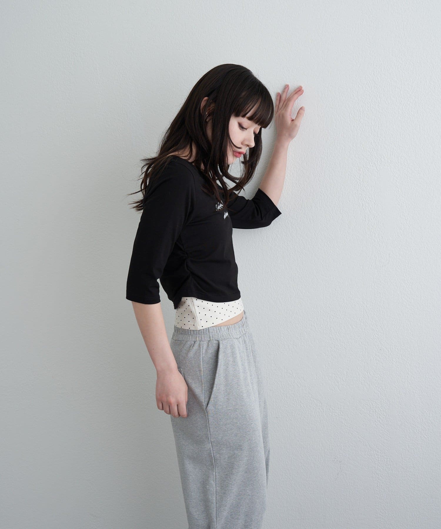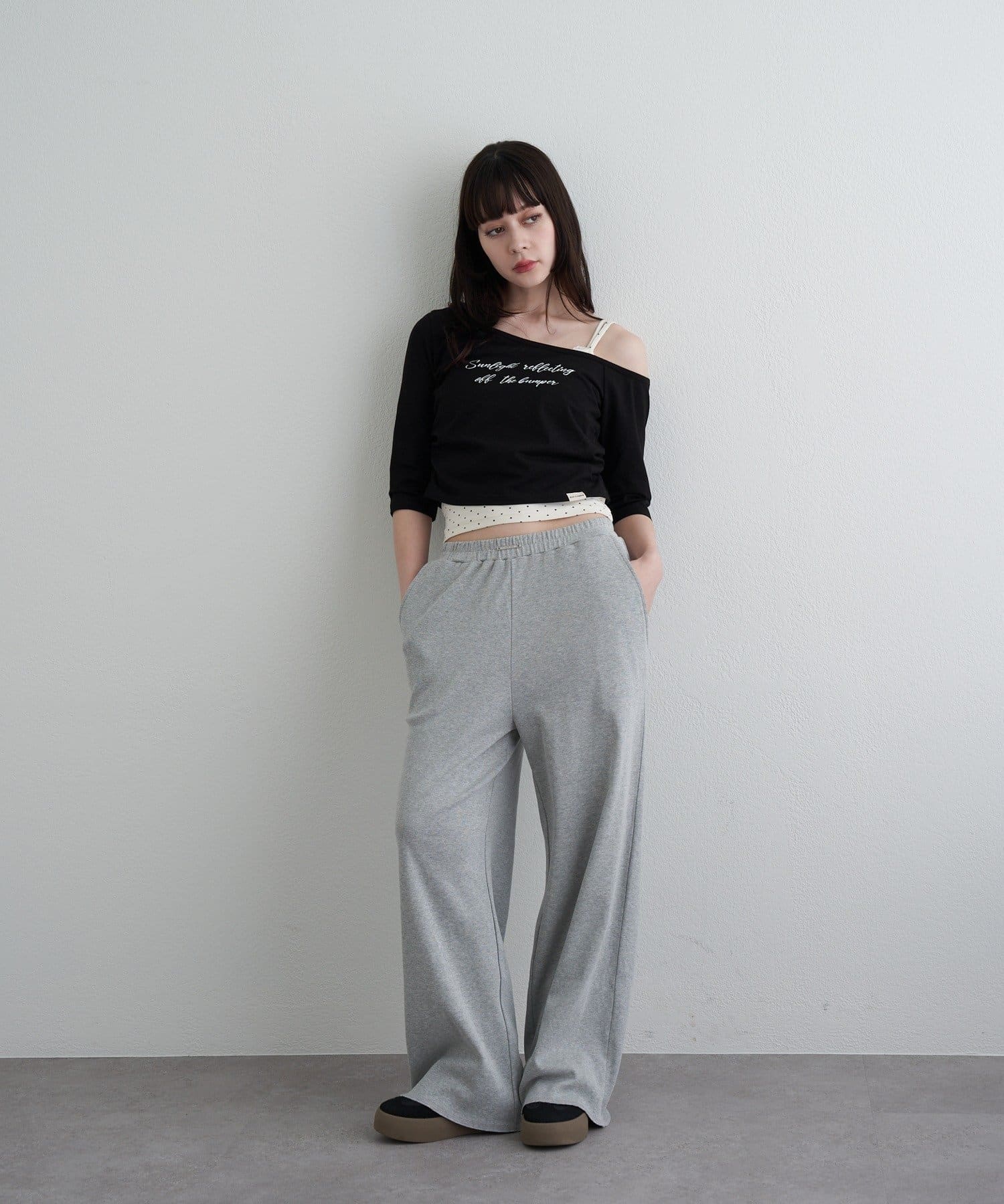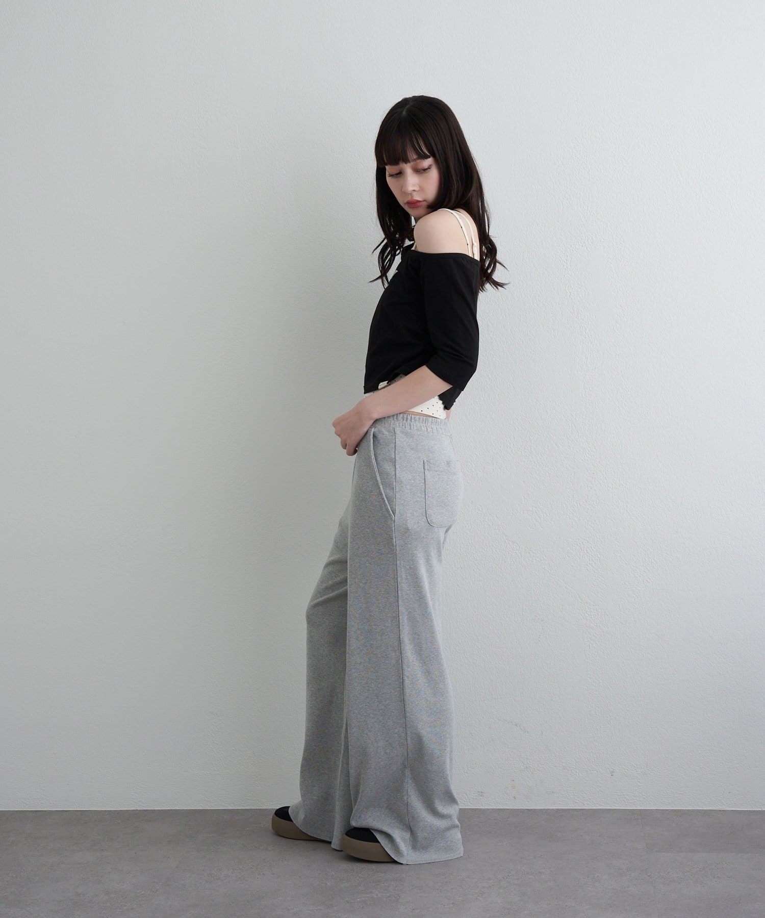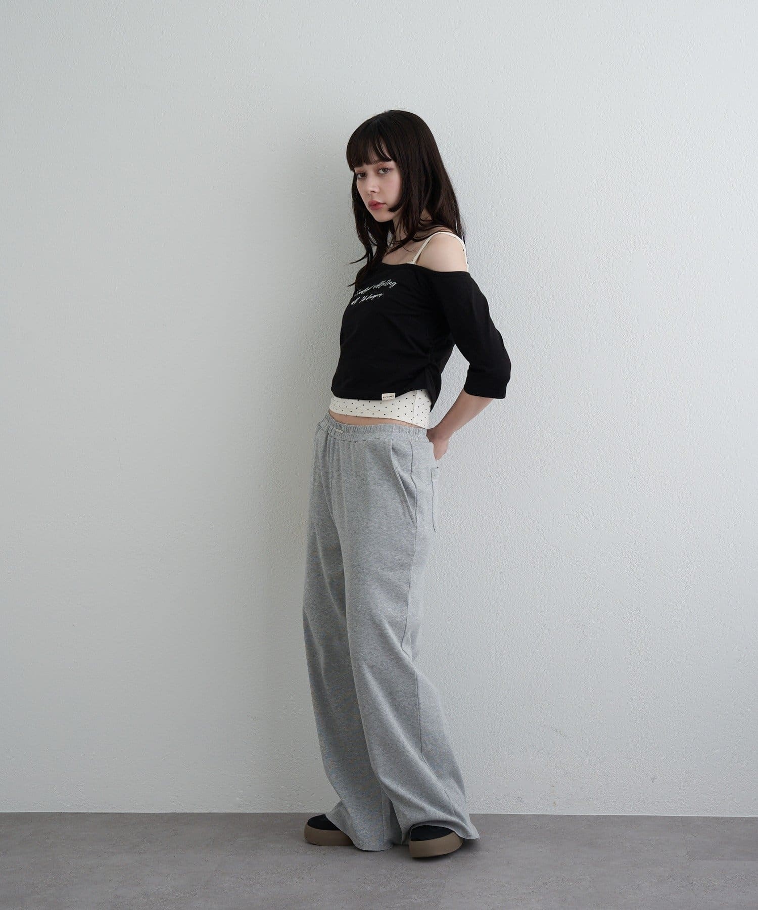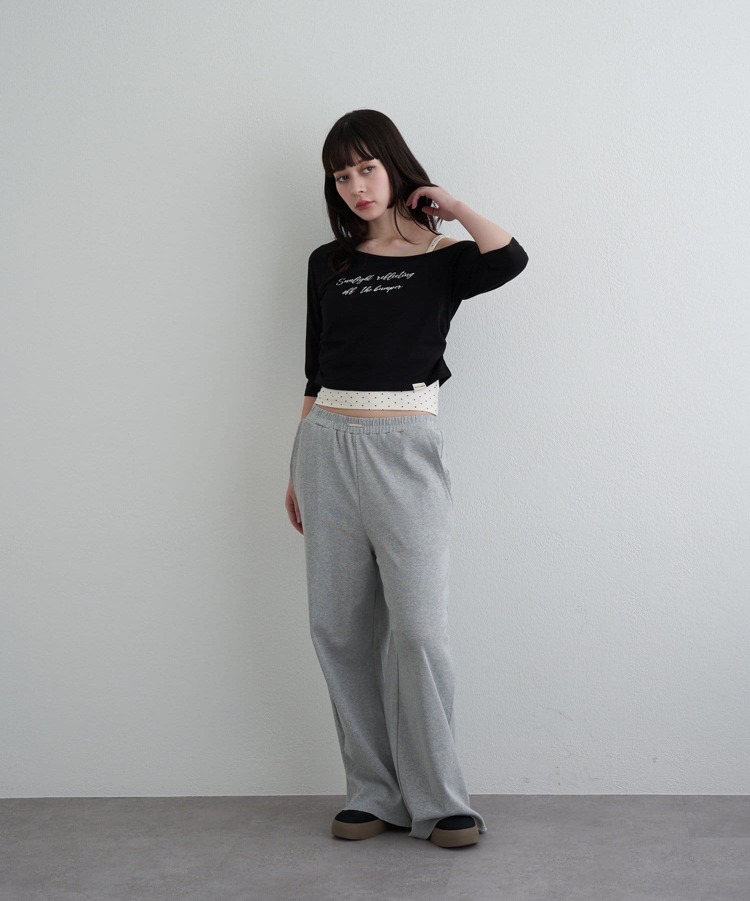 ・コンパクトなTシャツにキャミをレイヤードしたスタイルがトレンドライクなアイテム。
